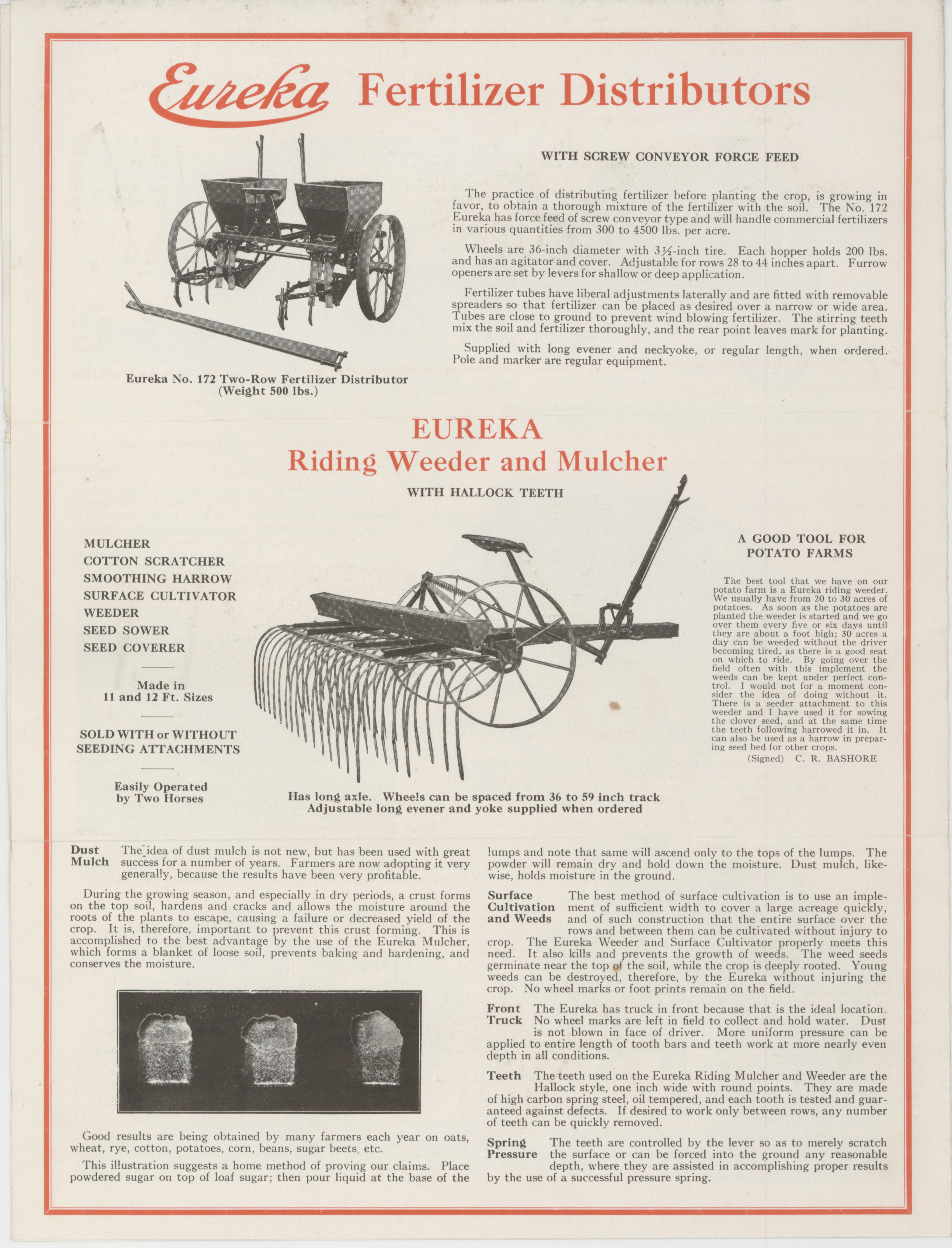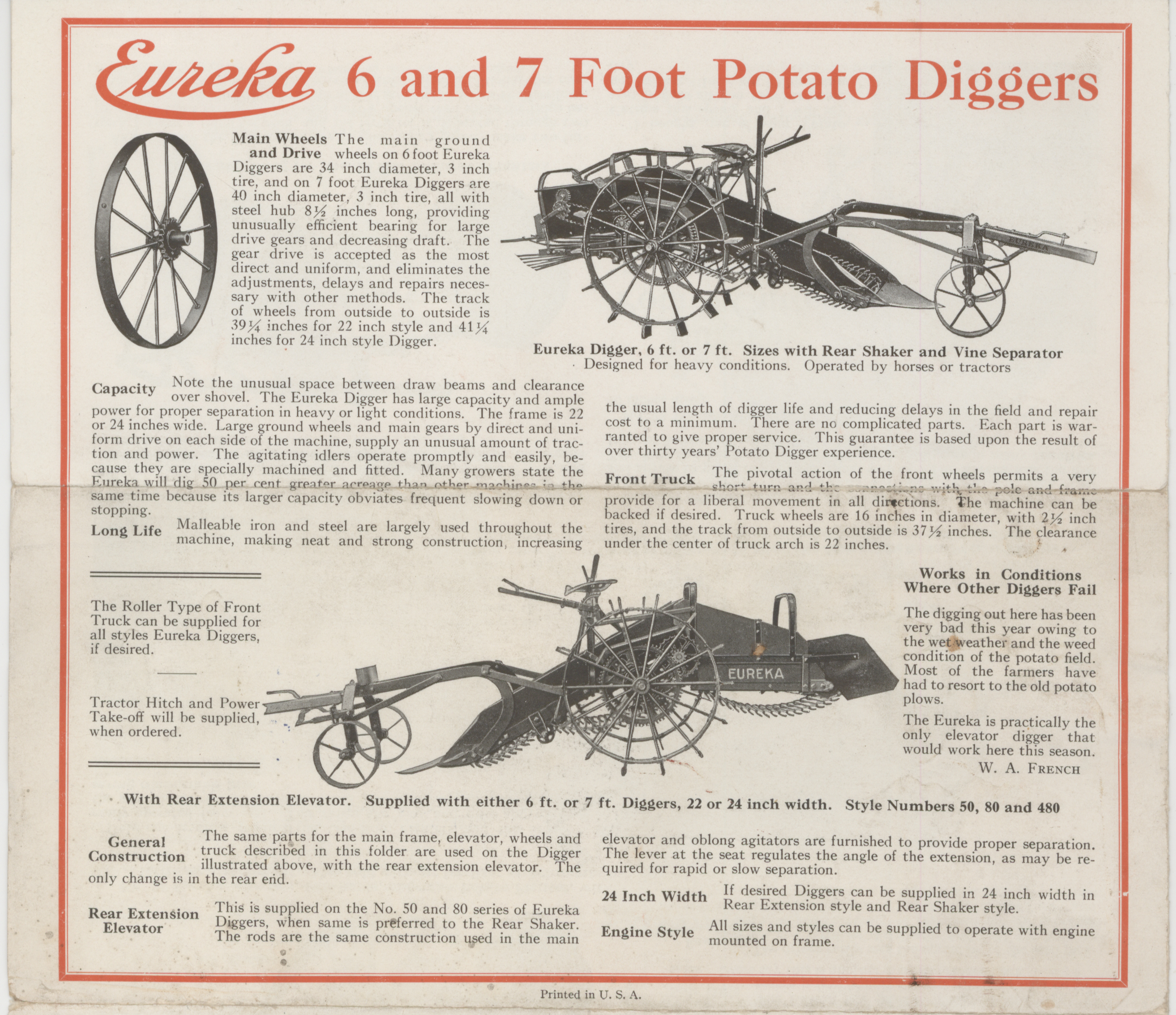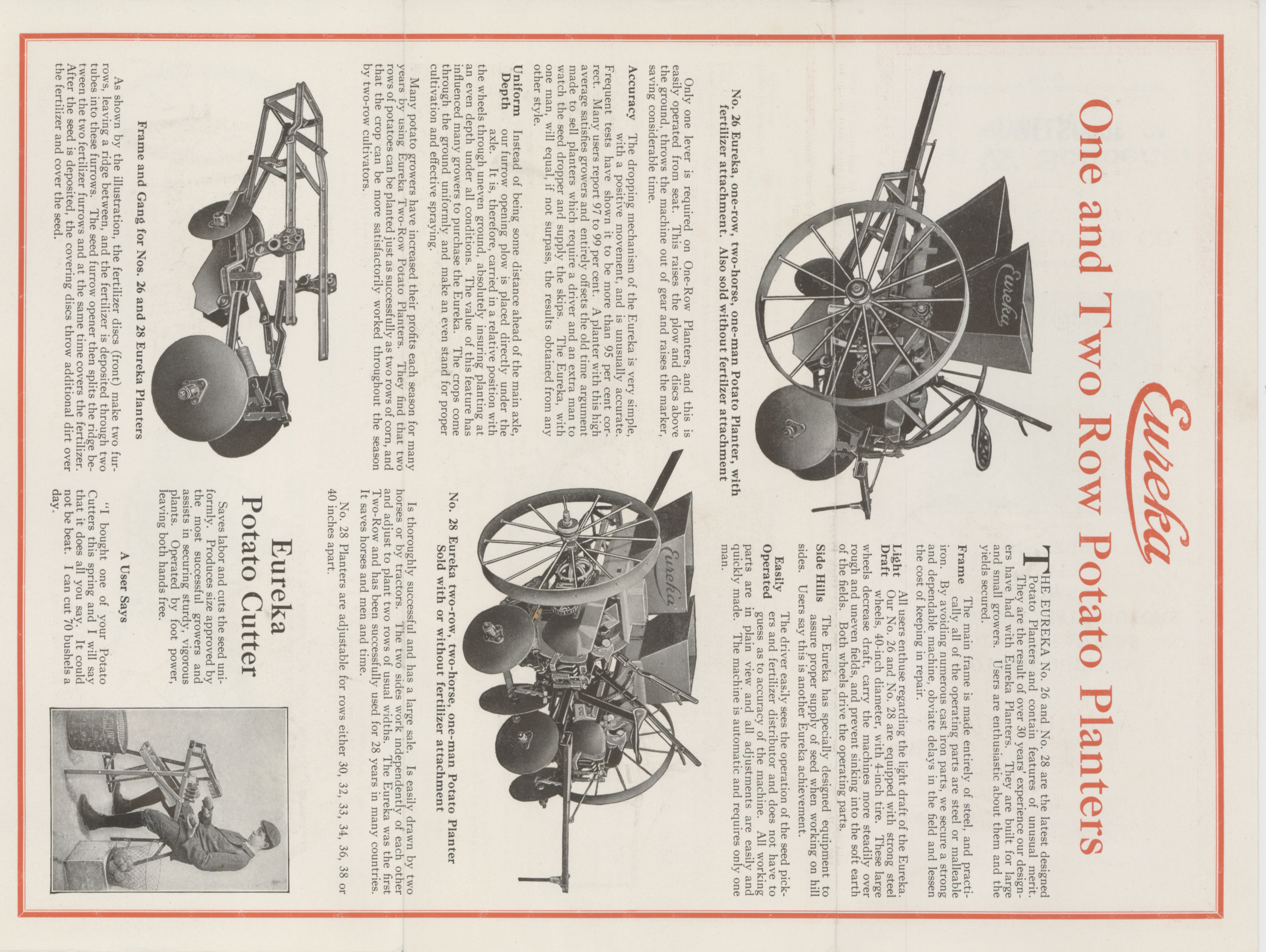- "Eureka Mower Company potato machinery pamphlet", Agricultural Machinery Literature Collection, Iowa State University Library Digital Collections