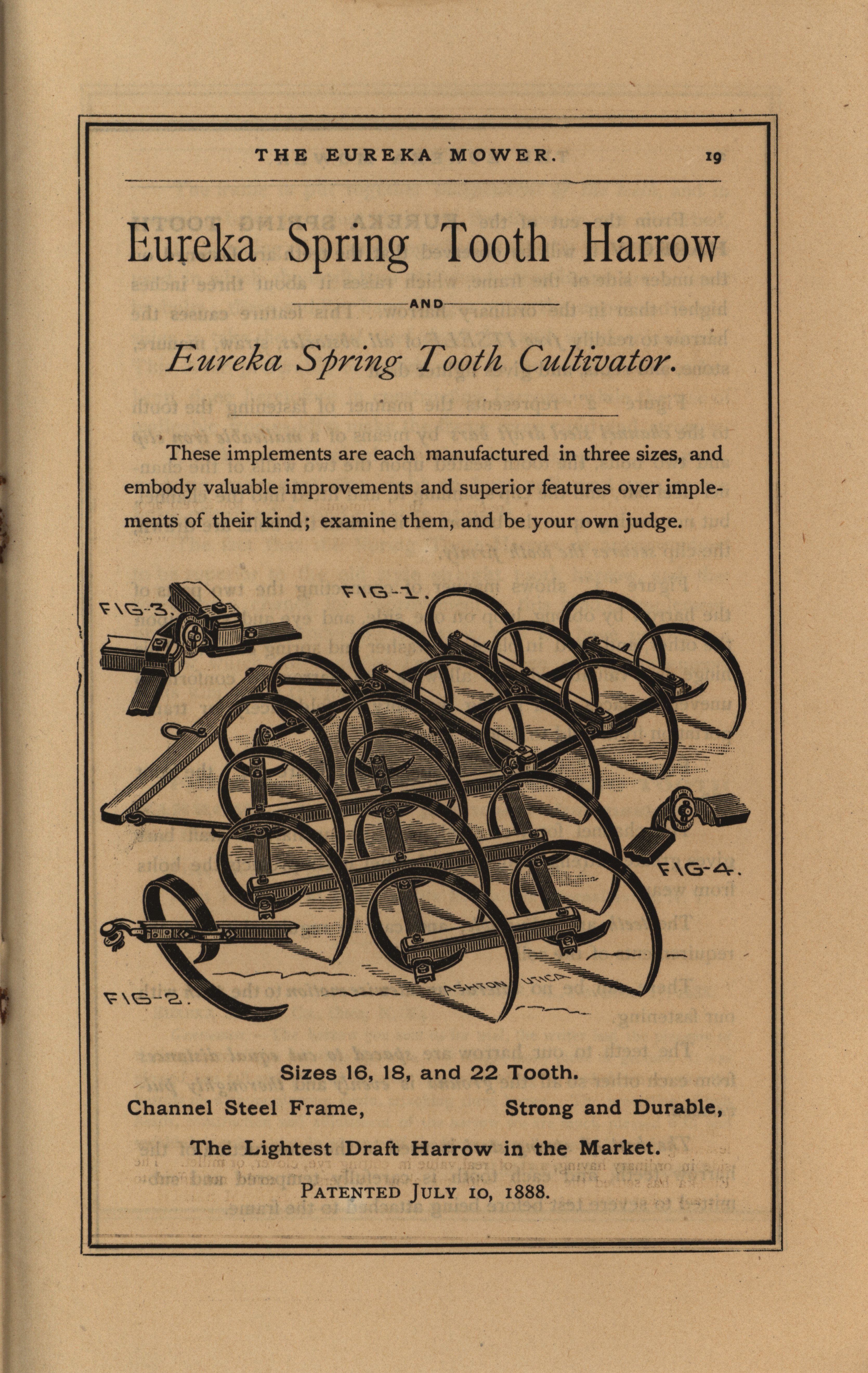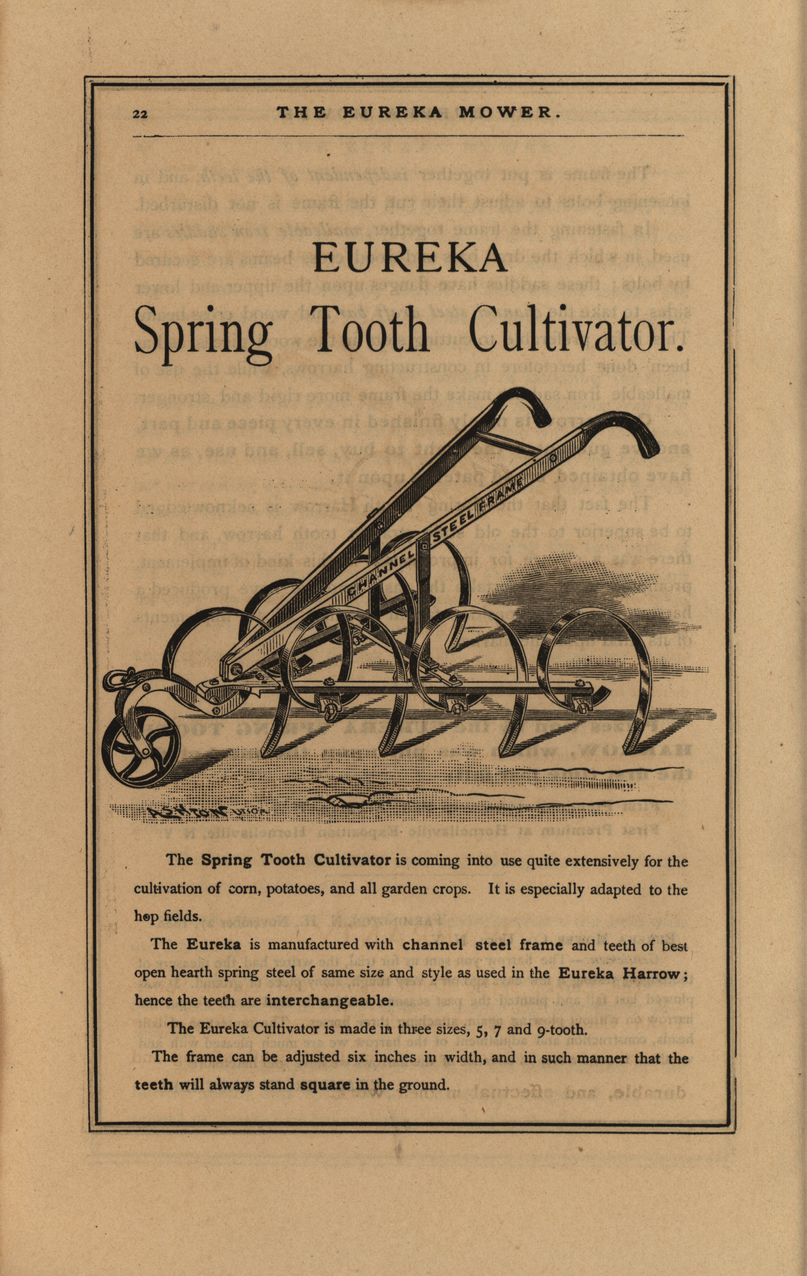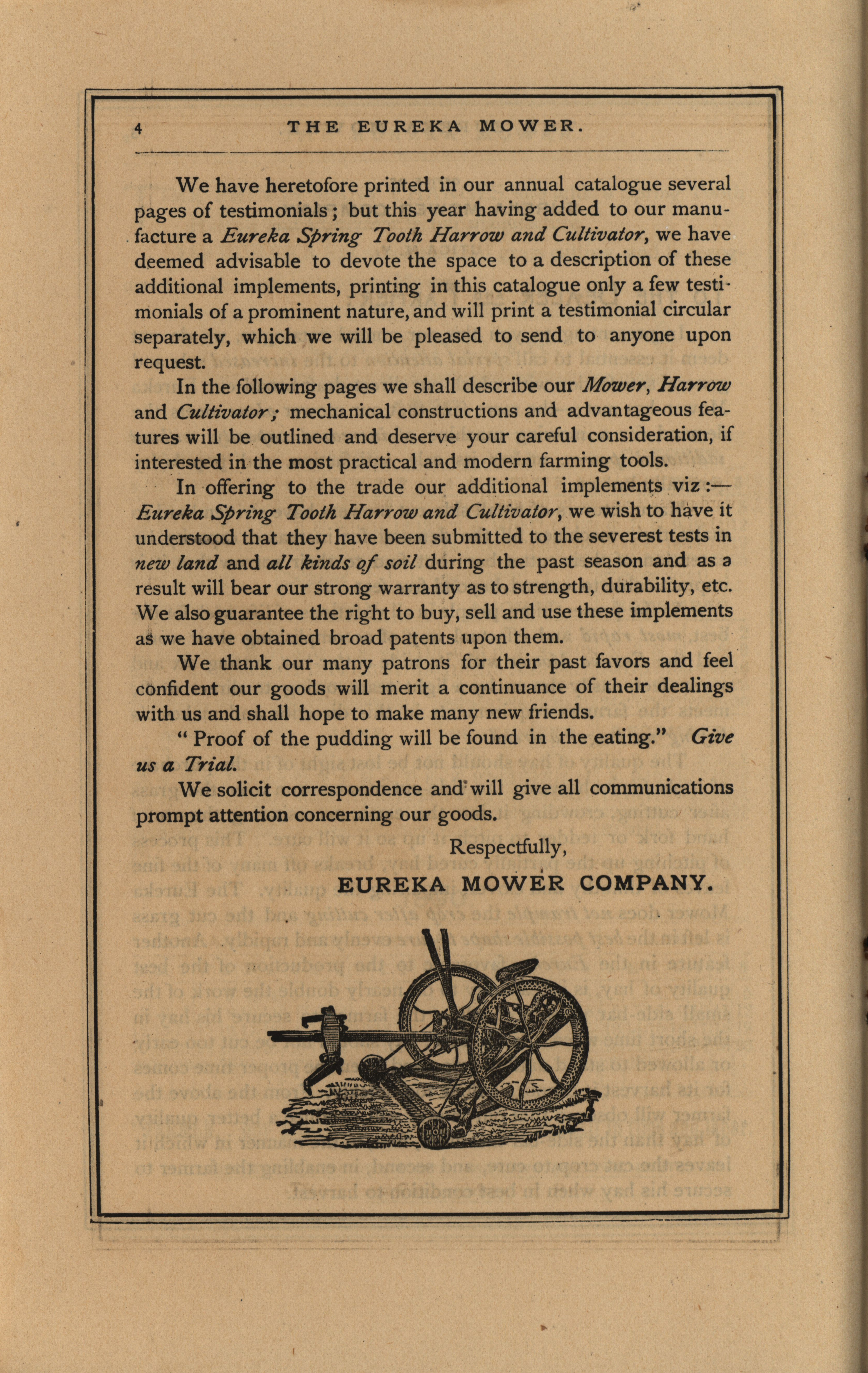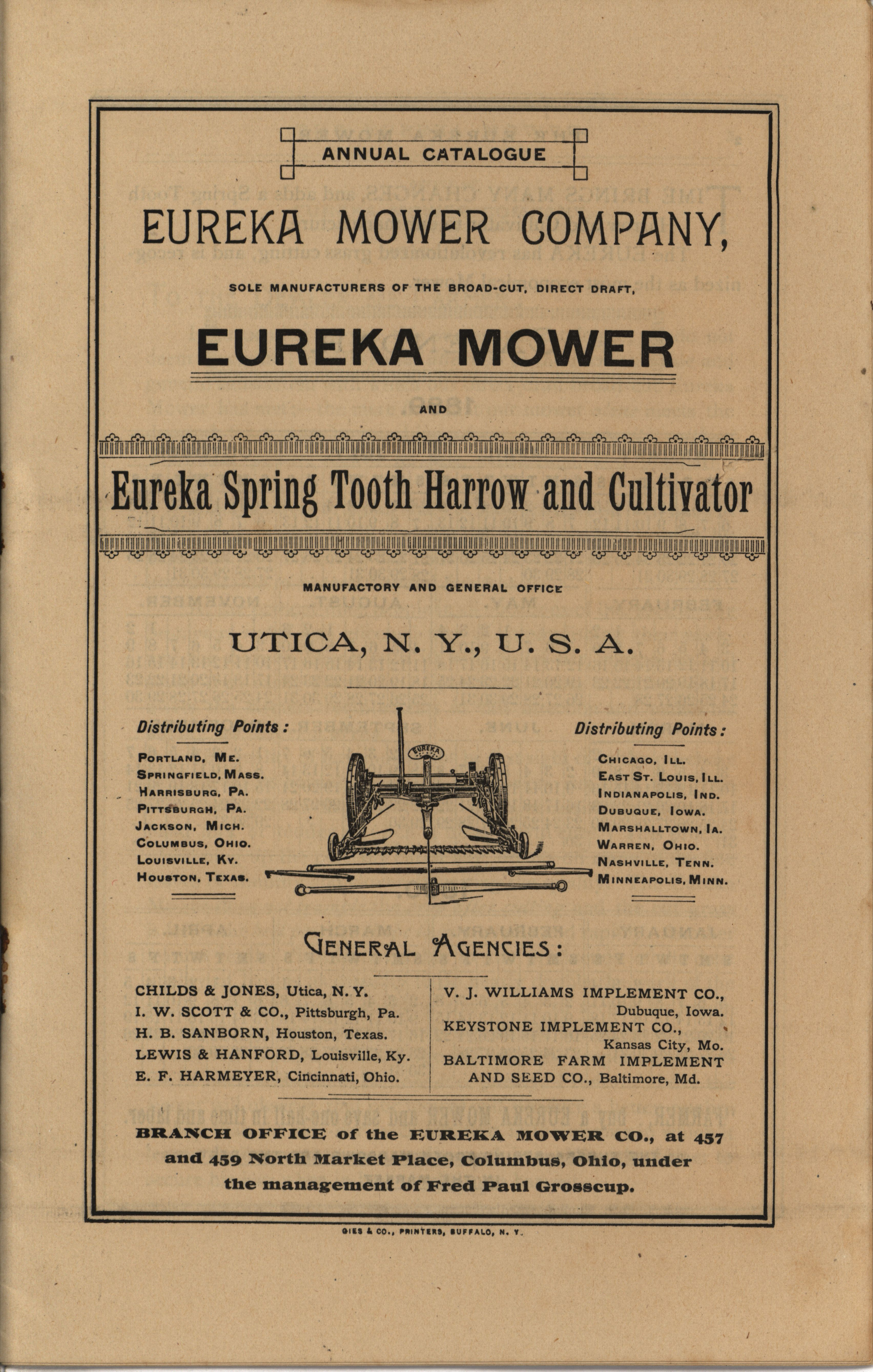 - Illustrated catalog describing the agricultural implements and related products offered by Eureka Mower Company in 1890.