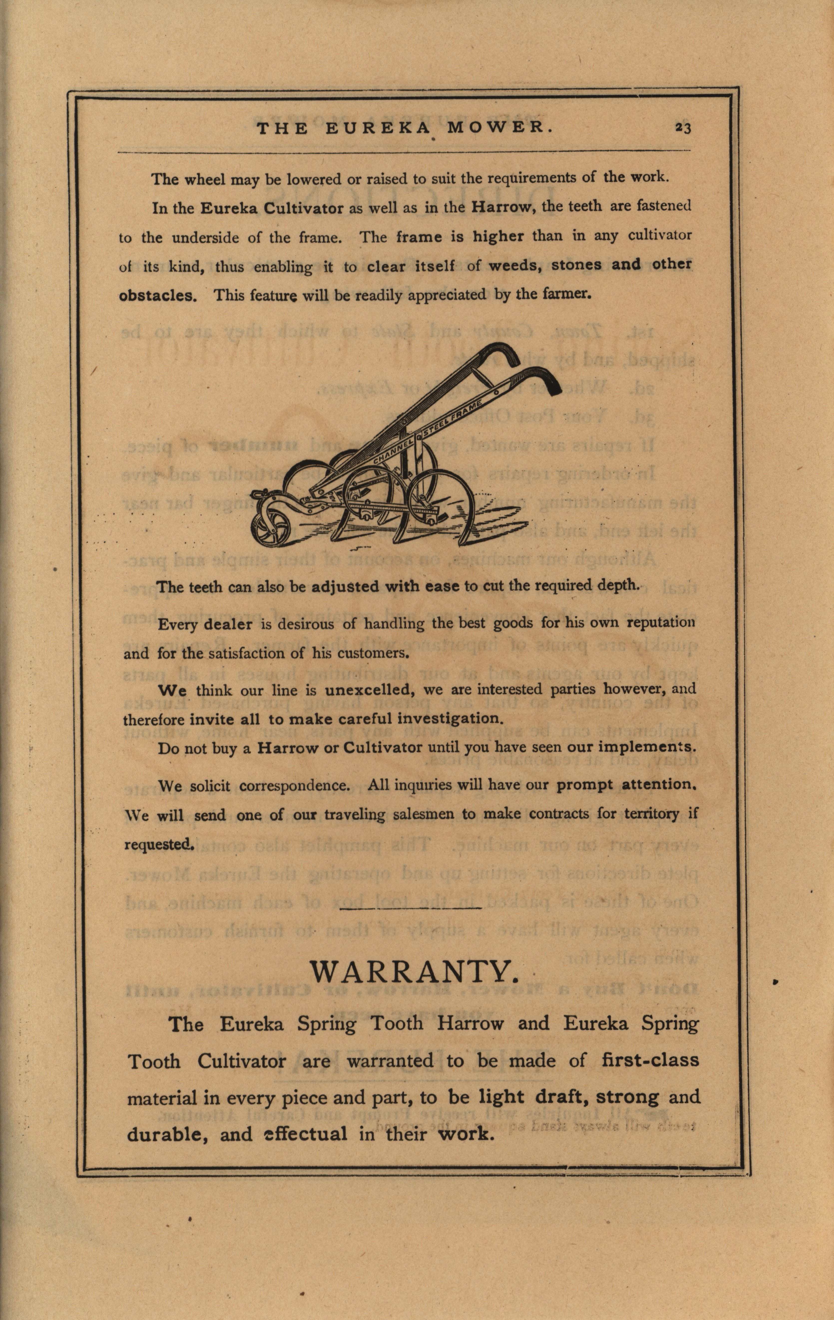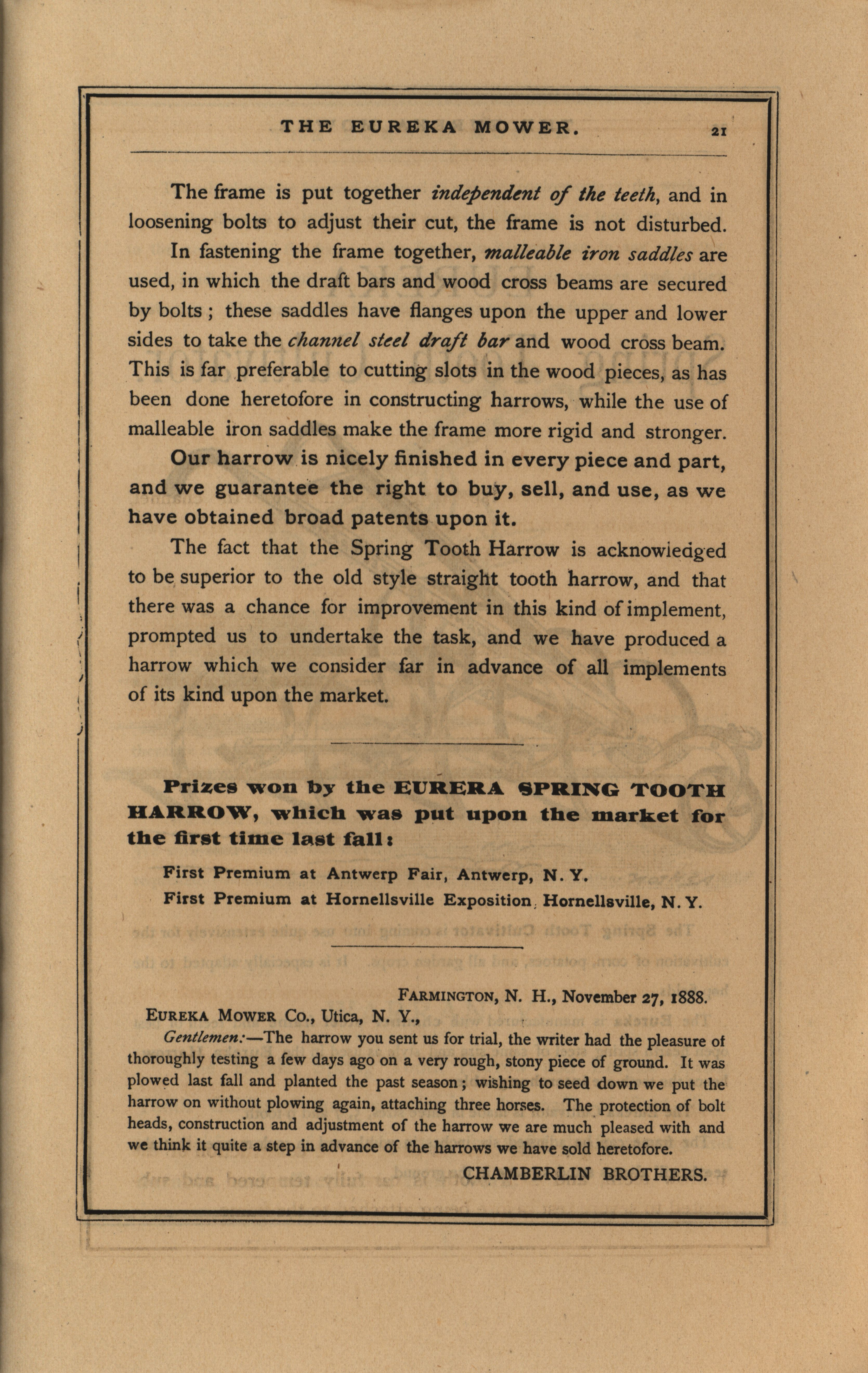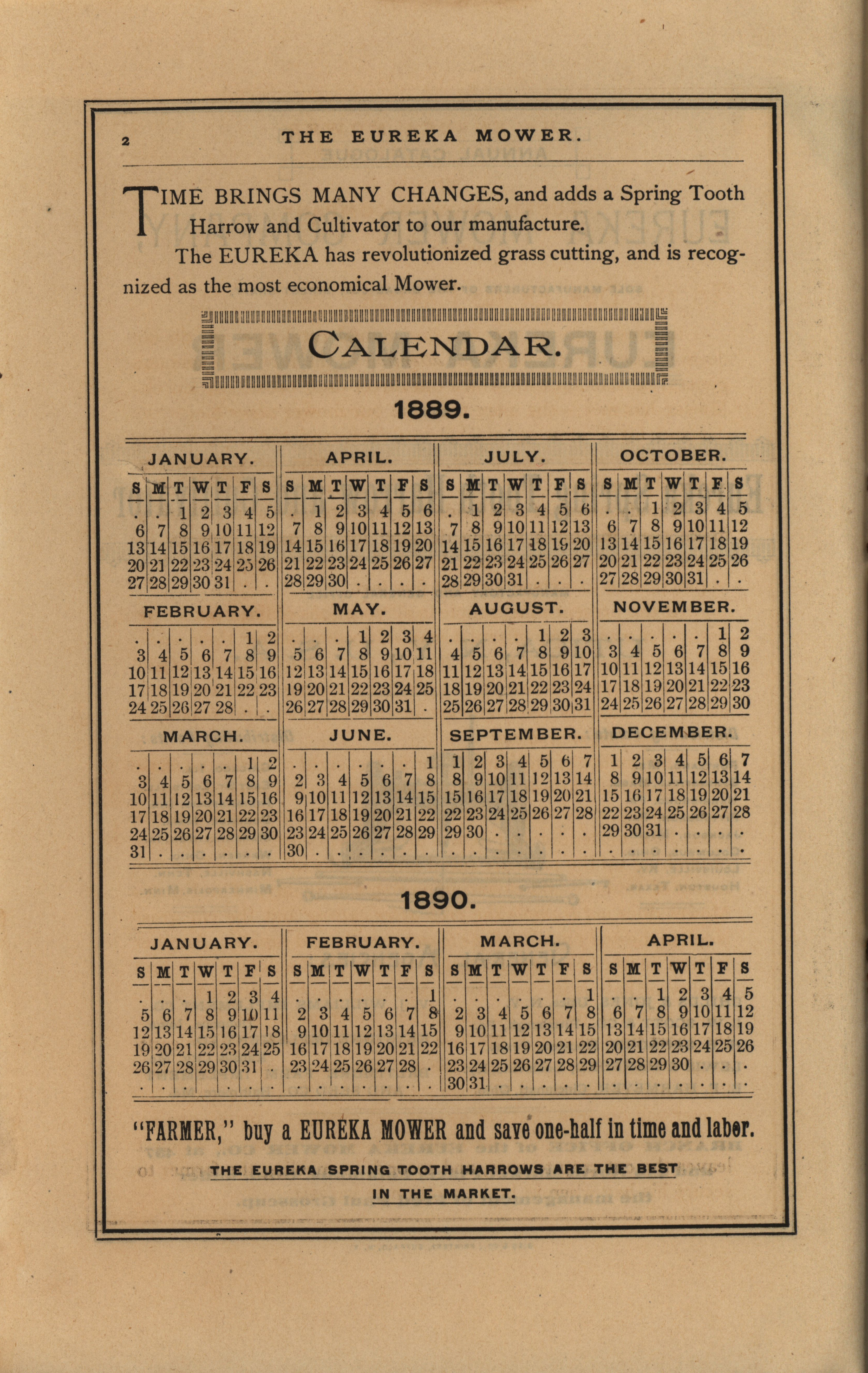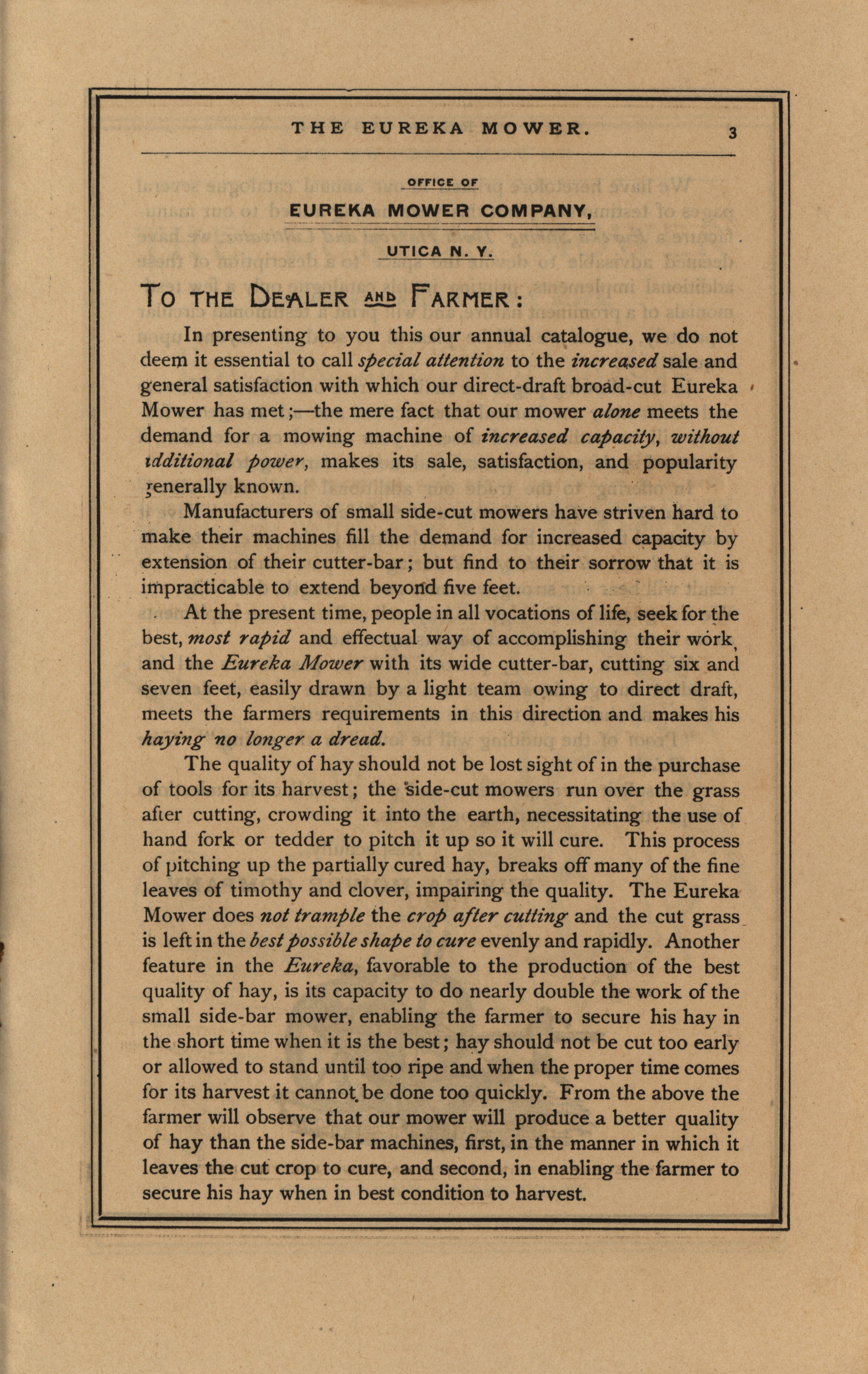 - Illustrated catalog describing the agricultural implements and related products offered by Eureka Mower Company in 1890.