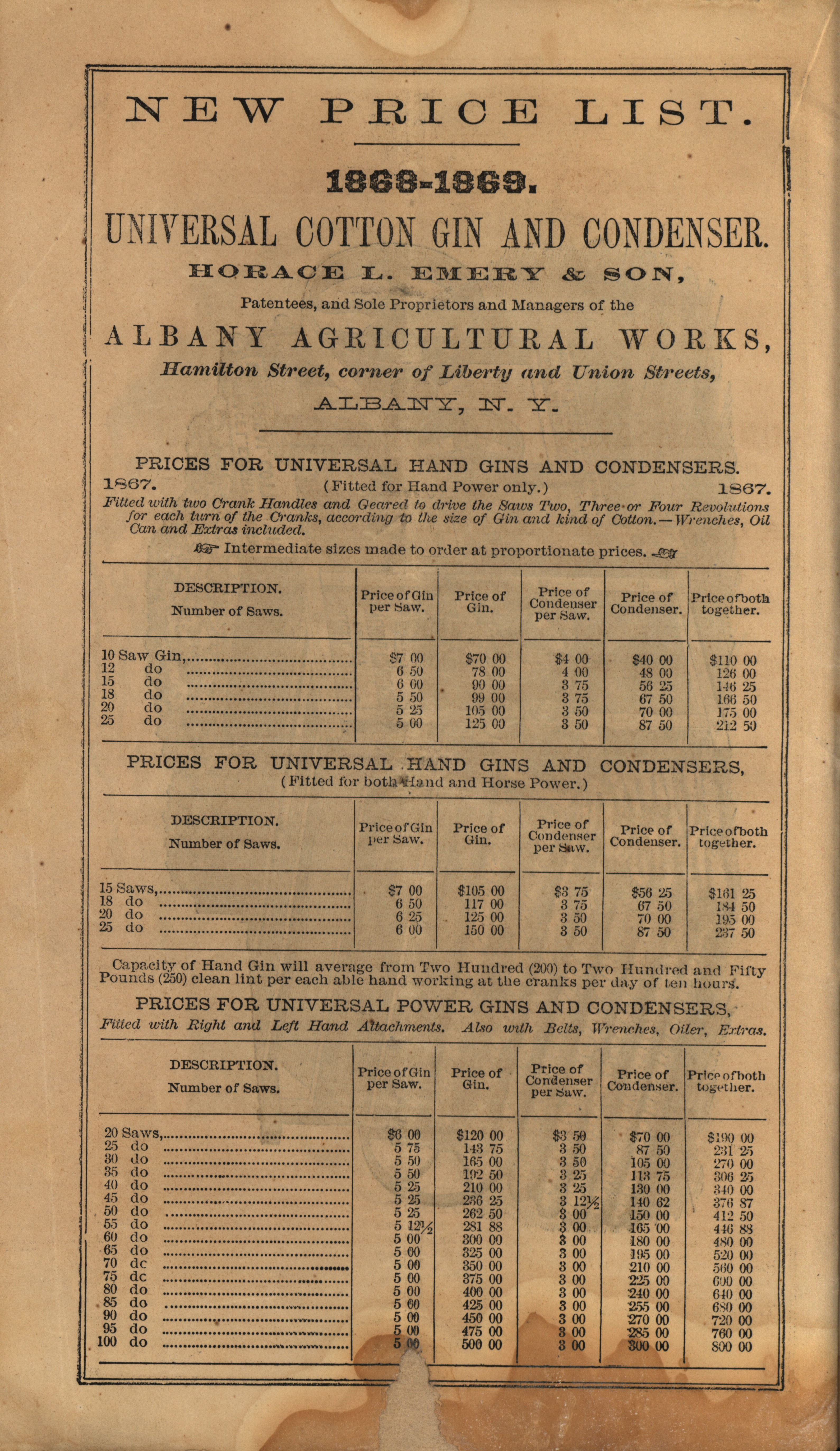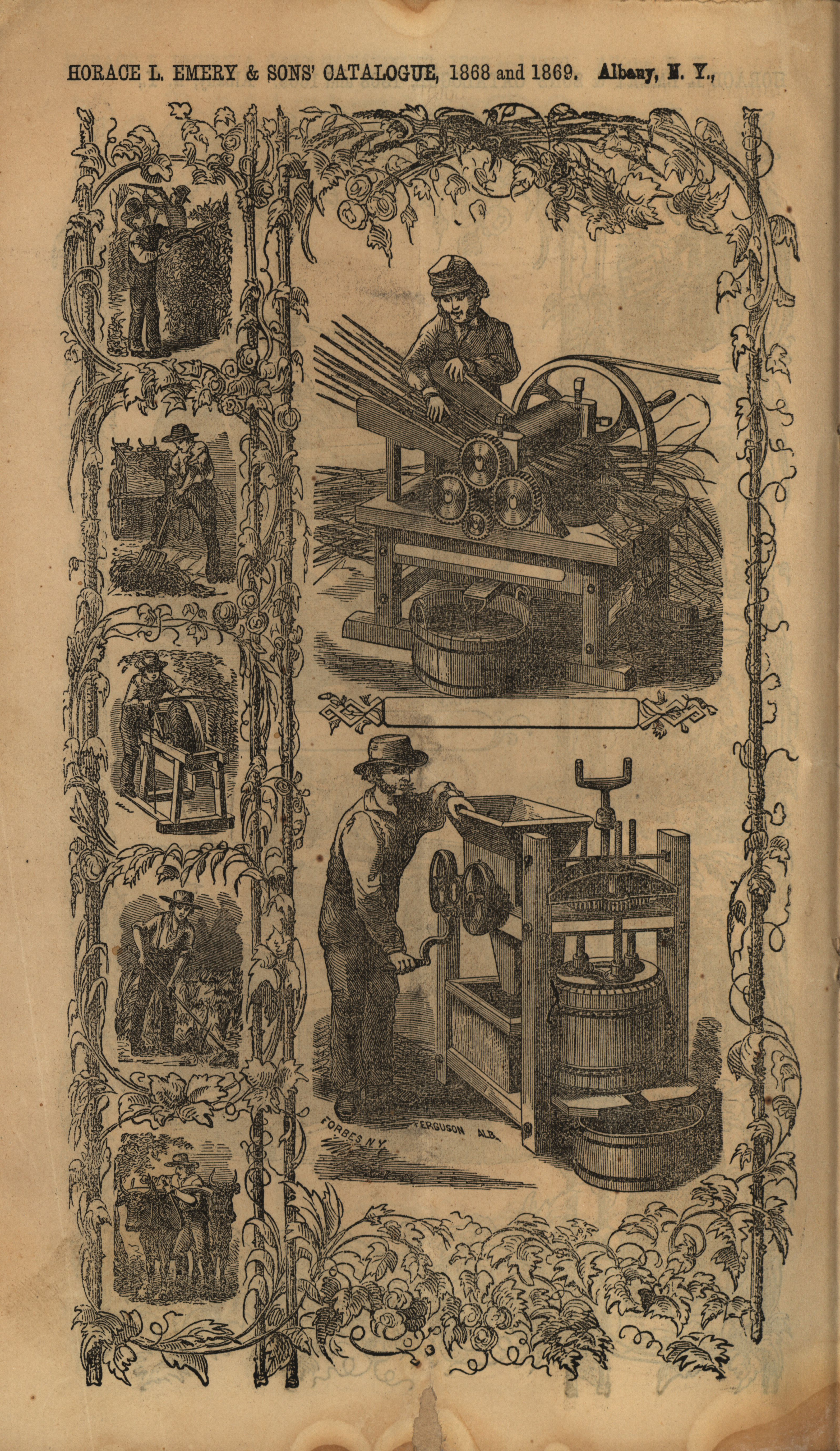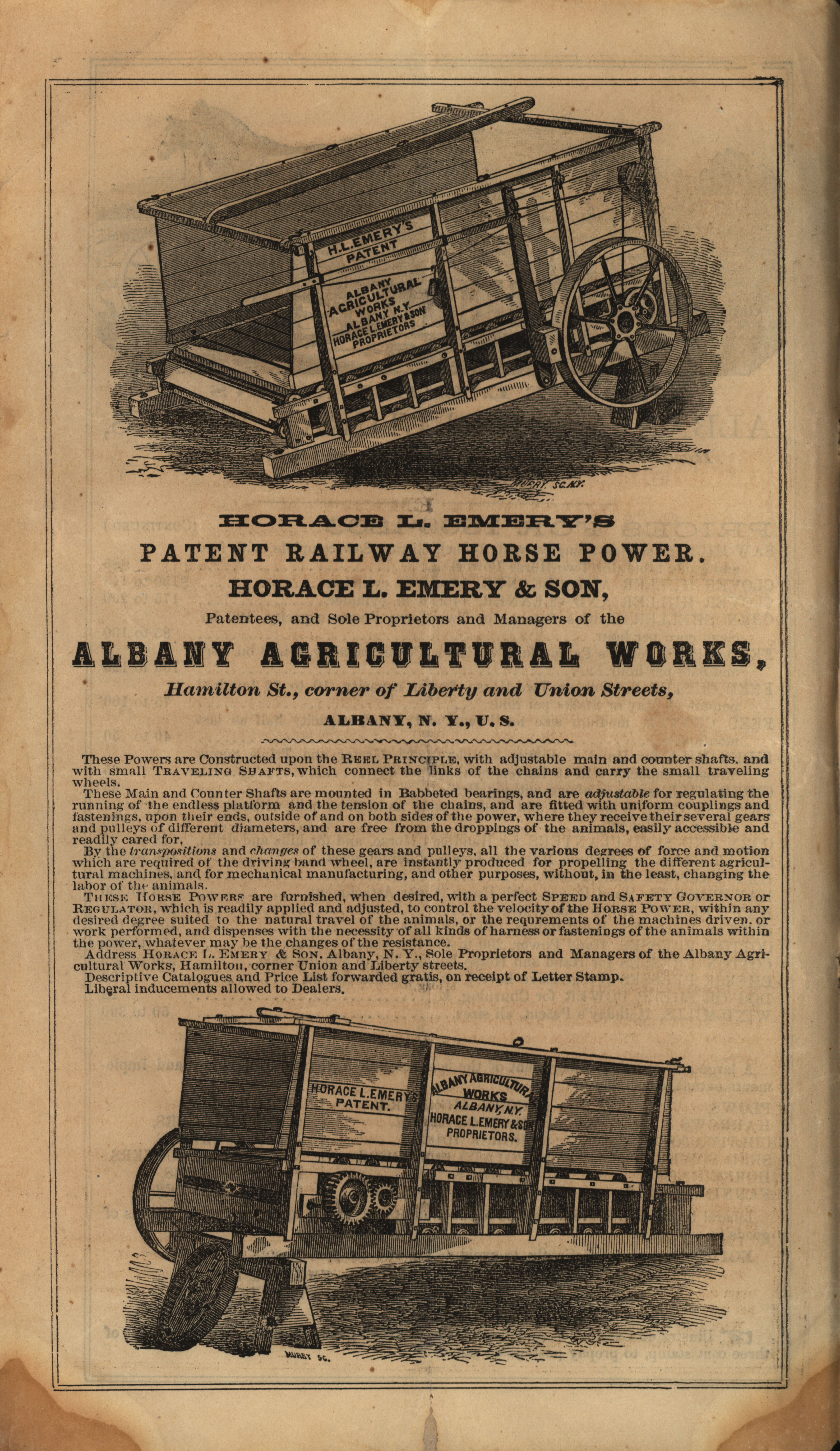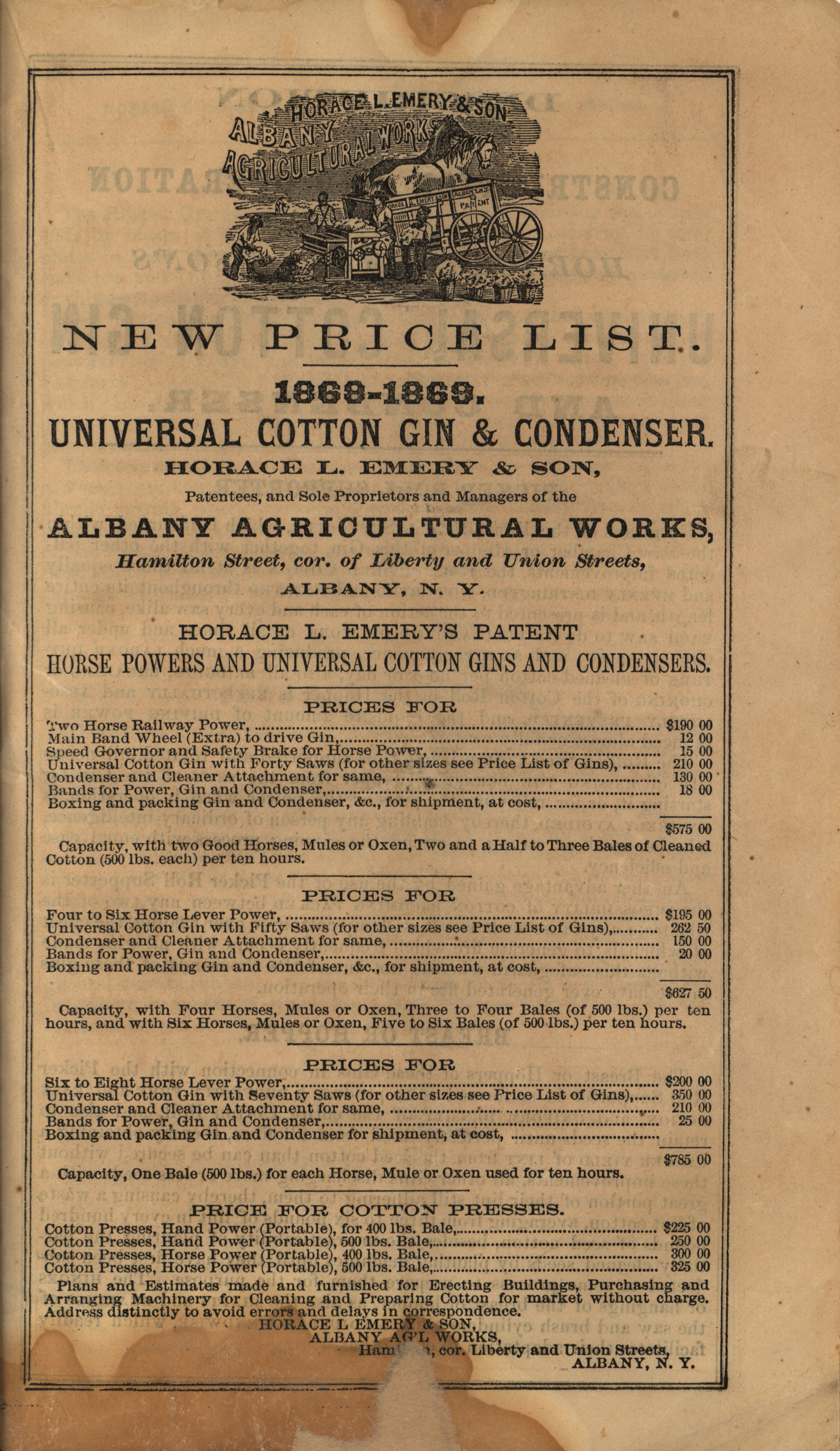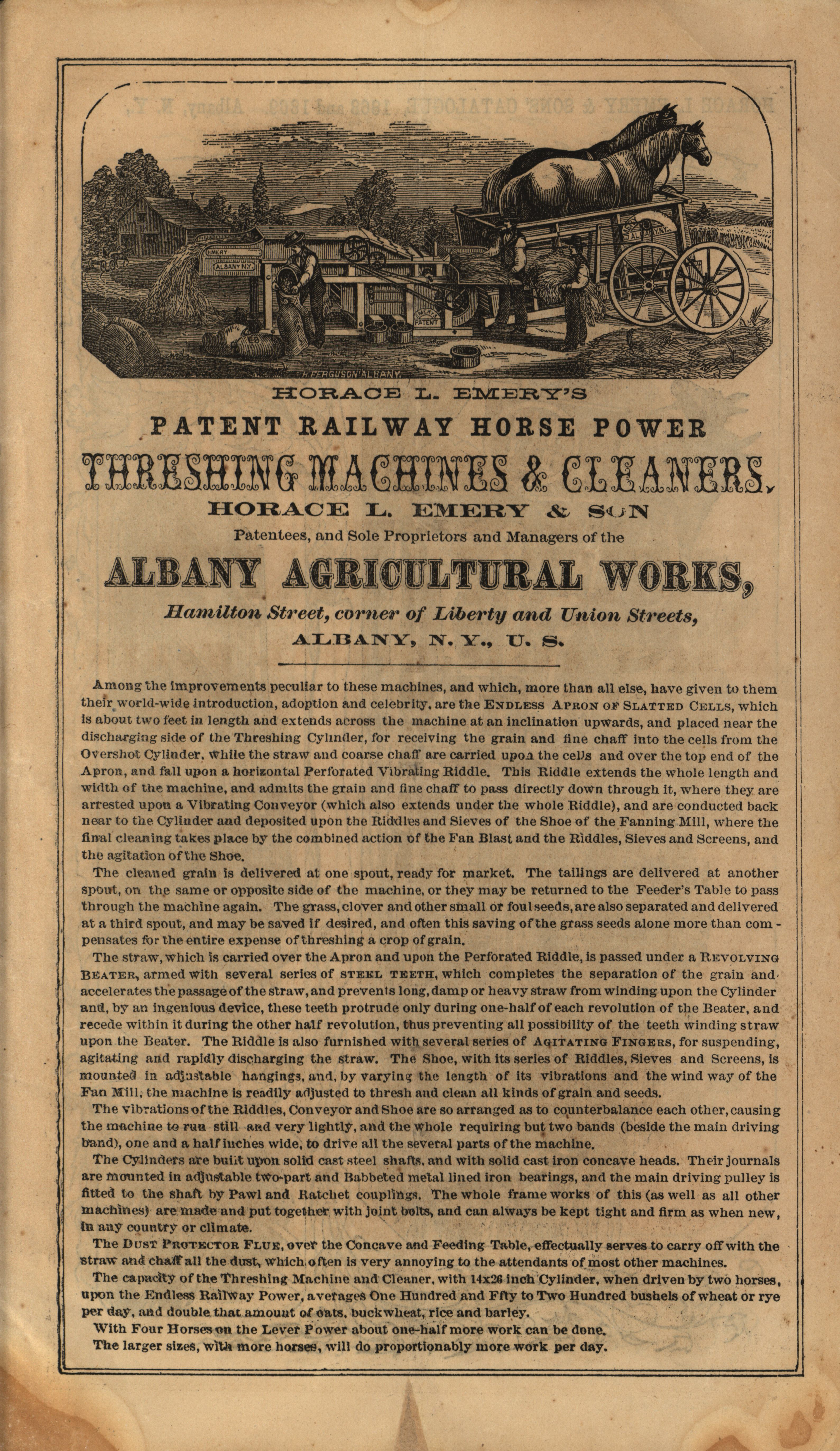 - Illustrated catalog describing the products offered by Albany Agricultural Works in 1868-1869, including a price list.
