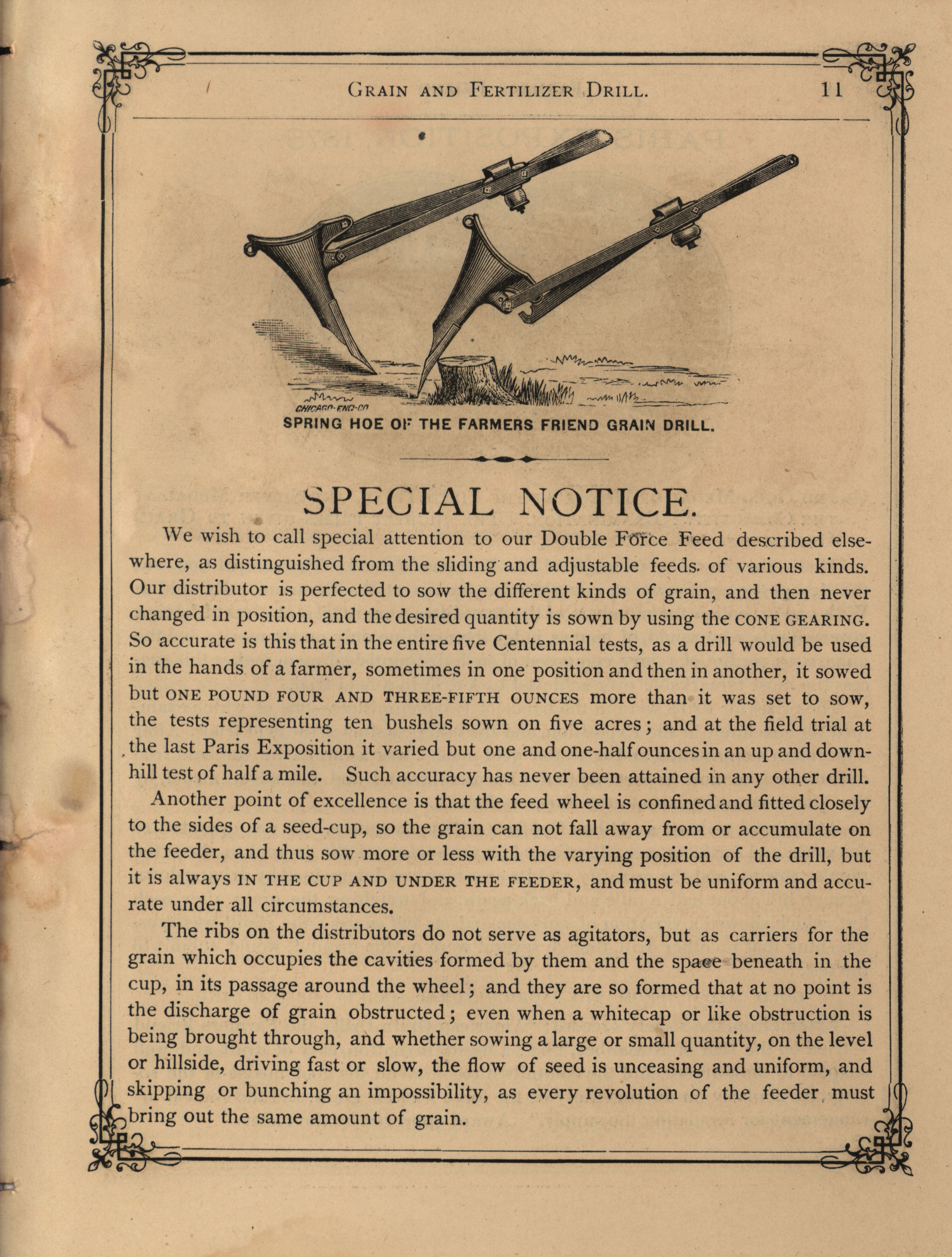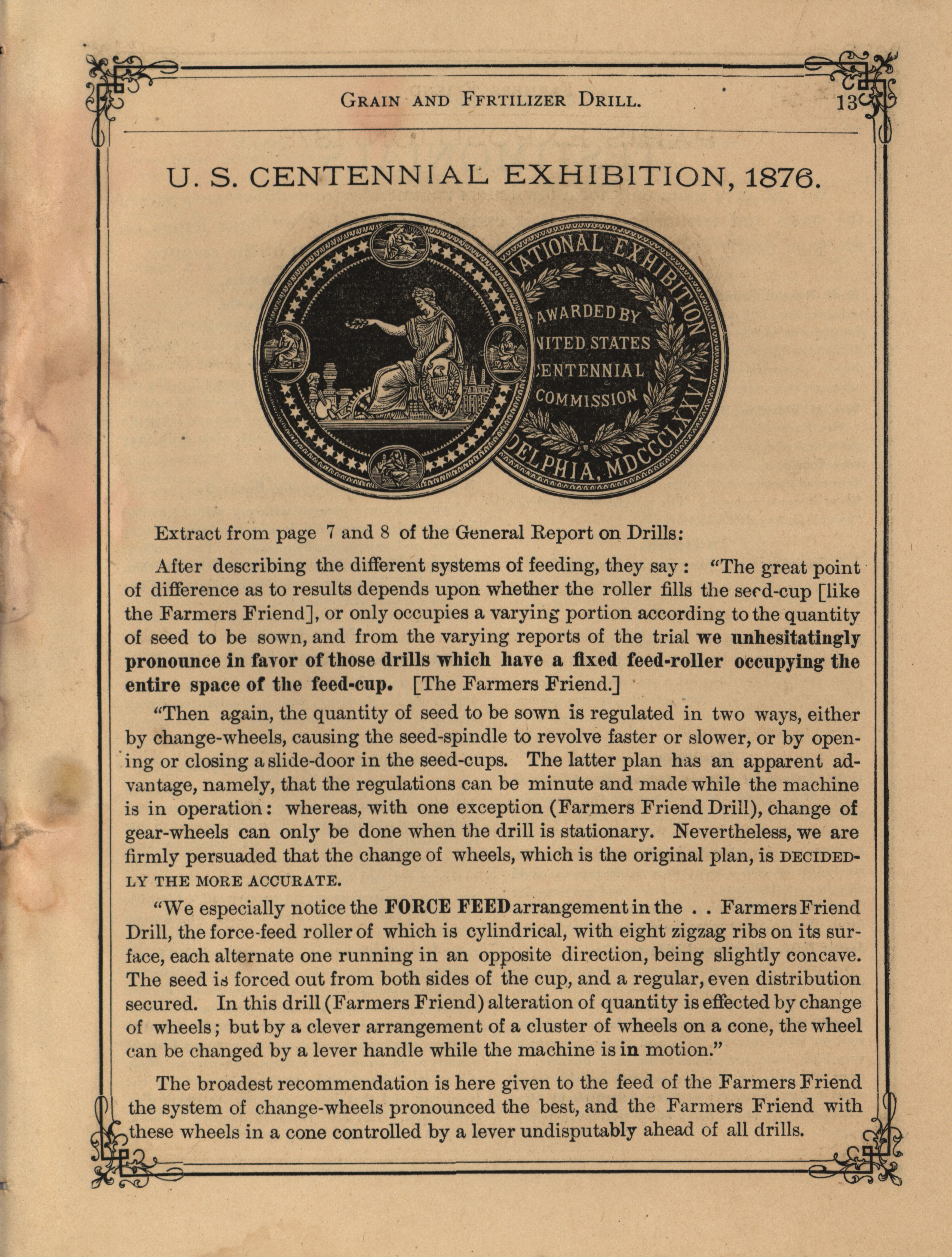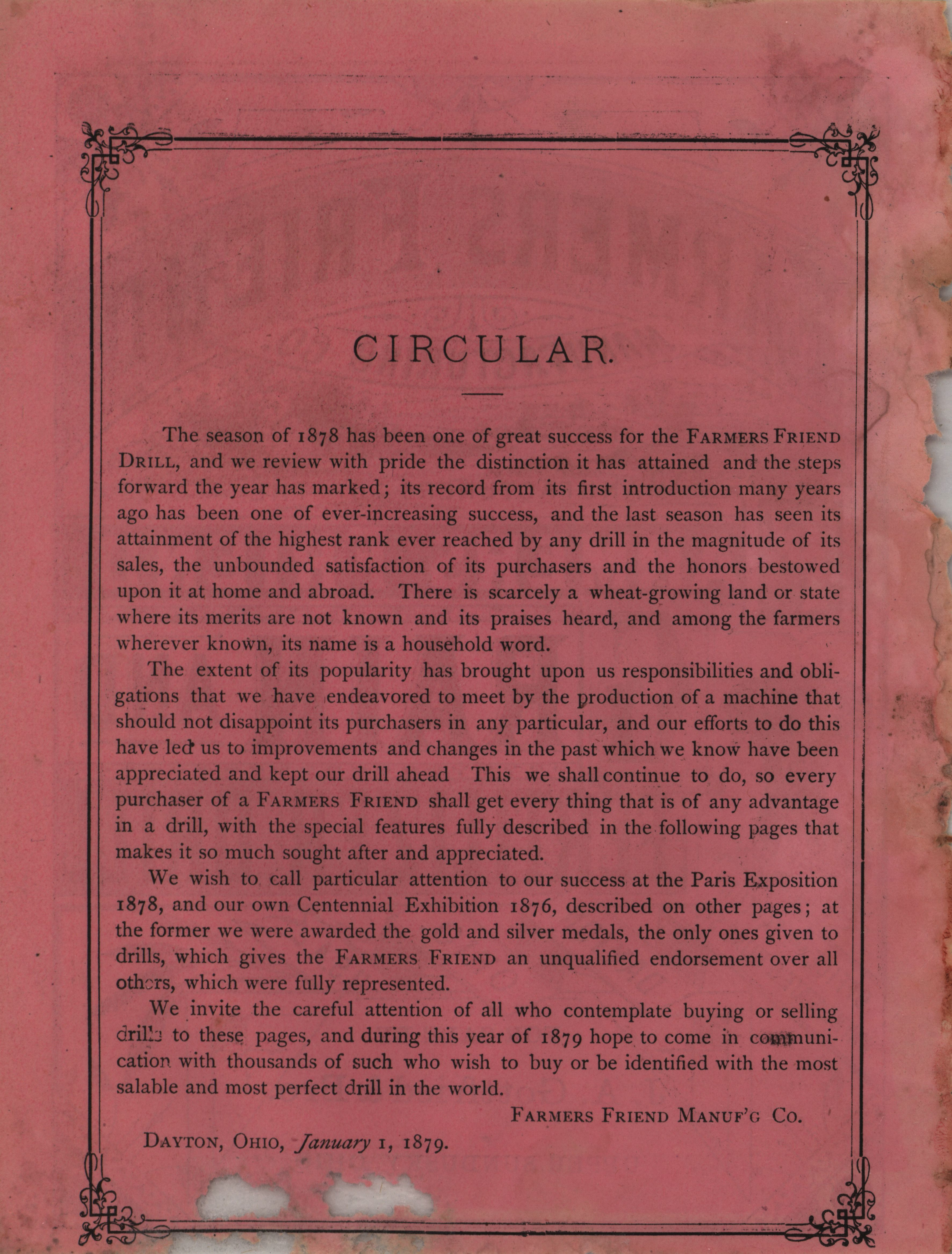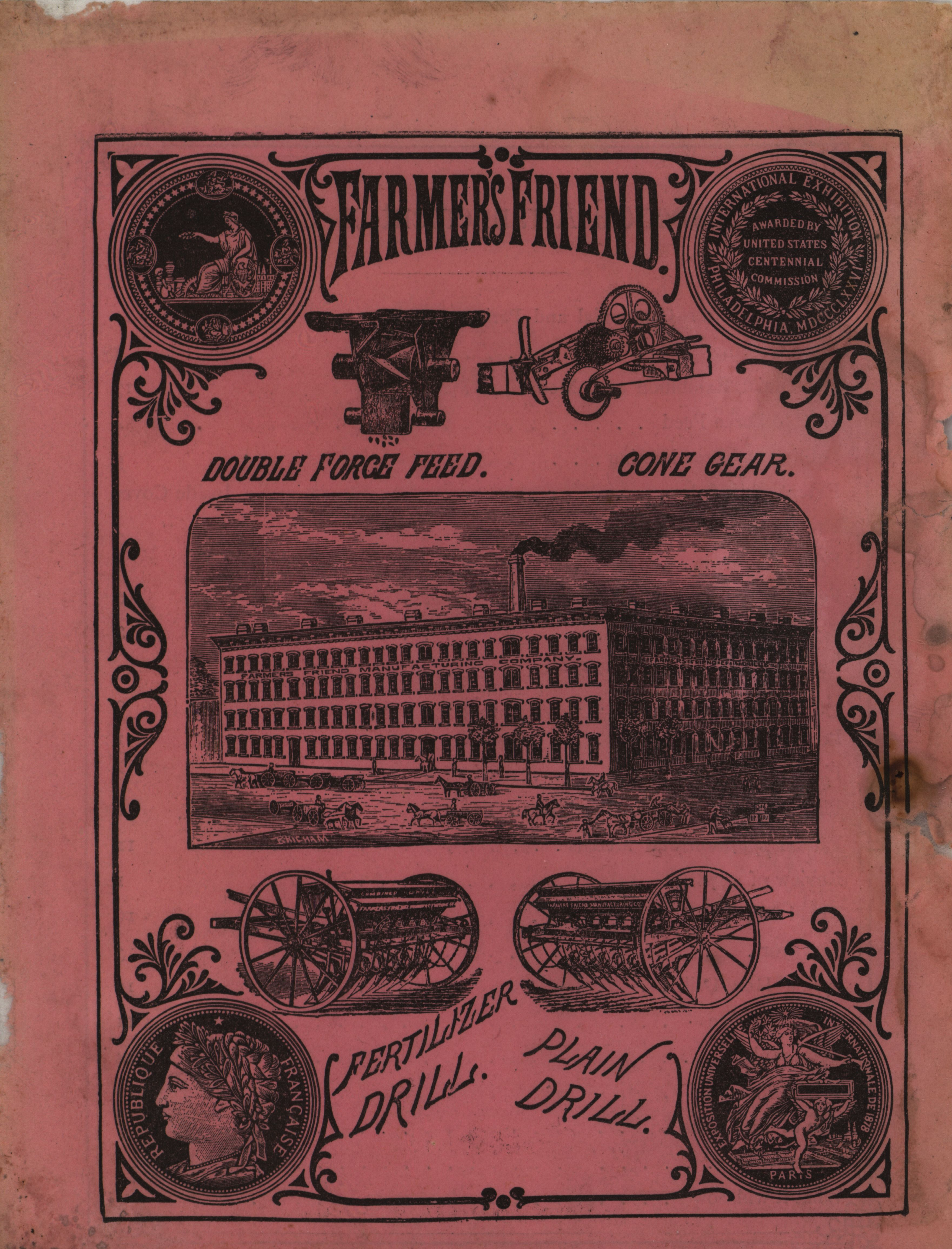 - Illustrated catalog describing the agricultural drills and related products offered by Farmers Friend Manufacturing Company in 1879.