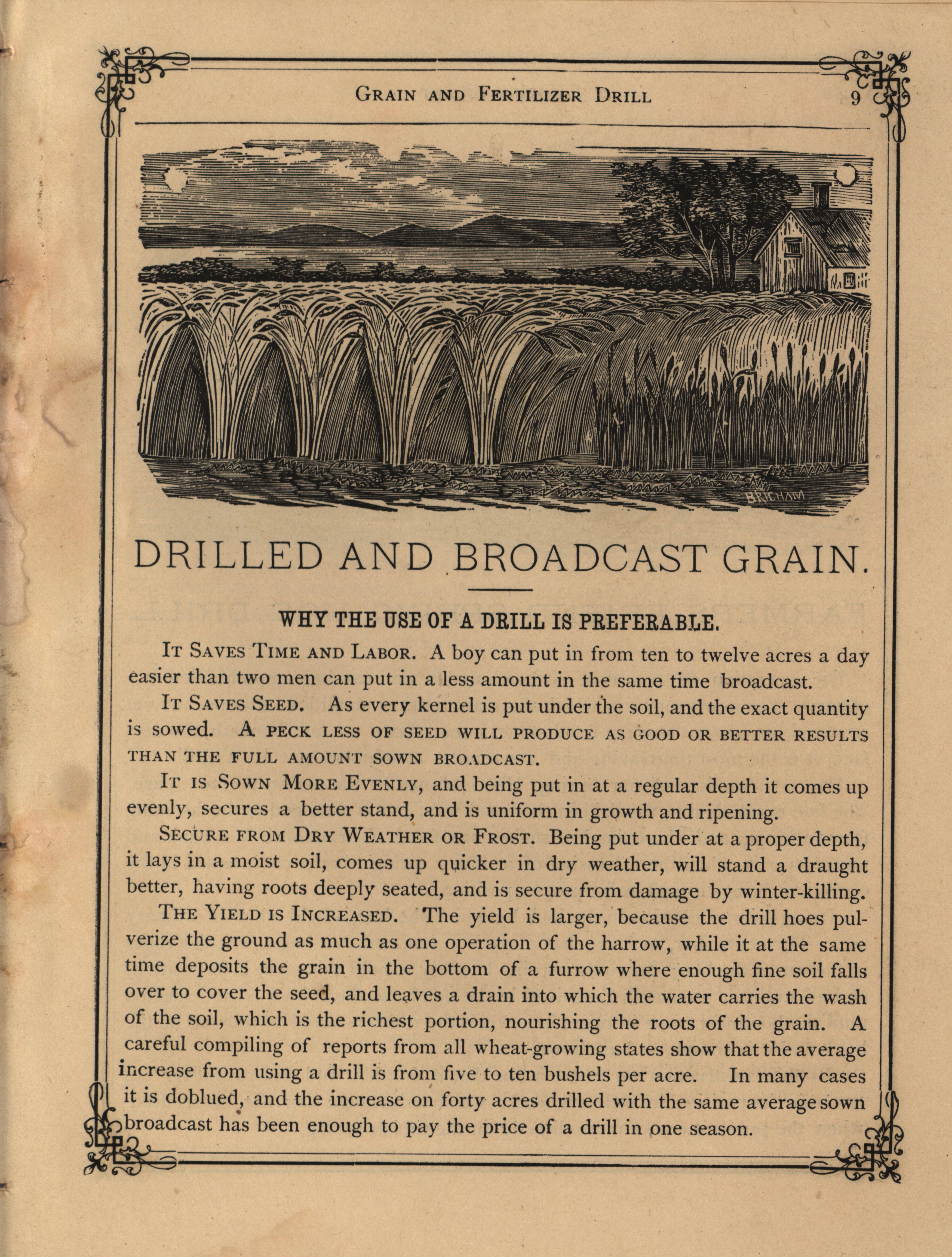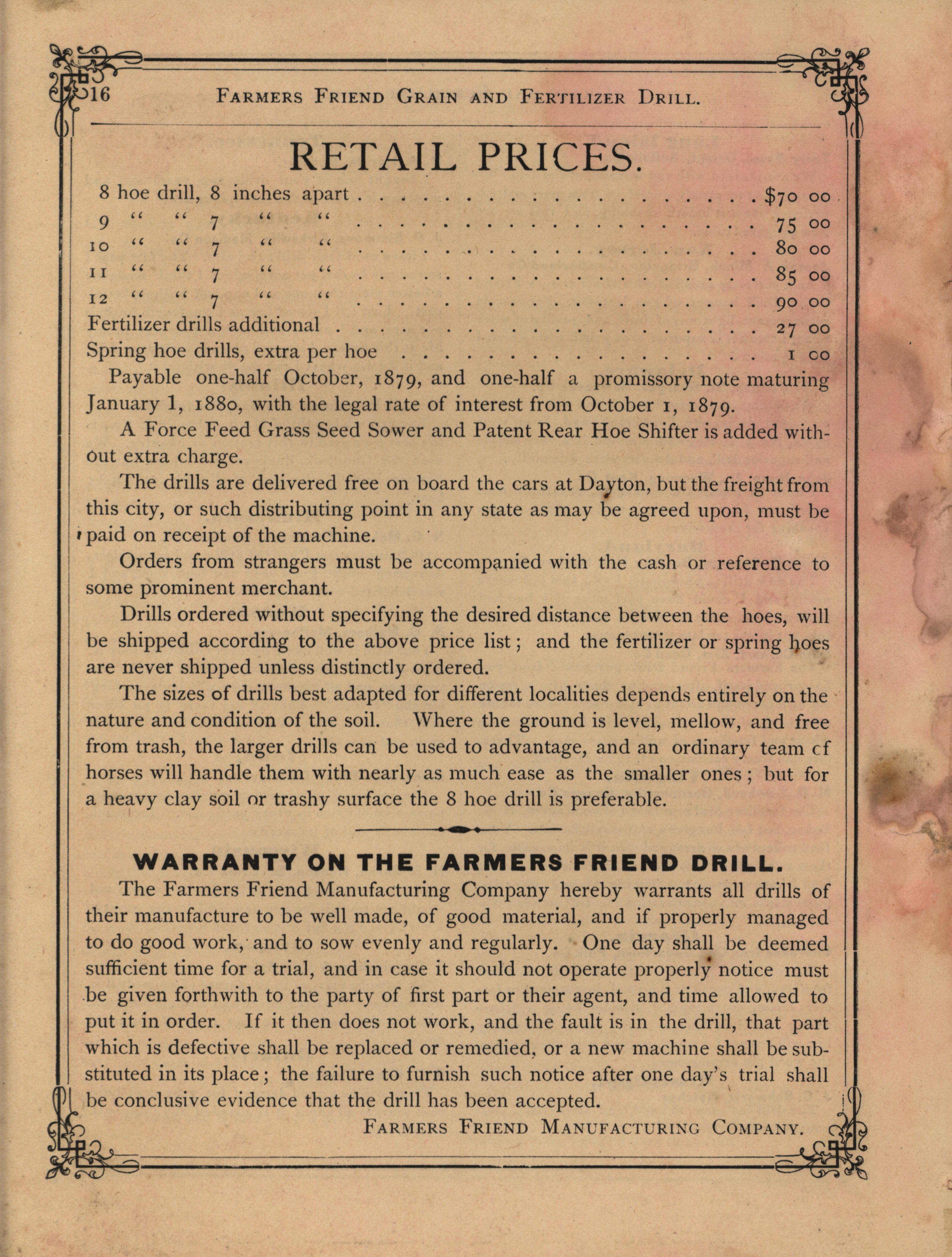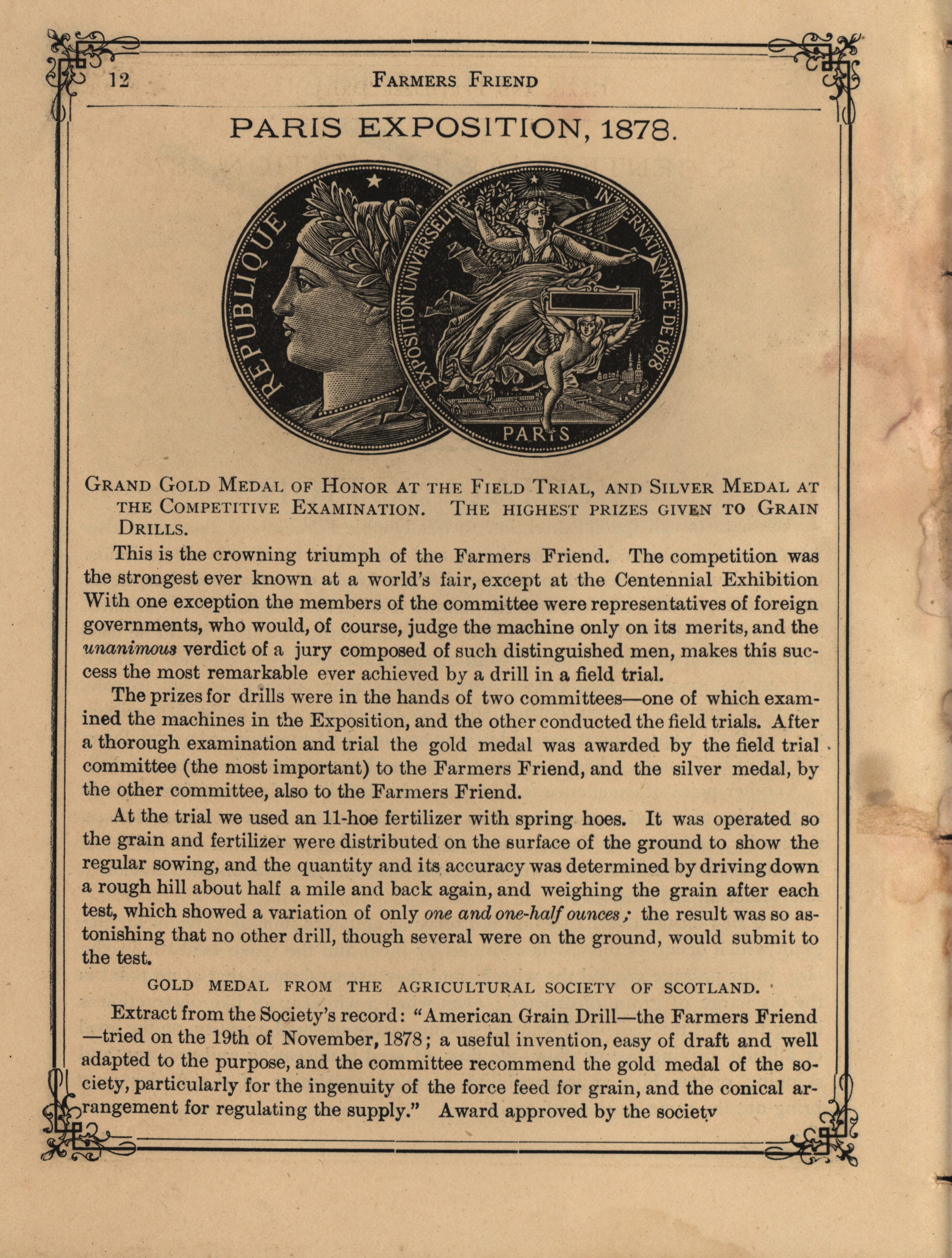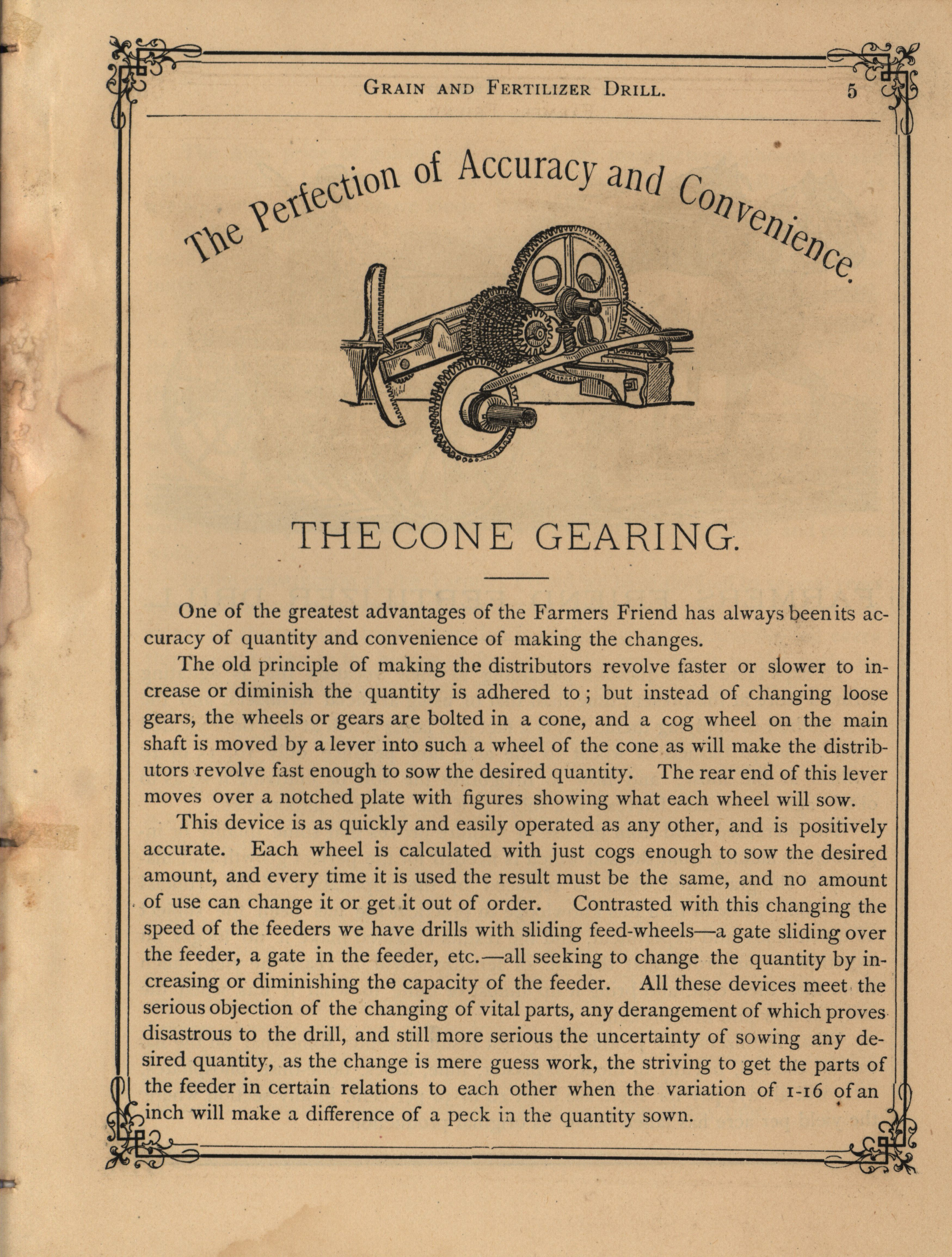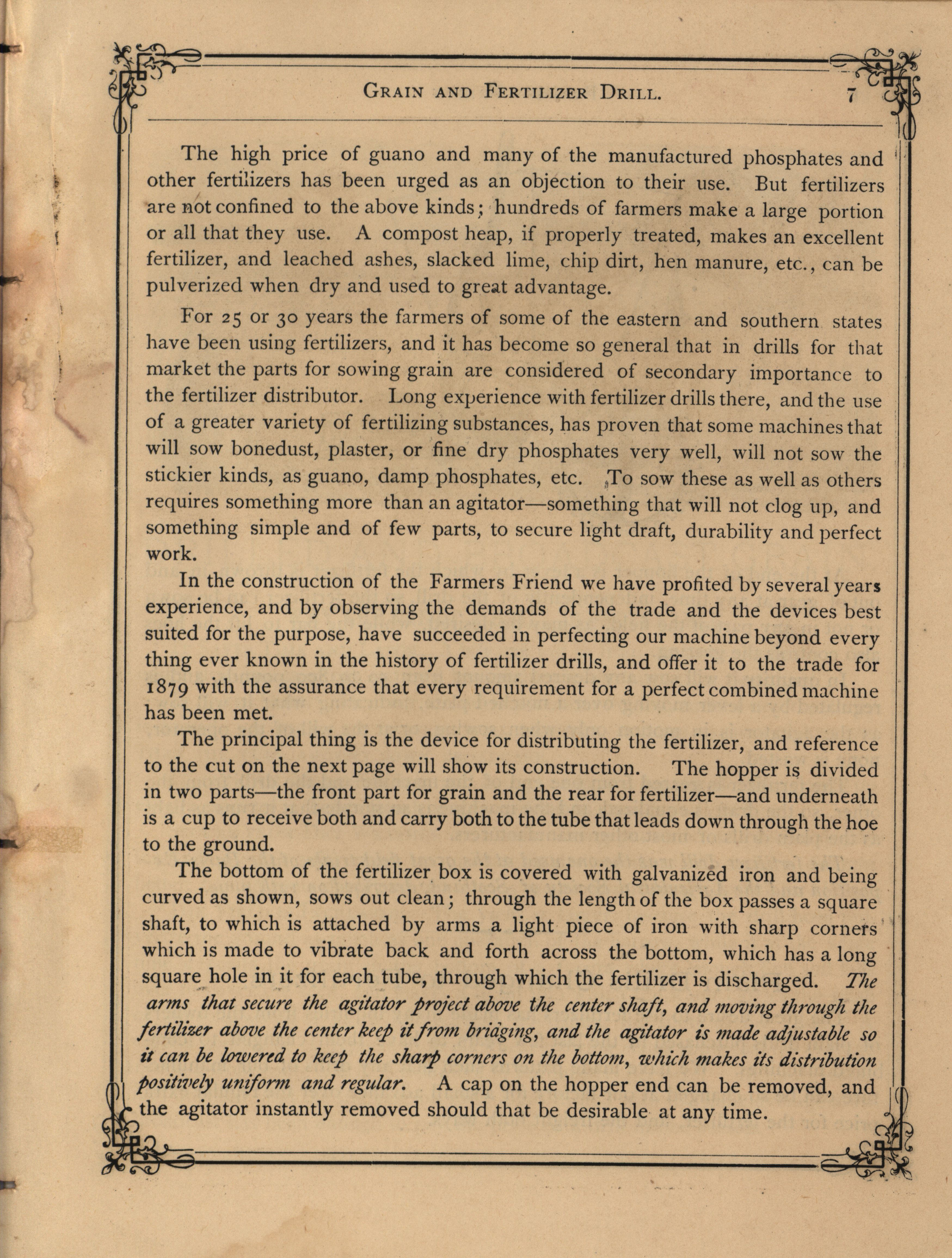 - Illustrated catalog describing the agricultural drills and related products offered by Farmers Friend Manufacturing Company in 1879.