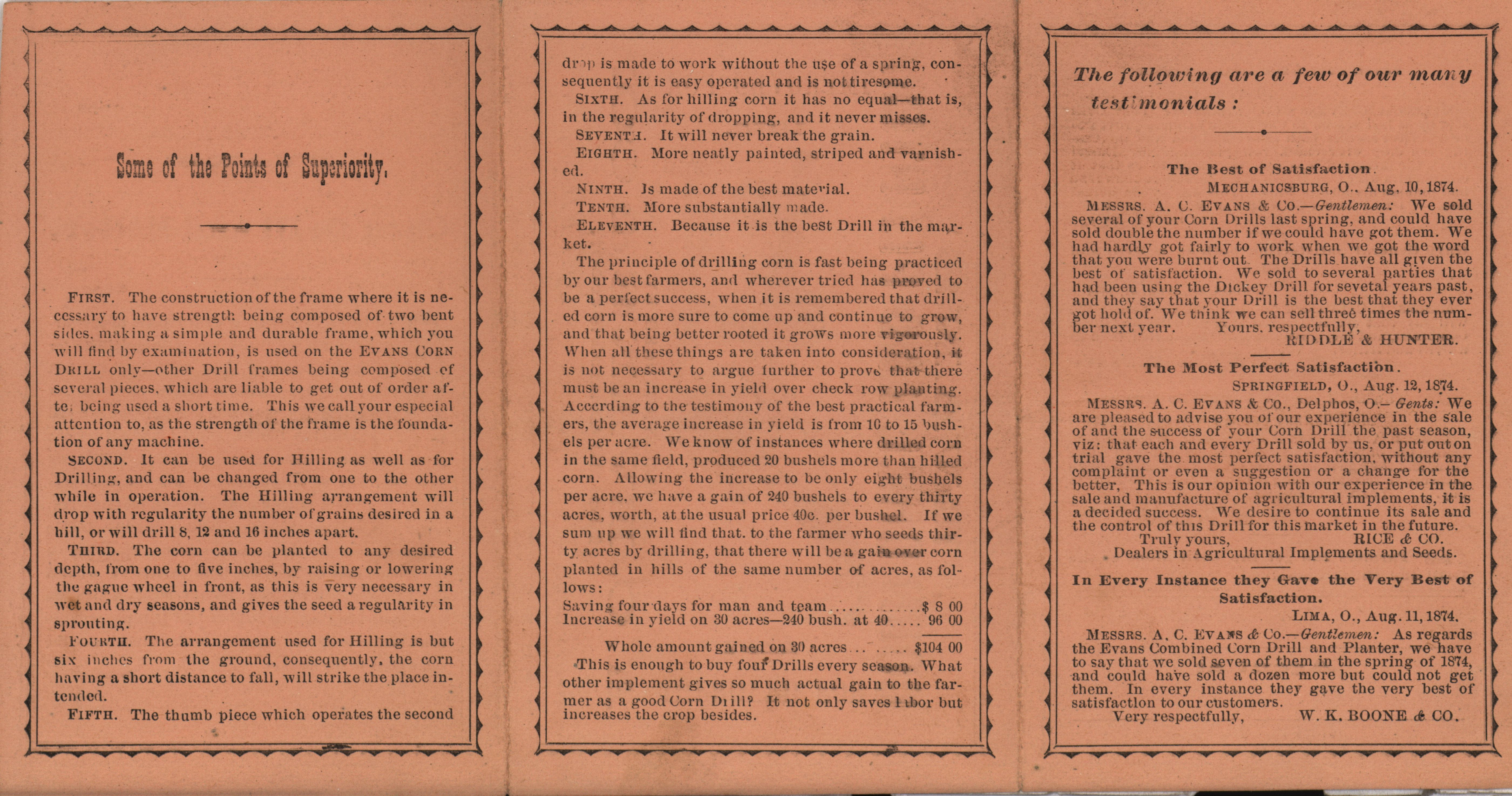 - Advertising pamphlet for the corn drill and planters offered by A. C. Evans and Company in 1875.