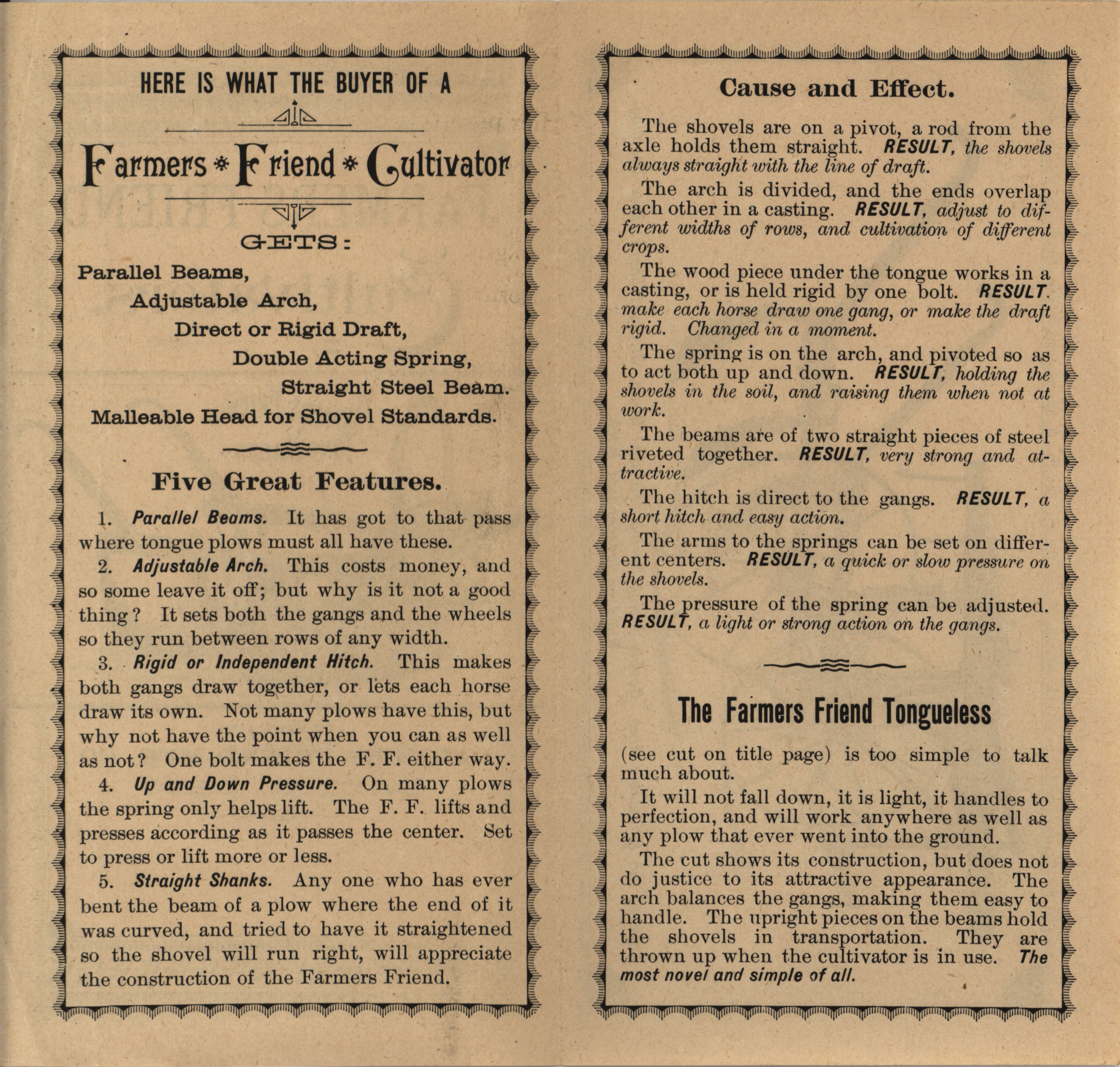 - Illustrated advertising pamphlet describing the agricultural cultivators offered by Farmers Friend Manufacturing Company.