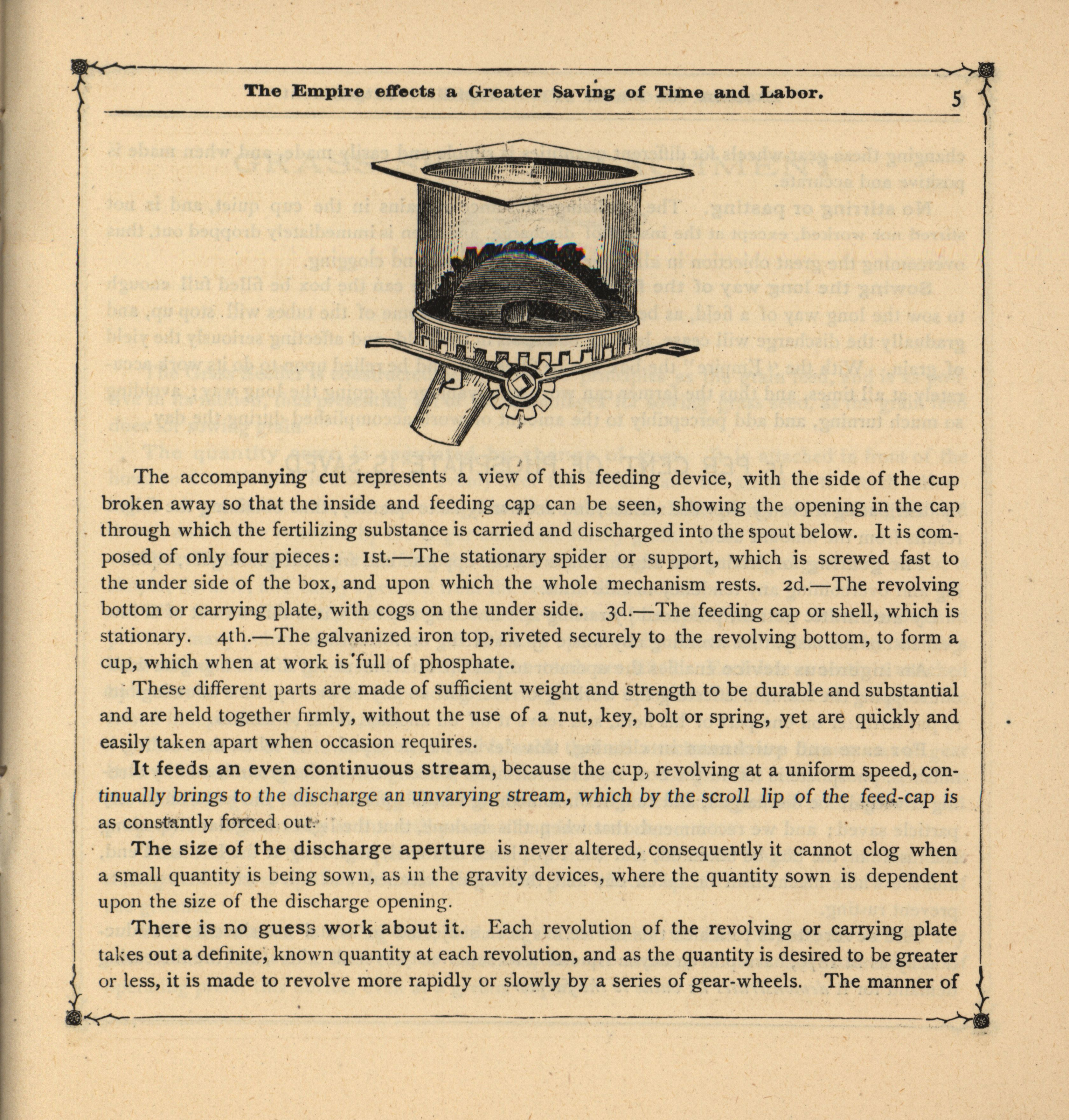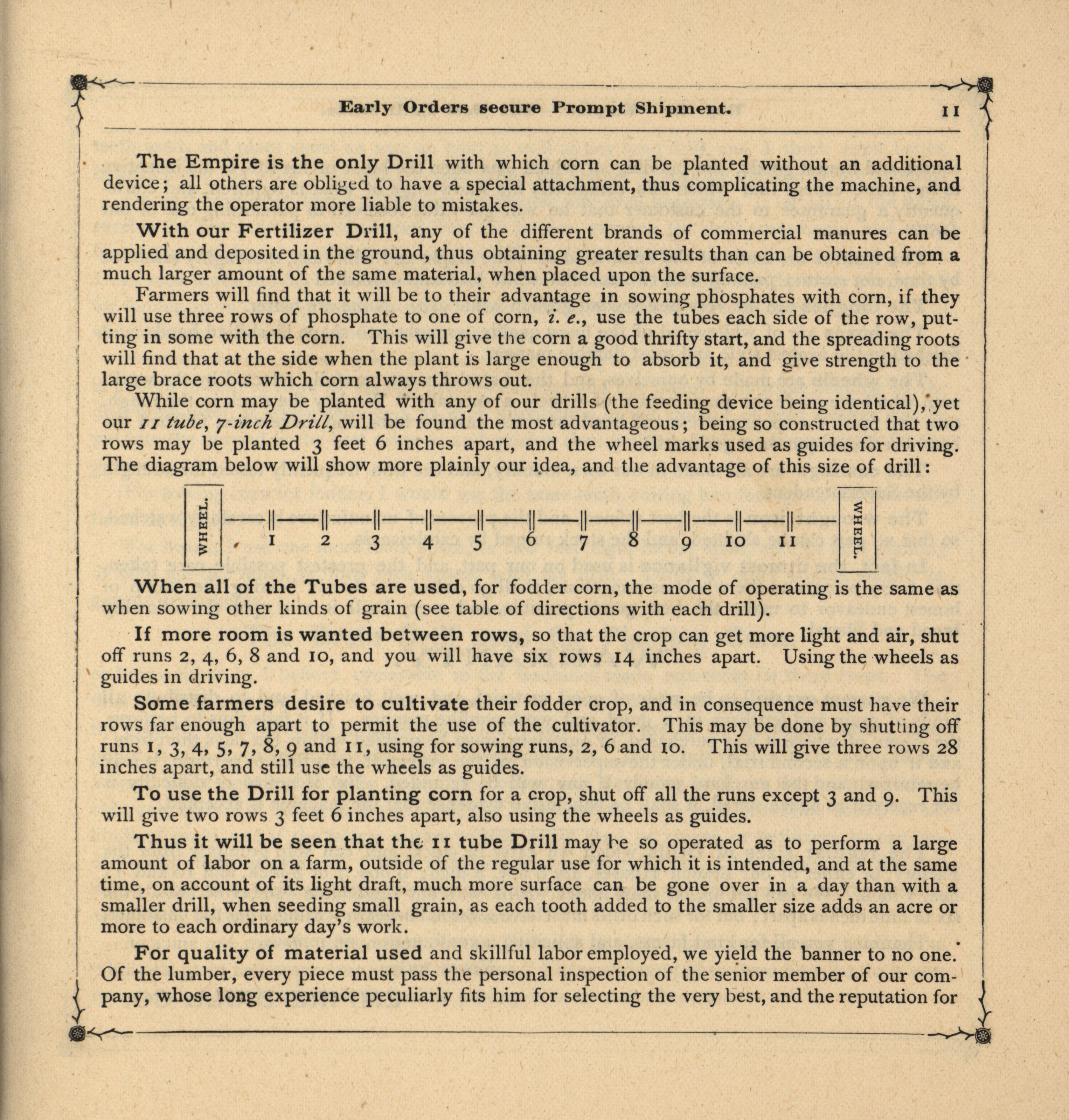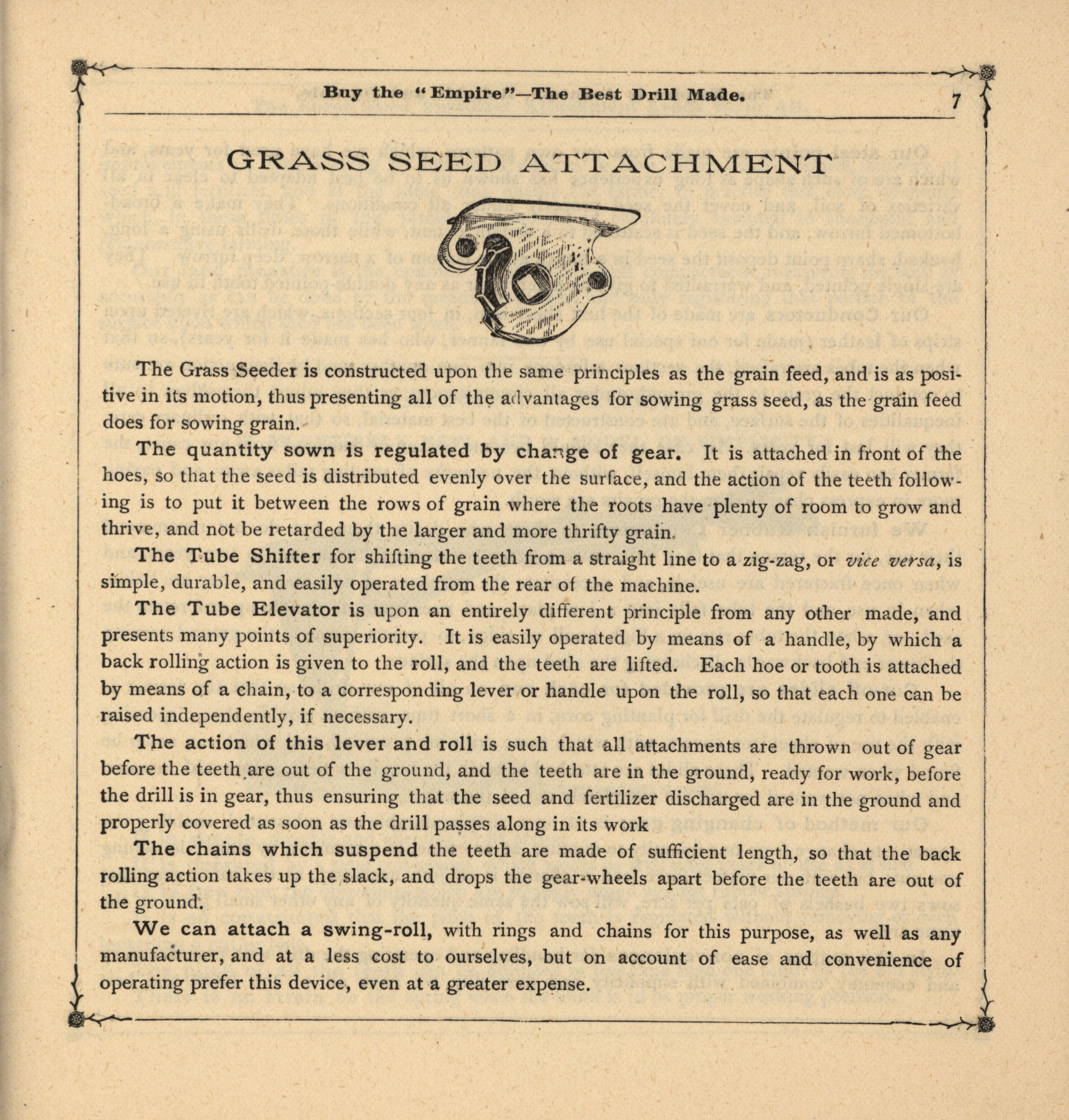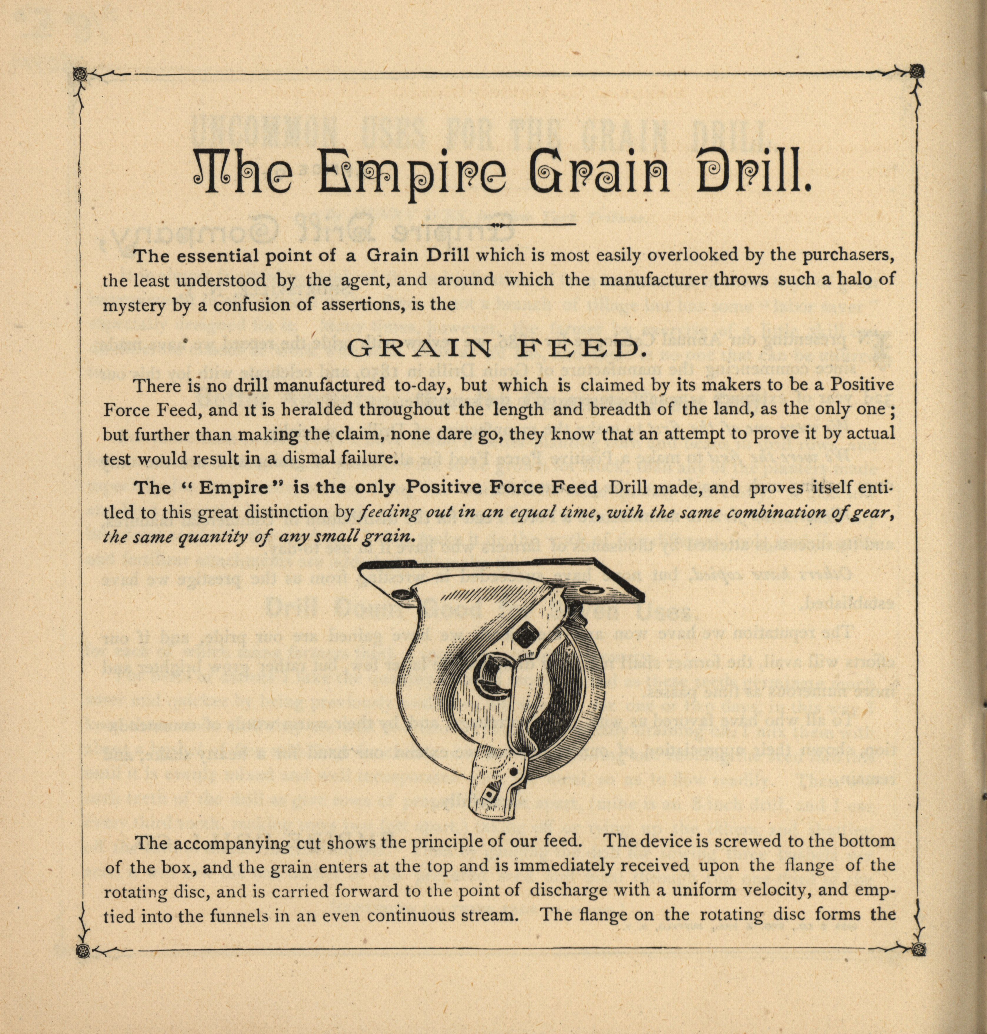 - Illustrated catalog describing the grain and fertilizer drills offered by the Empire Drill Company in 1886.