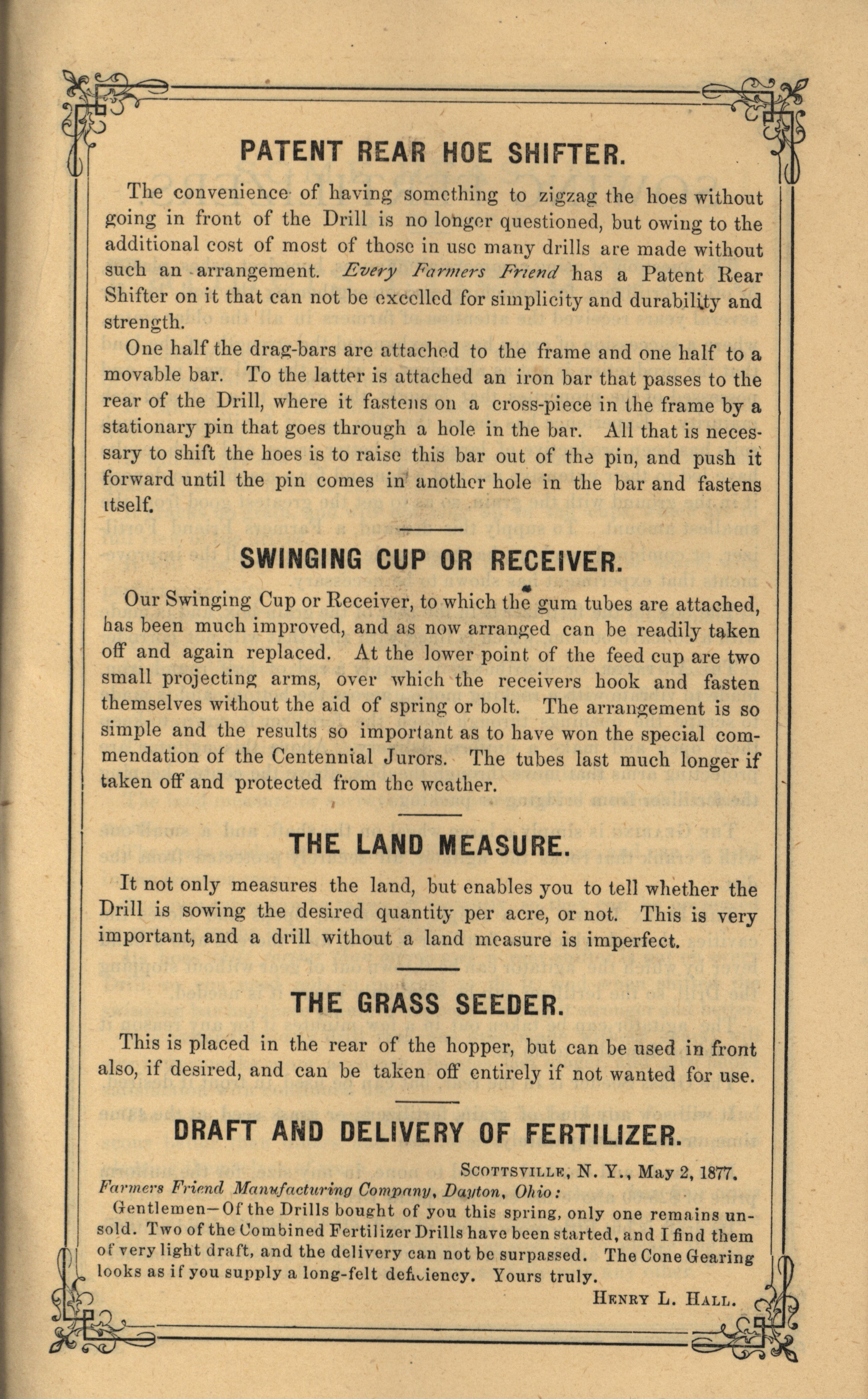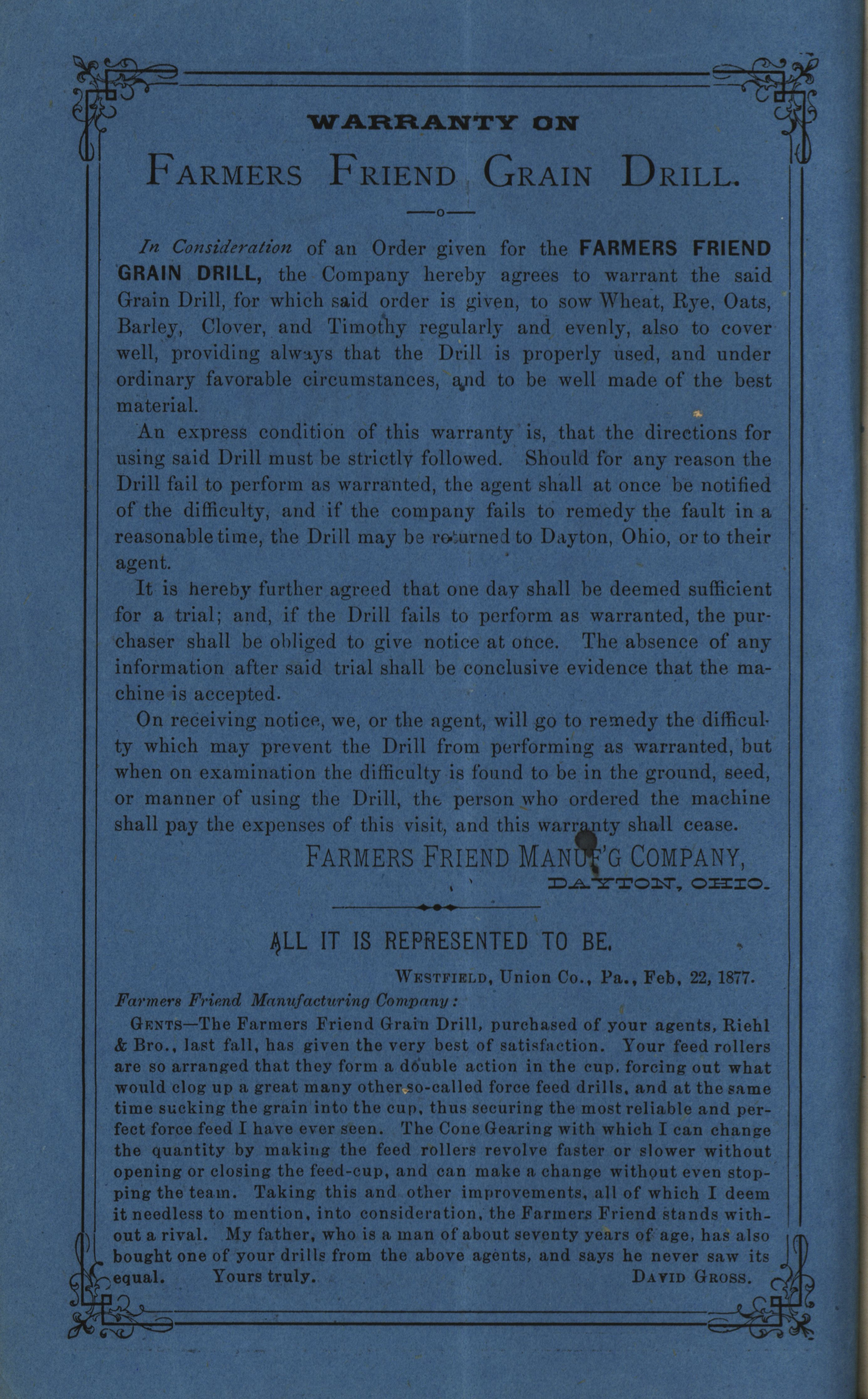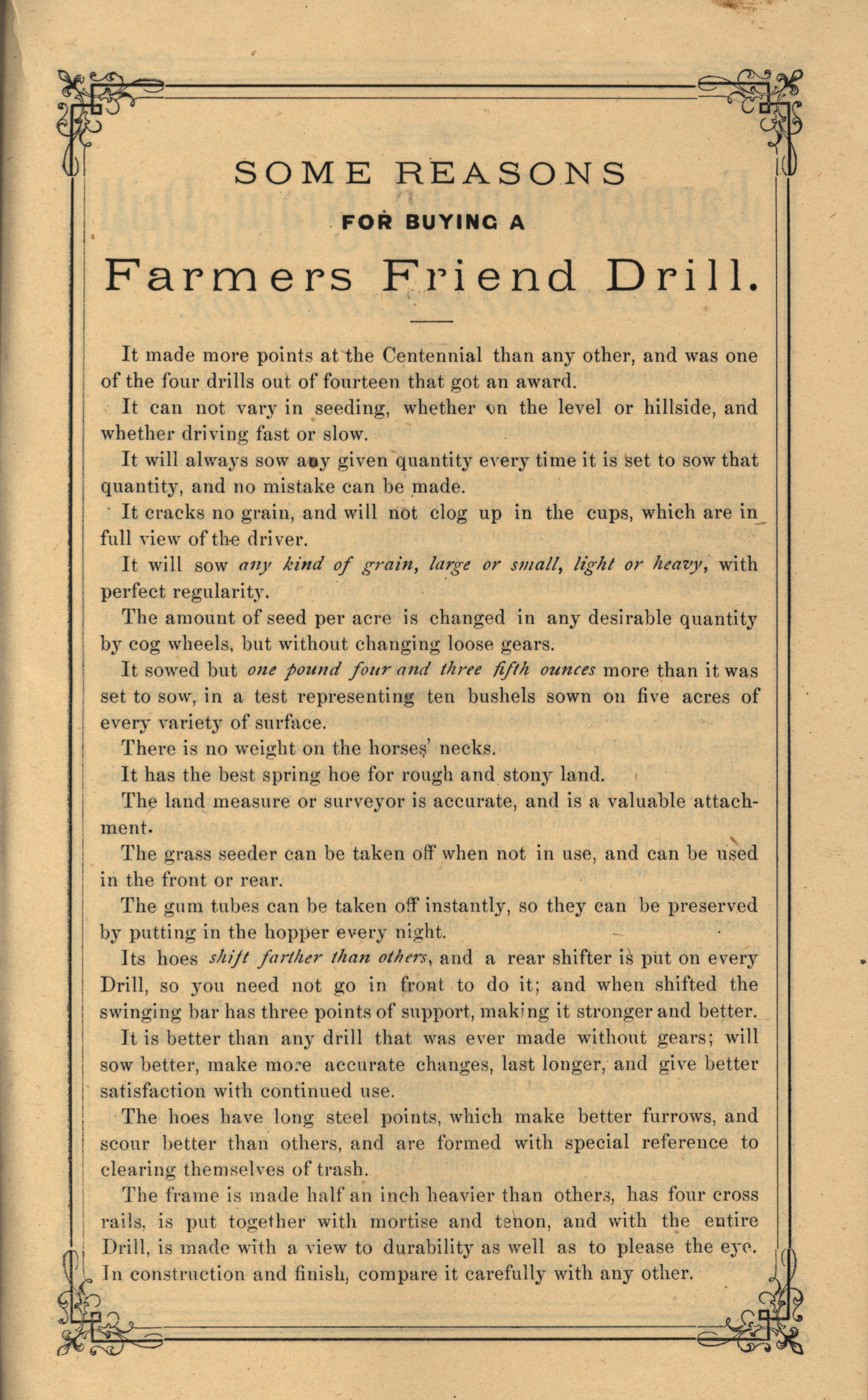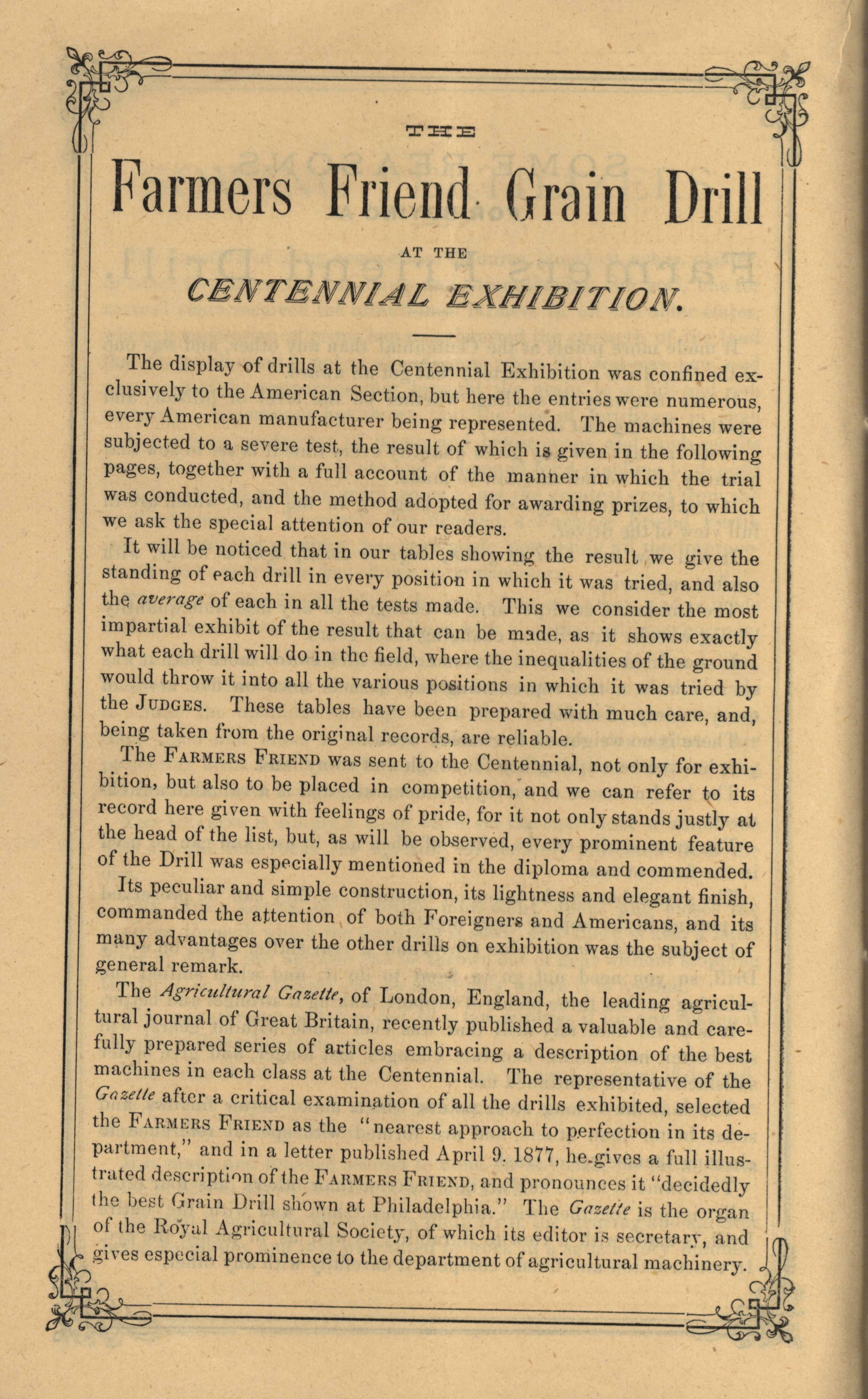- "Farmers Friend Manufacturing Company grain drill catalog", Agricultural Machinery Literature Collection, Iowa State University Library Digital Collections