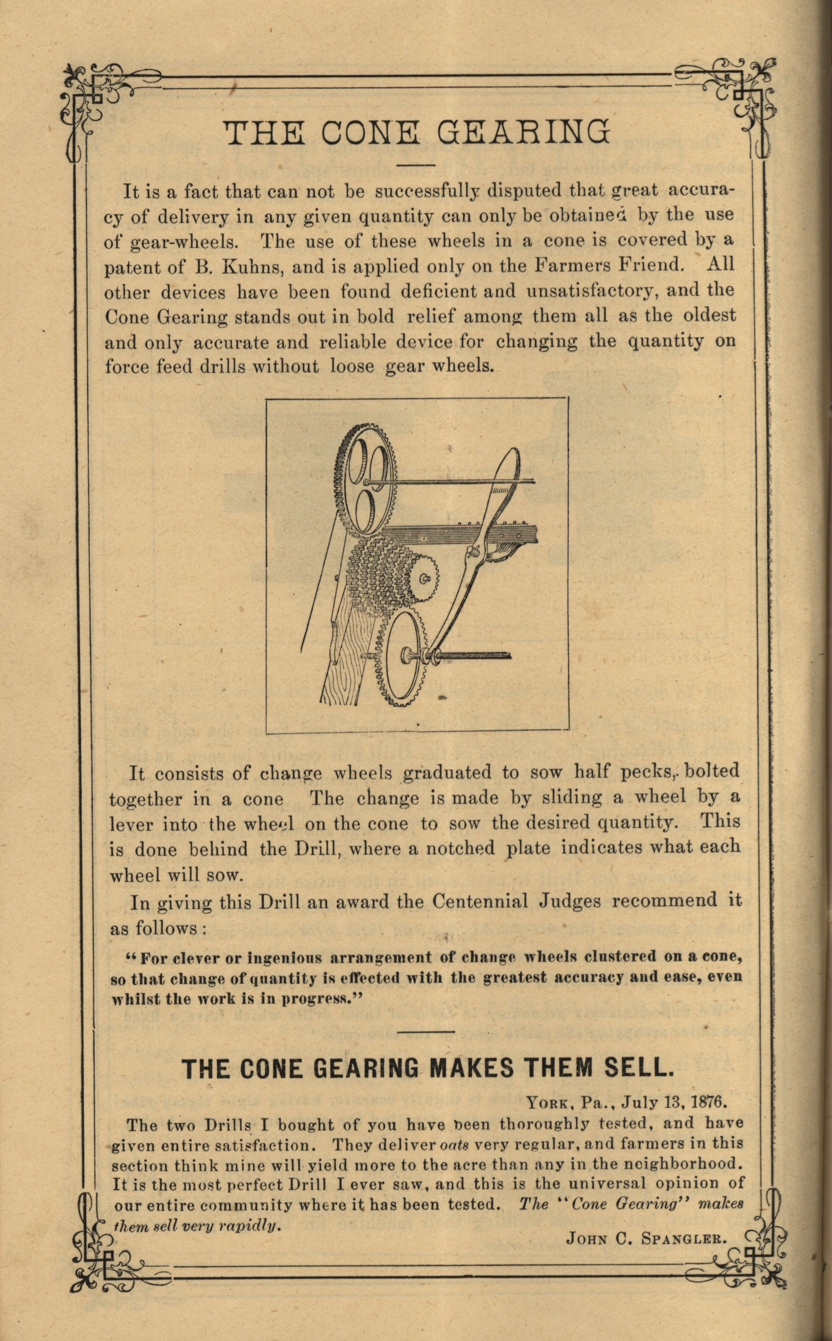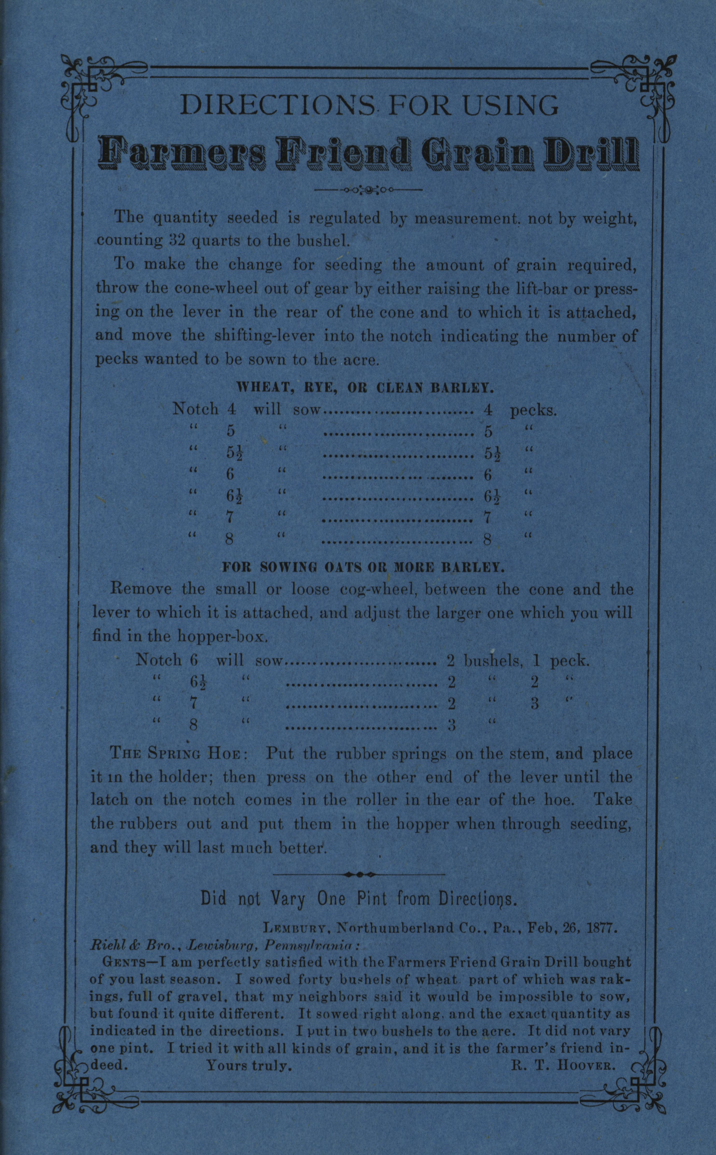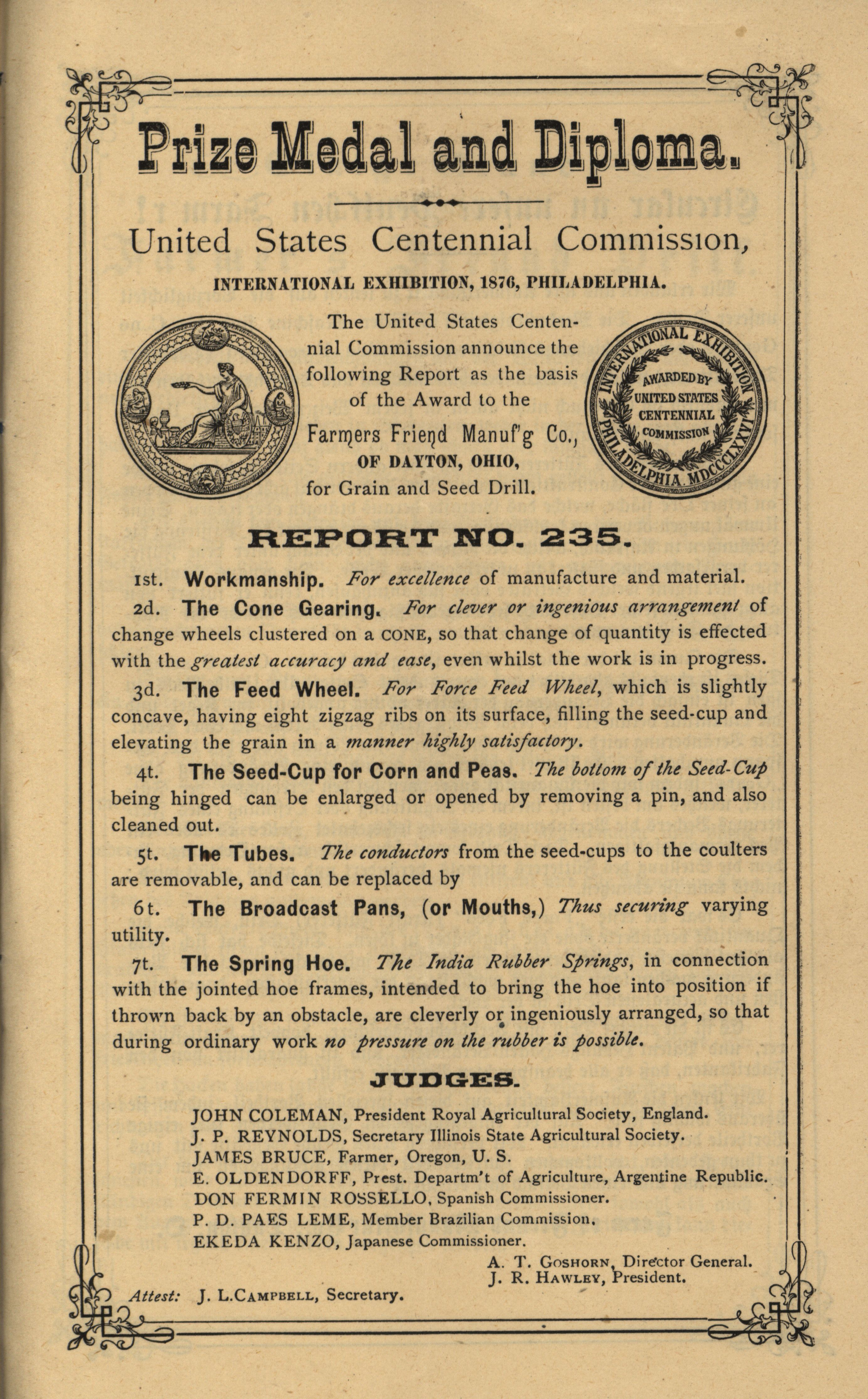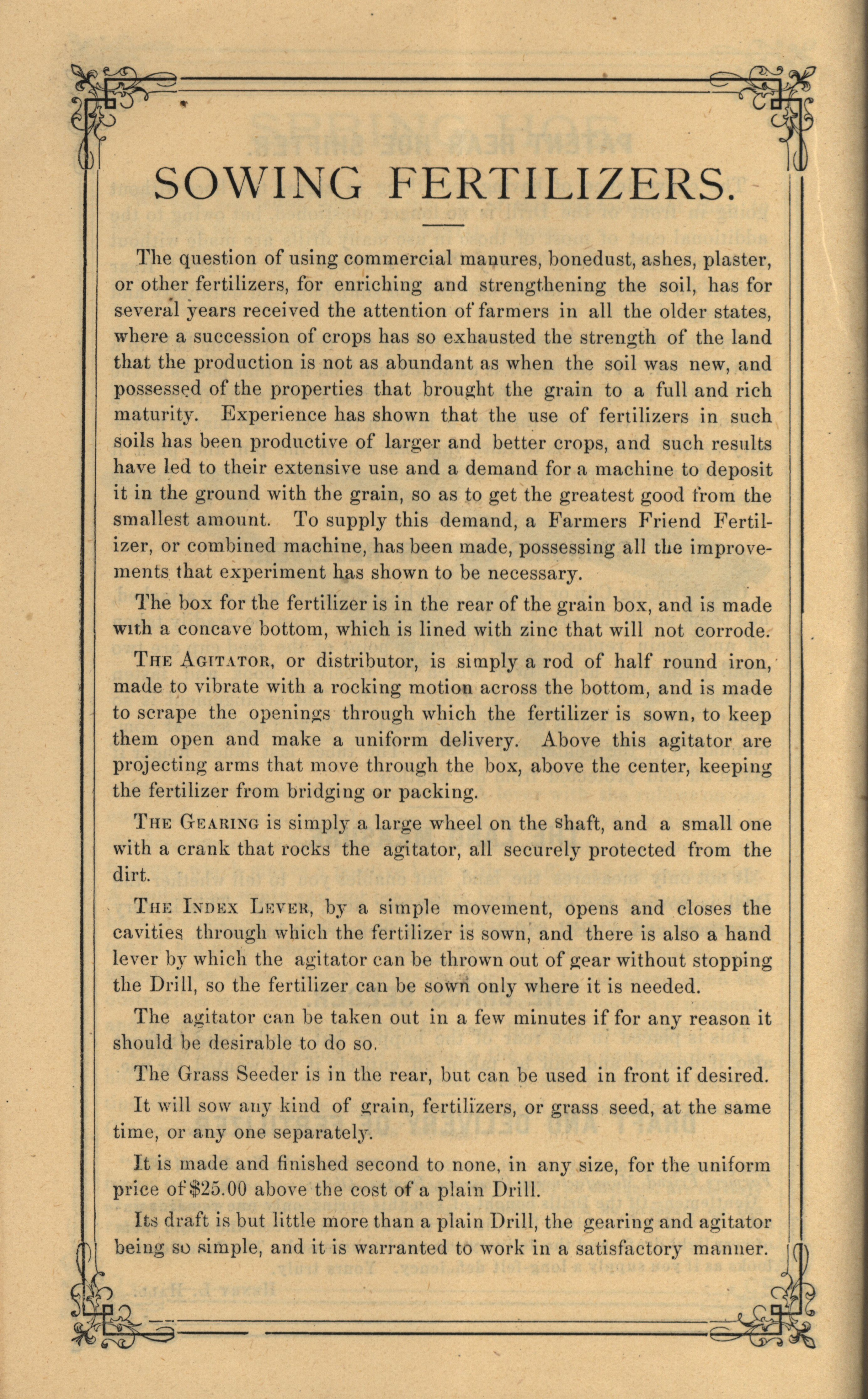 - "Farmers Friend Manufacturing Company grain drill catalog", Agricultural Machinery Literature Collection, Iowa State University Library Digital Collections