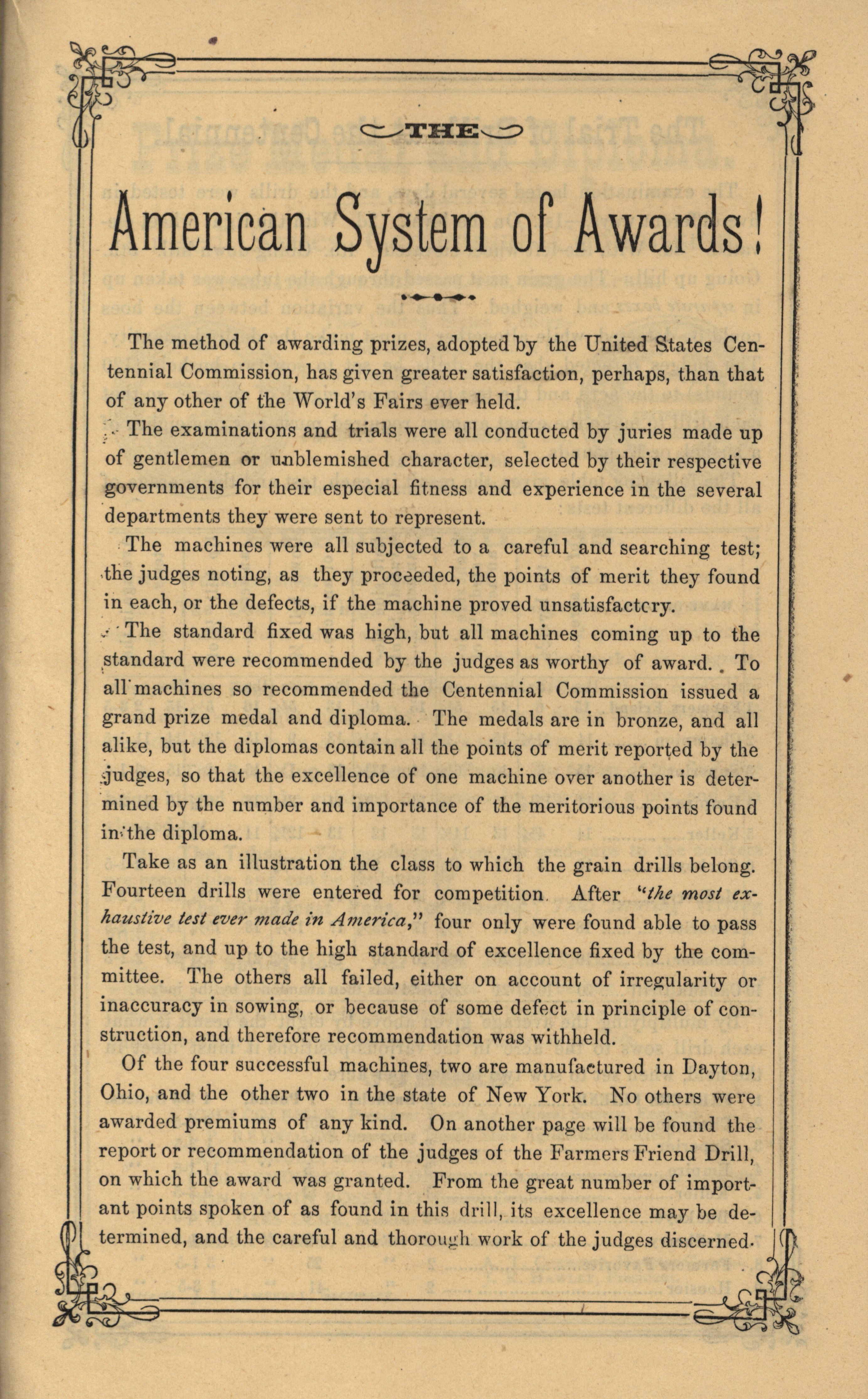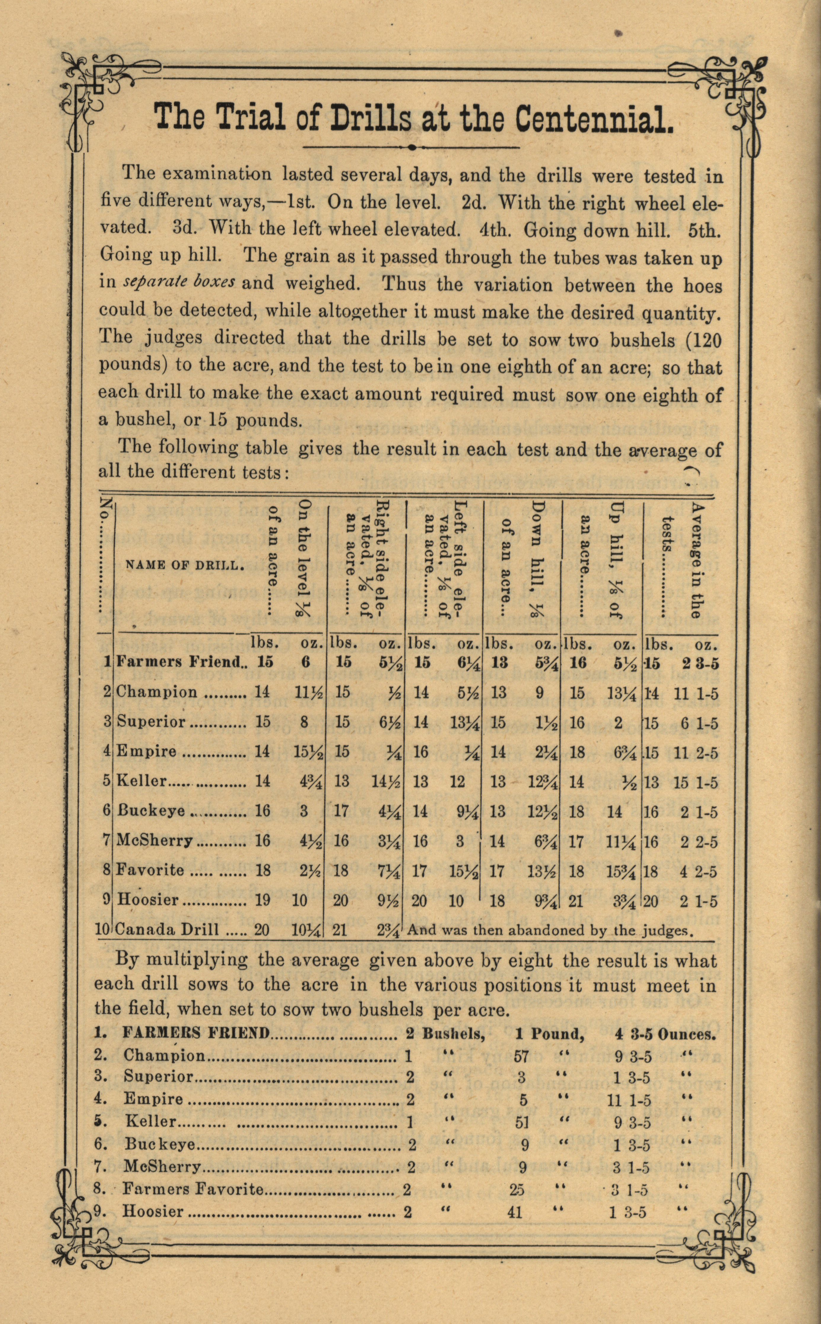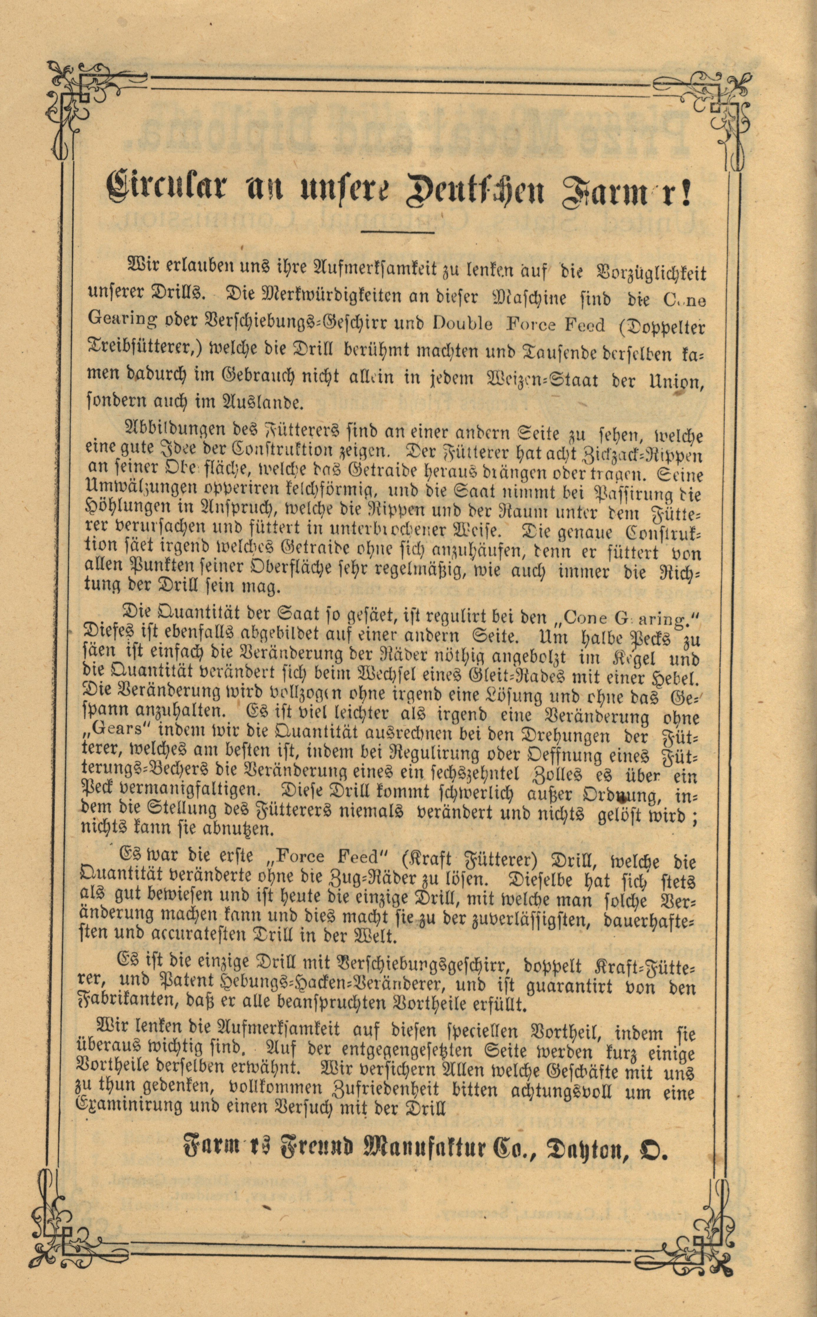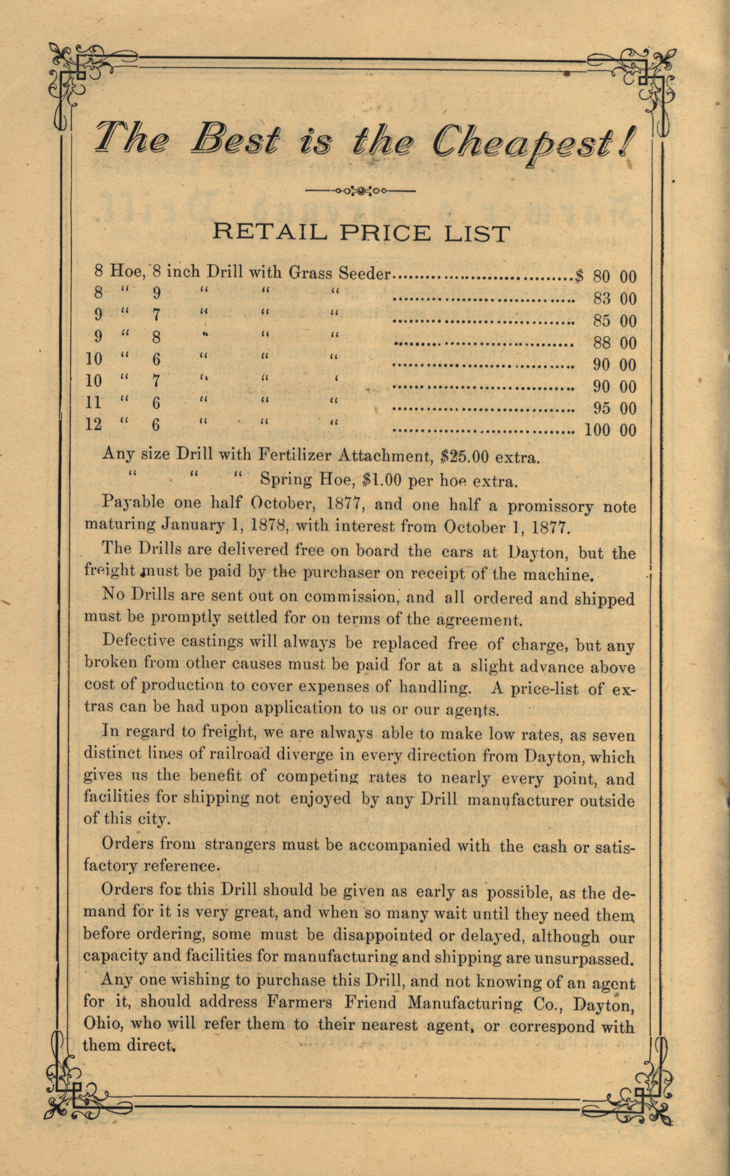 - "Farmers Friend Manufacturing Company grain drill catalog", Agricultural Machinery Literature Collection, Iowa State University Library Digital Collections