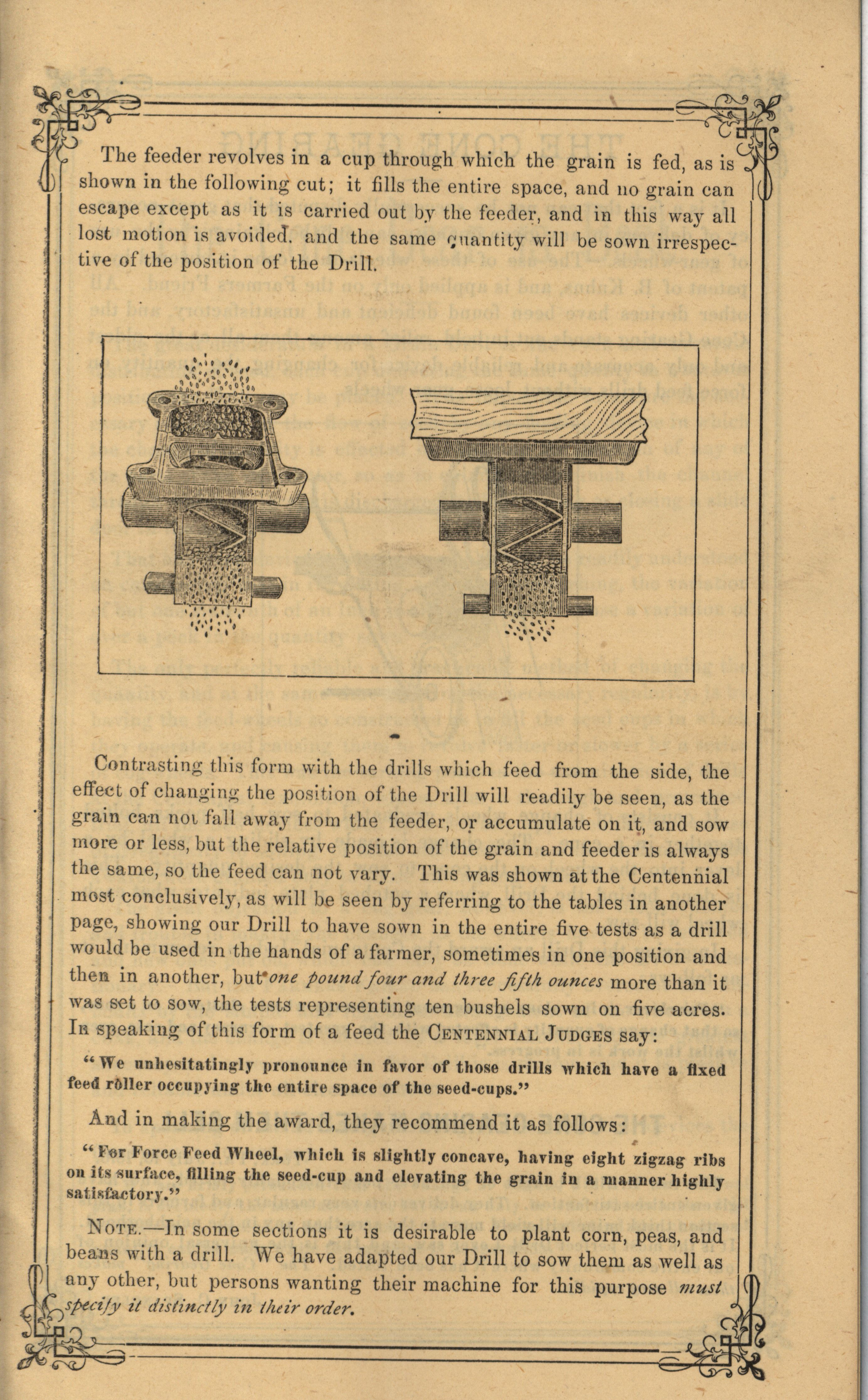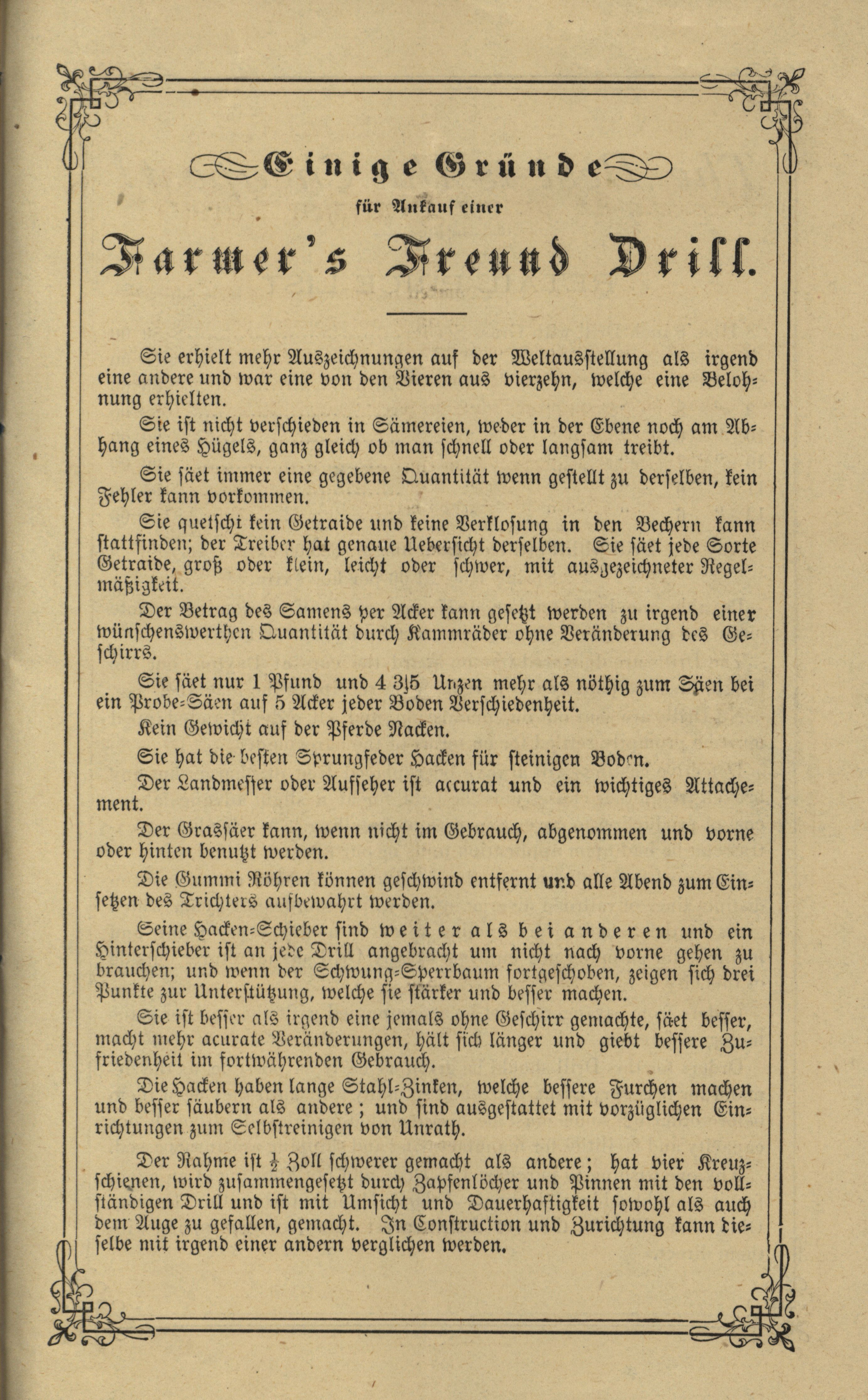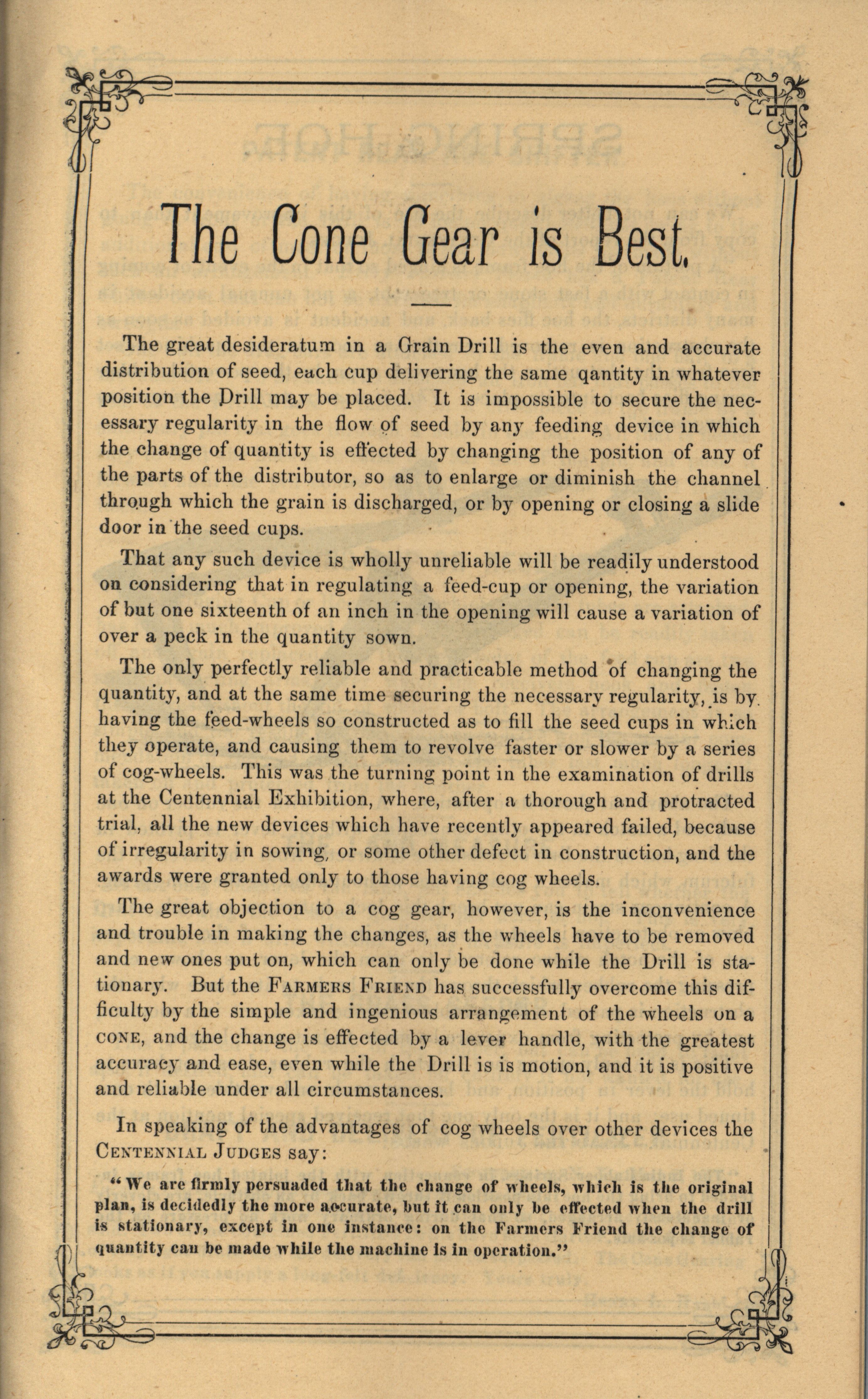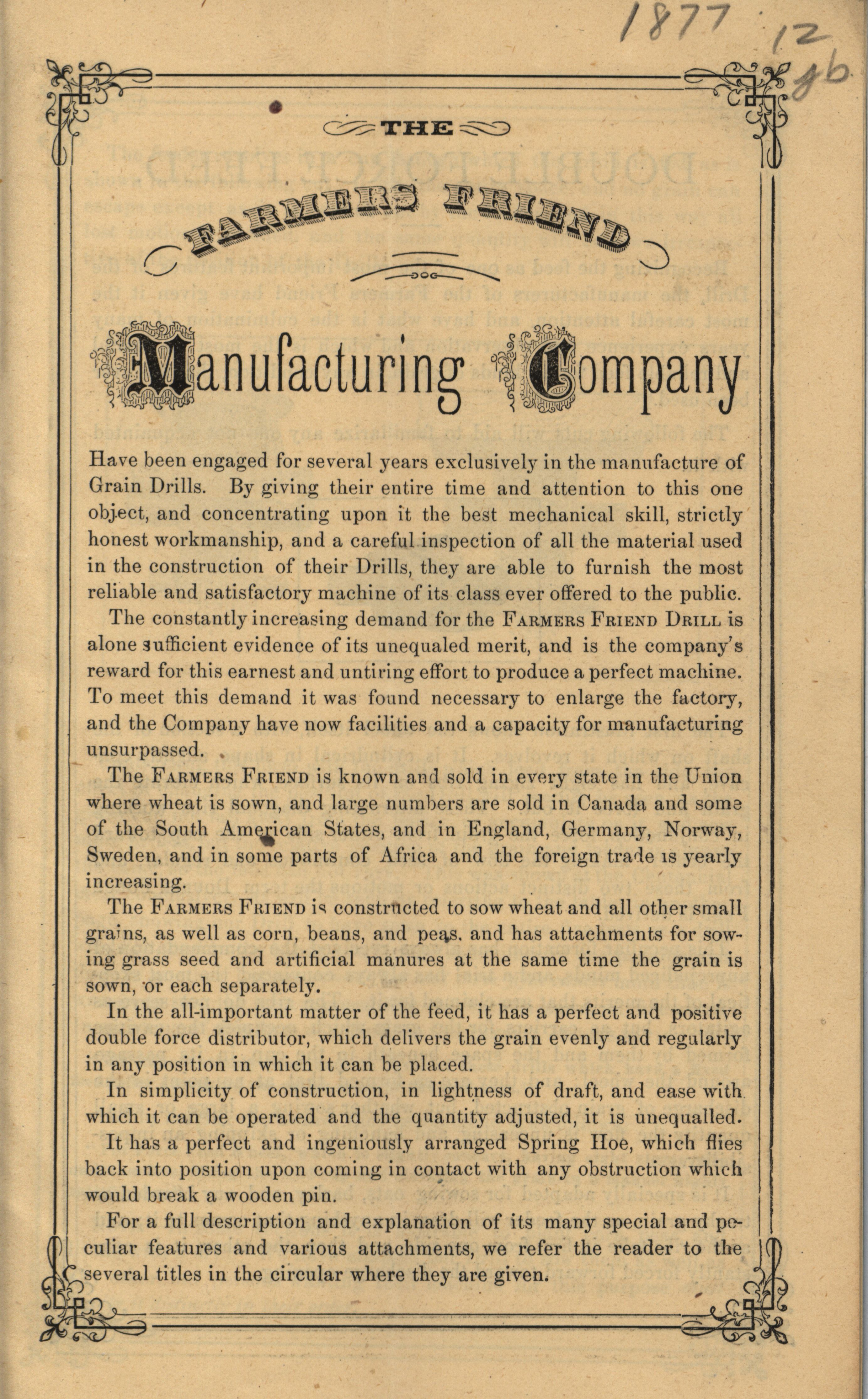 - Illustrated catalog describing the grain drill offered by Farmers Friend Manufacturing Company in 1877.