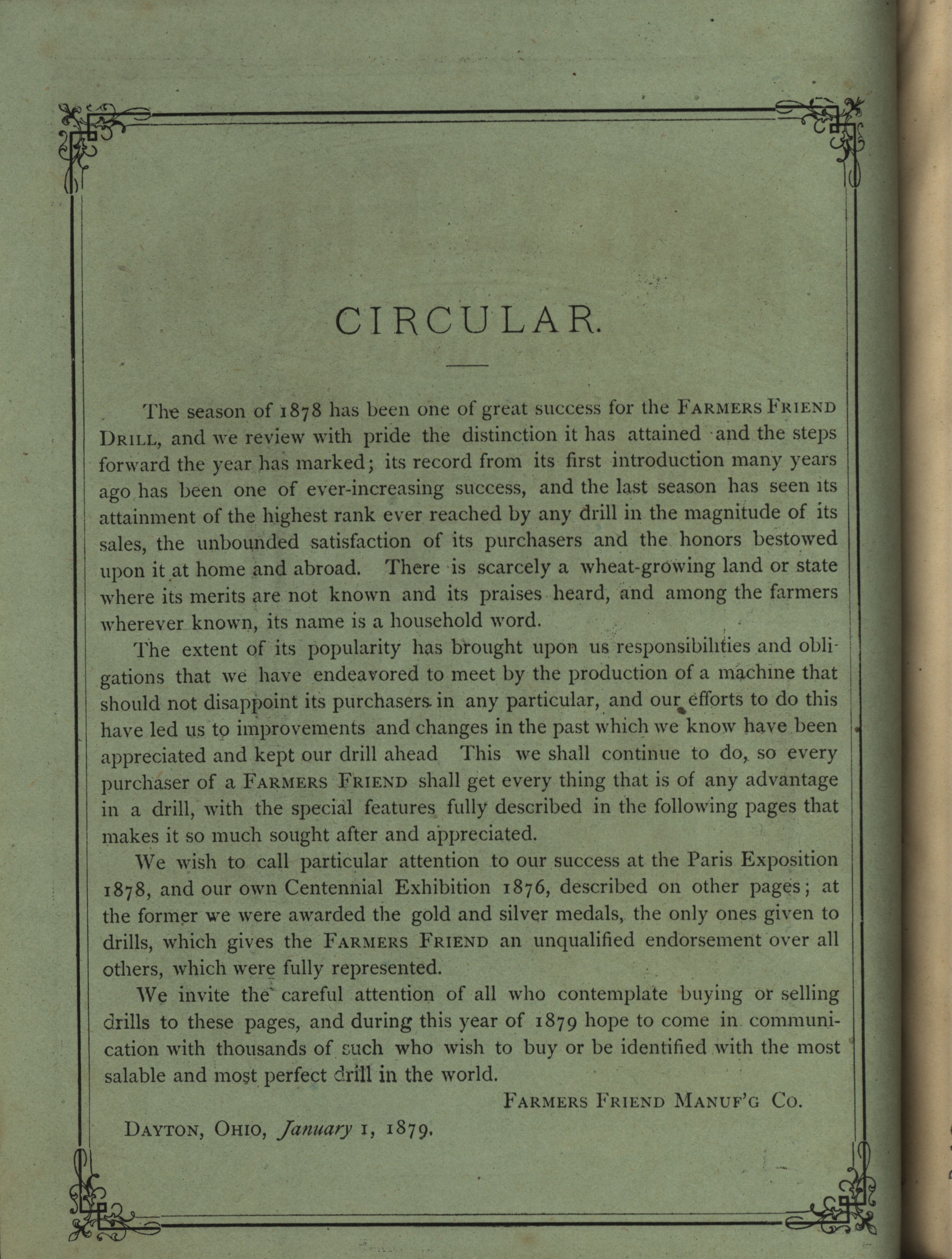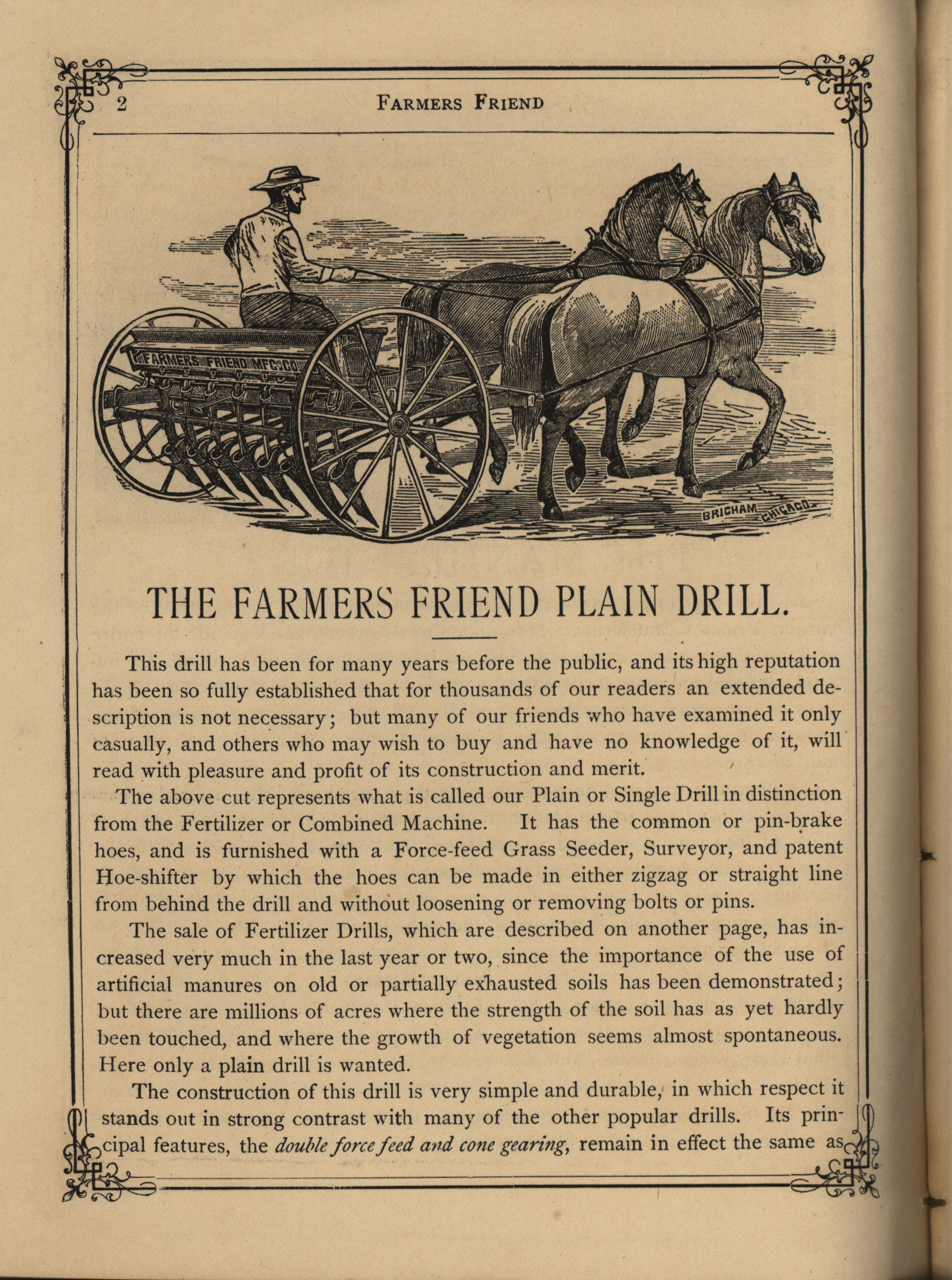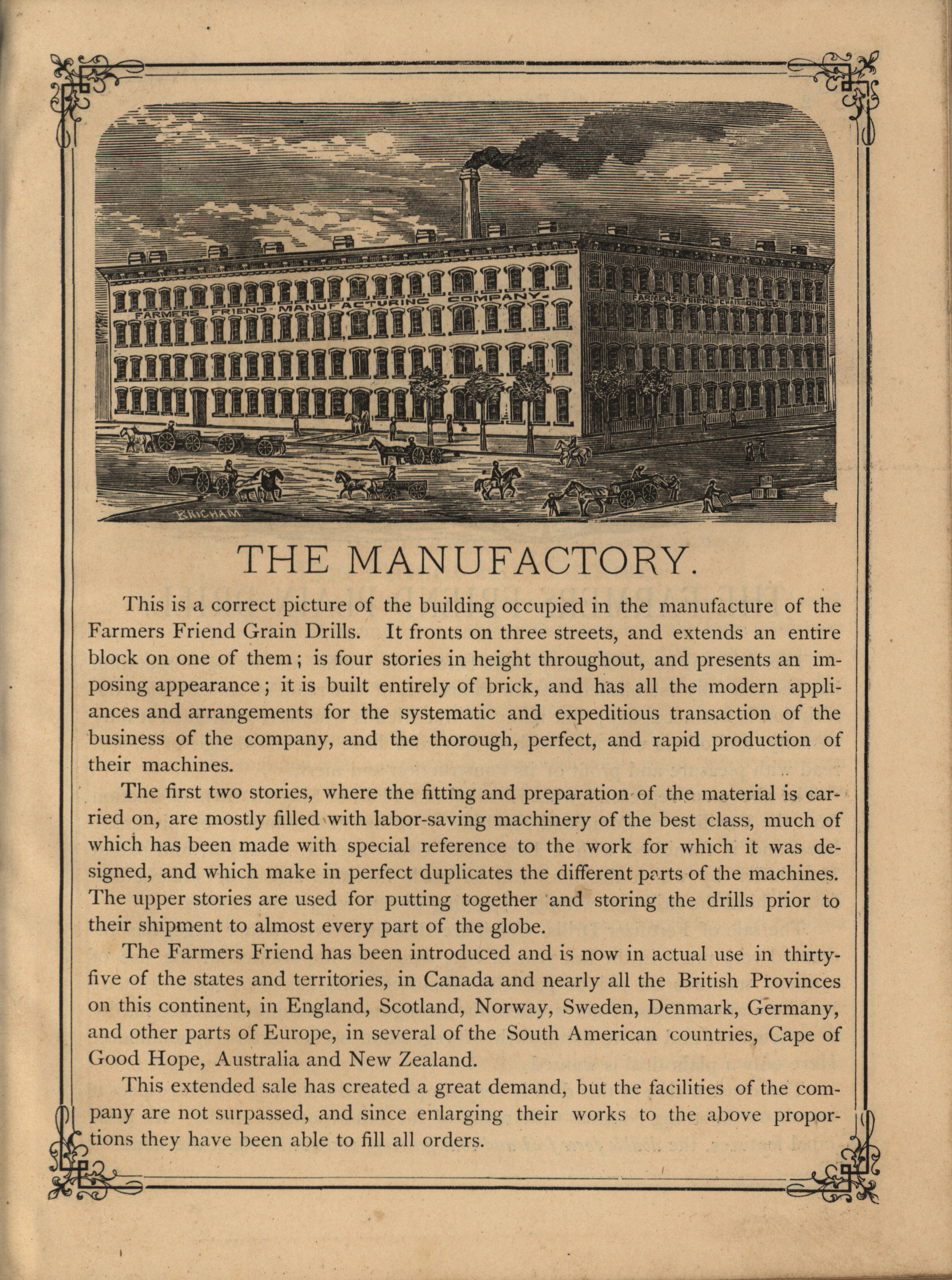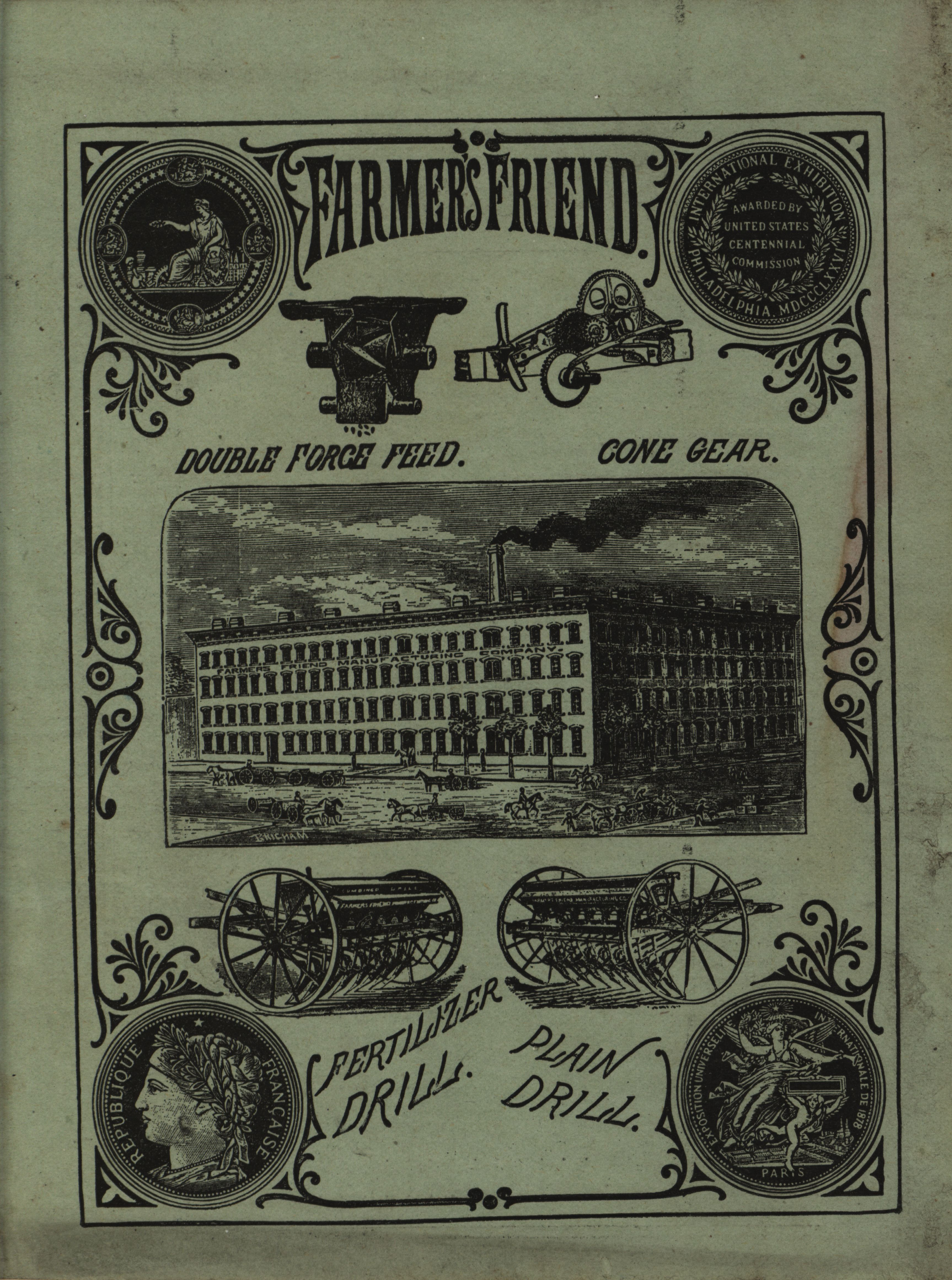 - Illustrated catalog describing the agricultural drills and related products offered by Farmers Friend Manufacturing Company in 1879.