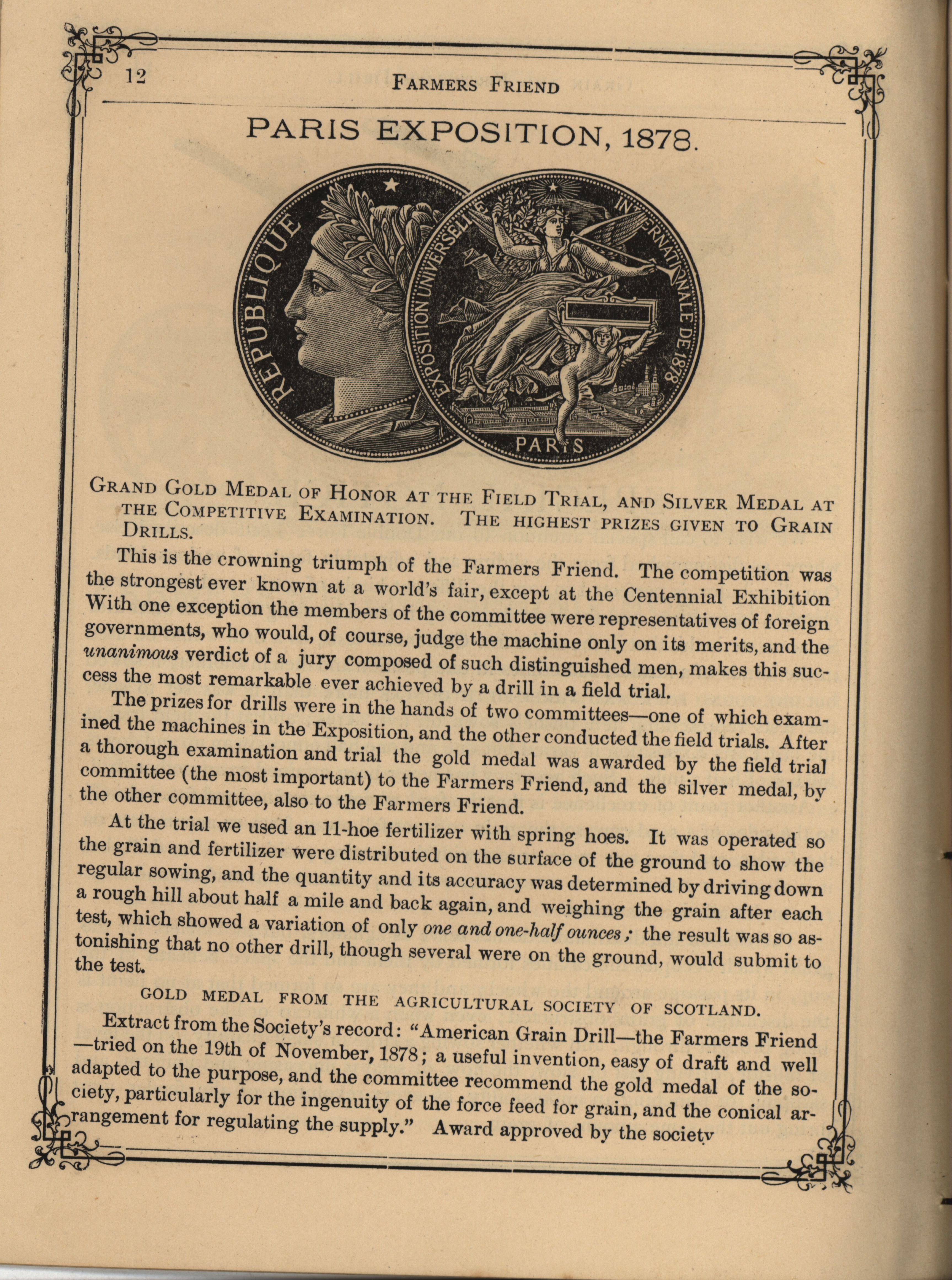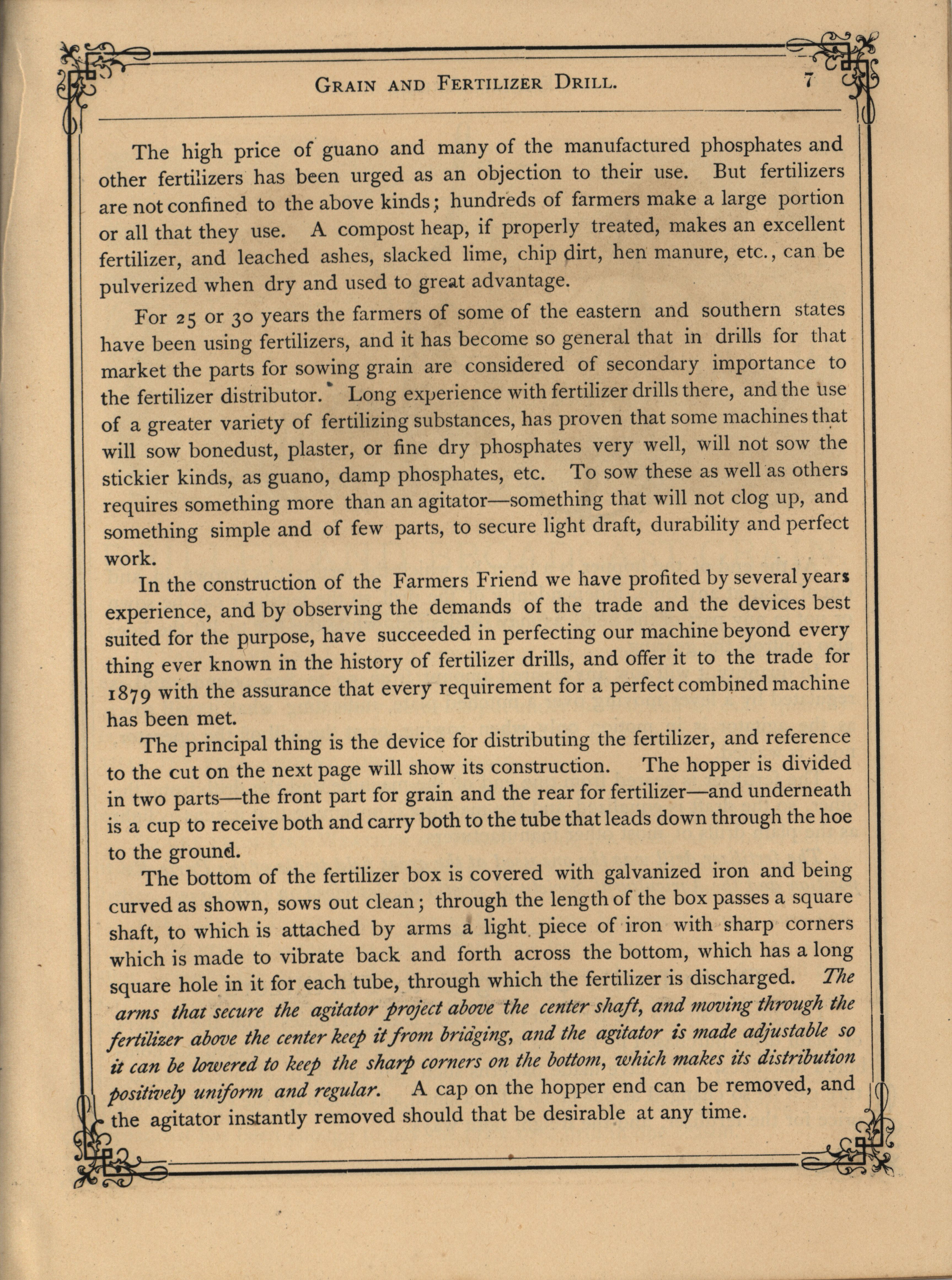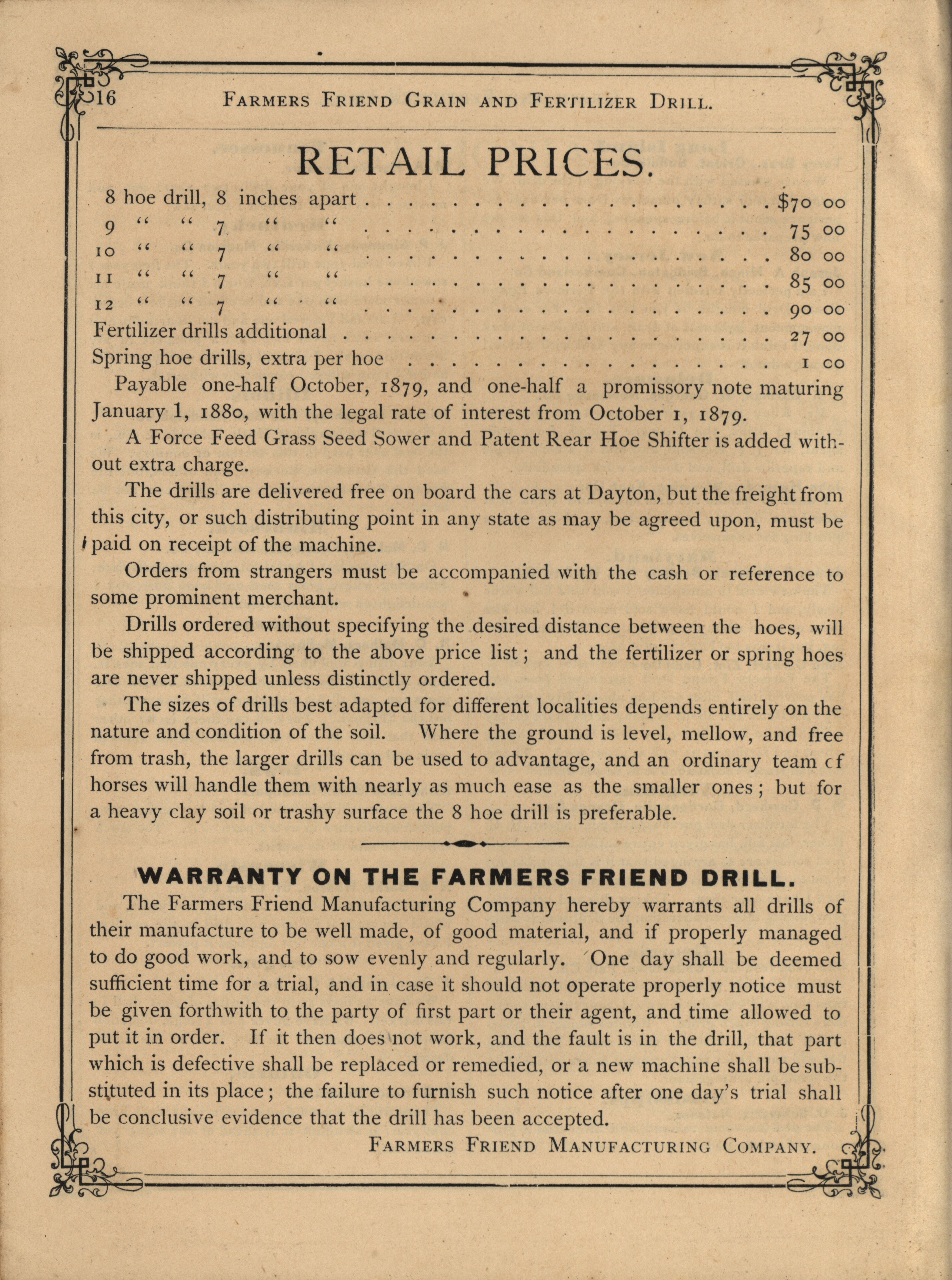 - Illustrated catalog describing the agricultural drills and related products offered by Farmers Friend Manufacturing Company in 1879.
