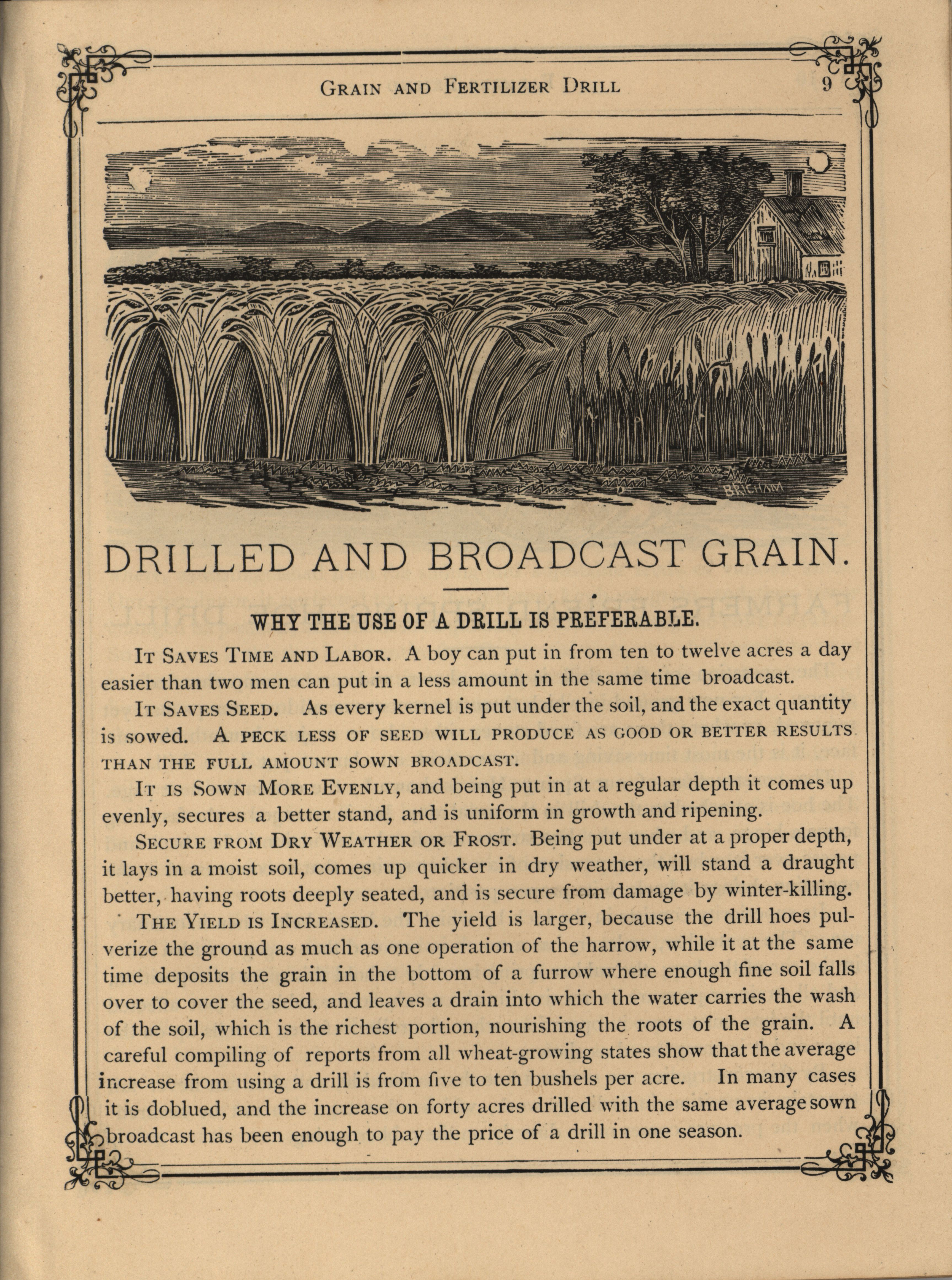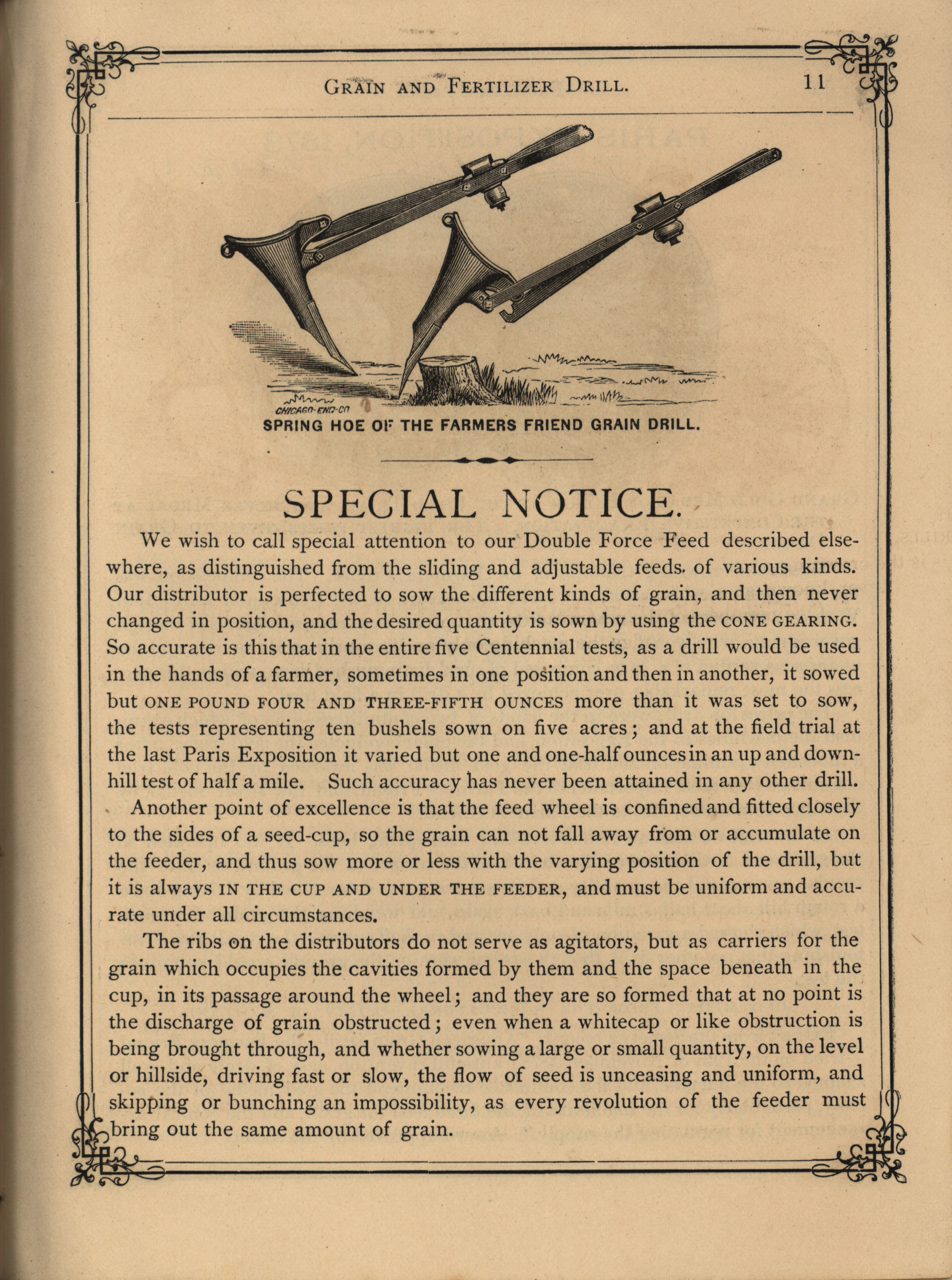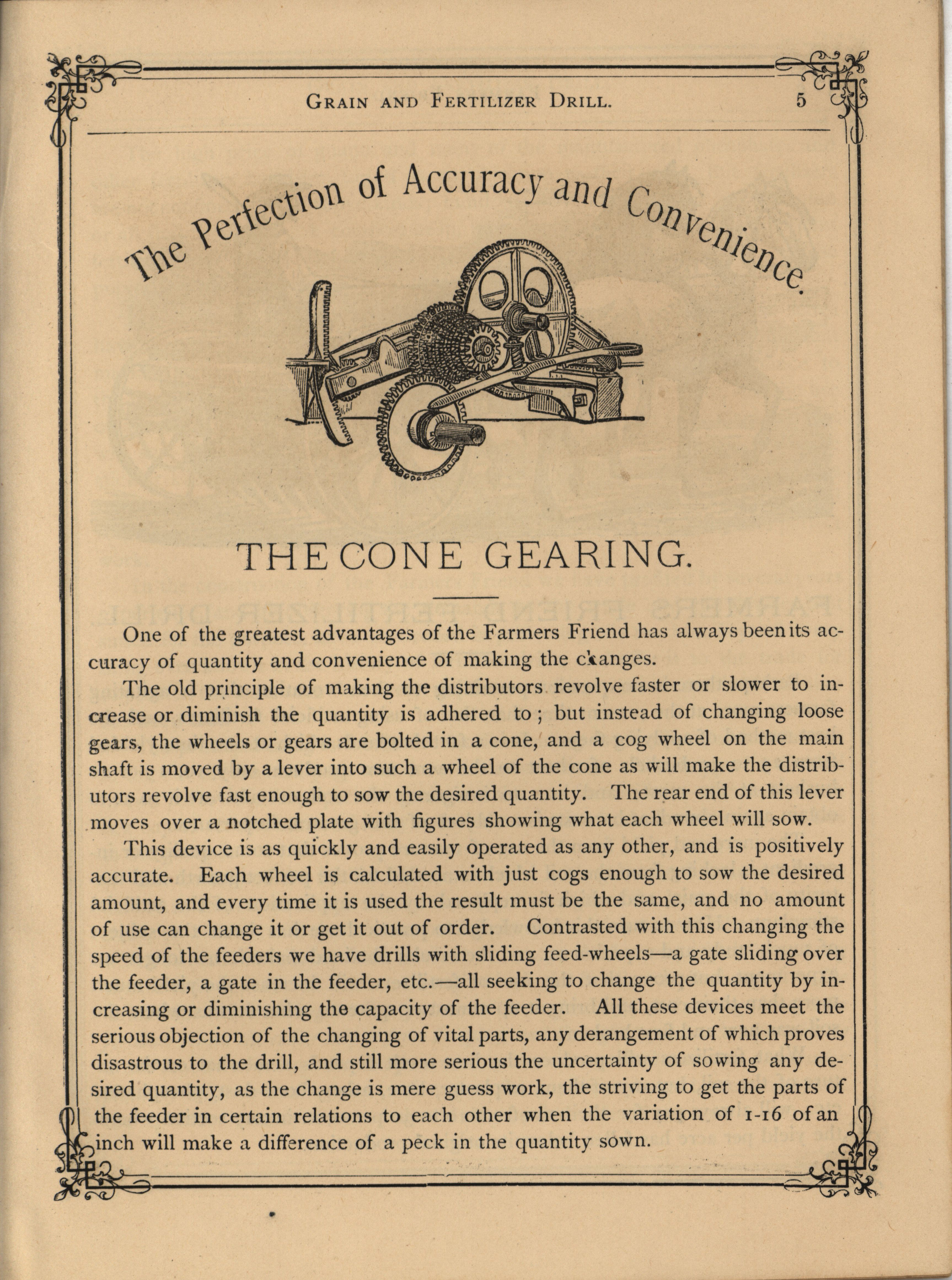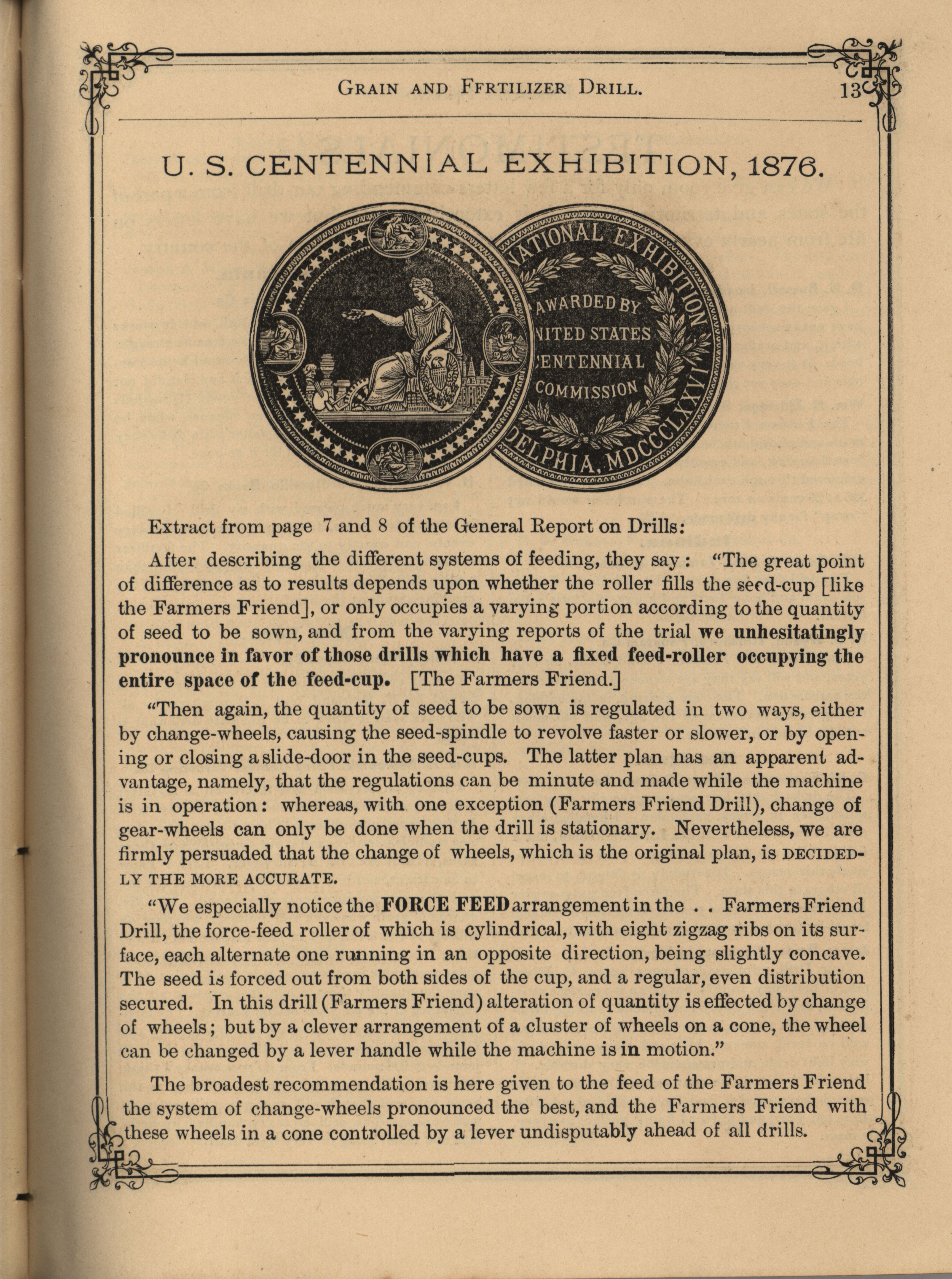 - Illustrated catalog describing the agricultural drills and related products offered by Farmers Friend Manufacturing Company in 1879.
