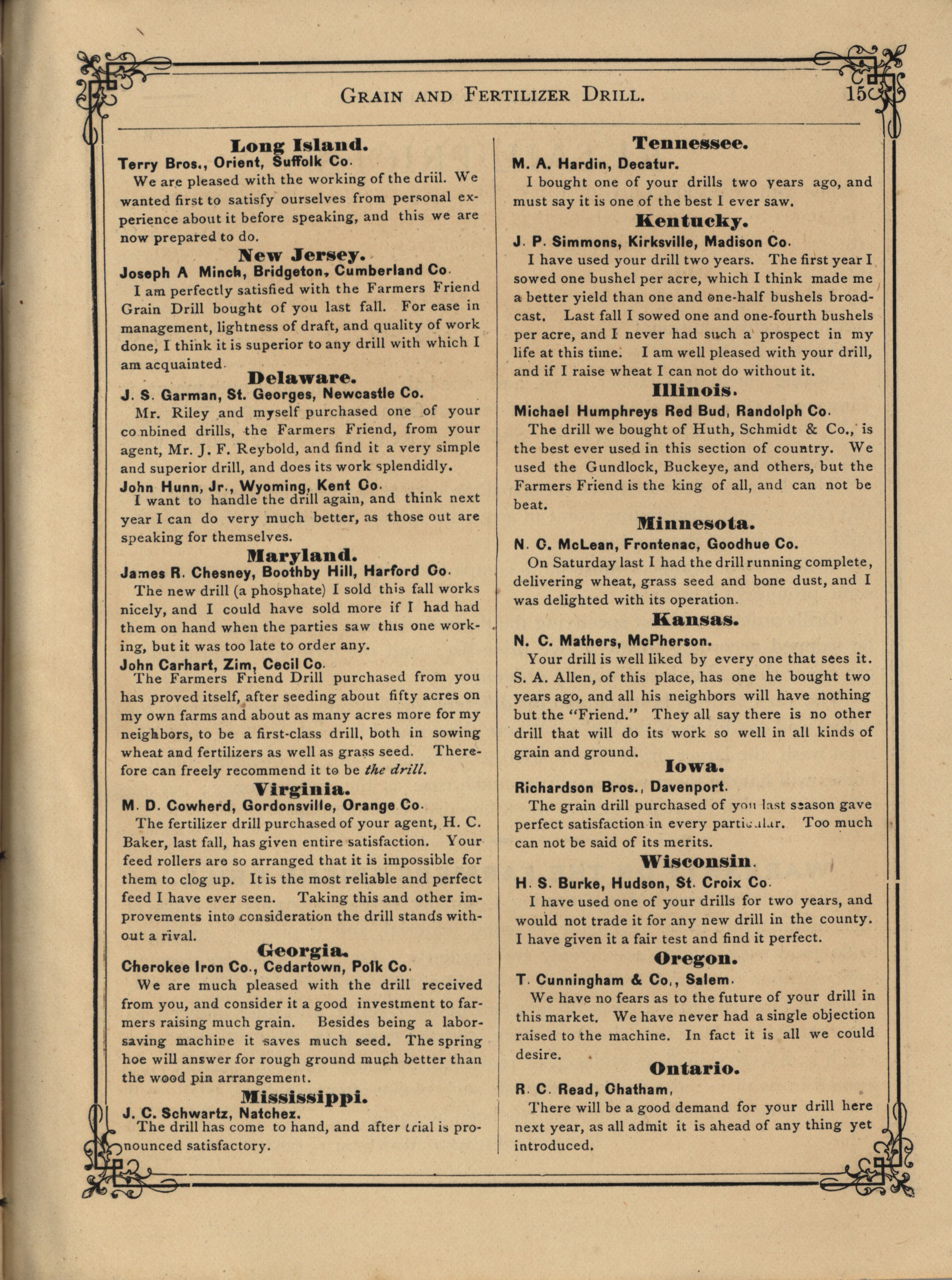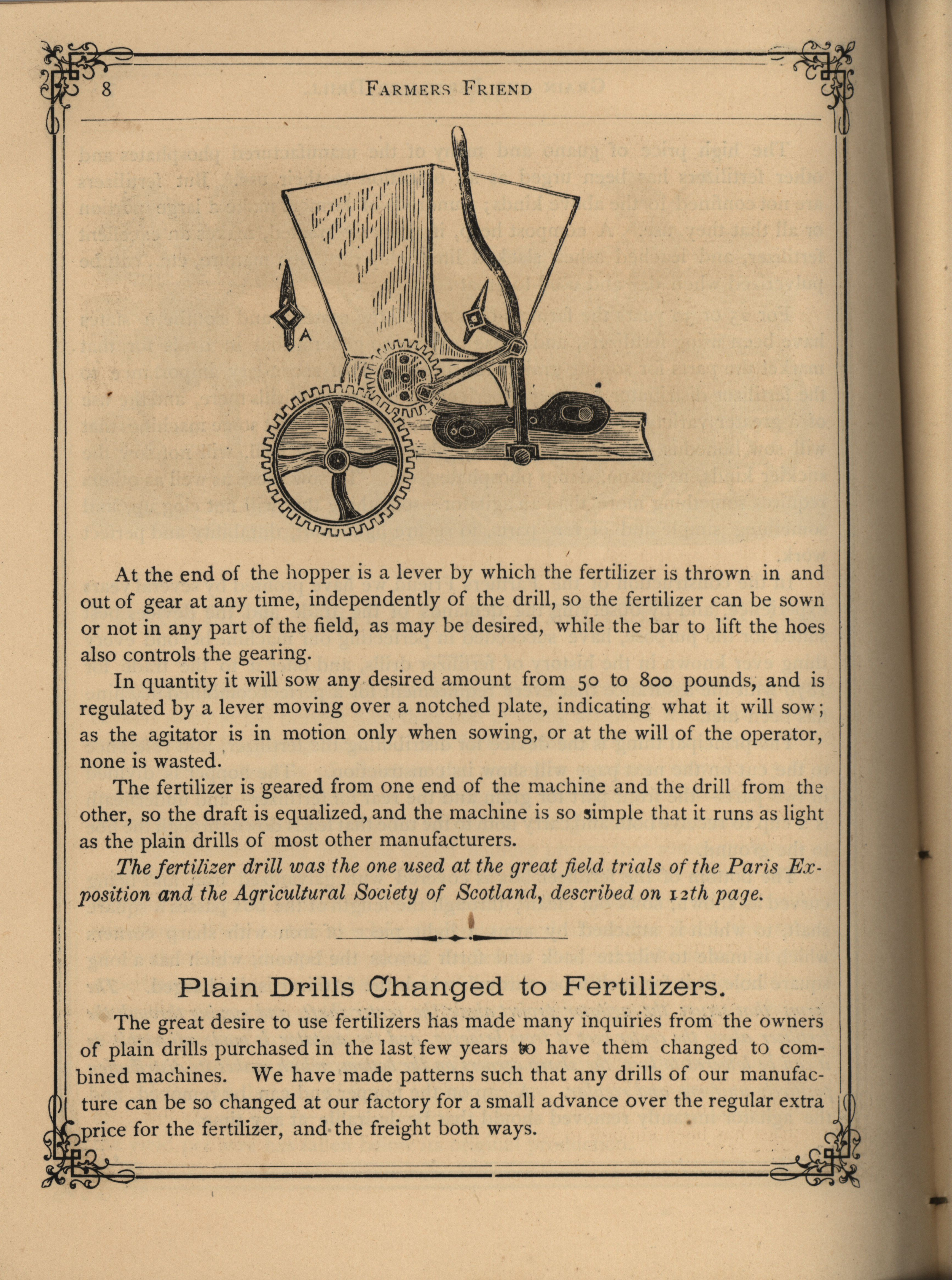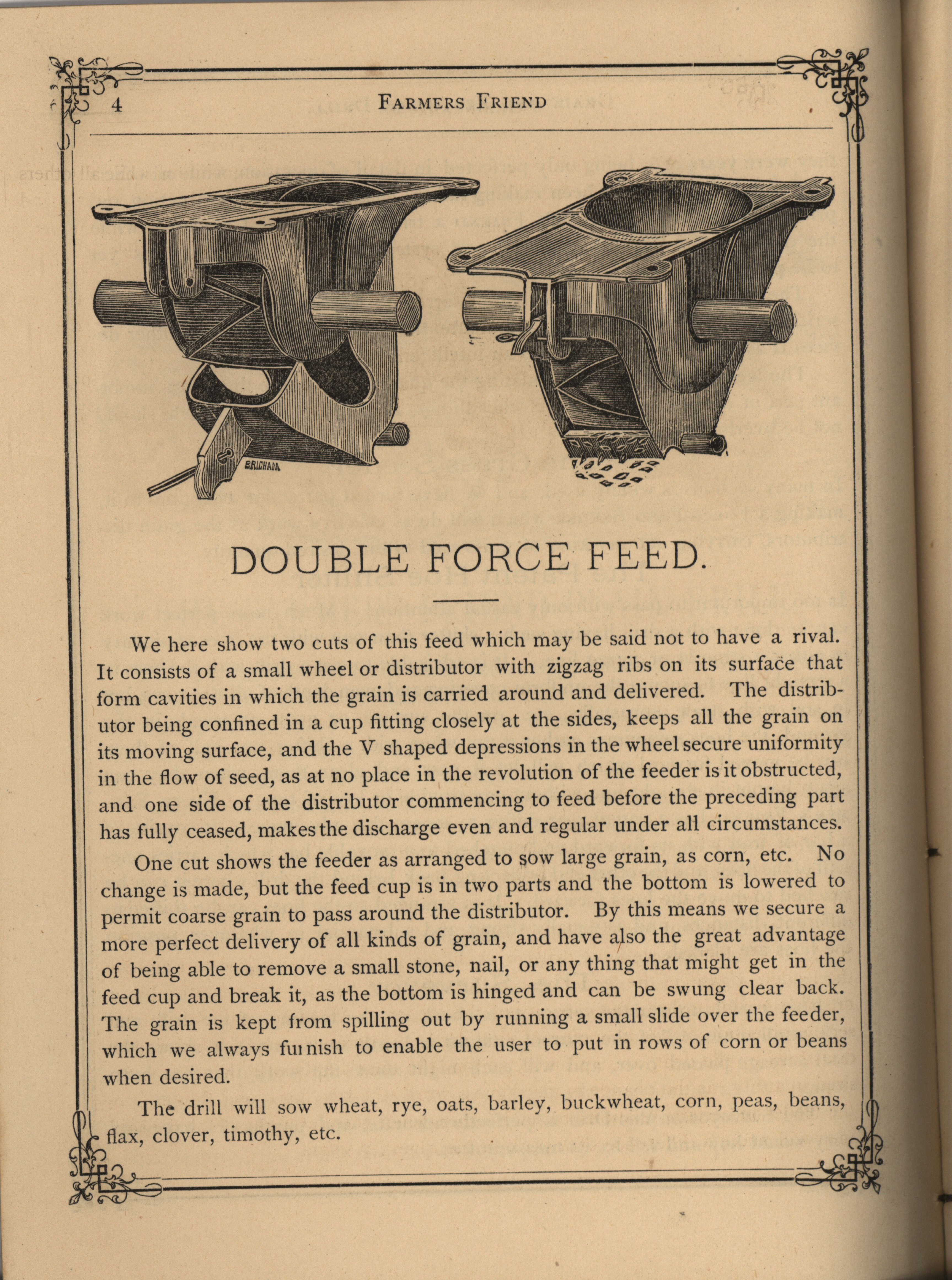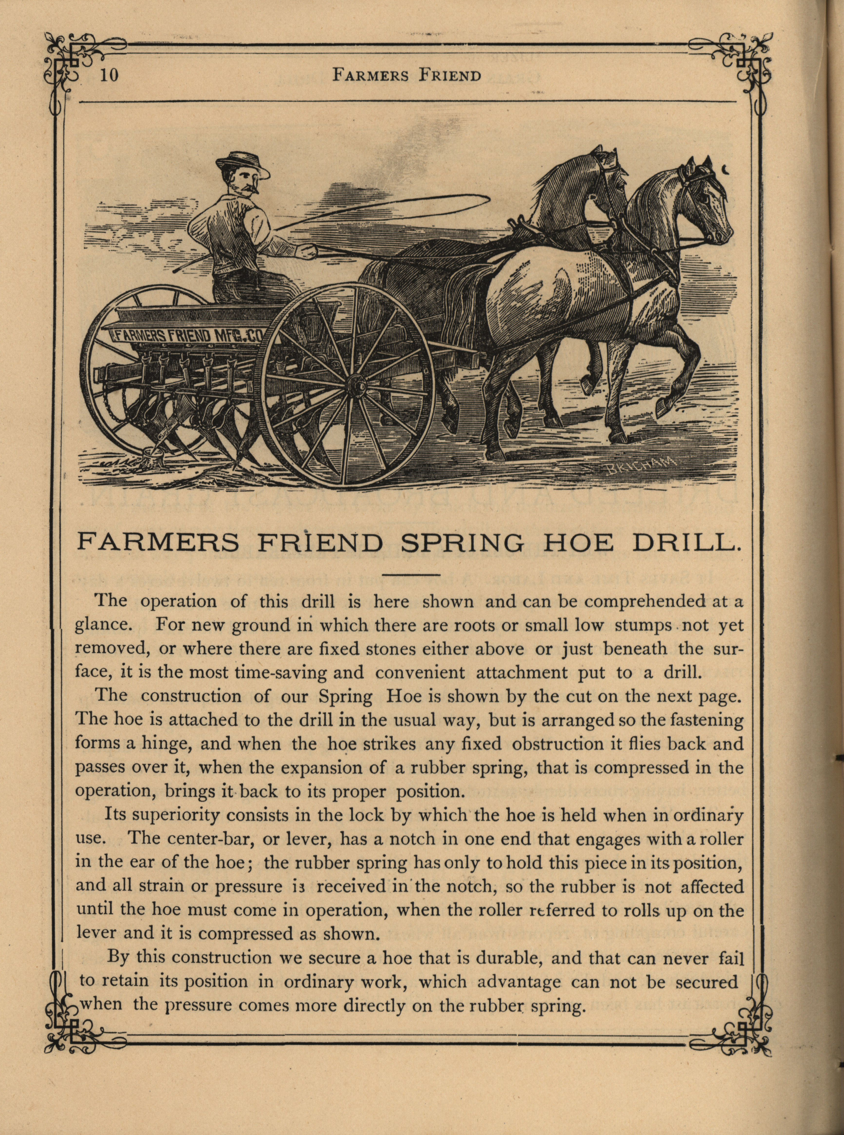 - "Farmers Friend Manufacturing Company catalog", Agricultural Machinery Literature Collection, Iowa State University Library Digital Collections