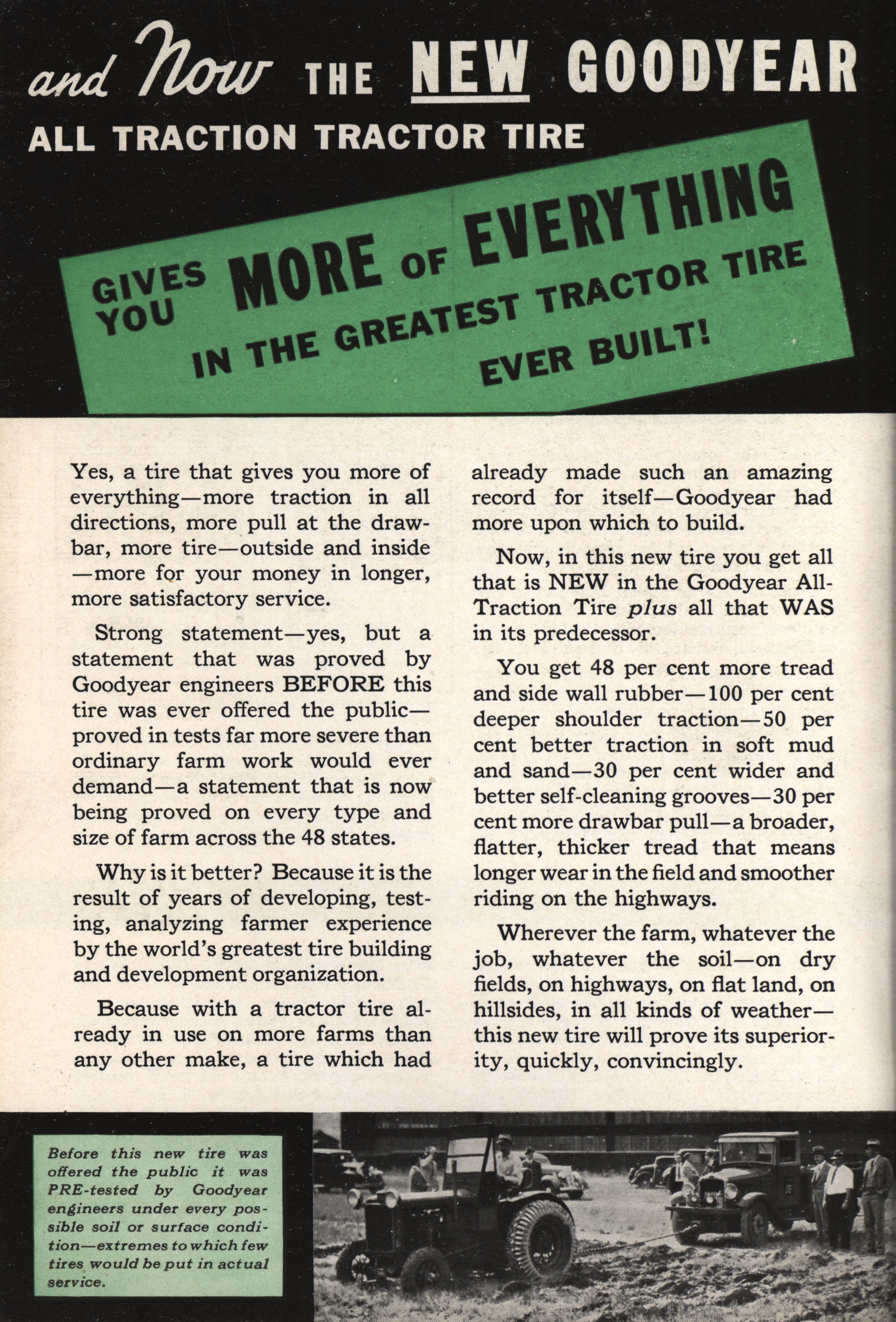 - Advertisement pamphlet for Goodyear tractor tires, including illustrations and description of features.