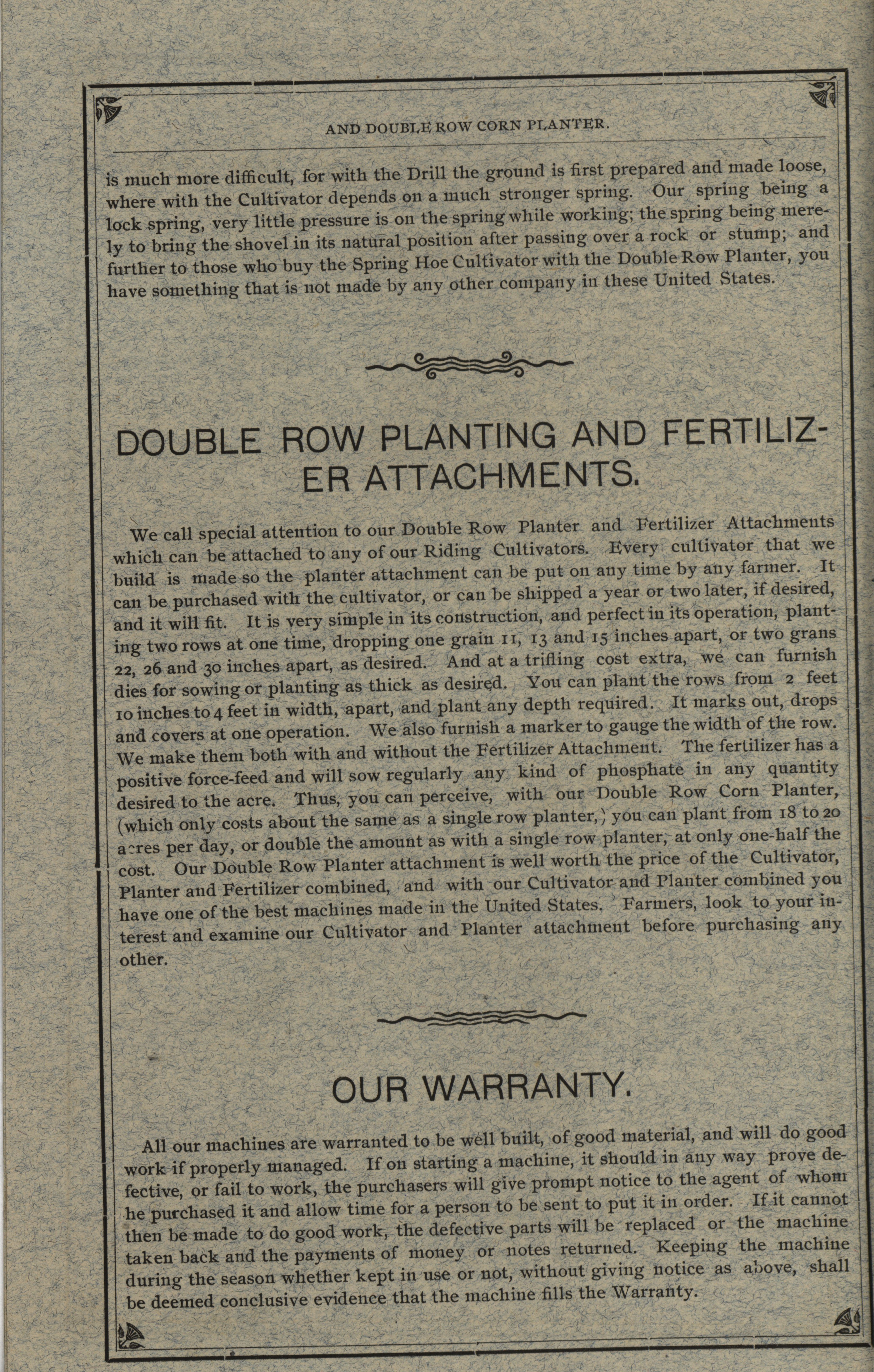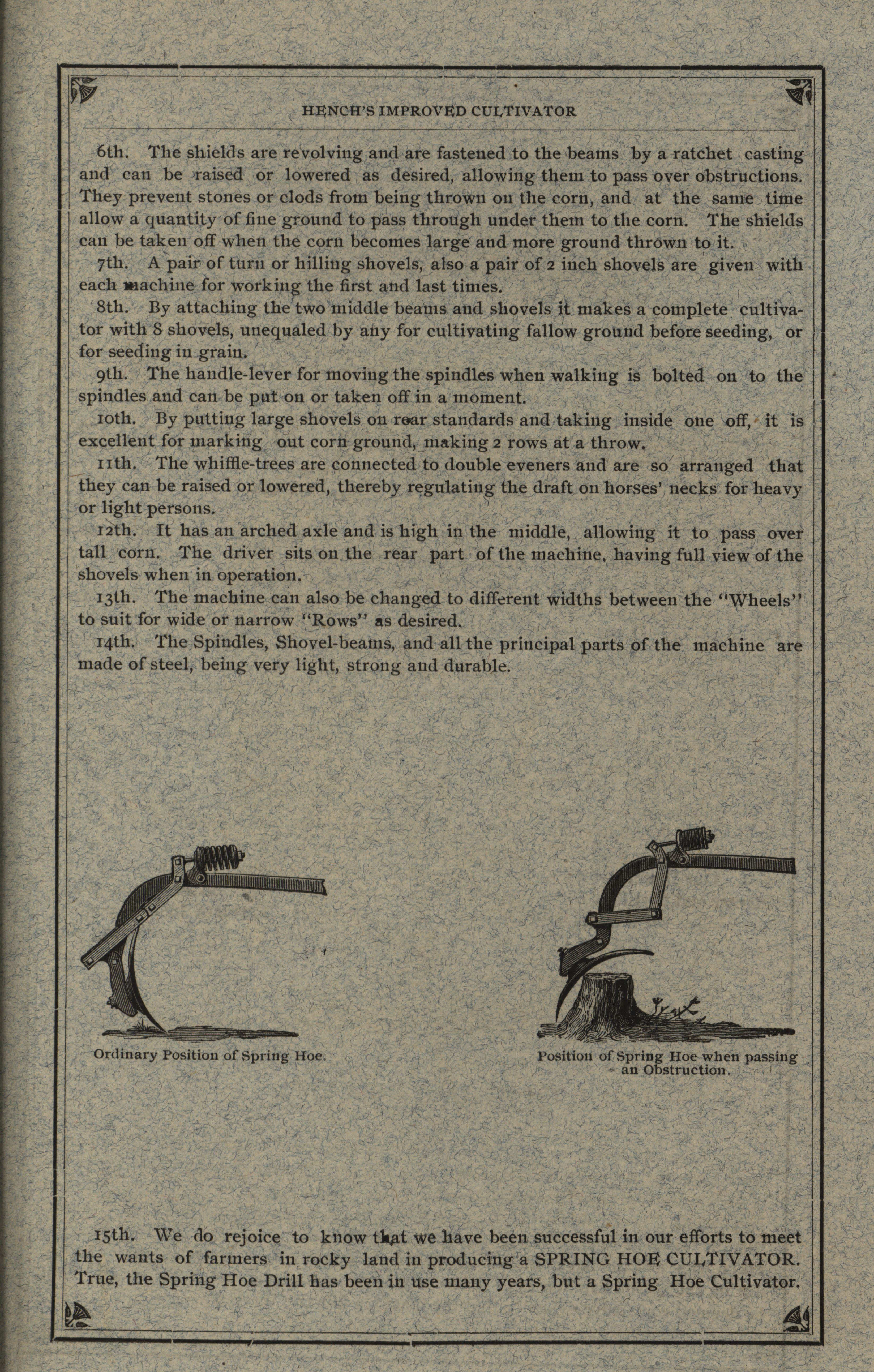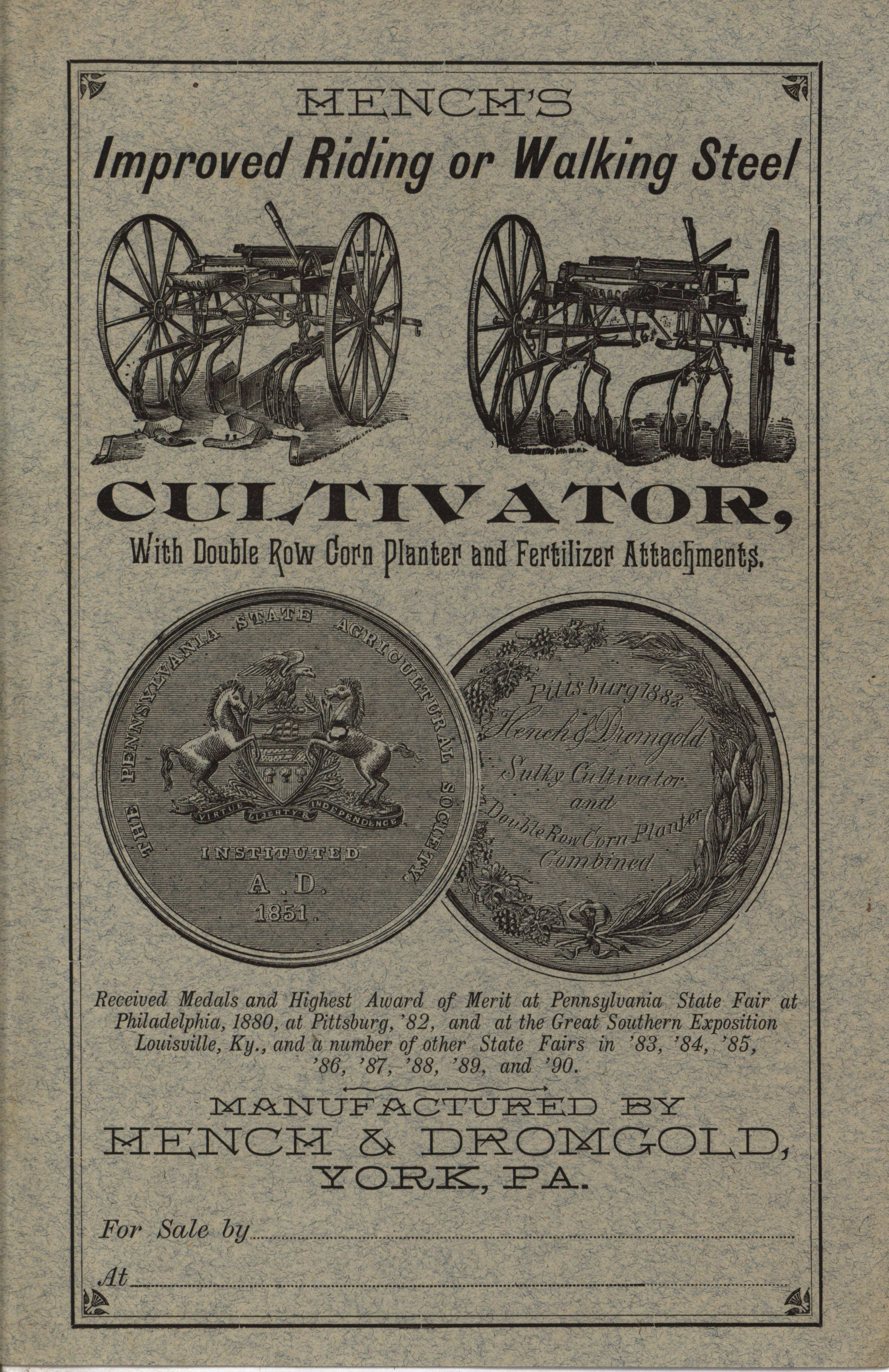 - Illustrated catalog describing the cultivator and related attachments offered by Hench and Dromgold Company in 1891.