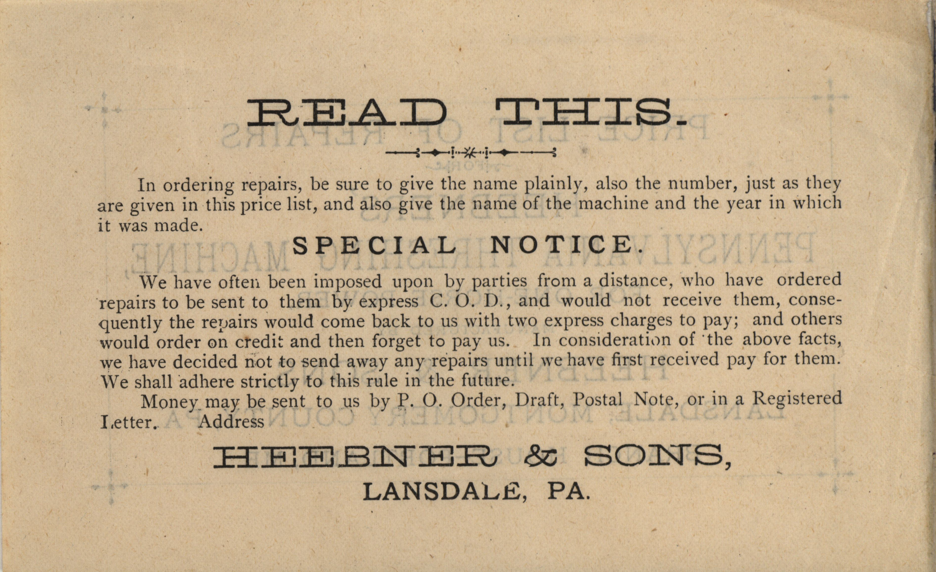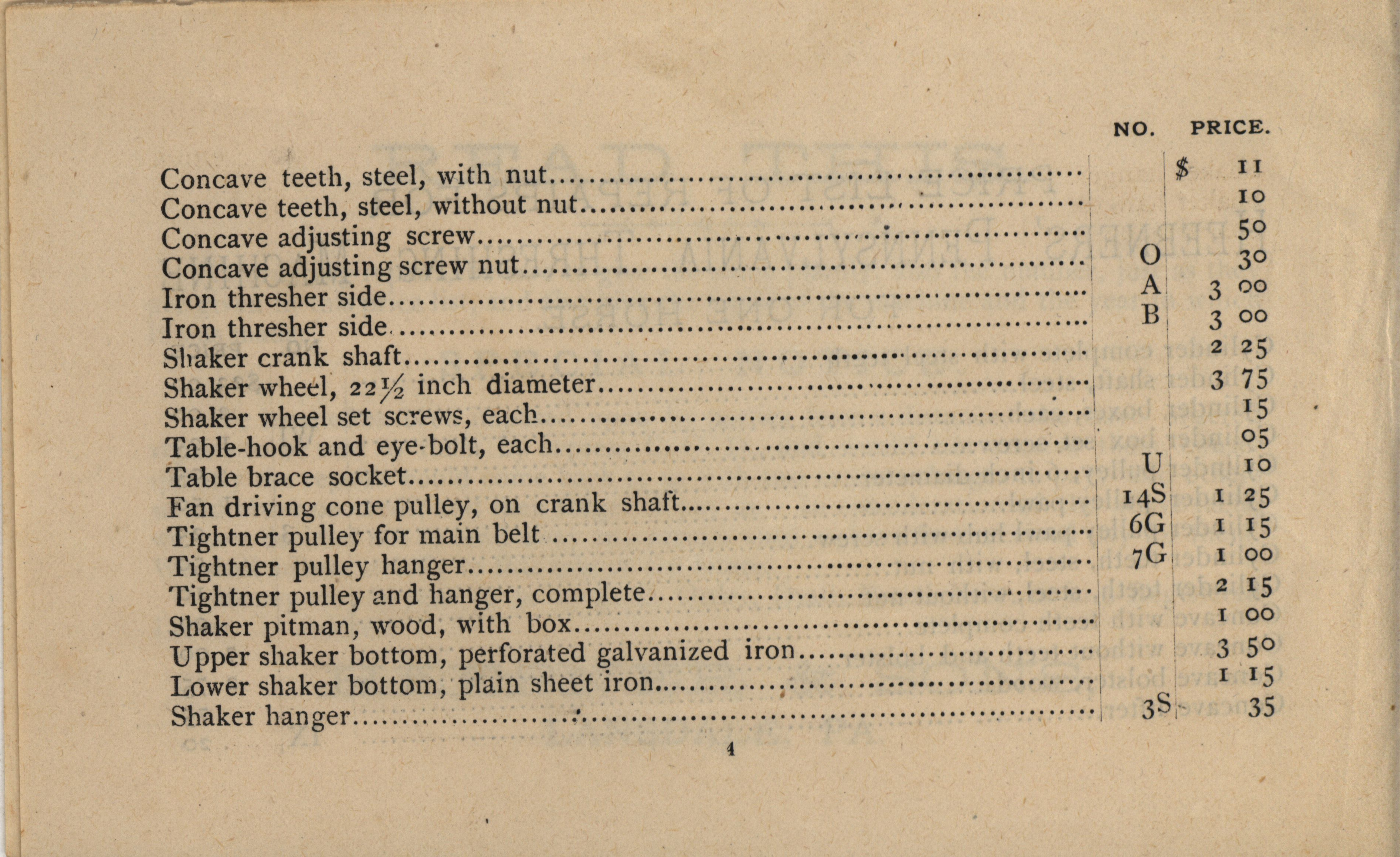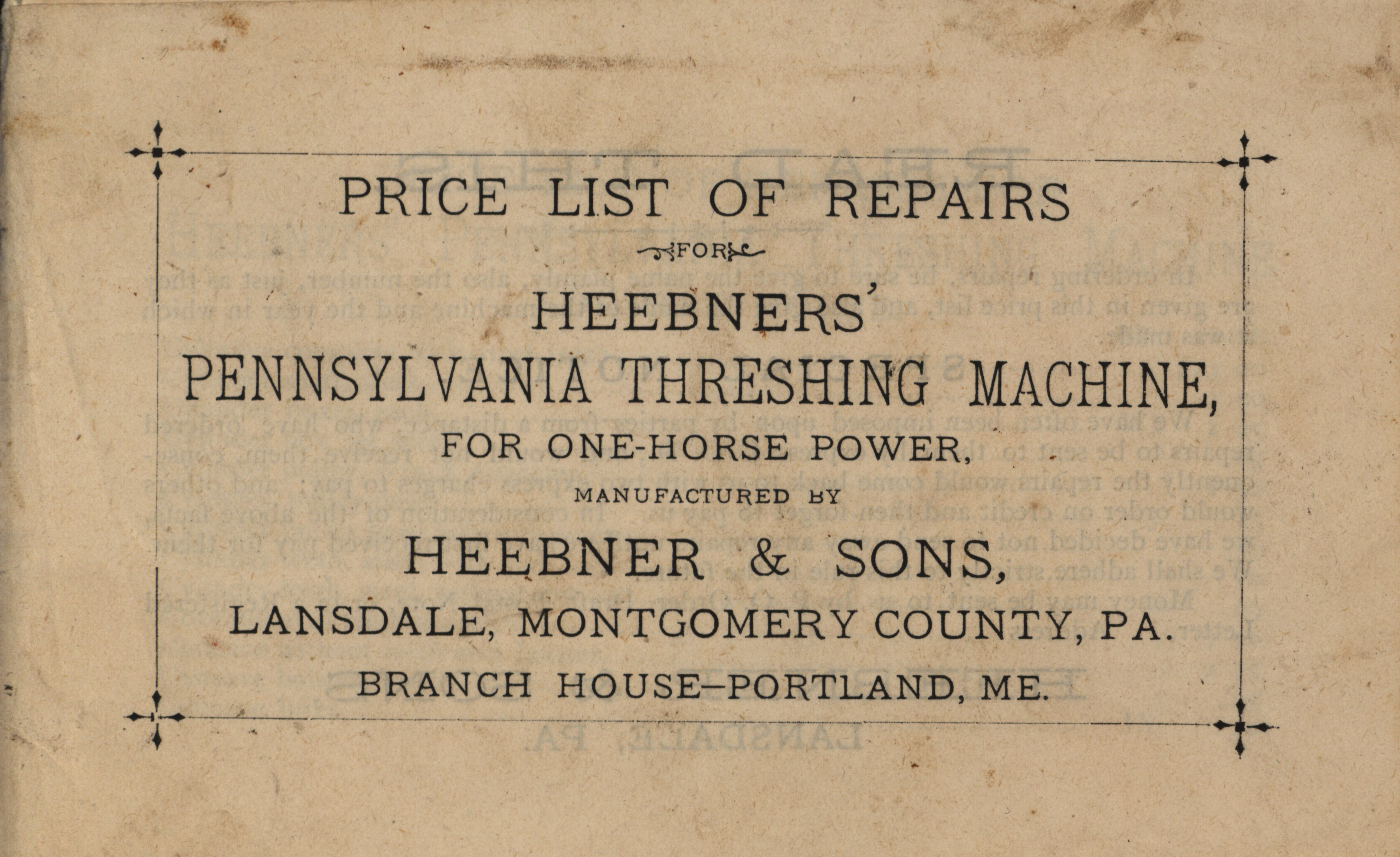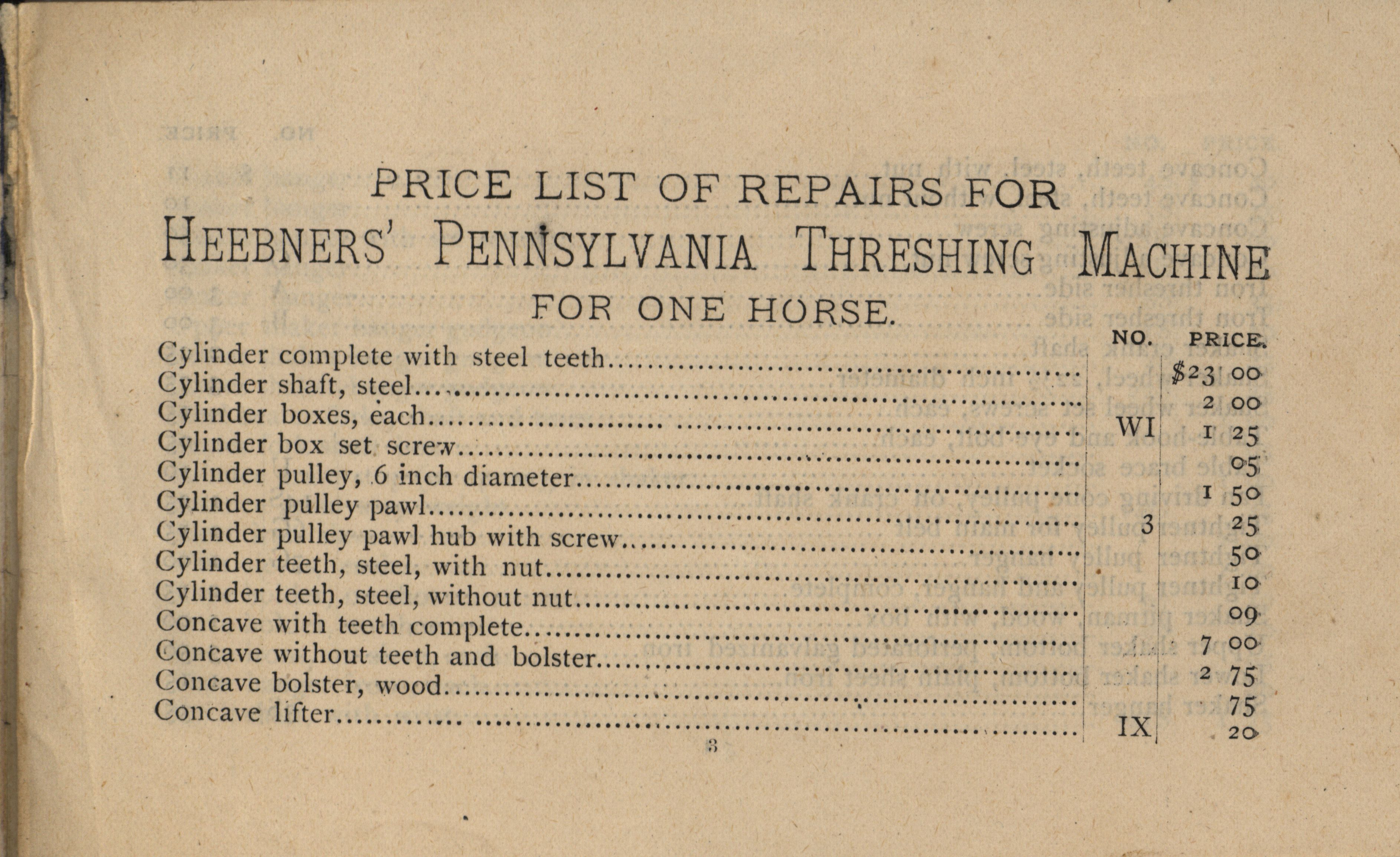 - Price list for repair parts for the Pennsylvania threshing machine offered by the Heebner and Sons.