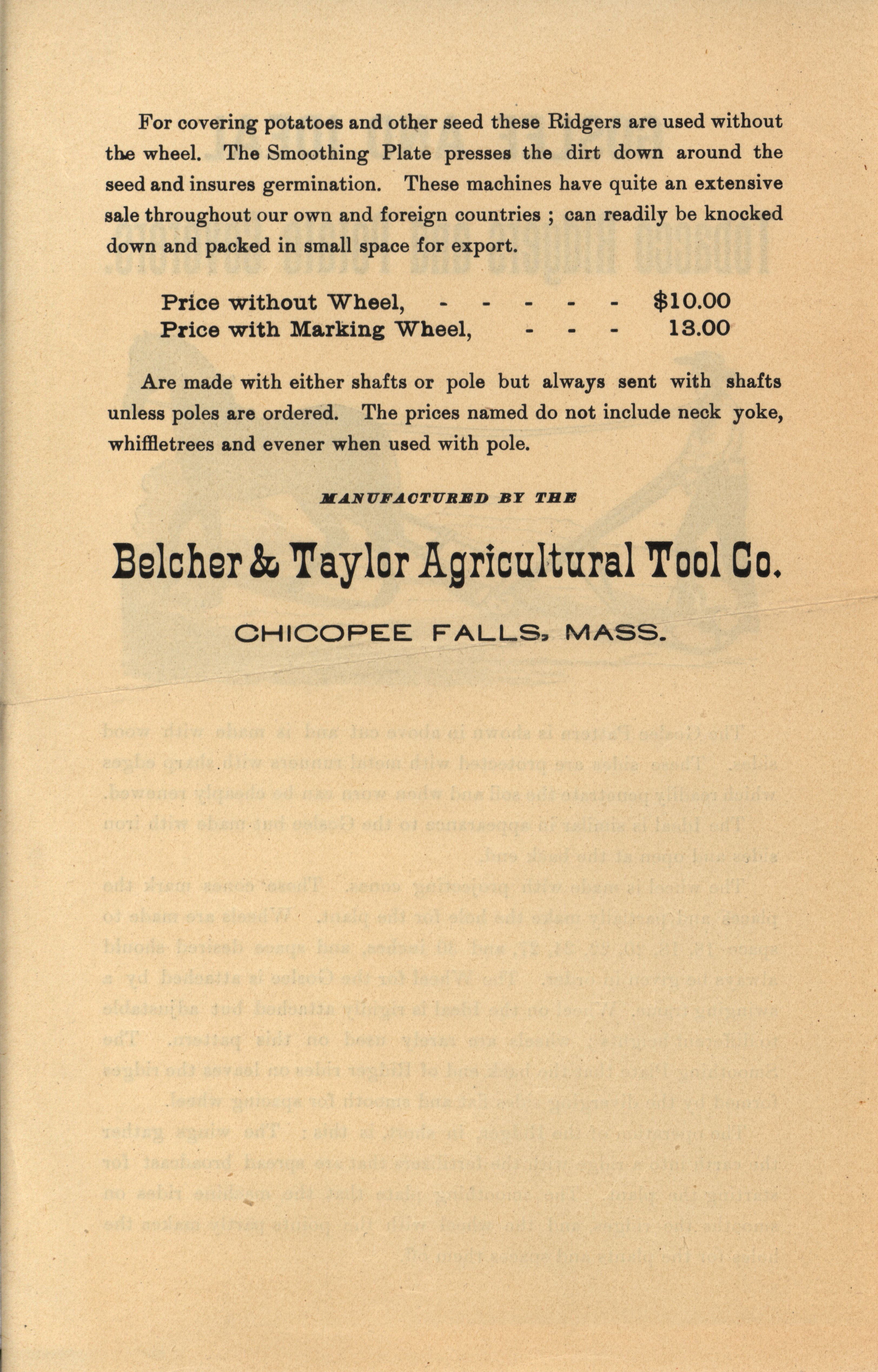 - Advertisement for tobacco ridgers and potato coverers offered by Belcher and Taylor Agricultural Tool Company.