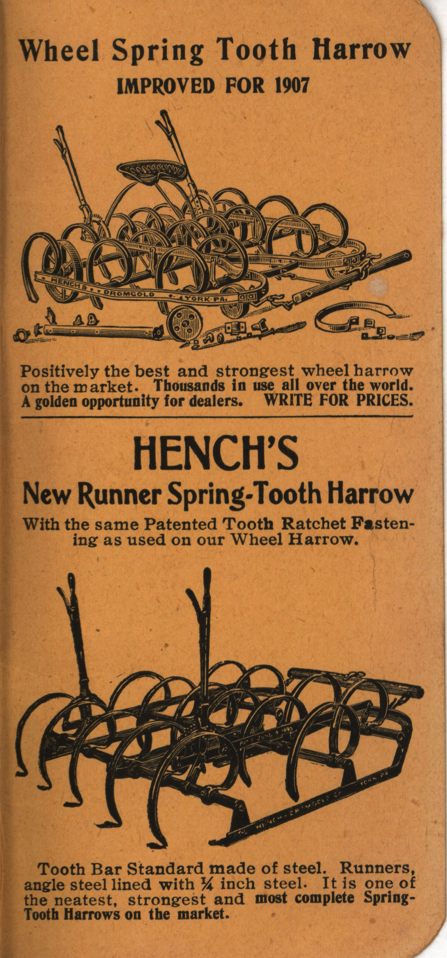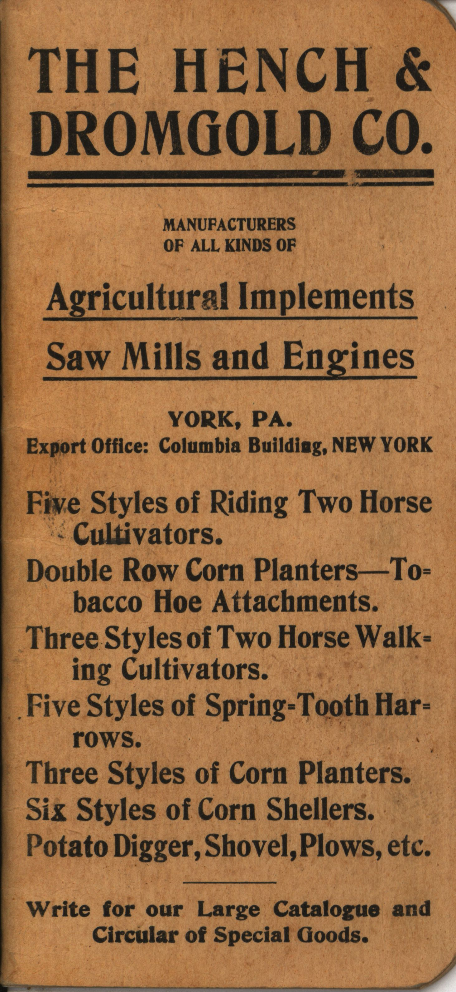 - "Hench and Dromgold Company pocket book", Agricultural Machinery Literature Collection, Iowa State University Library Digital Collections