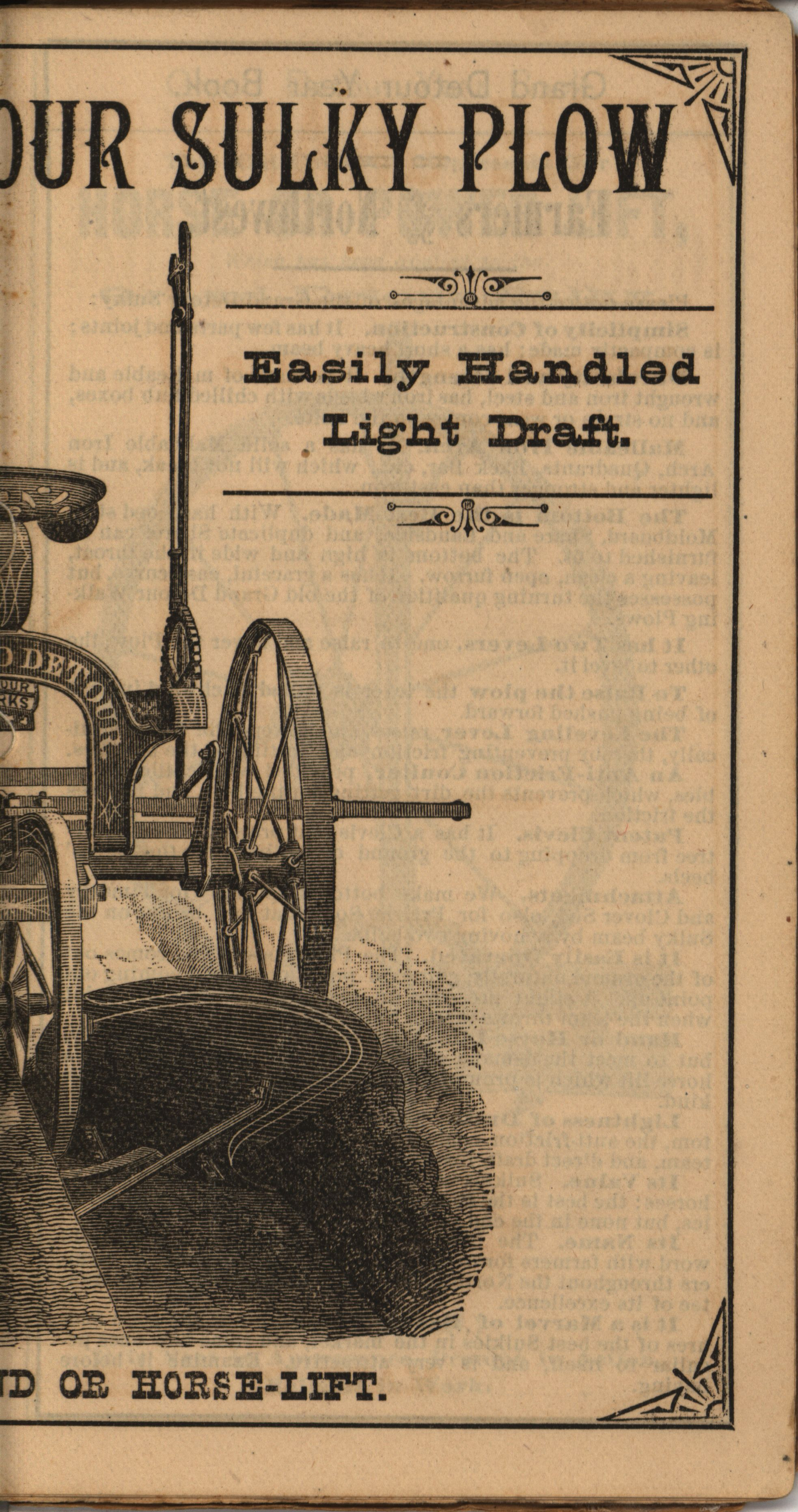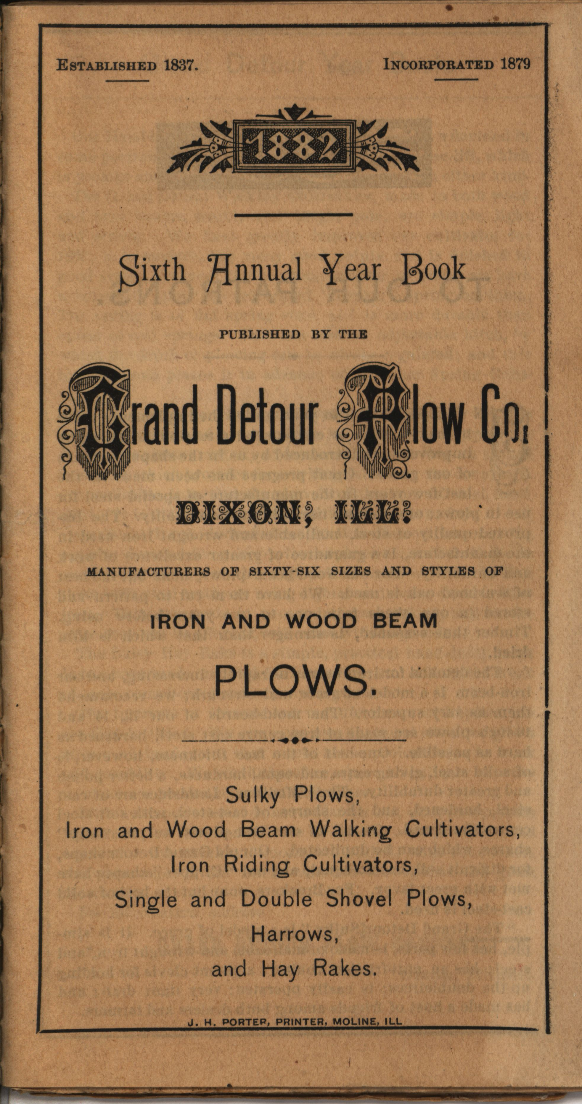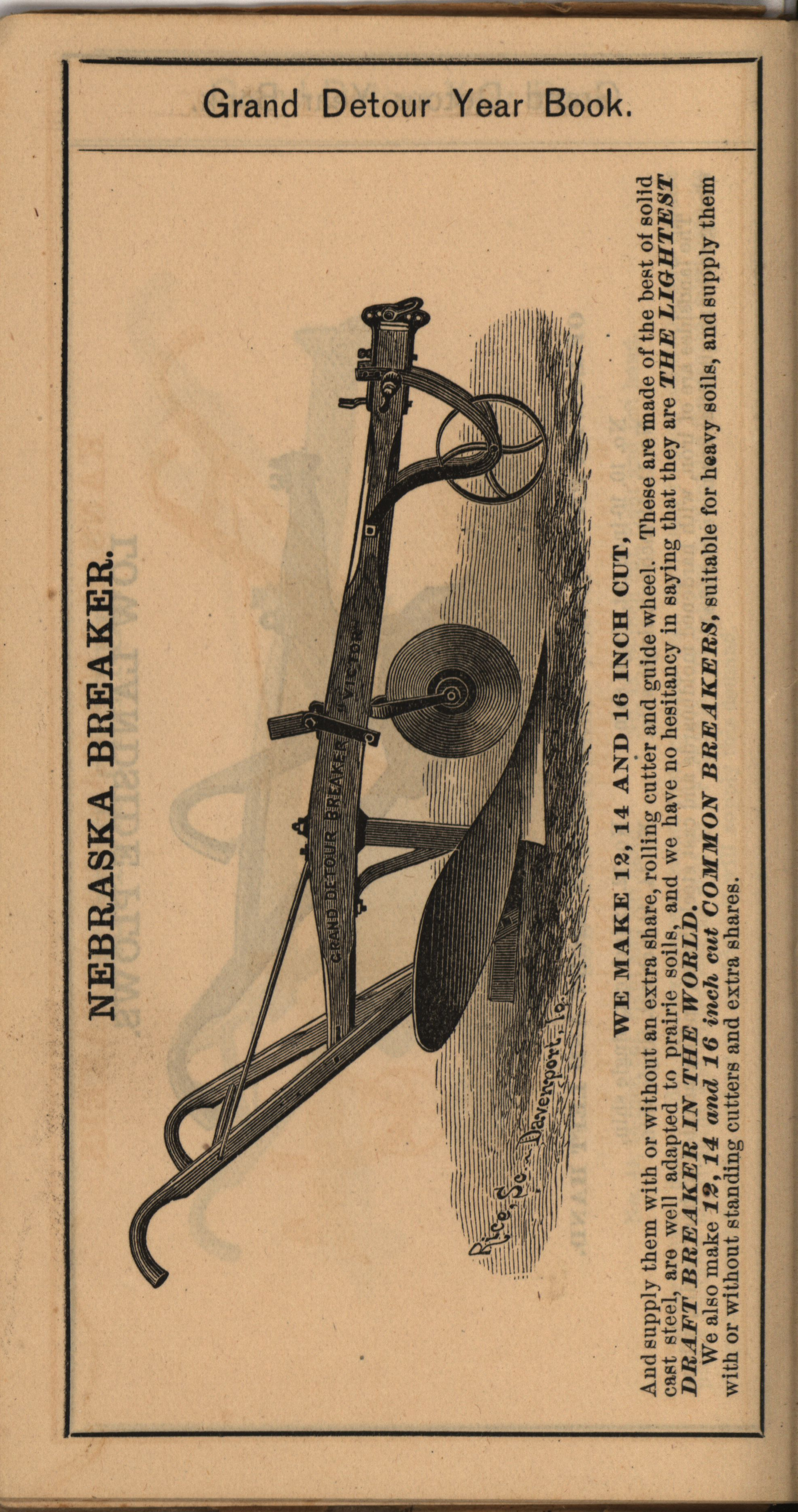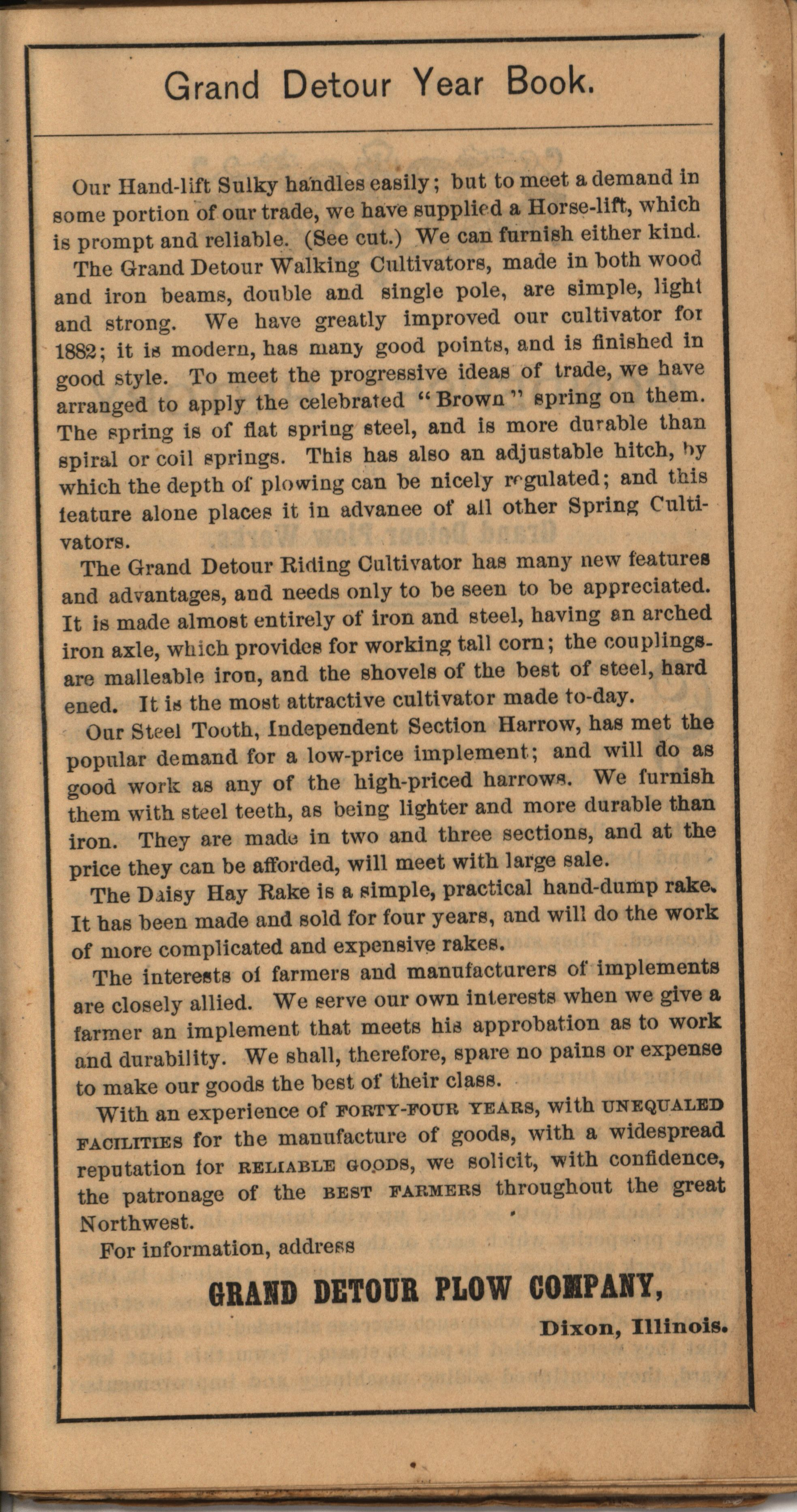 - Illustrated catalog describing the agricultural implements offered by Grand Detour Plow Company in 1882.