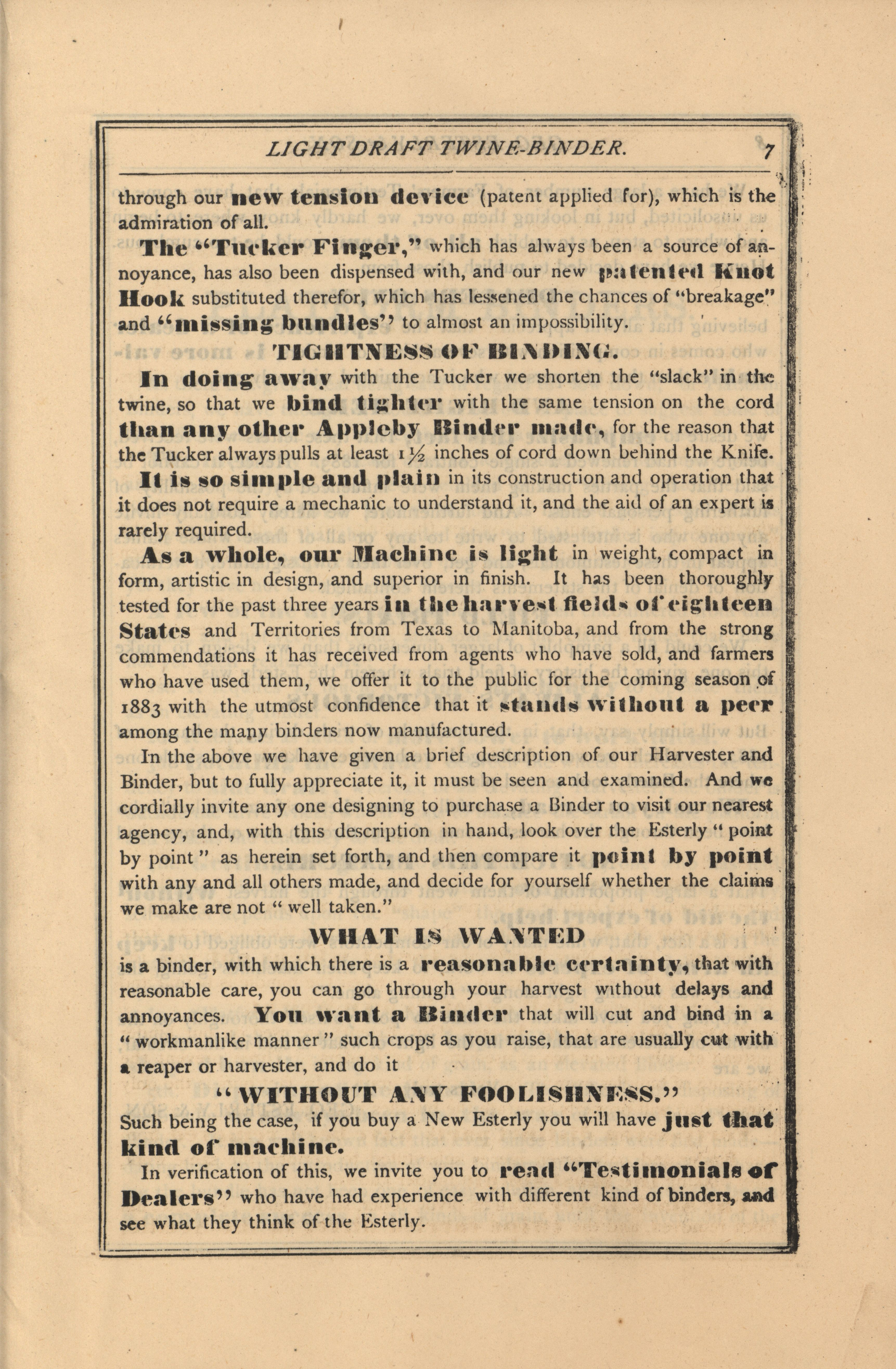 - Illustrated catalog describing the Esterly Light Draft Twine Binder and related agricultural products offered by Geo. Esterly and Son in 1883.