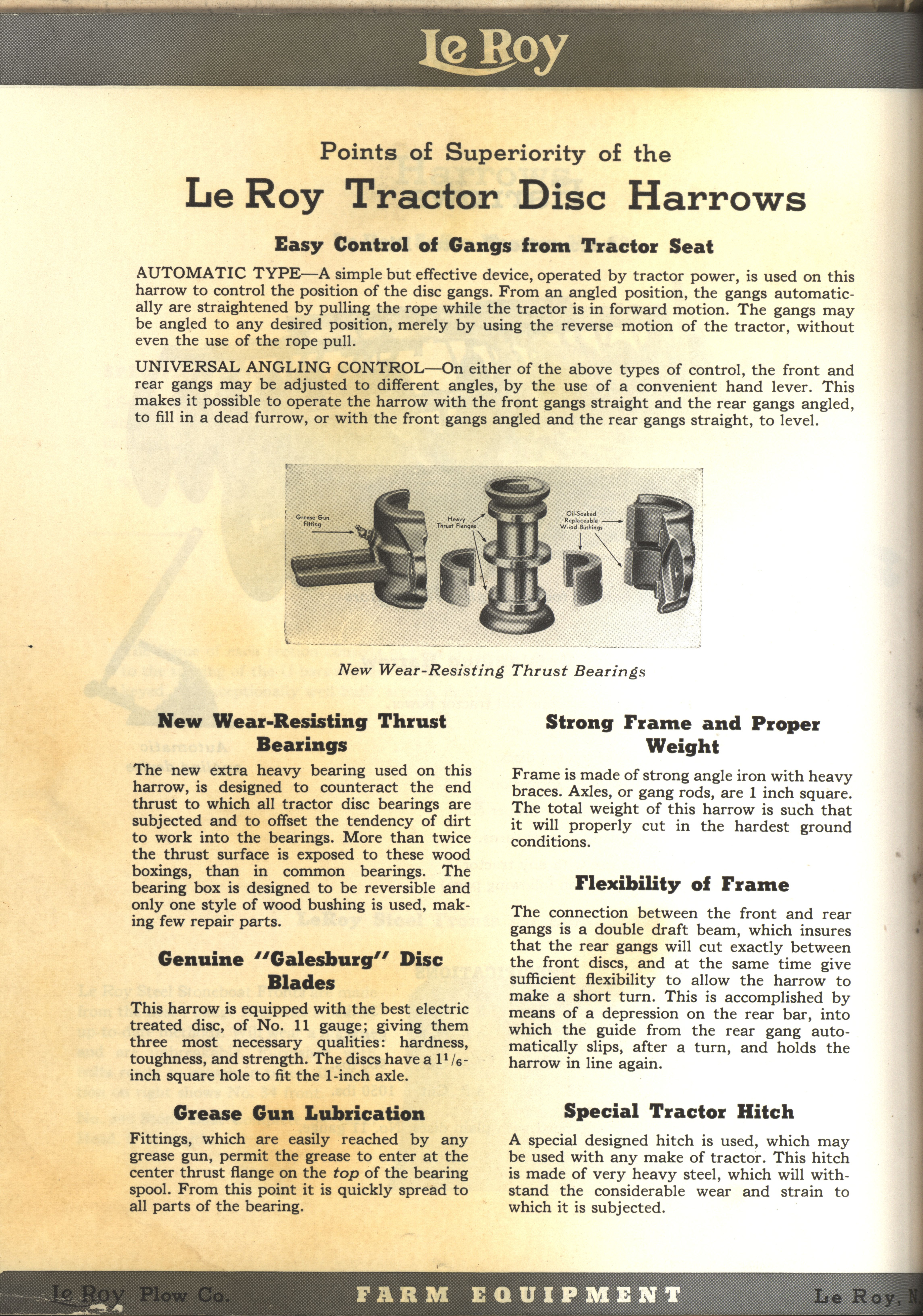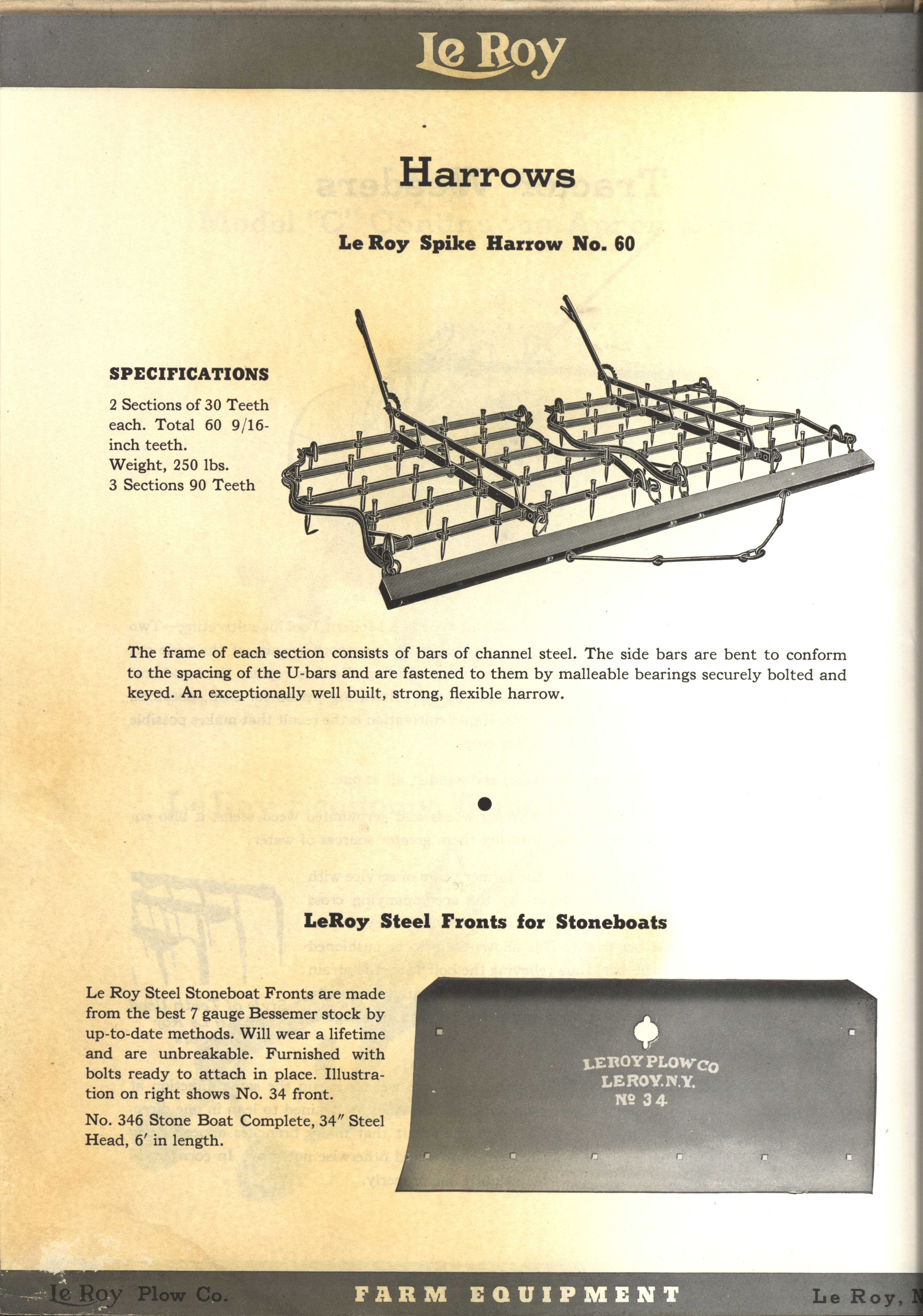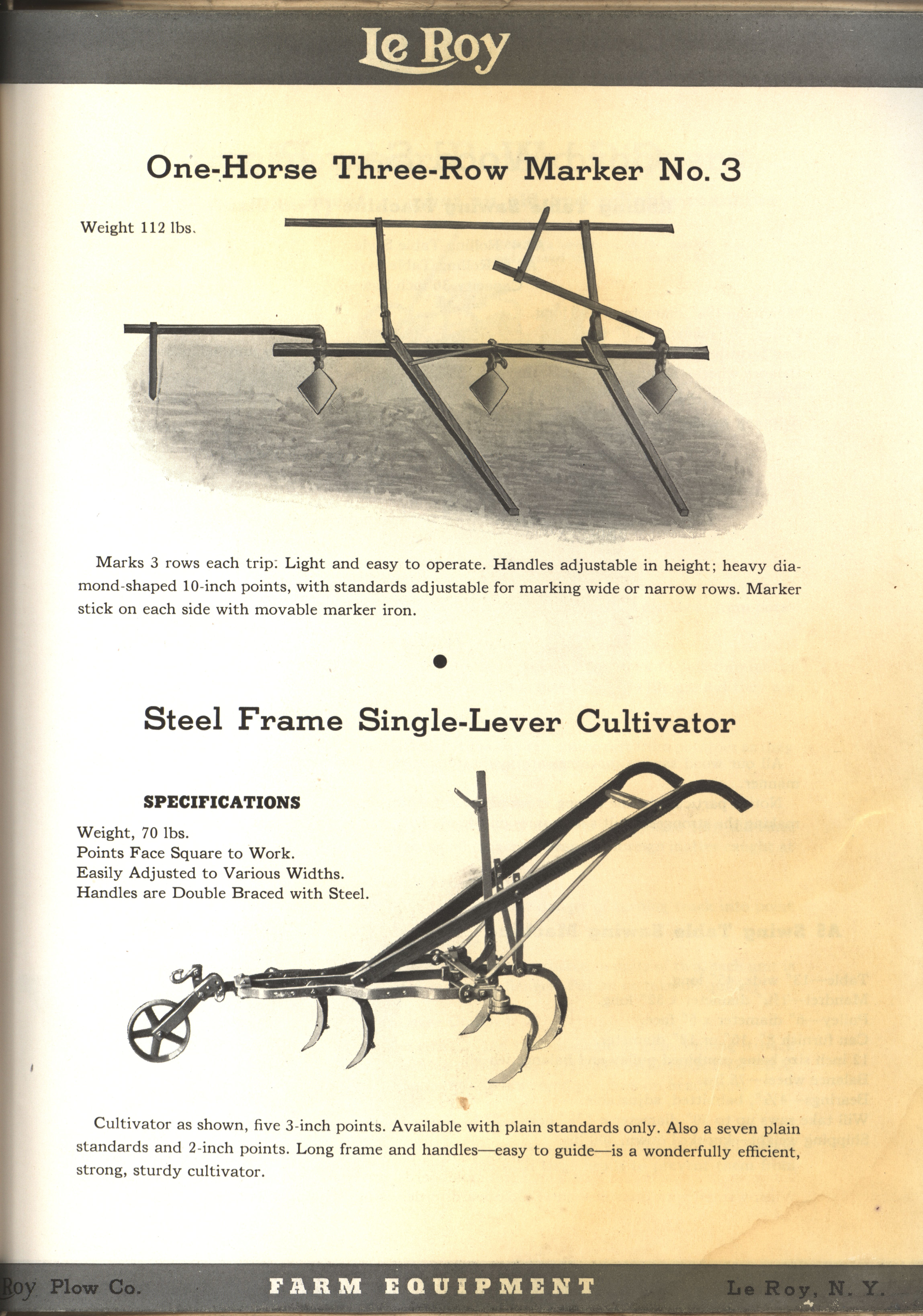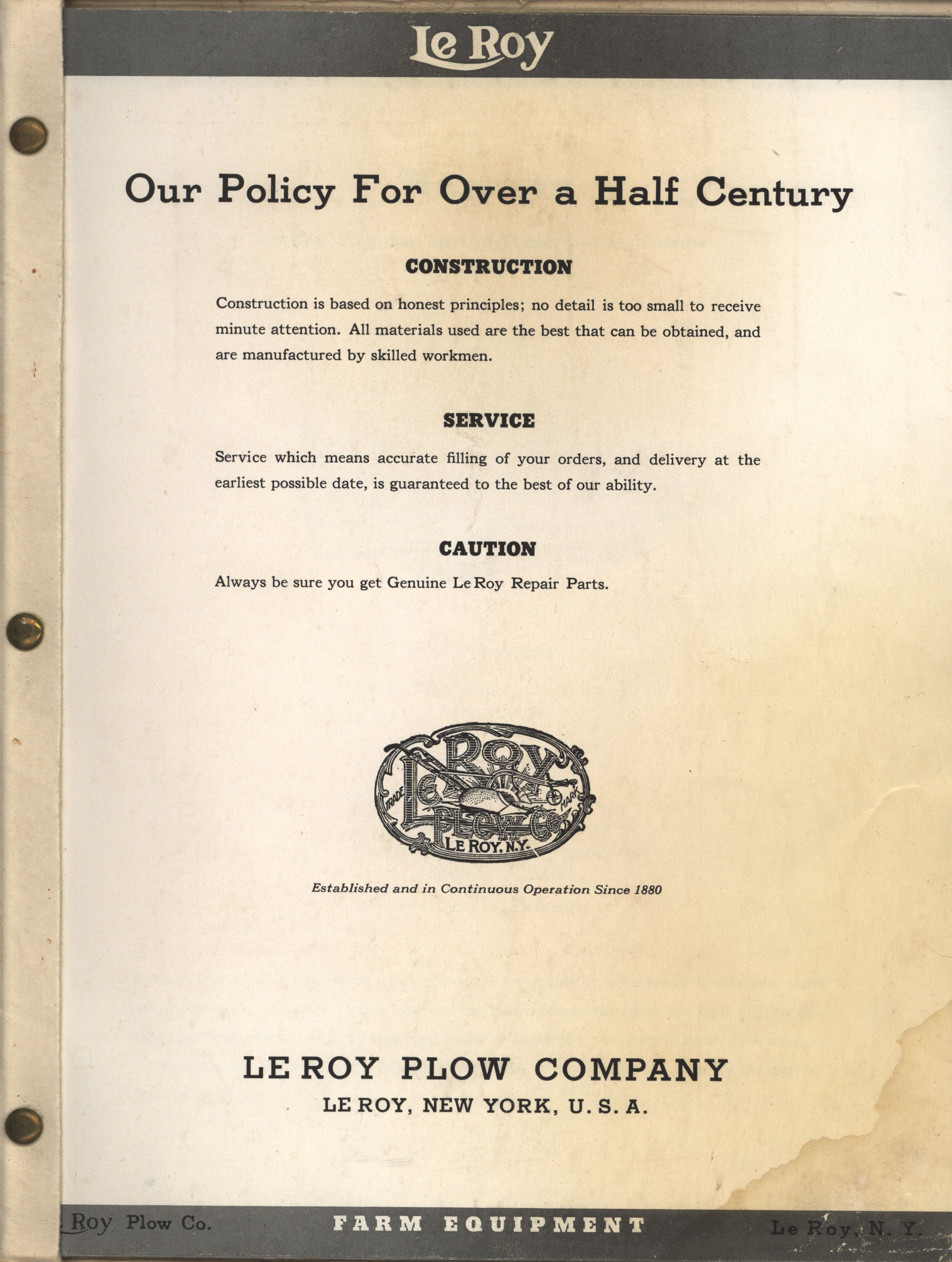 - Catalog describing the farm equipment offered by Le Roy Plow Company.