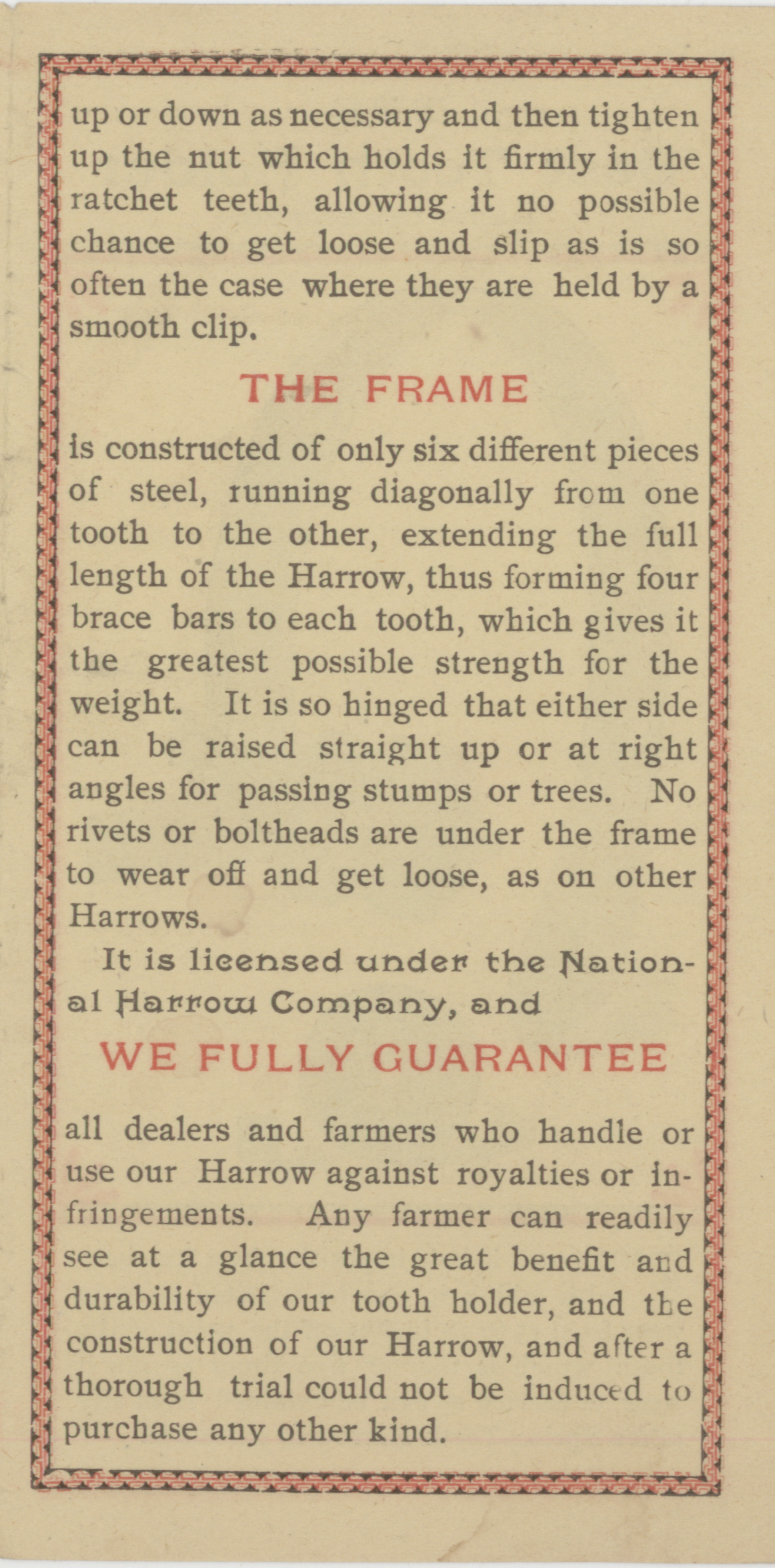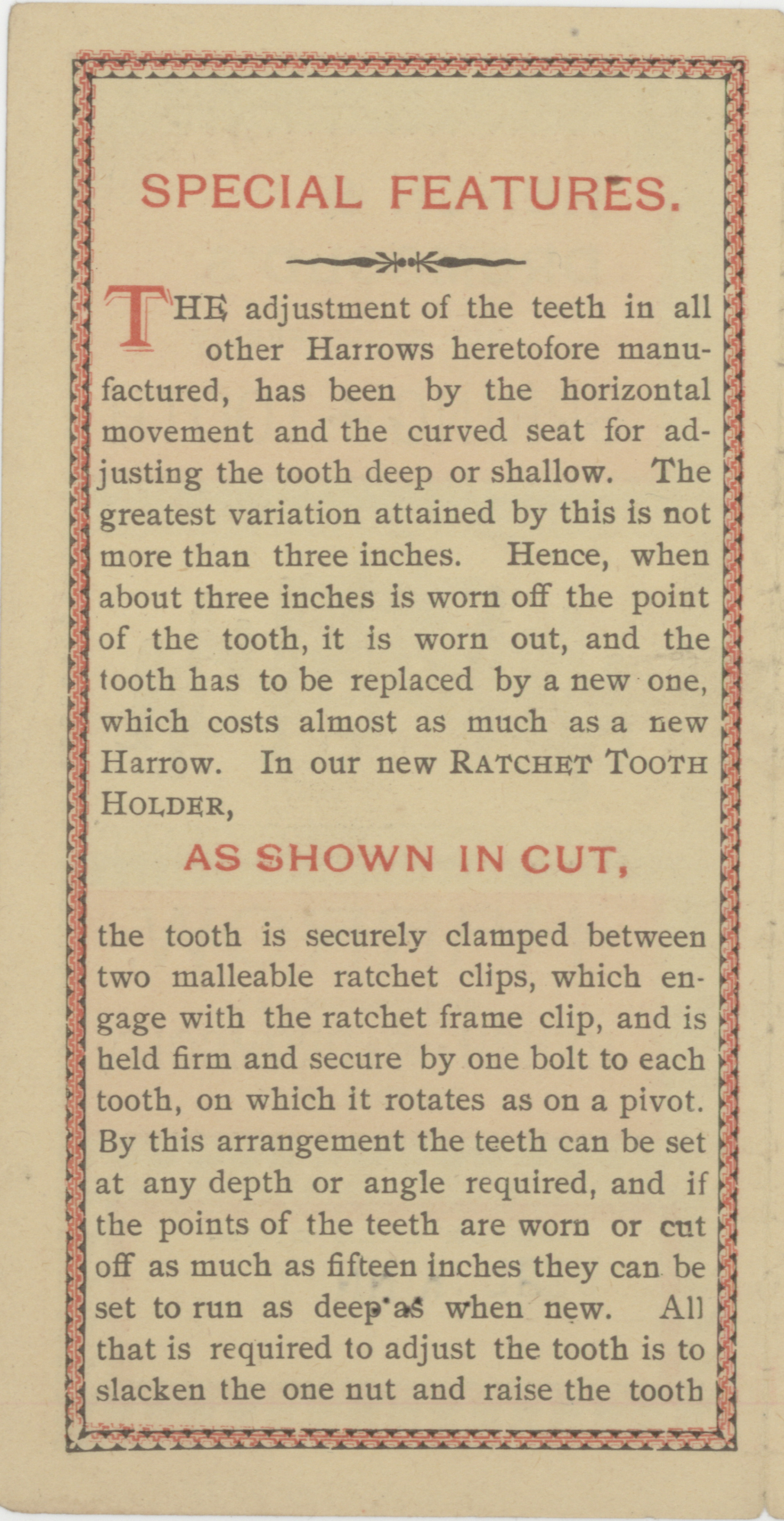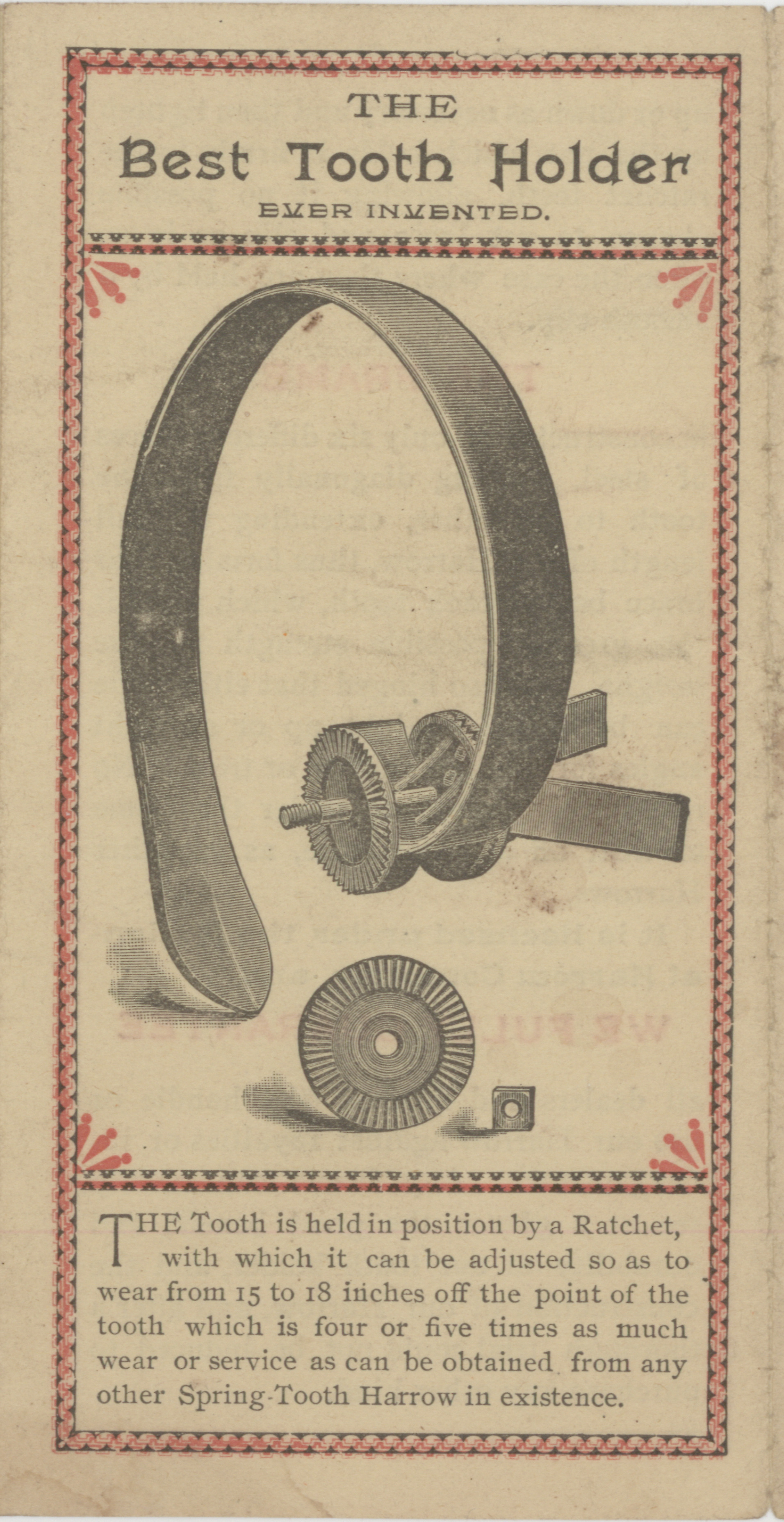 - Illustrated advertisement pamphlet describing the spring tooth harrow offered by Hench and Dromgold.