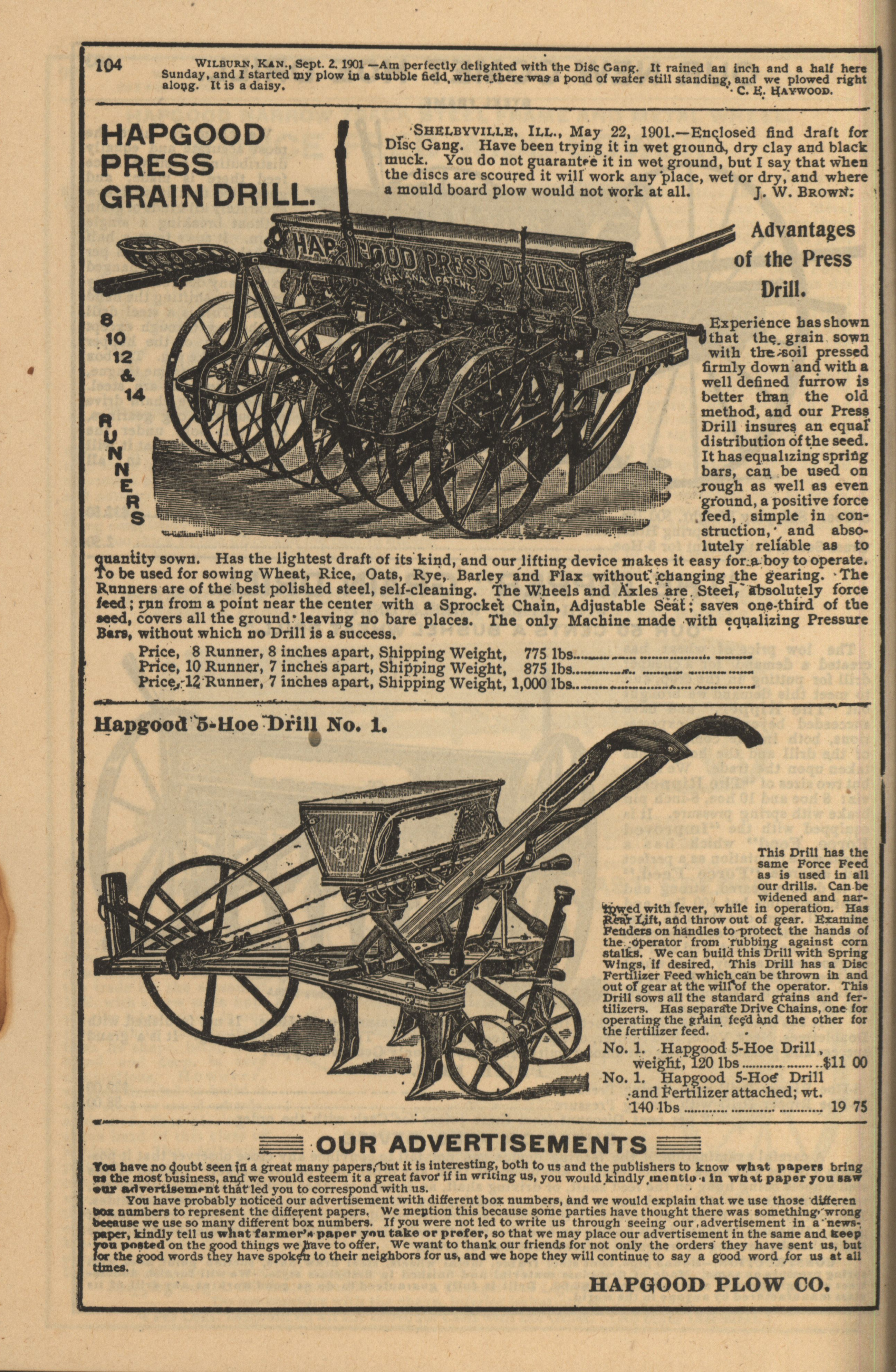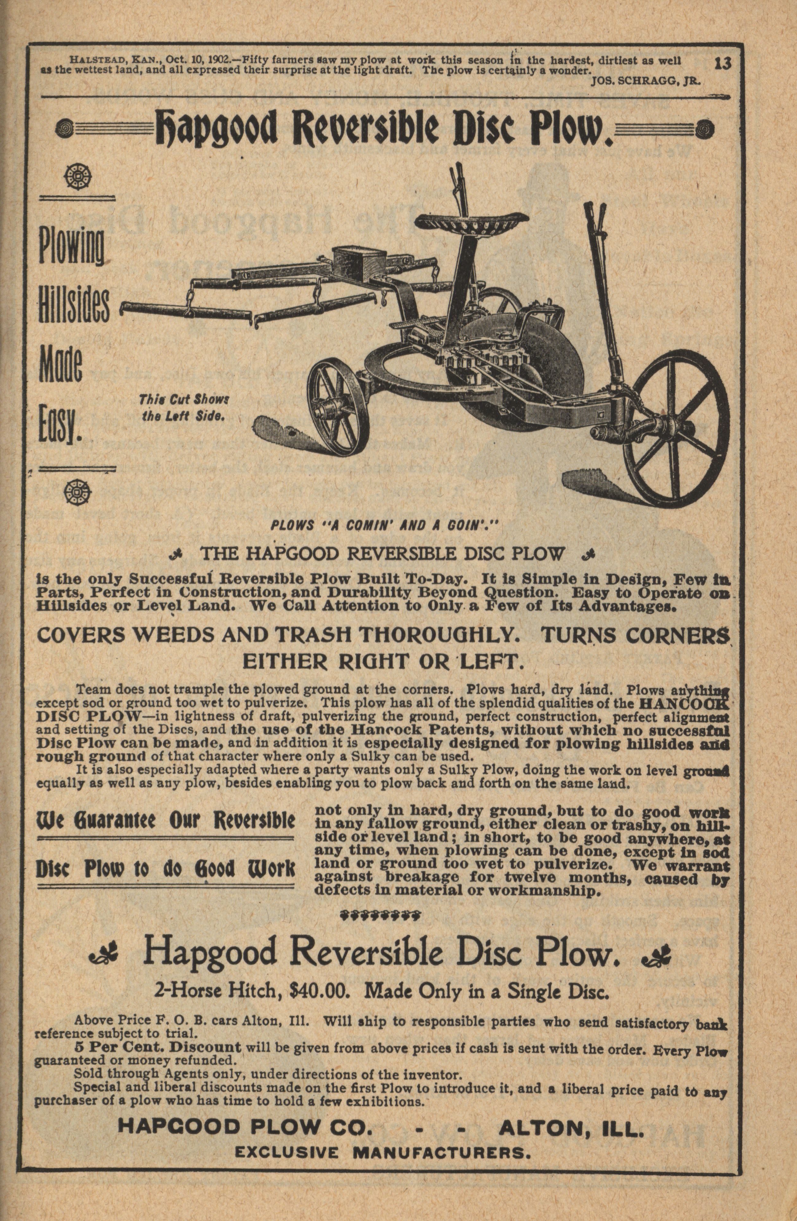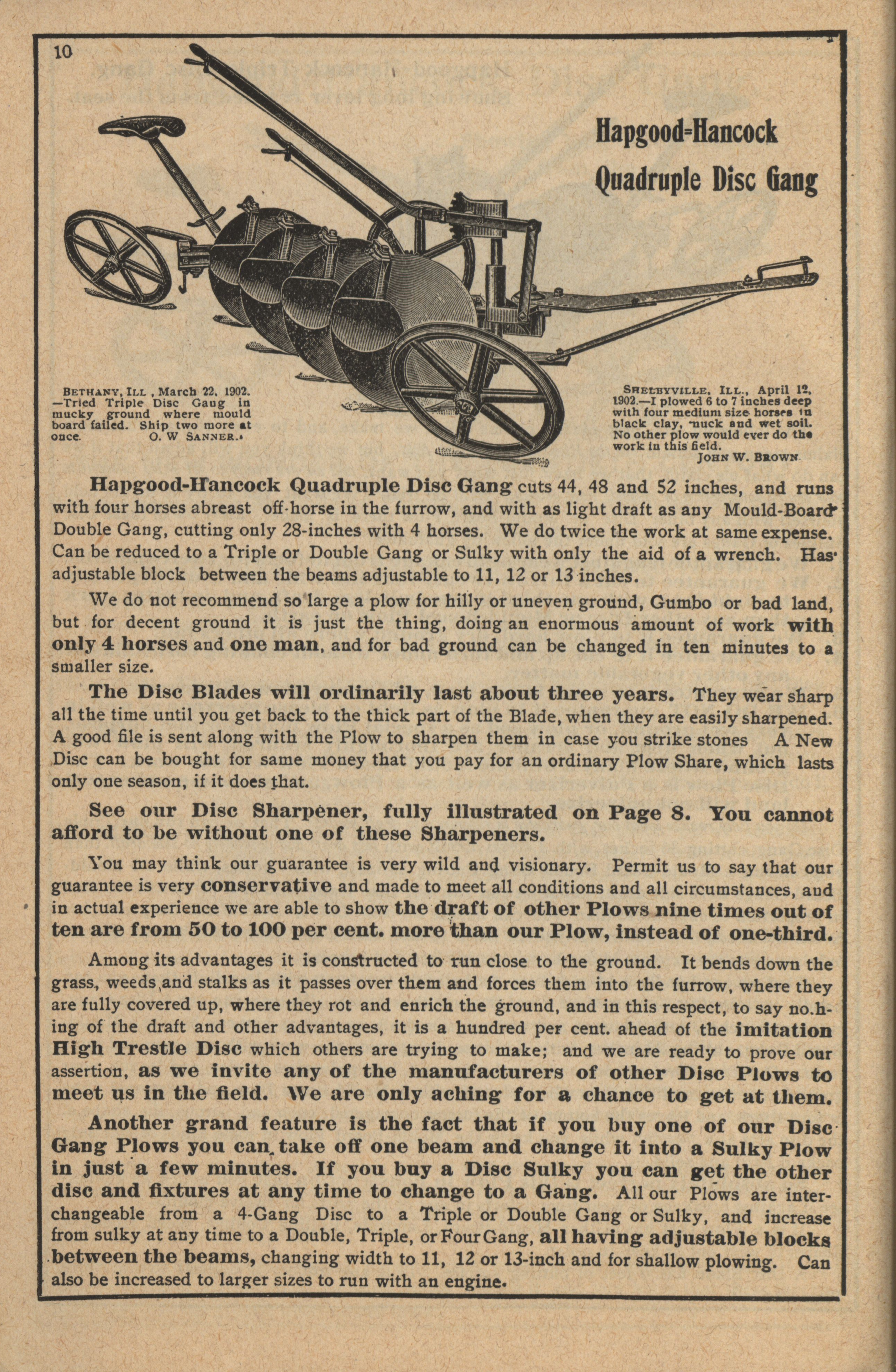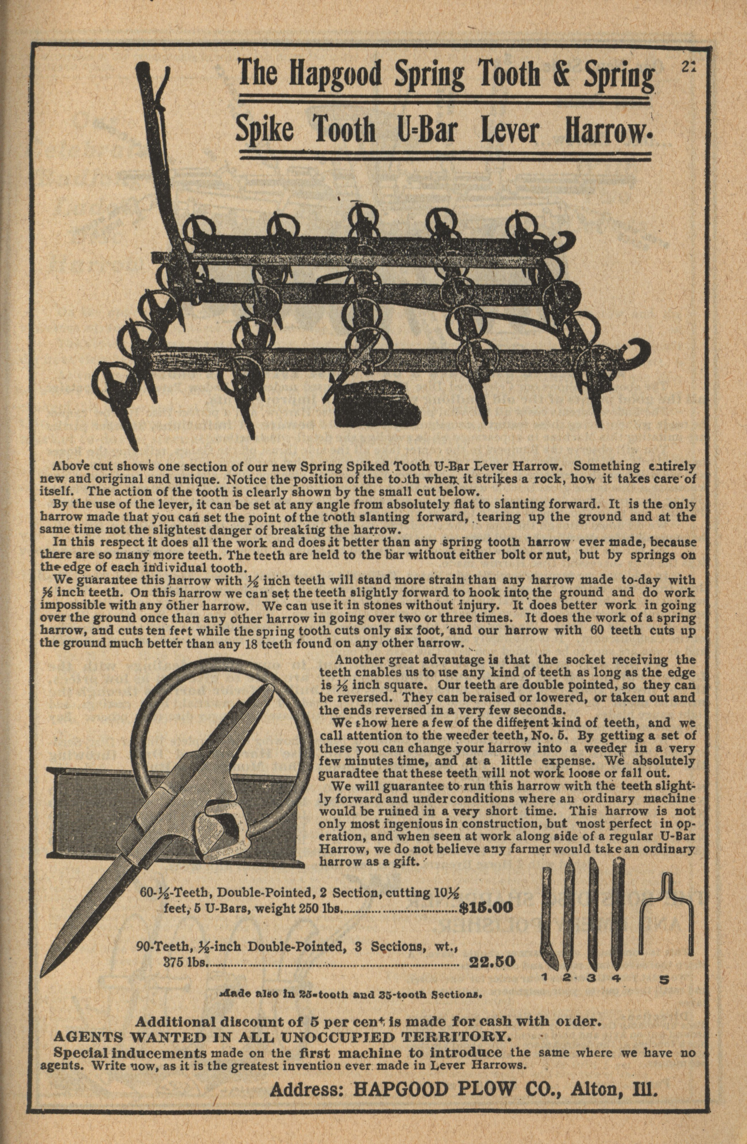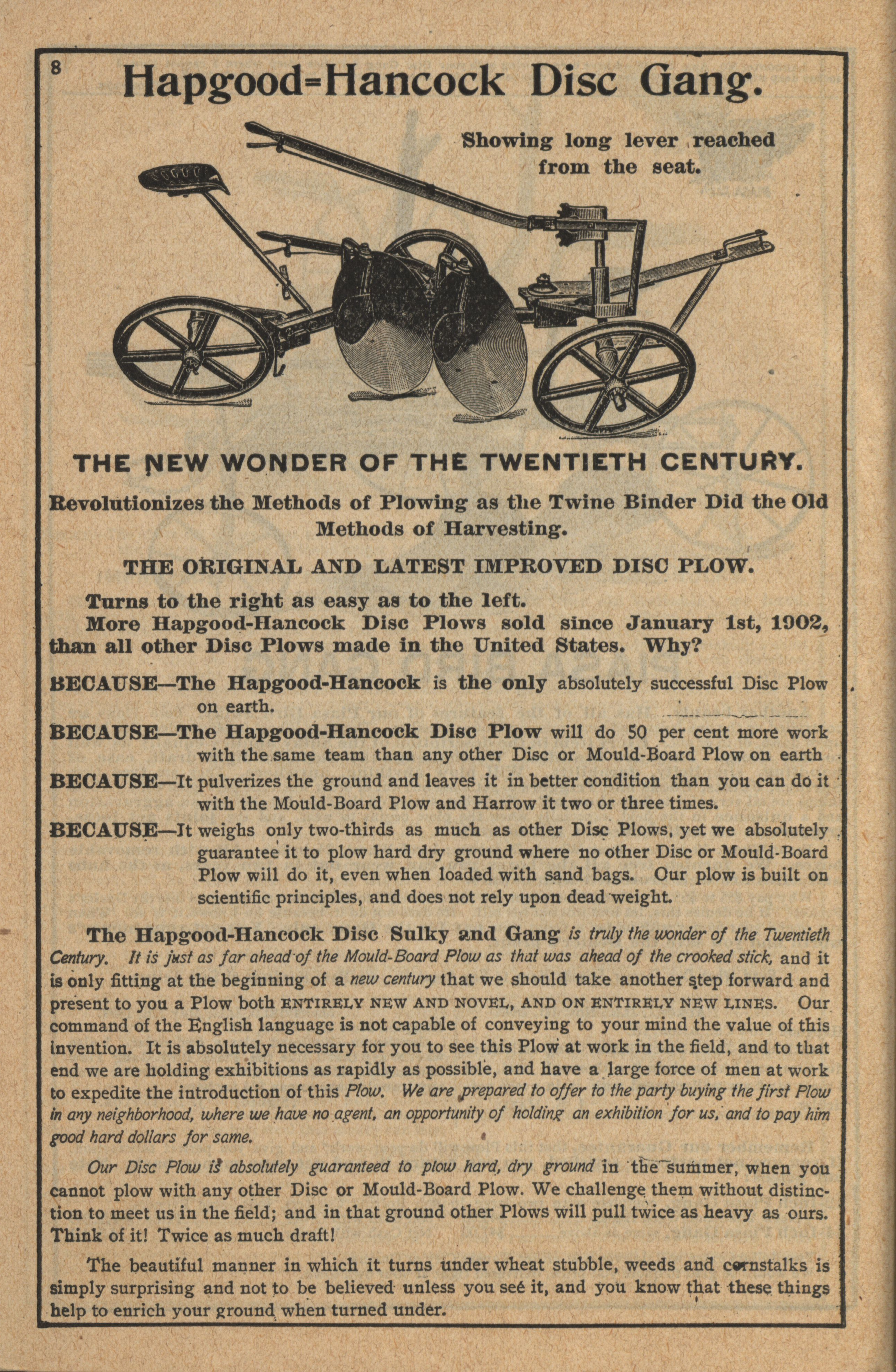 - Illustrated catalog describing the agricultural implements offered by Hapgood Plow Company in 1905.