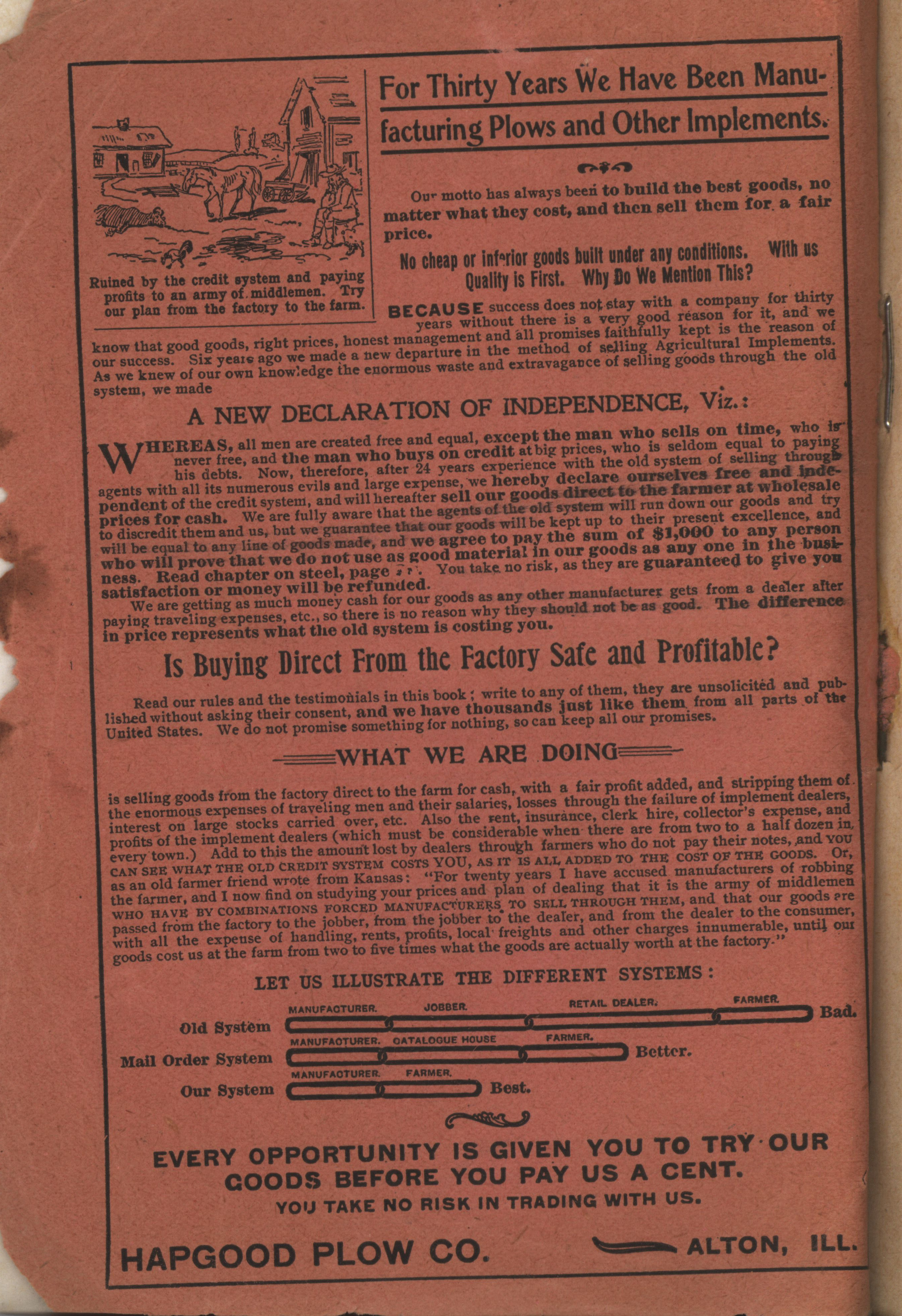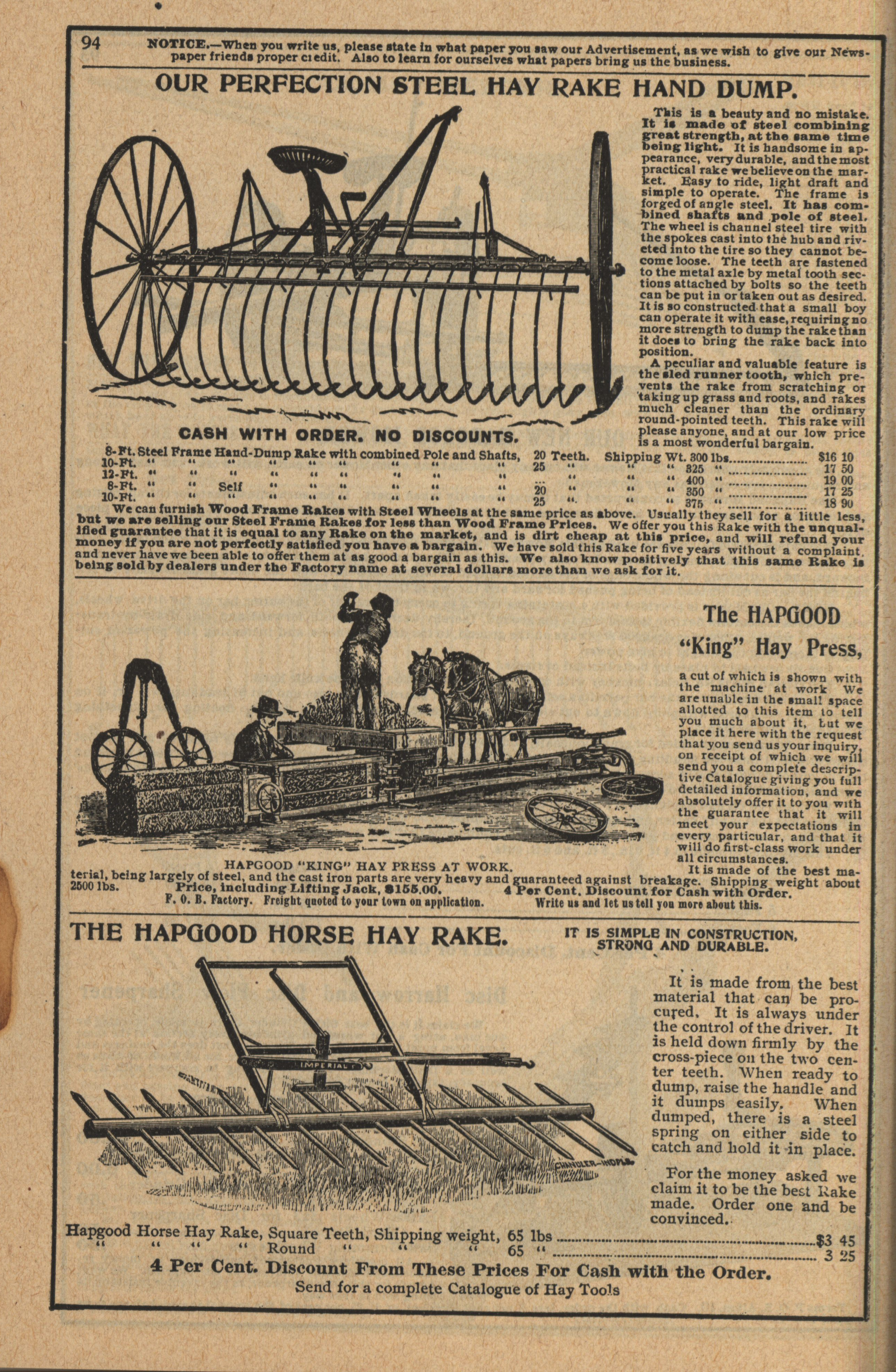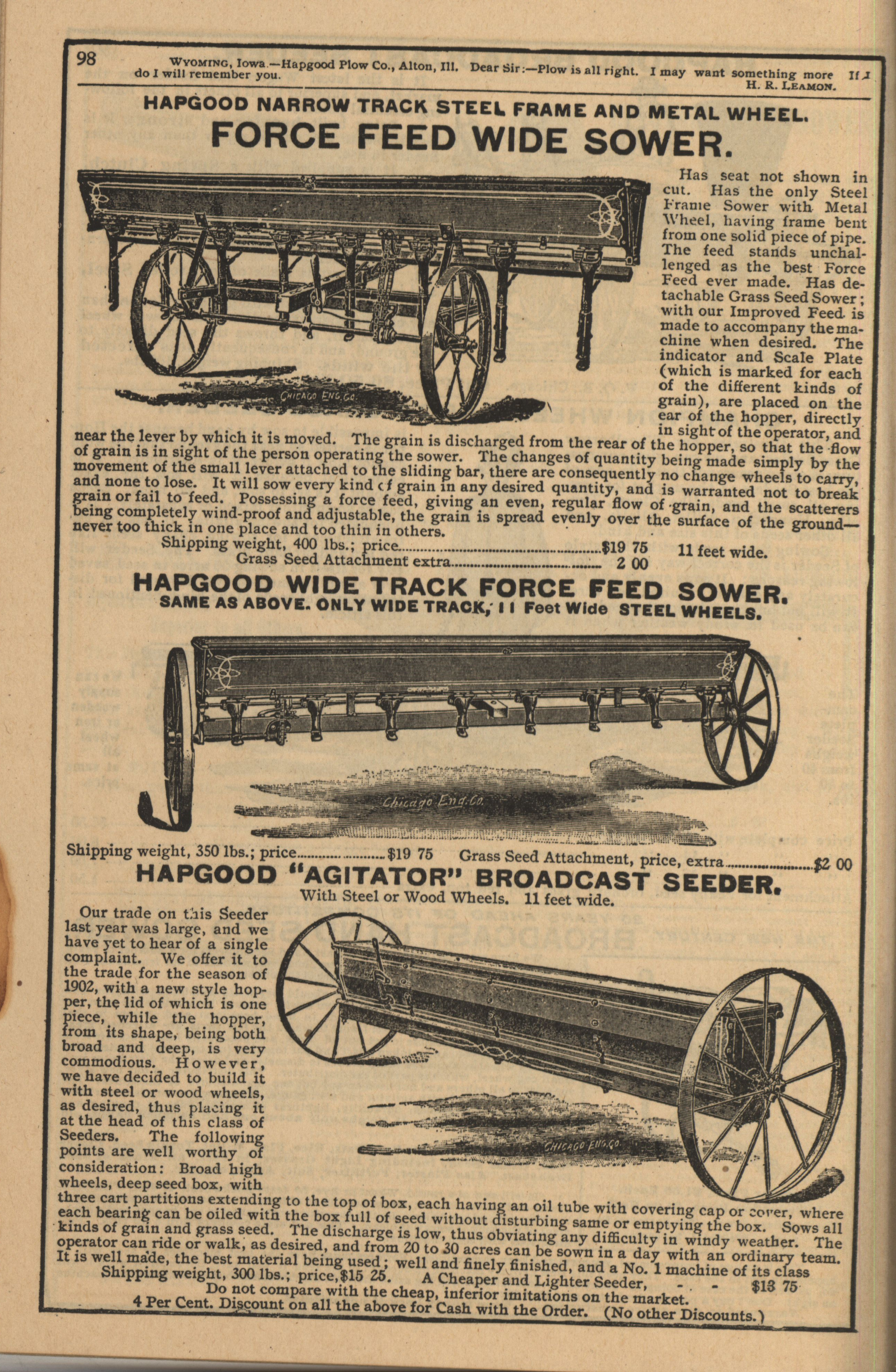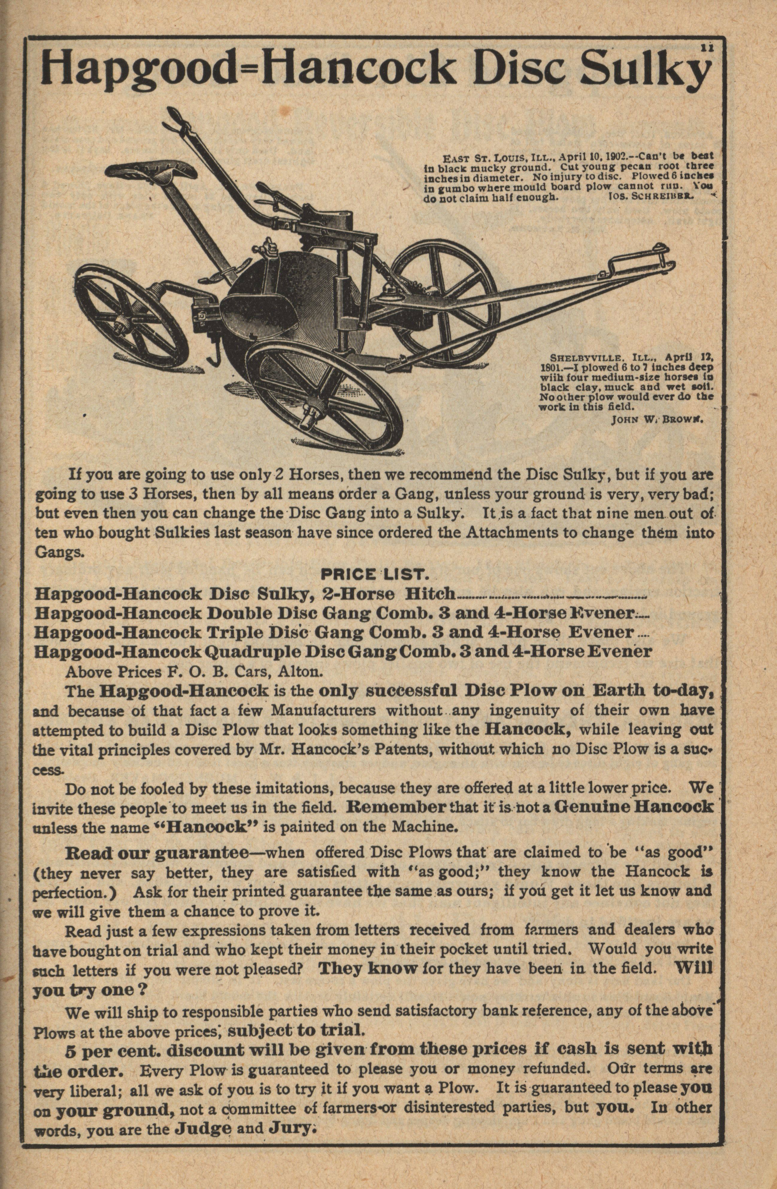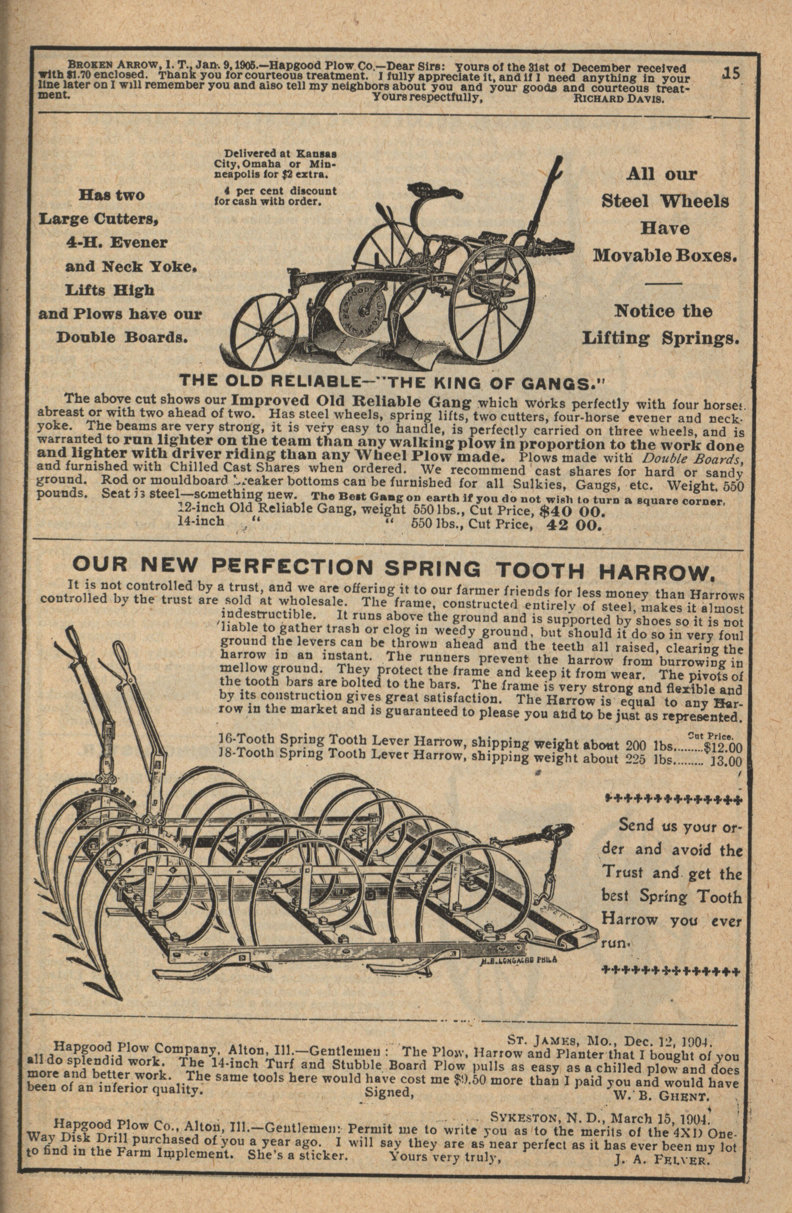 - Illustrated catalog describing the agricultural implements offered by Hapgood Plow Company in 1905.