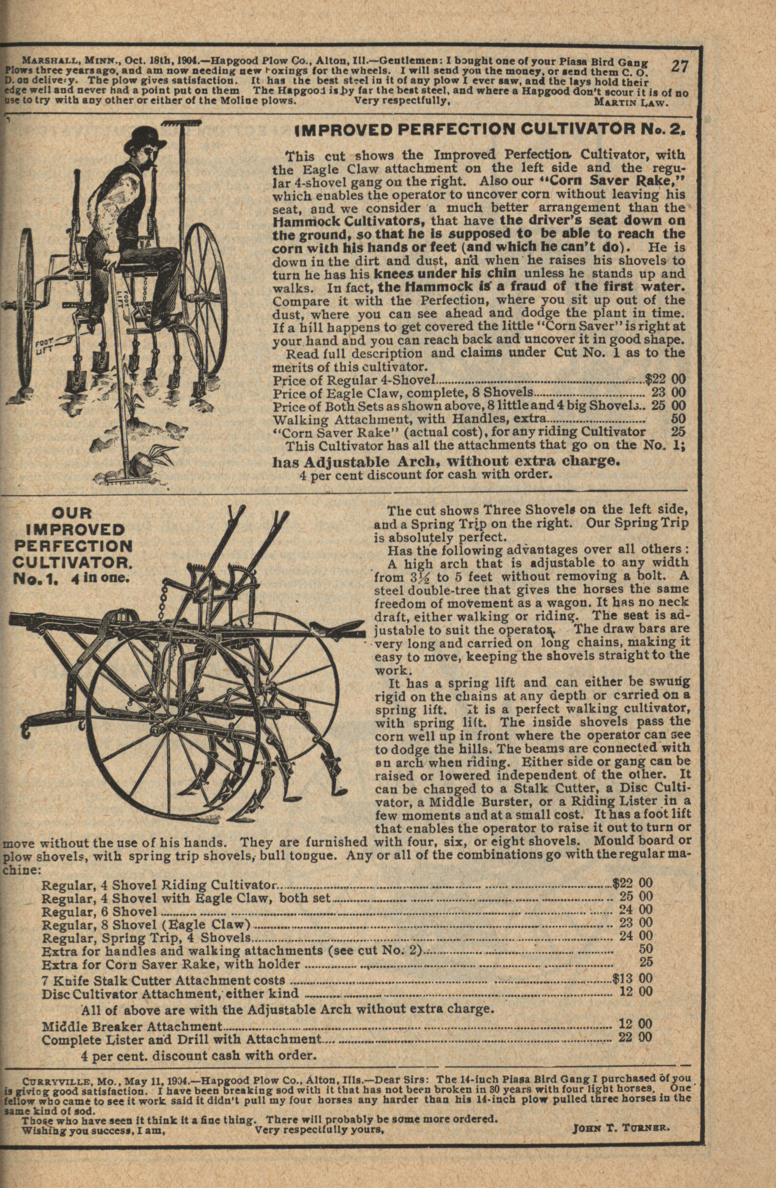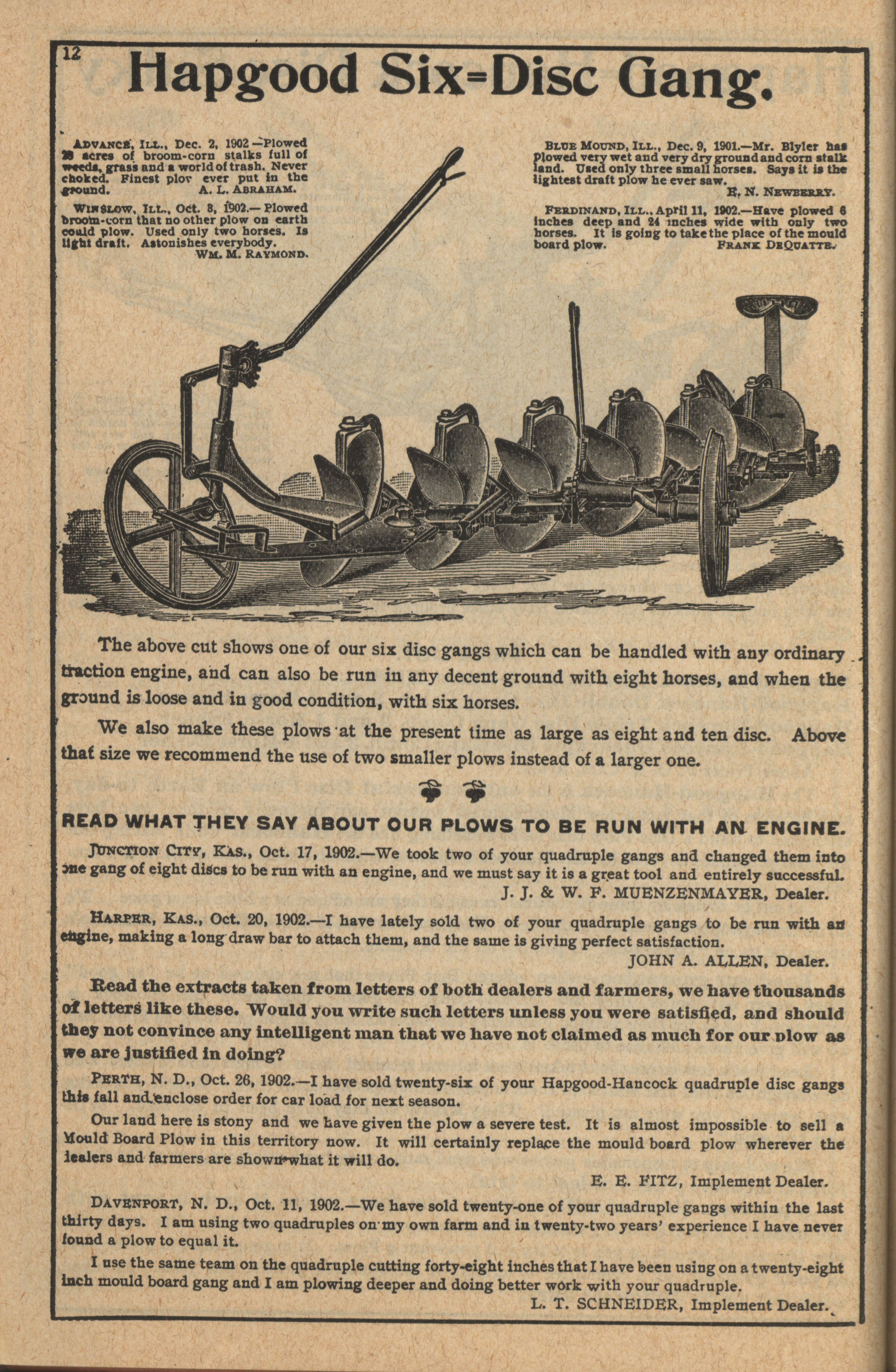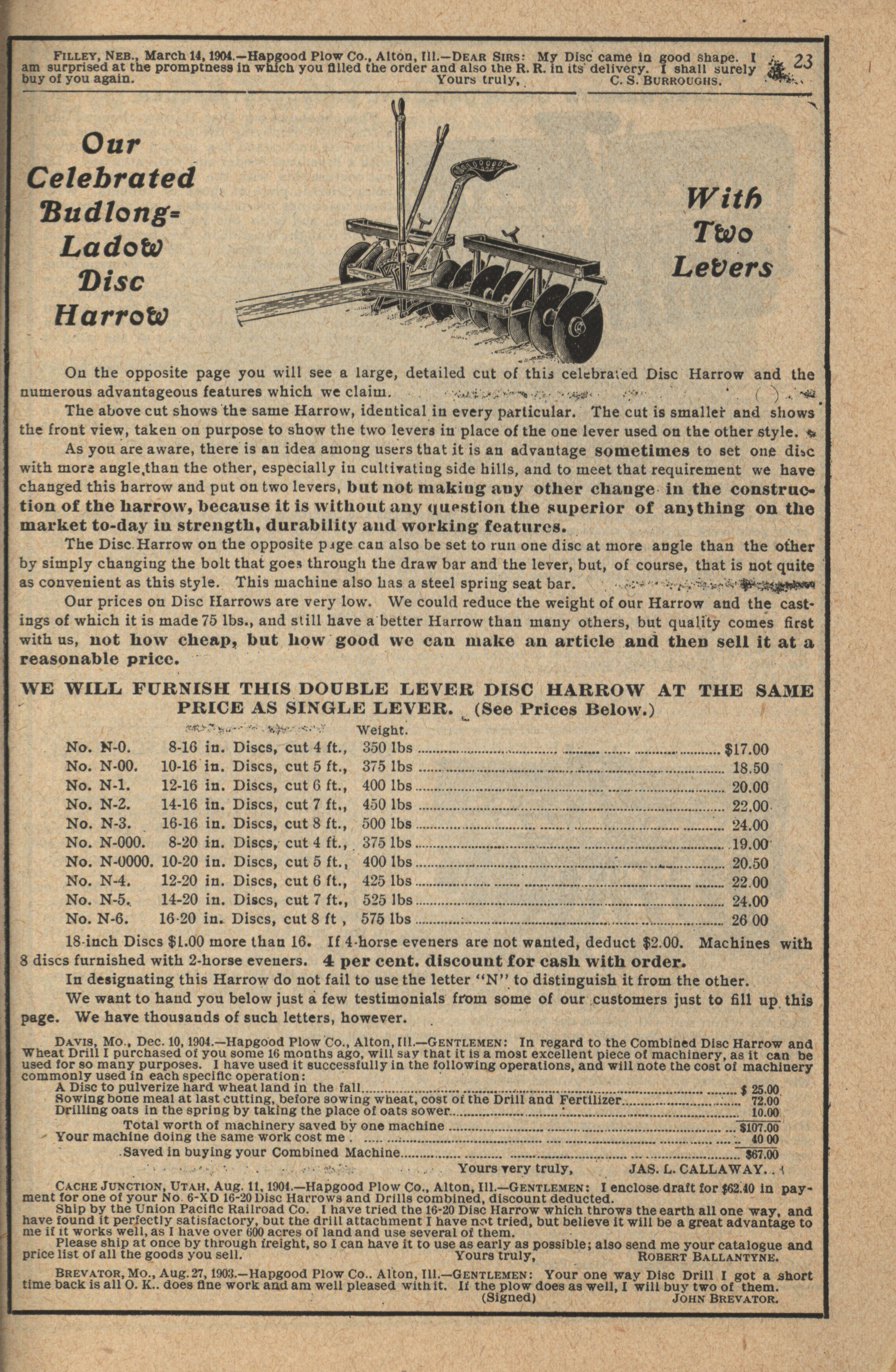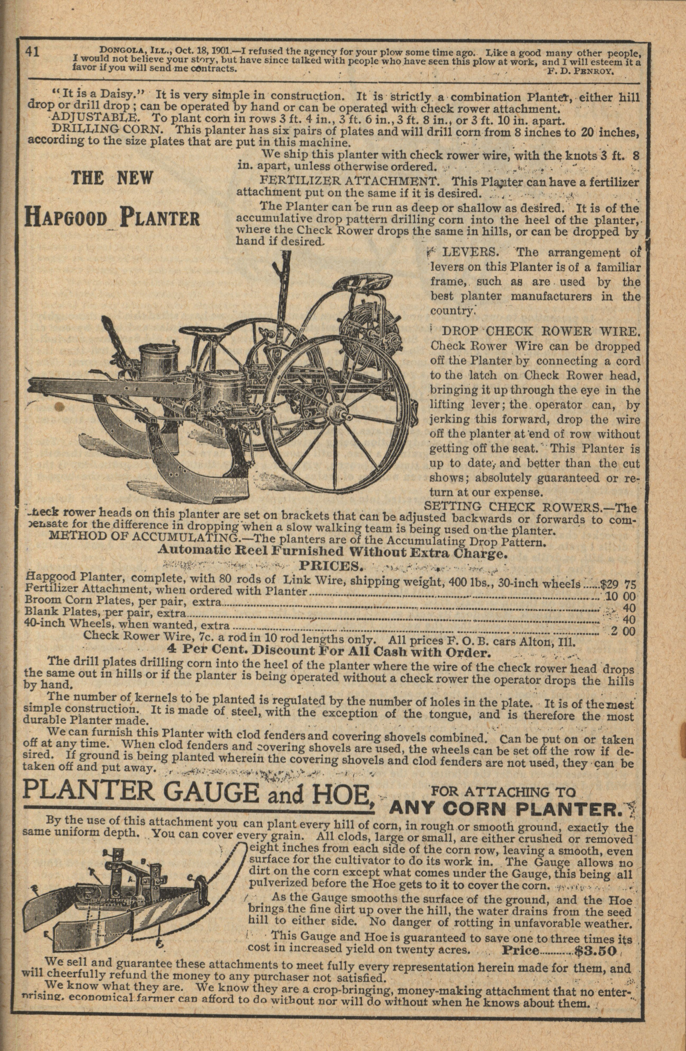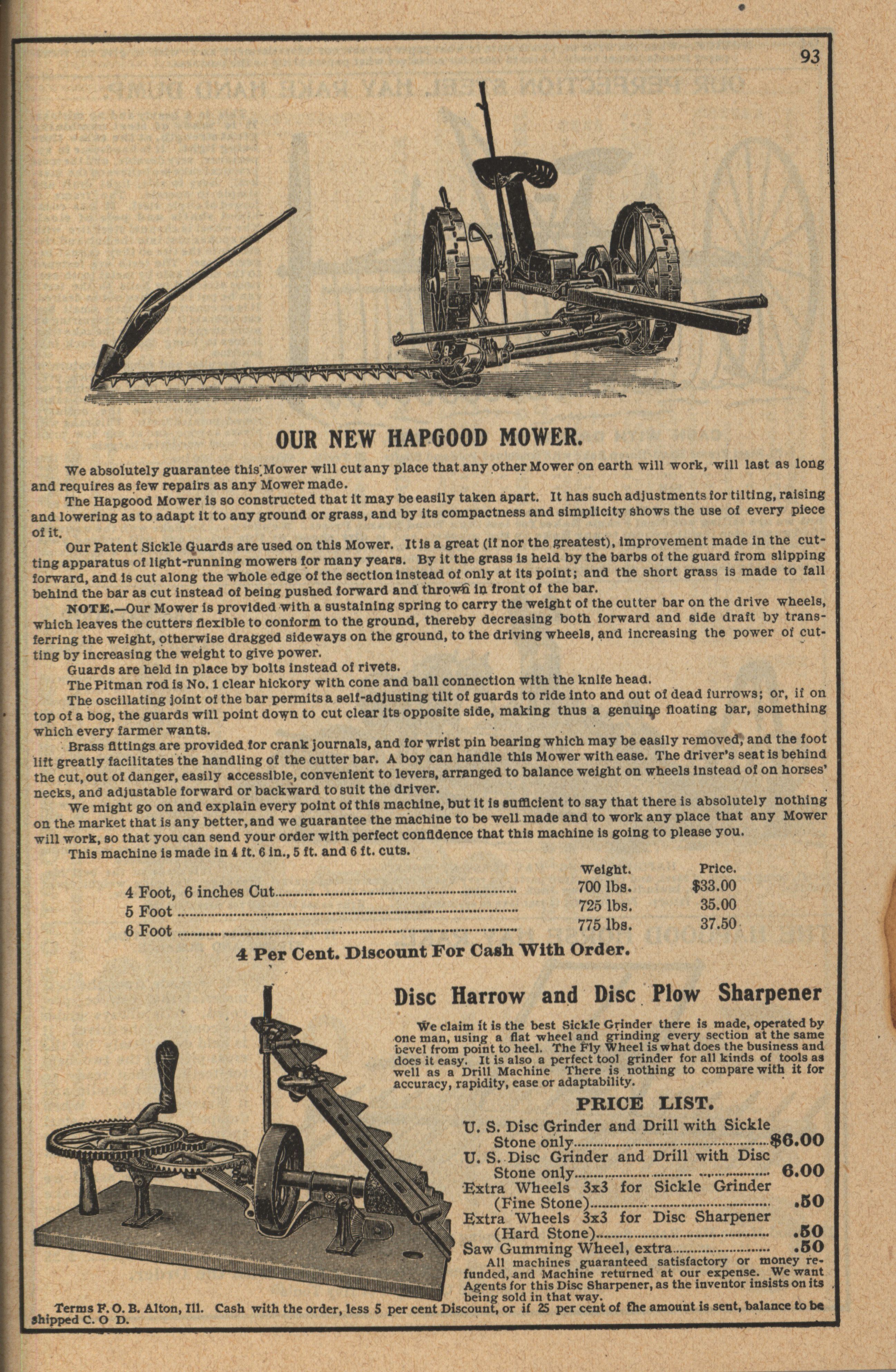 - Illustrated catalog describing the agricultural implements offered by Hapgood Plow Company in 1905.