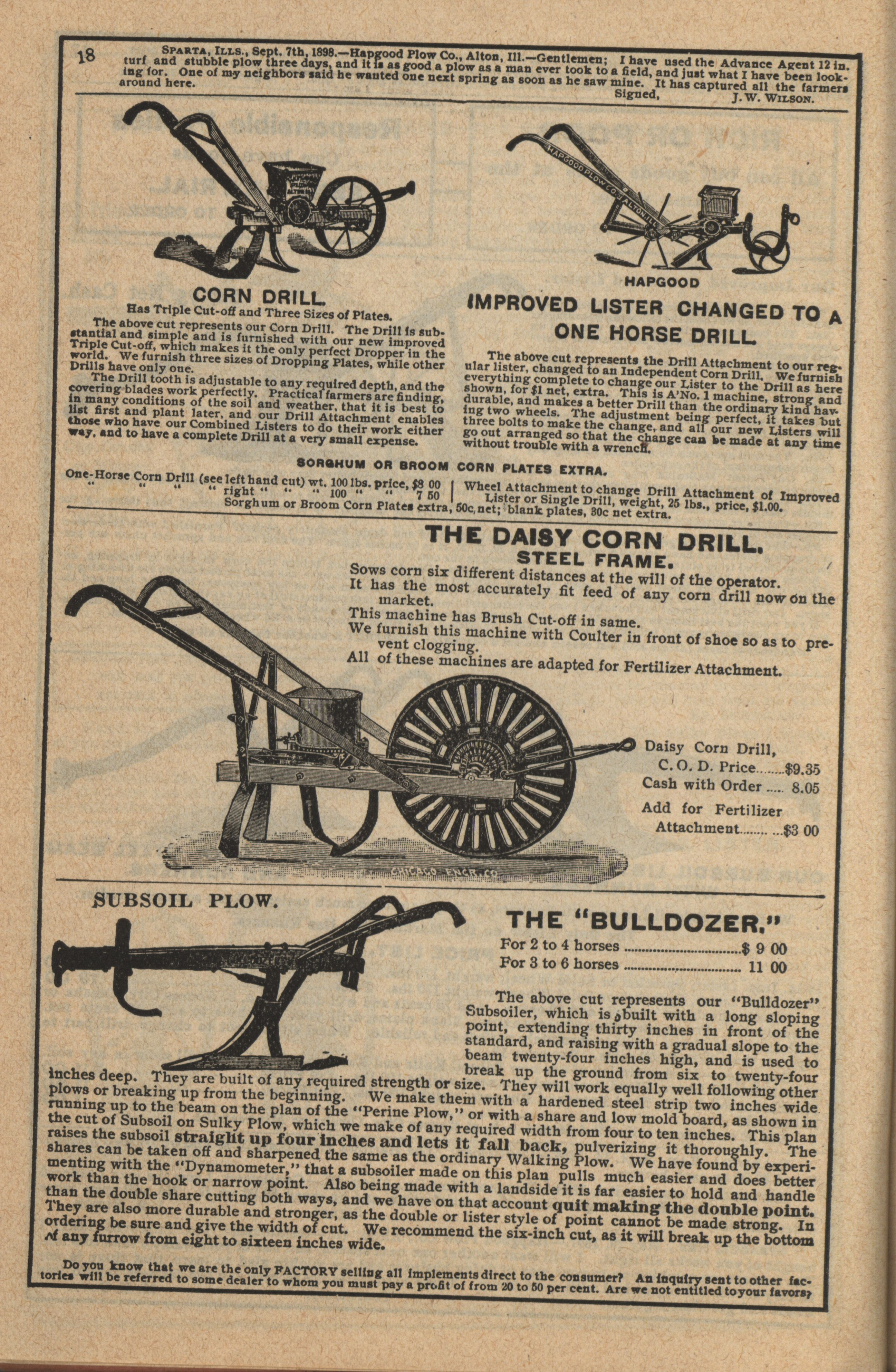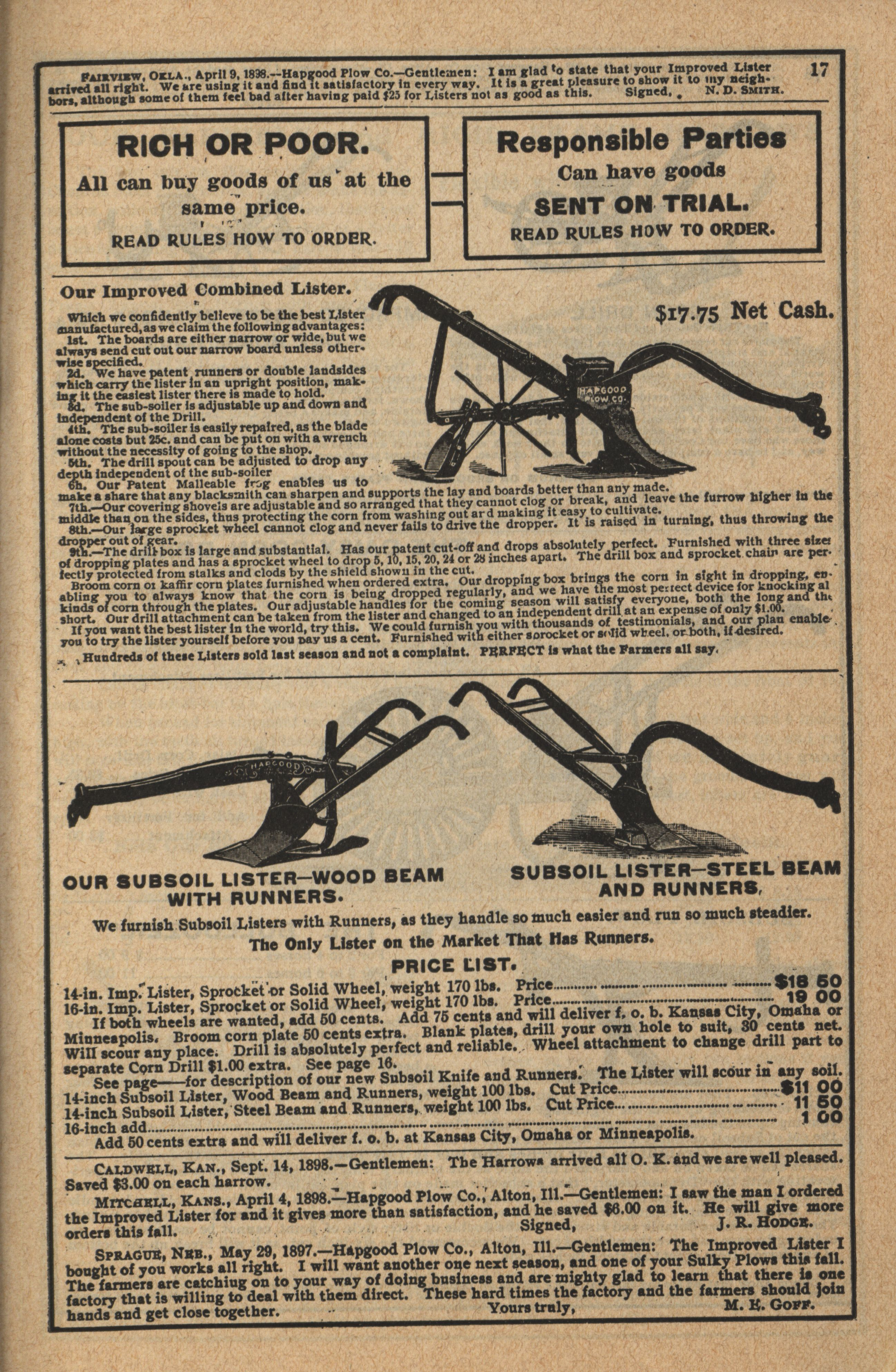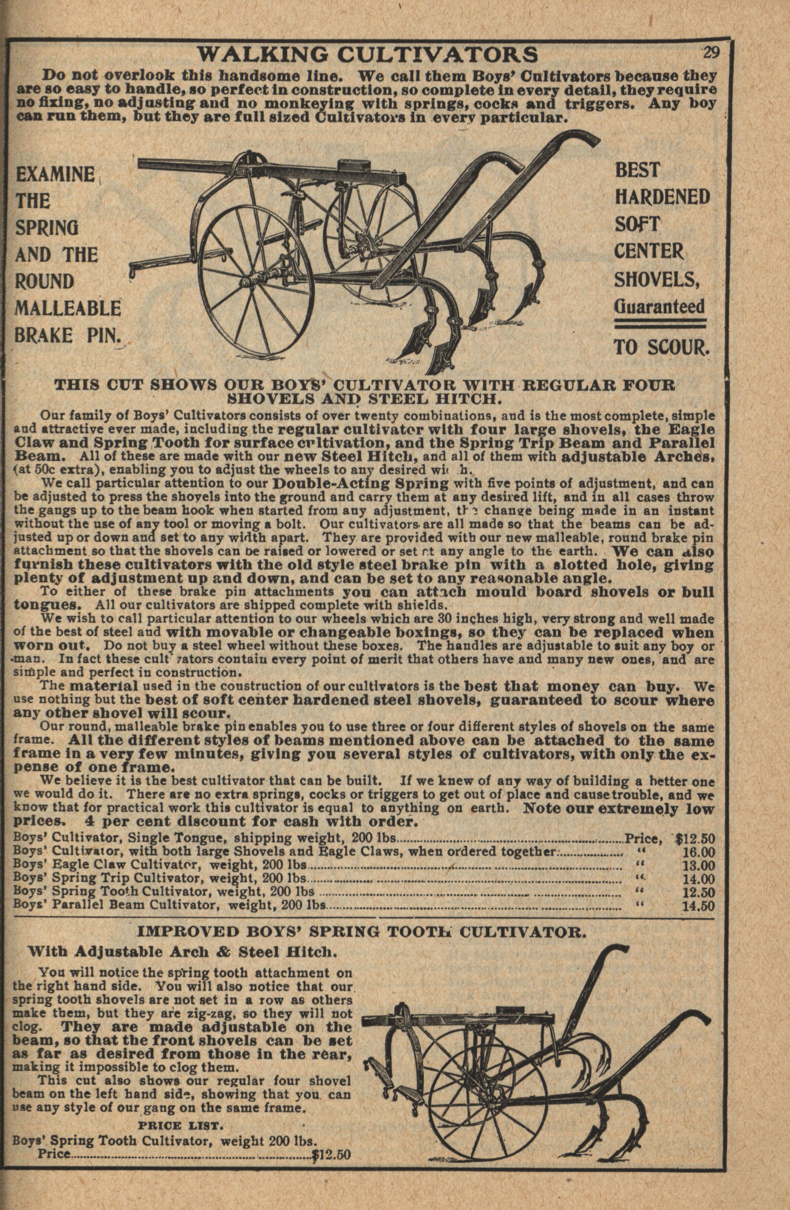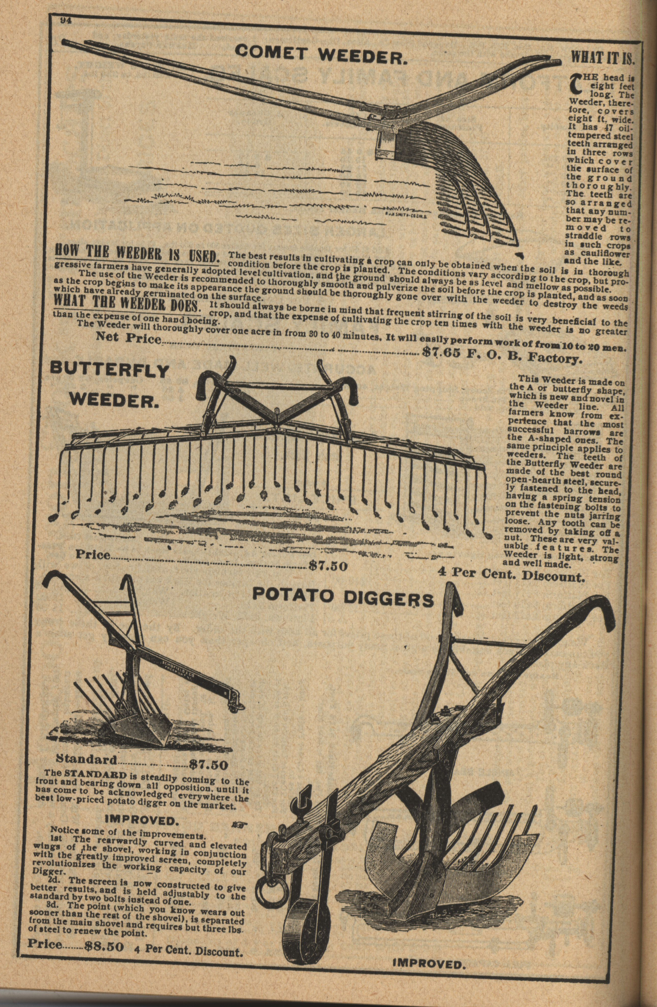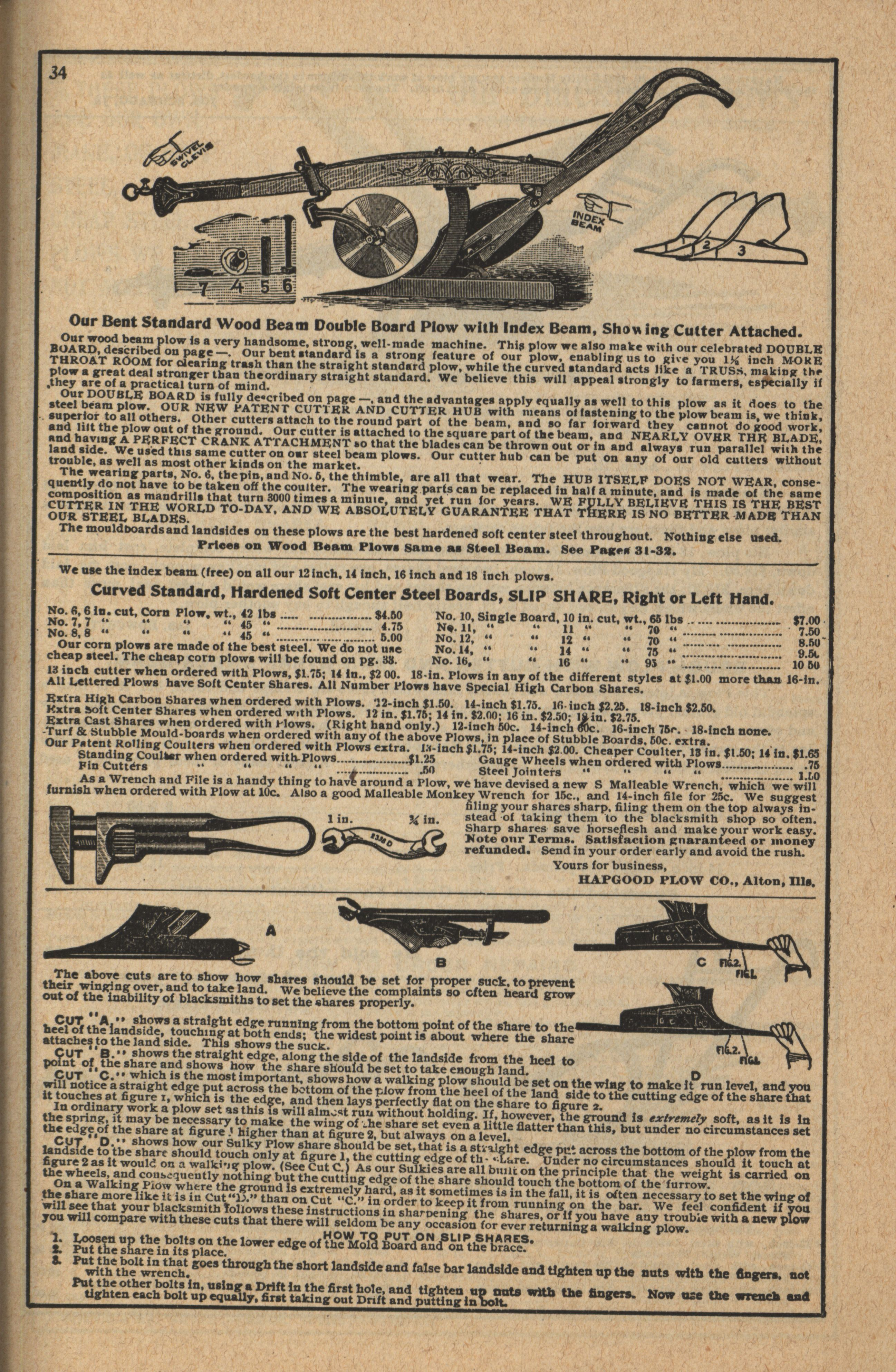 - Illustrated catalog describing the agricultural implements offered by Hapgood Plow Company in 1905.