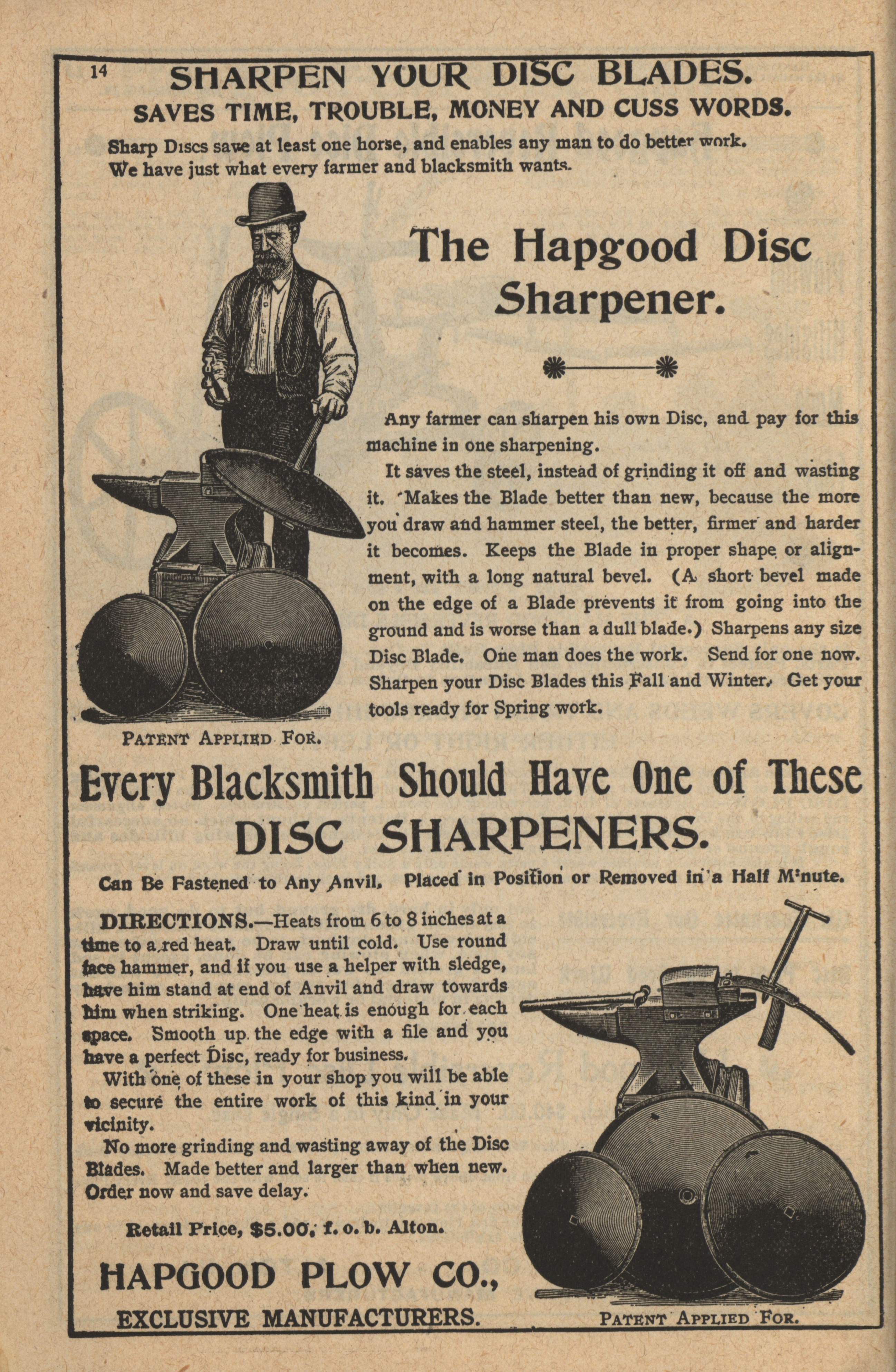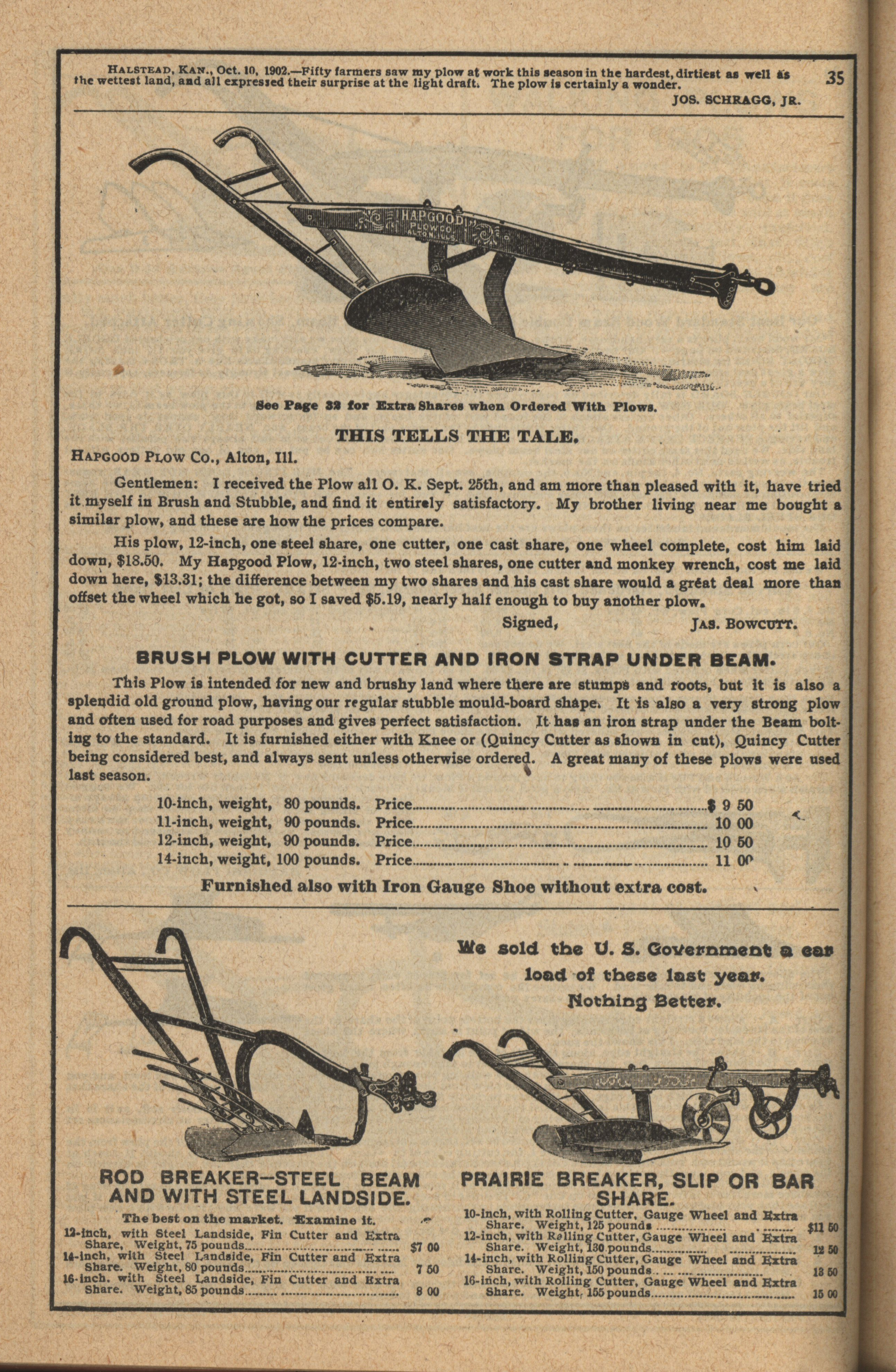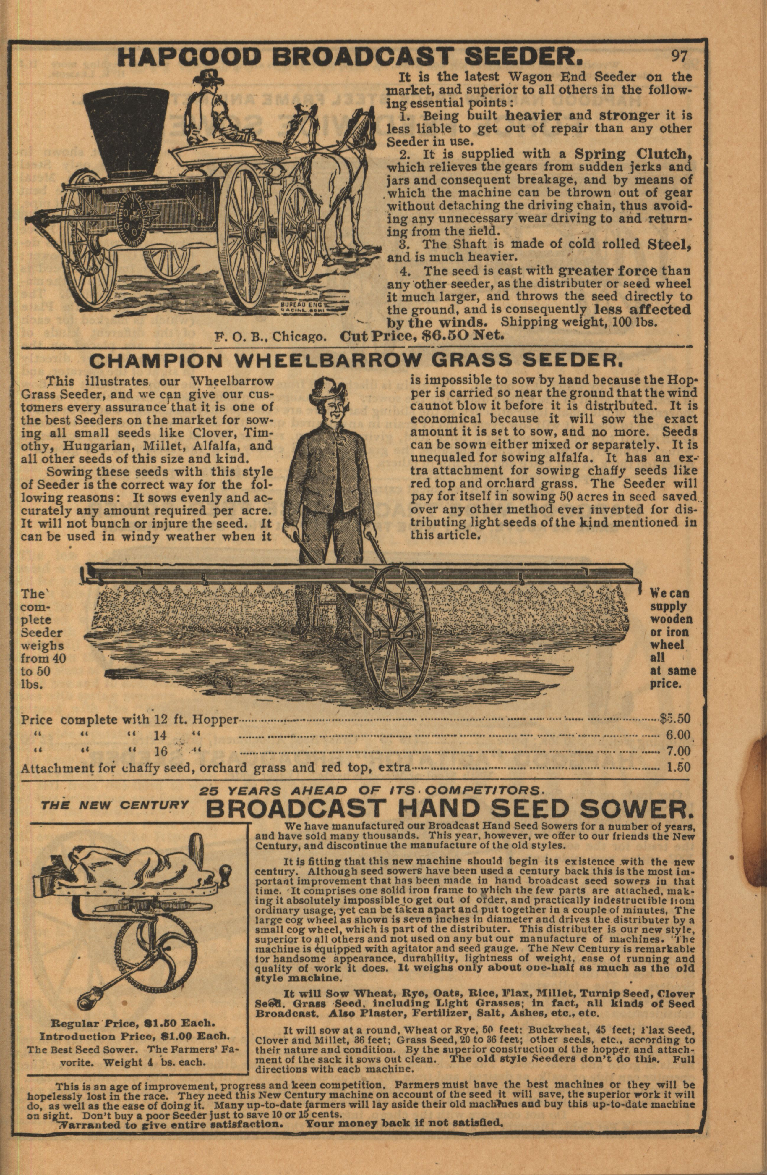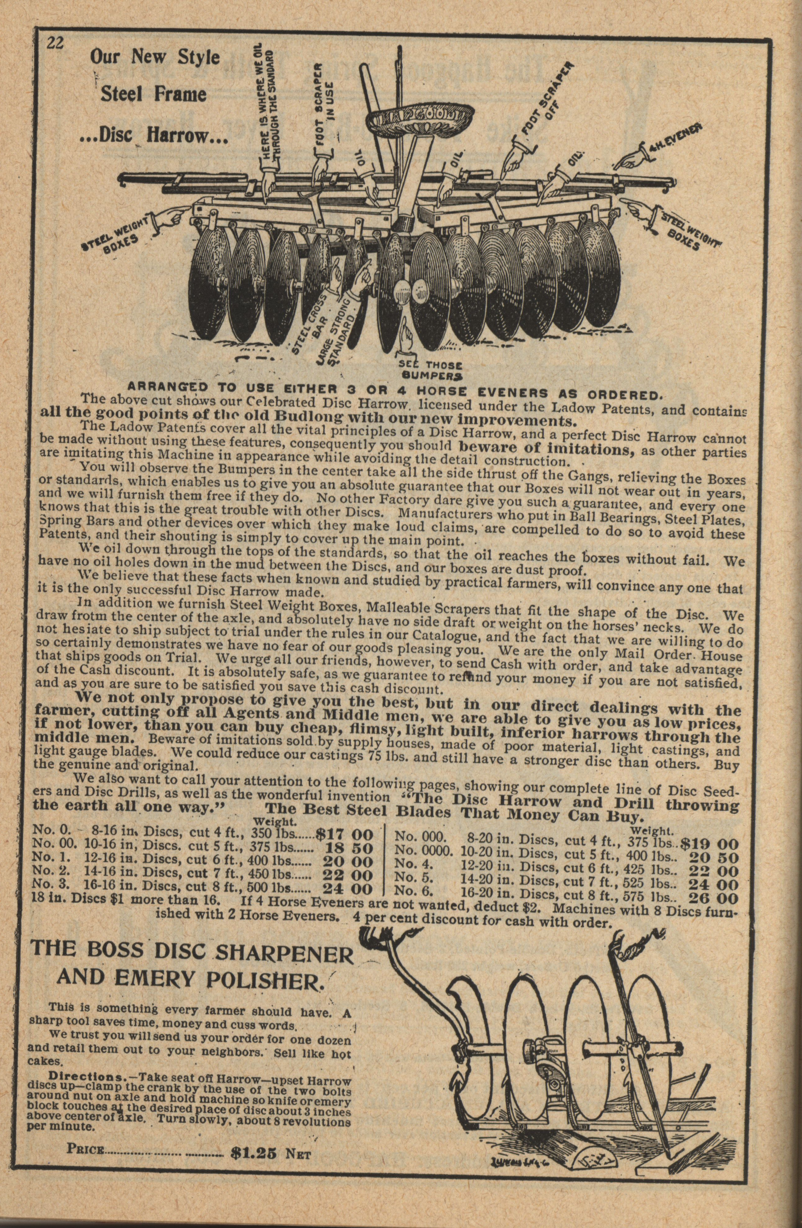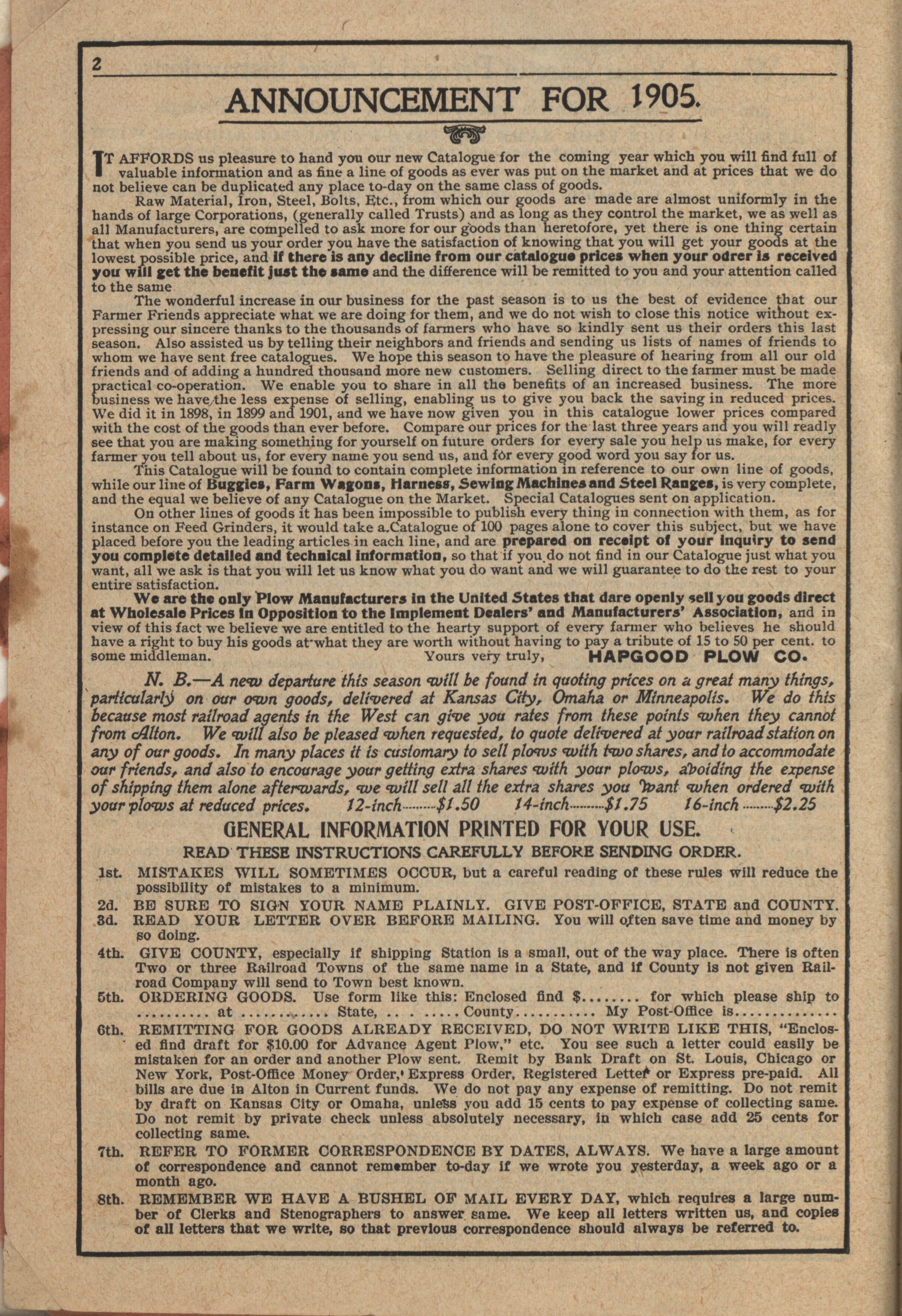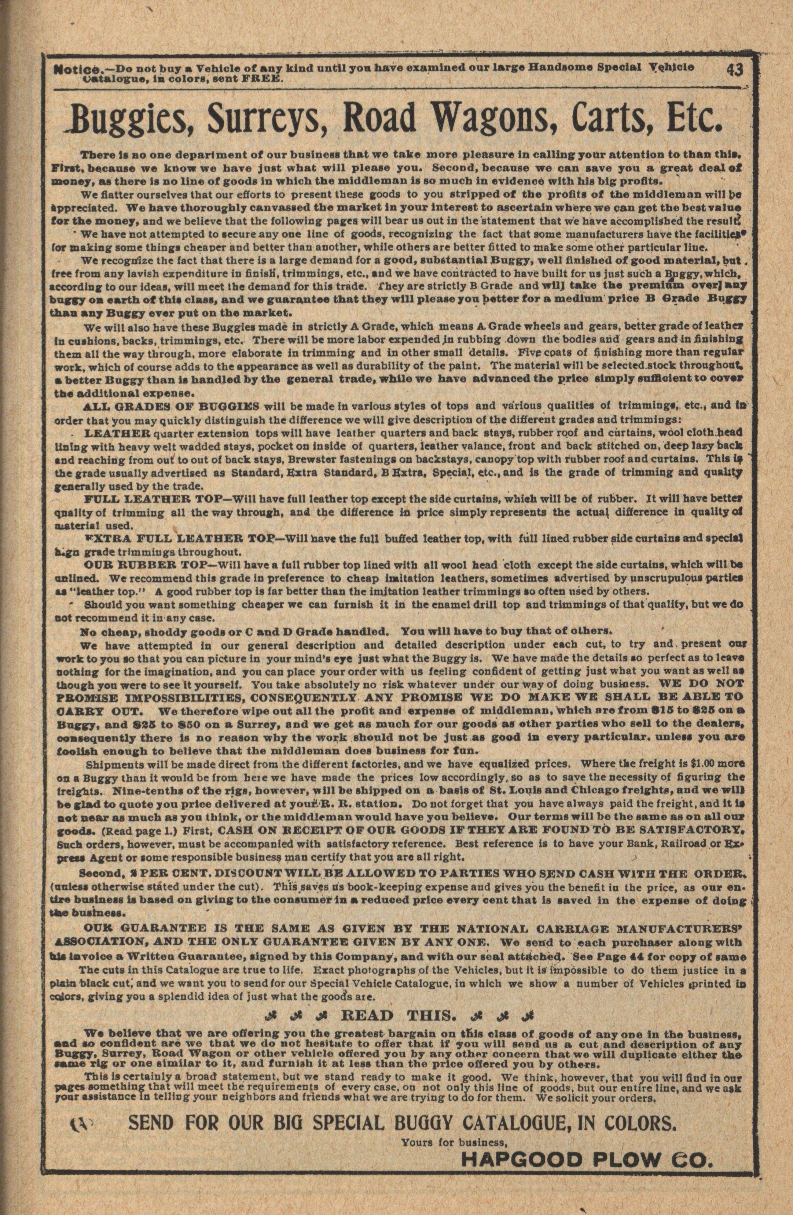 - Illustrated catalog describing the agricultural implements offered by Hapgood Plow Company in 1905.