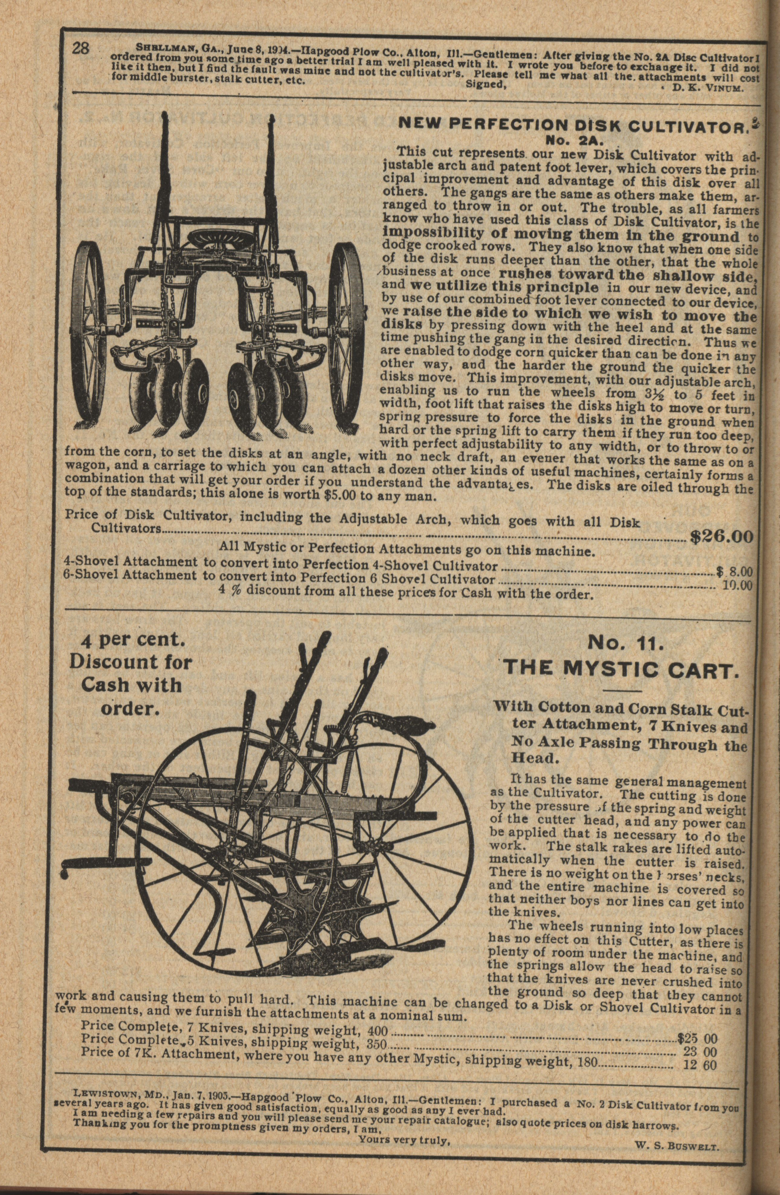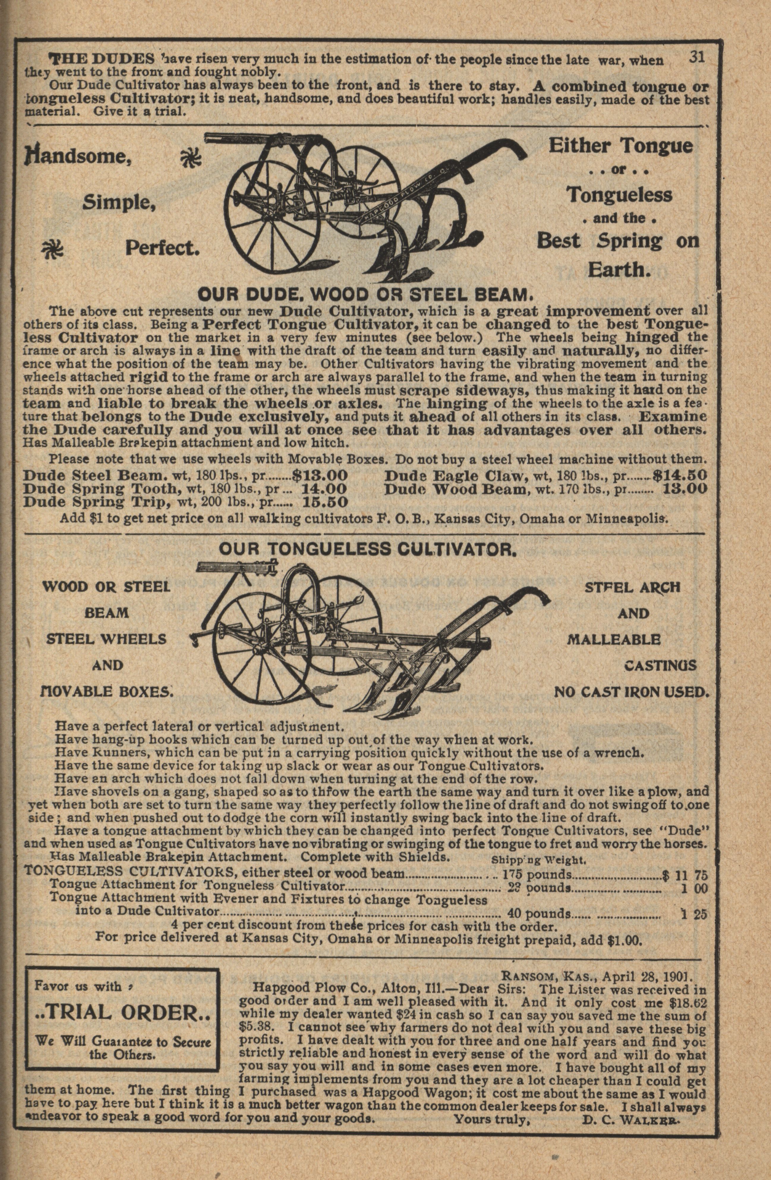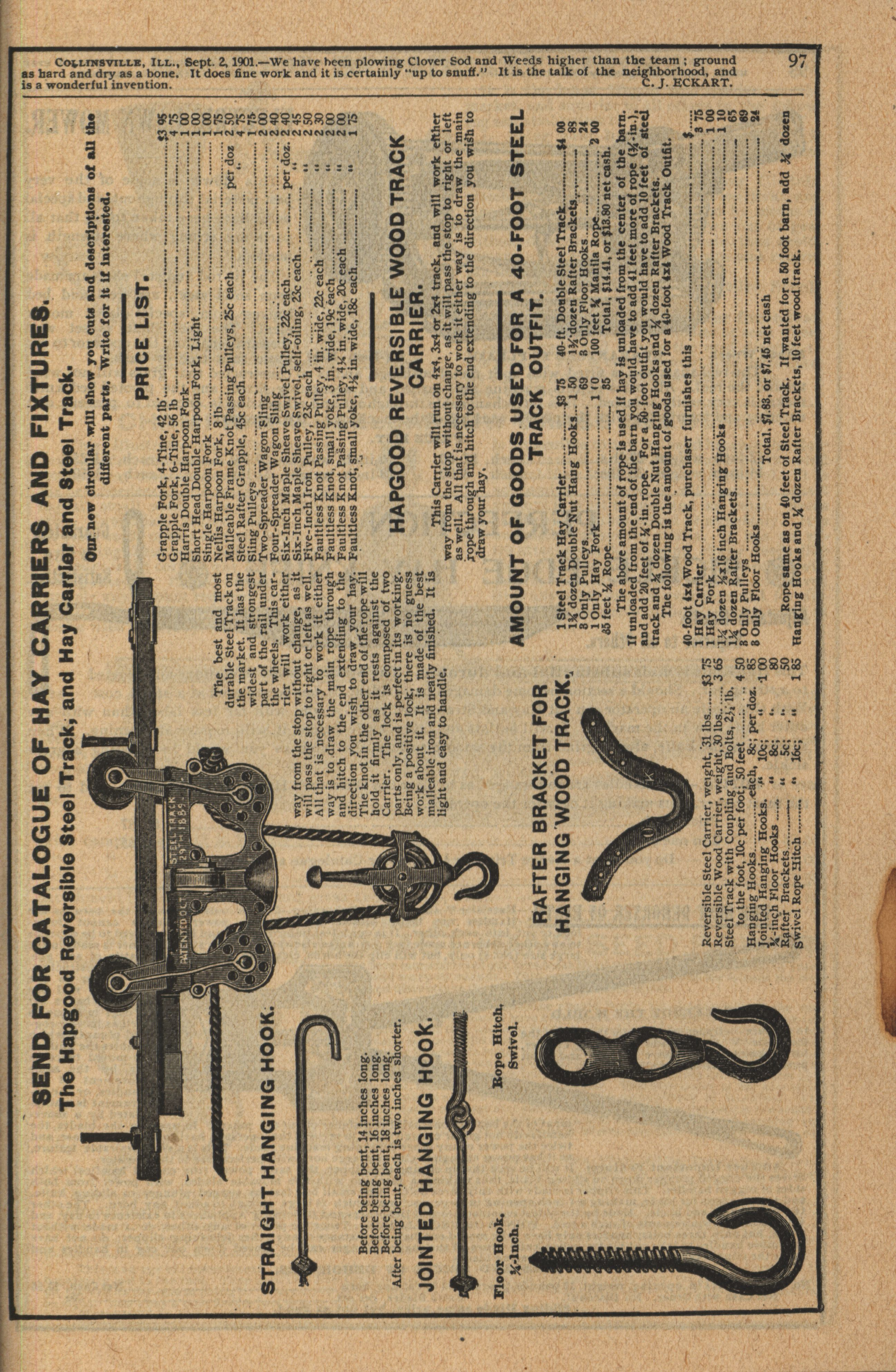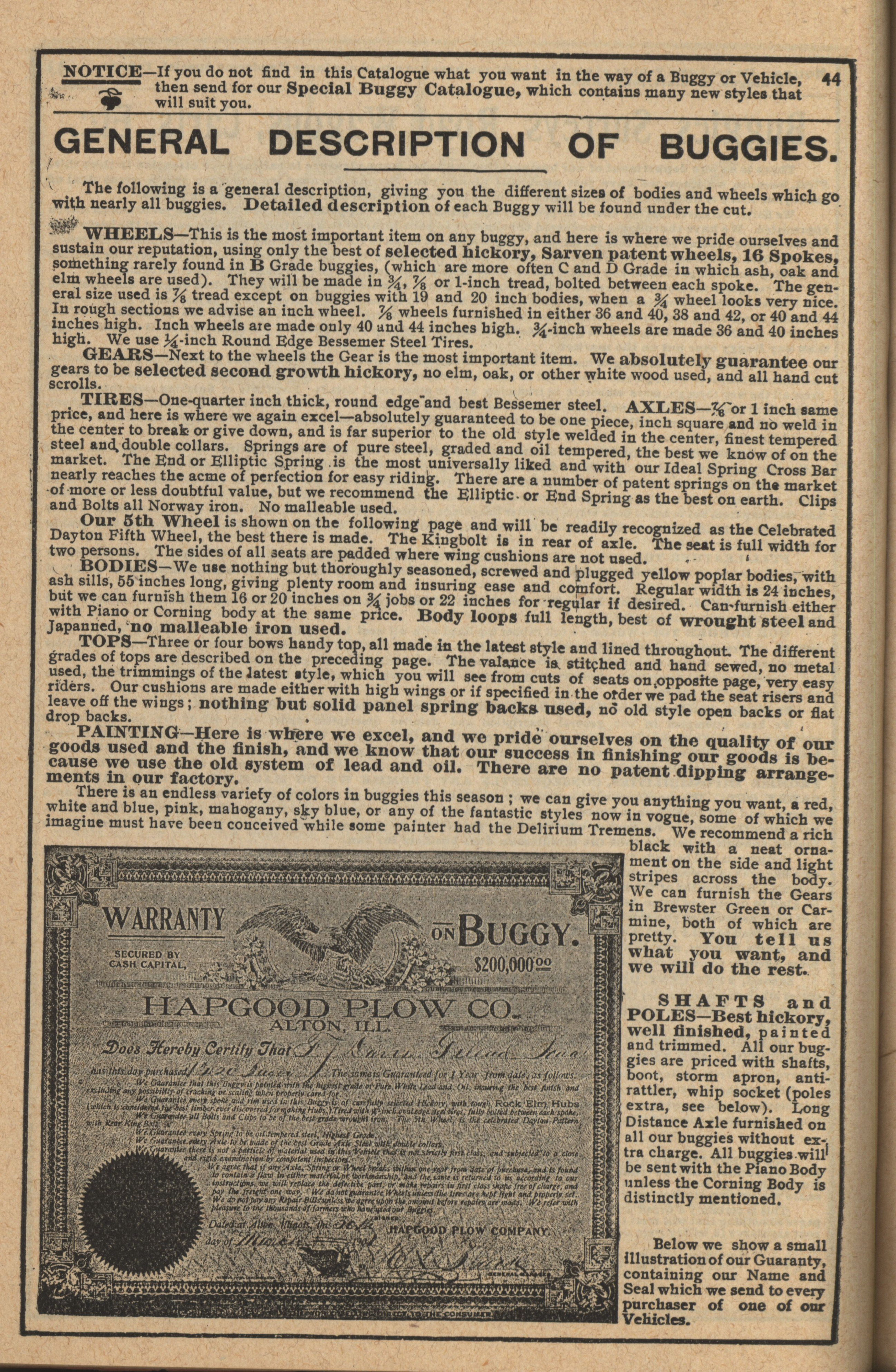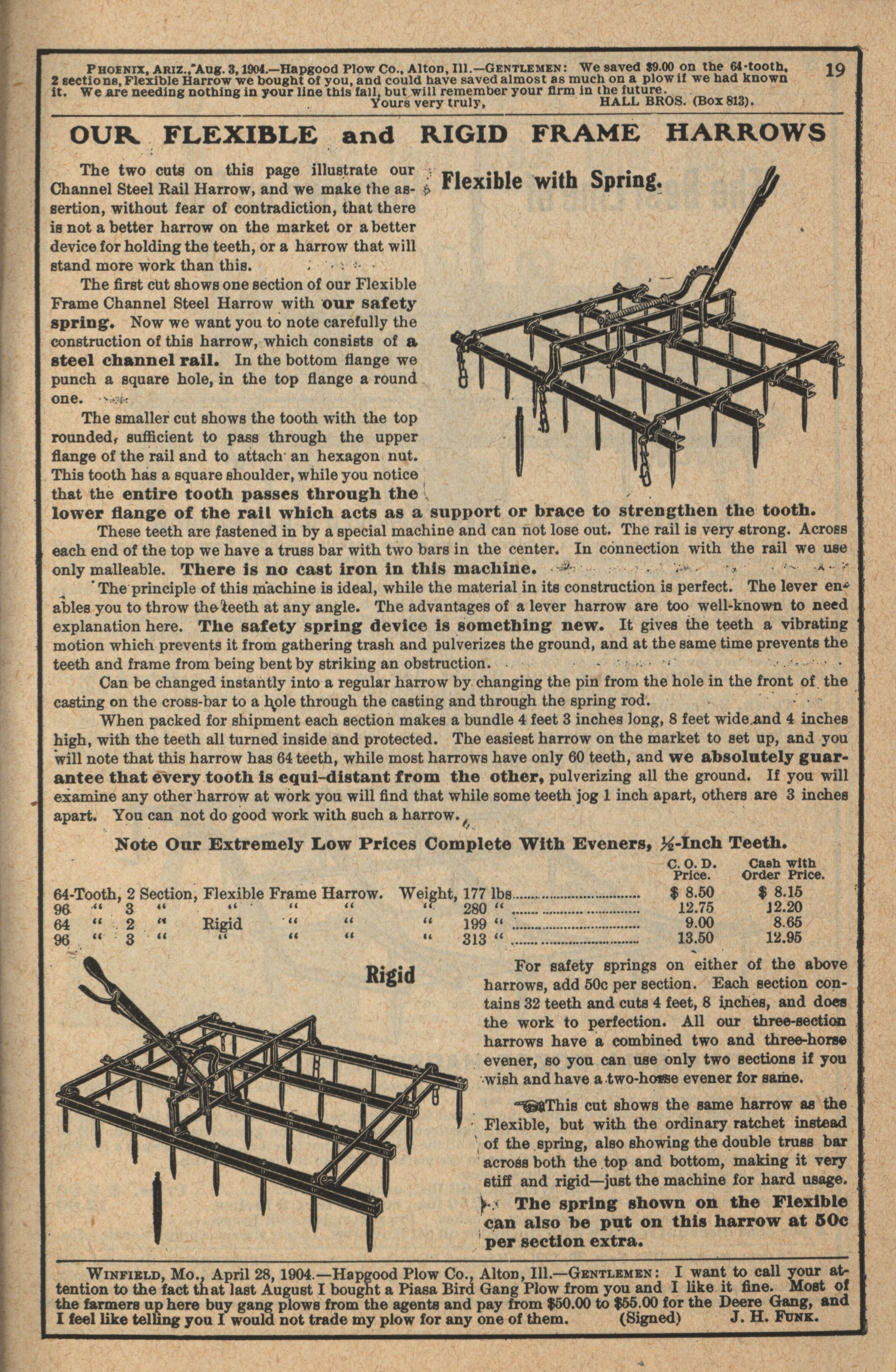 - Illustrated catalog describing the agricultural implements offered by Hapgood Plow Company in 1905.
