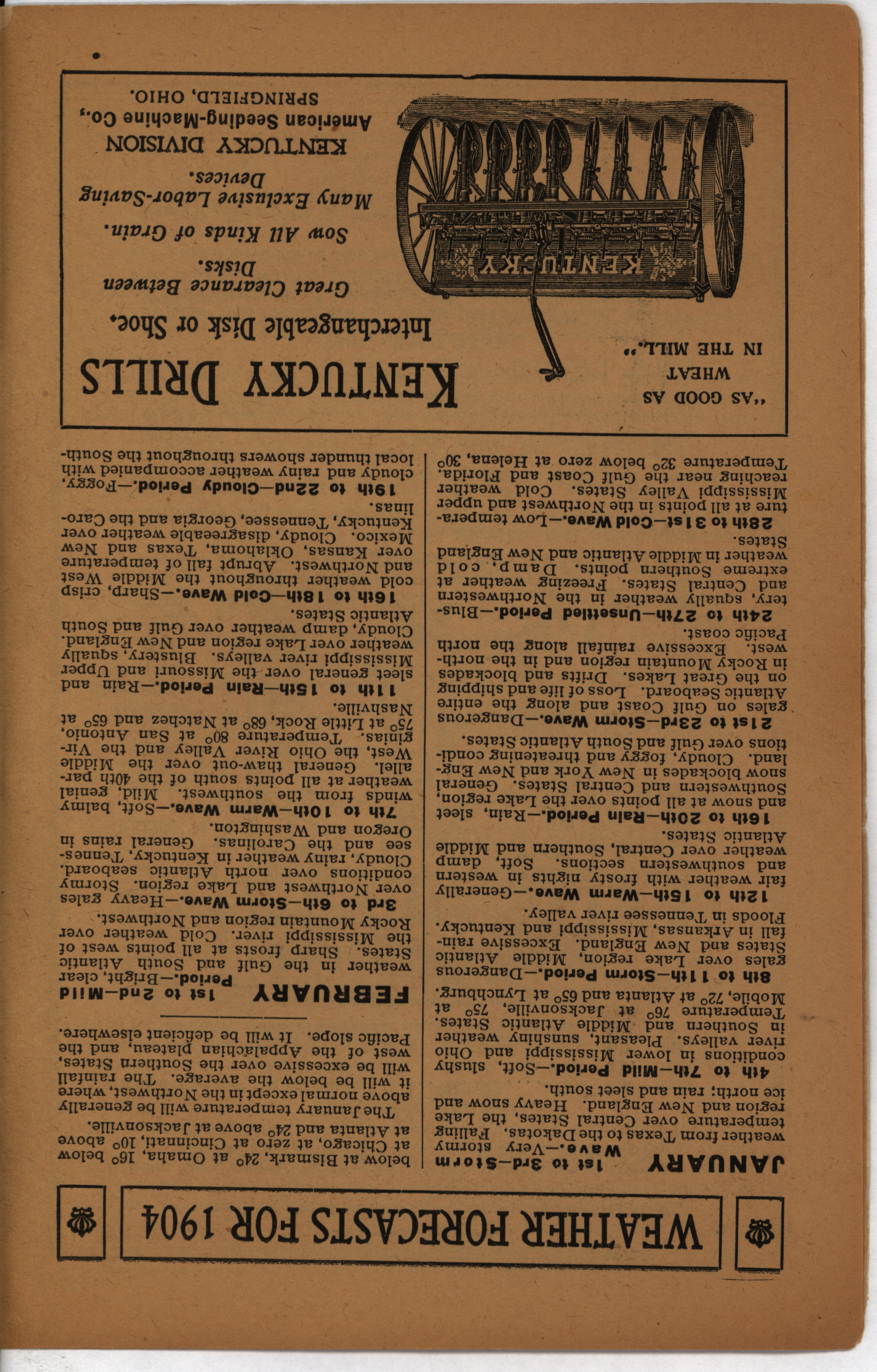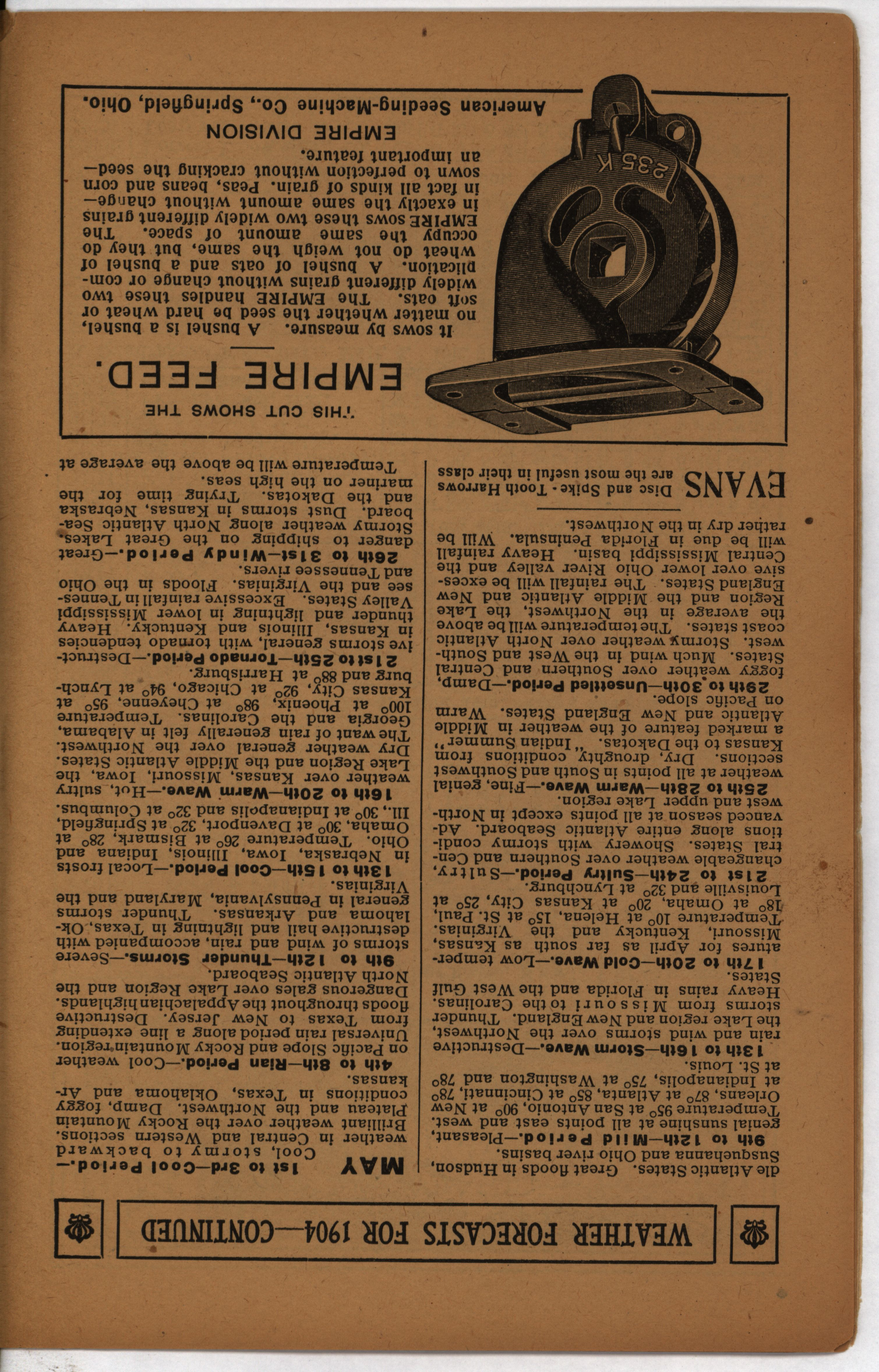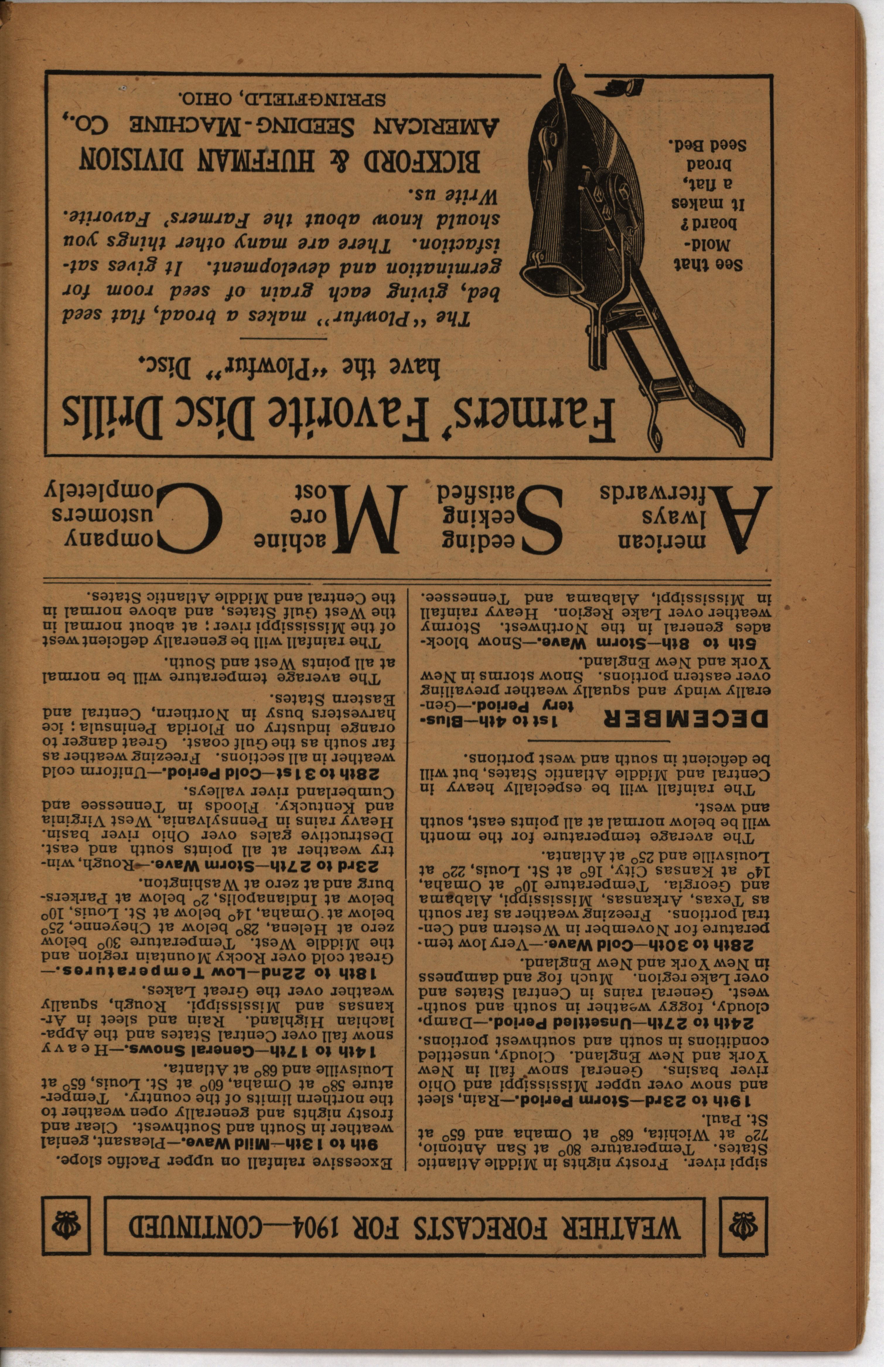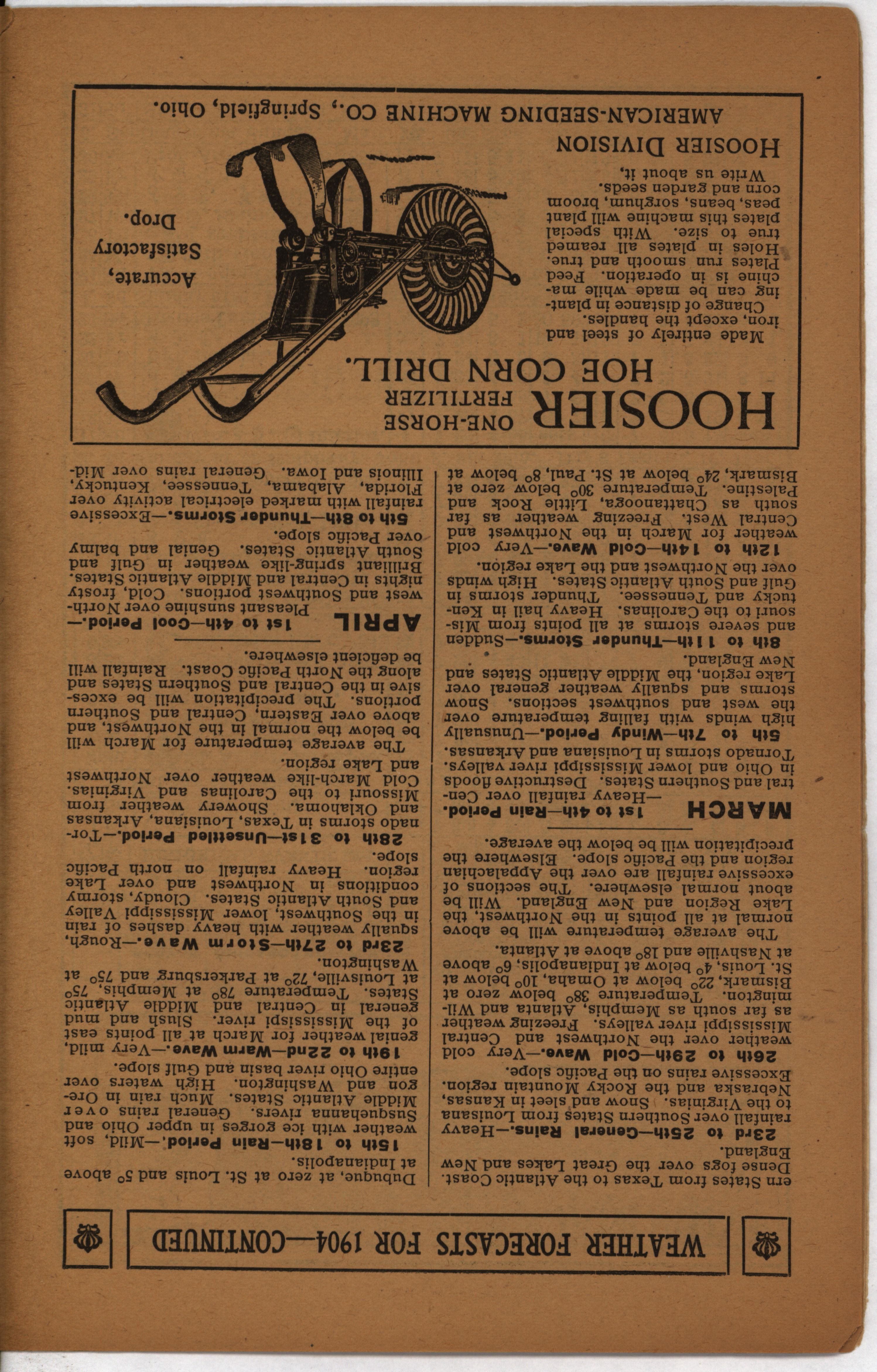 - Farmer's almanac from 1904 published by the American Seeding-Machine Company. Details seasonal information and changes for each month along with agricultural advertisements.
