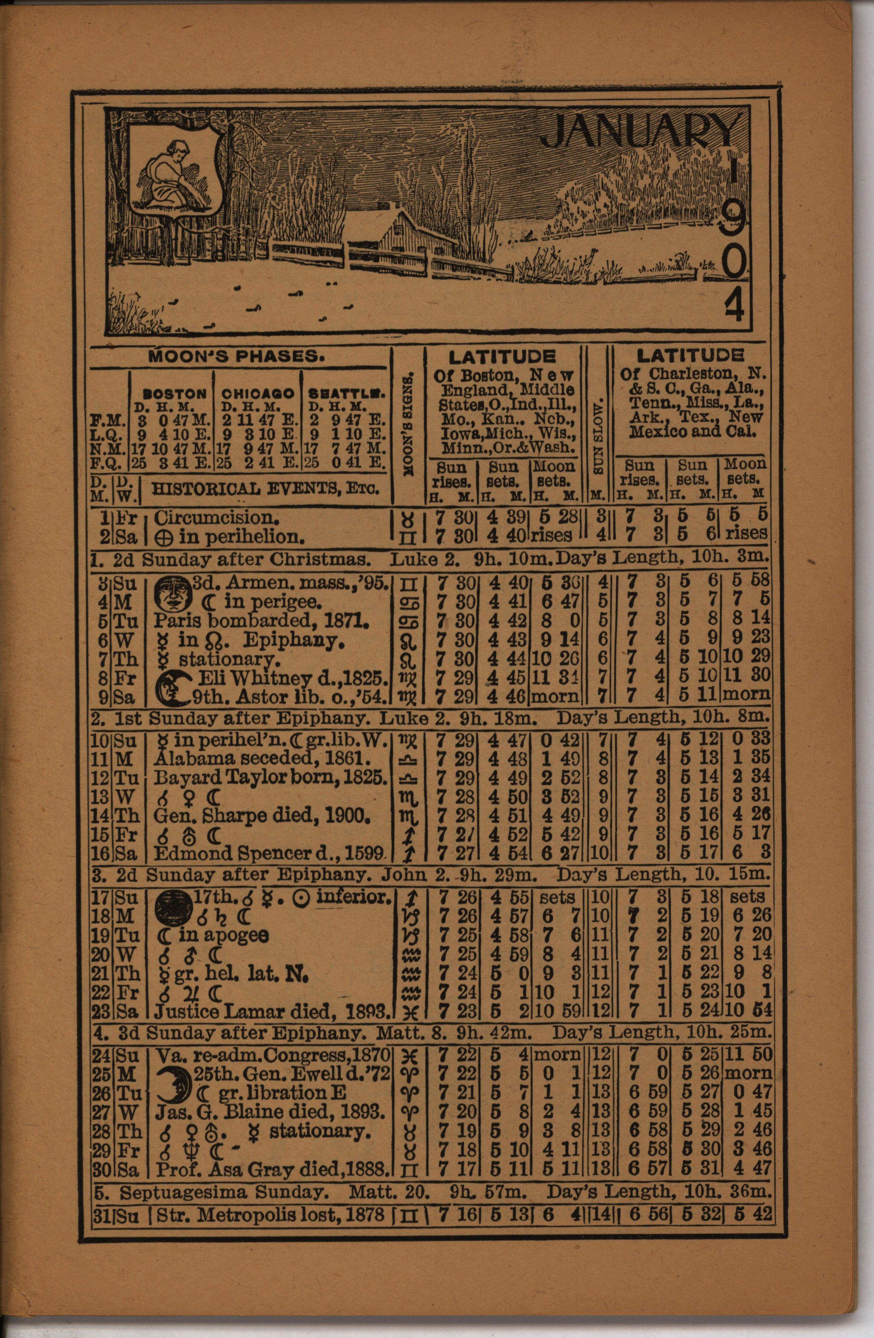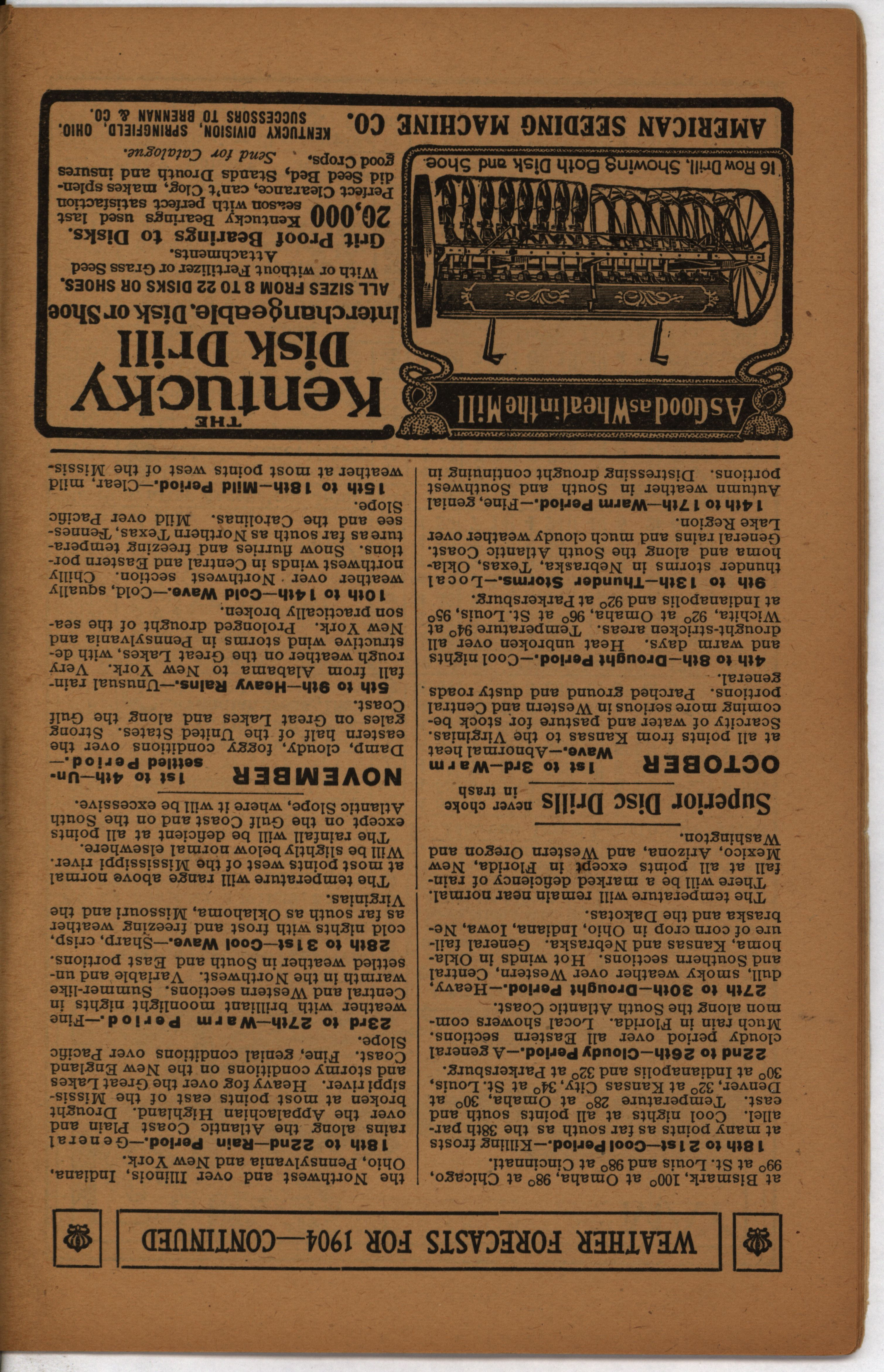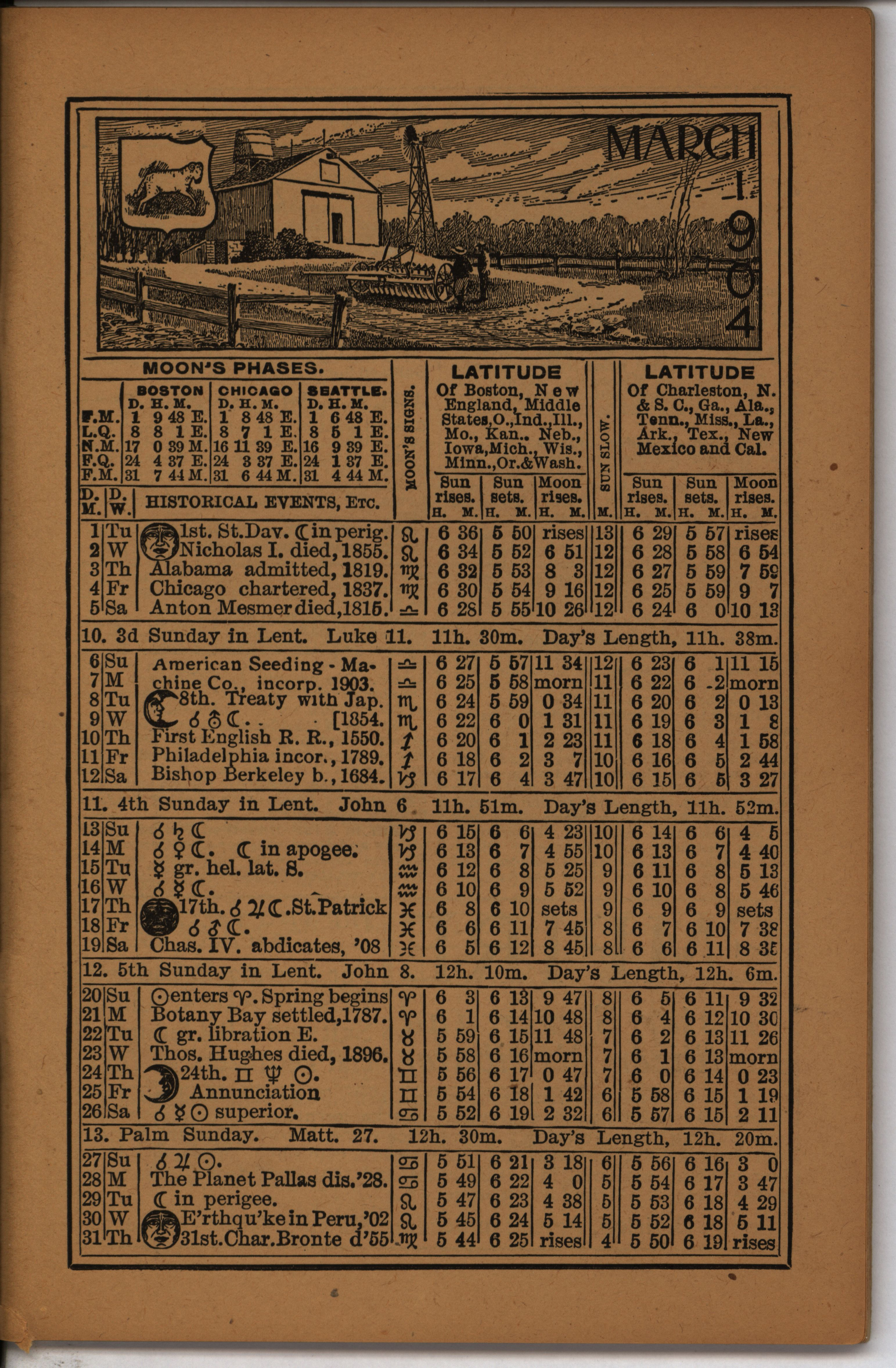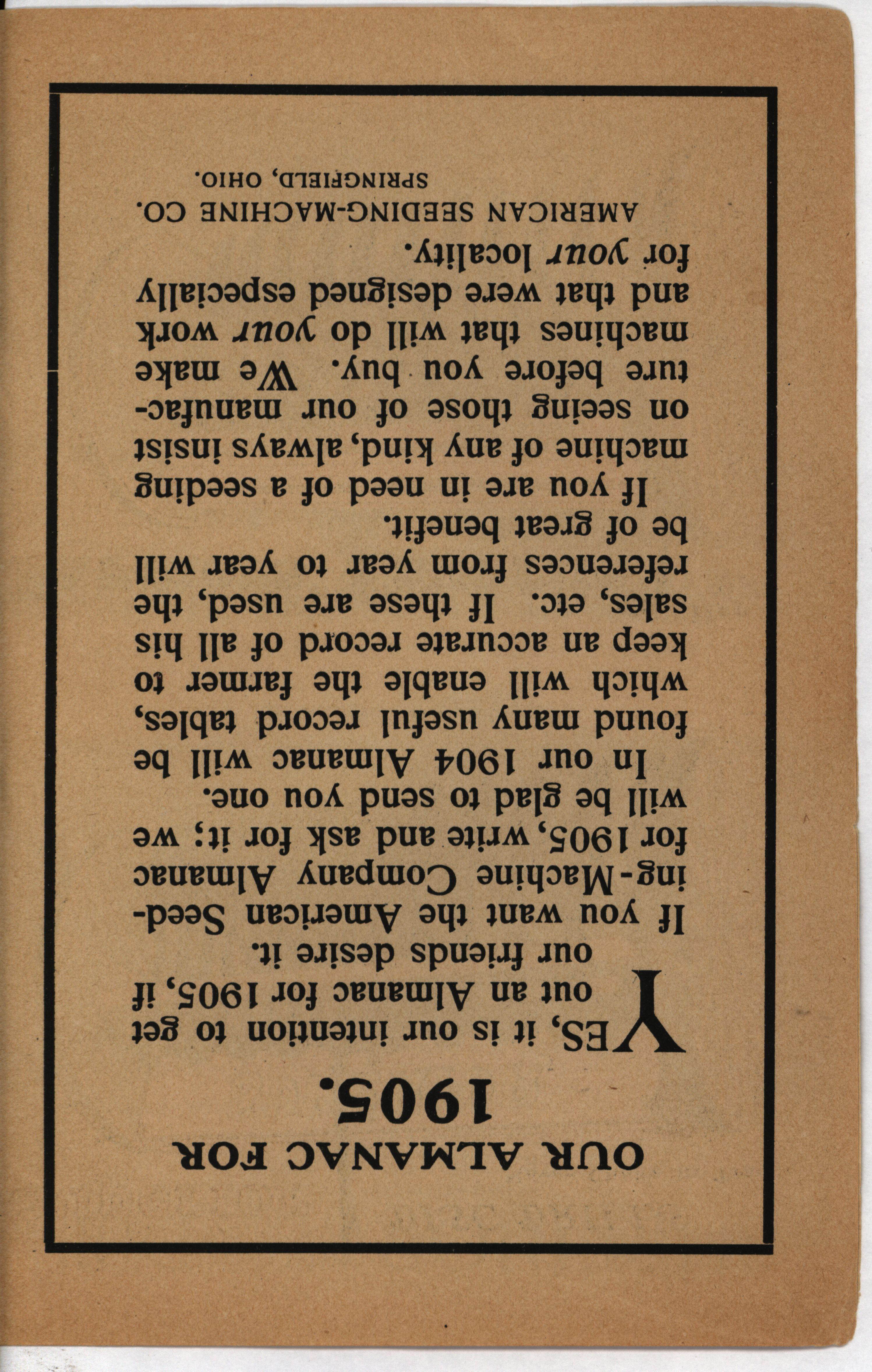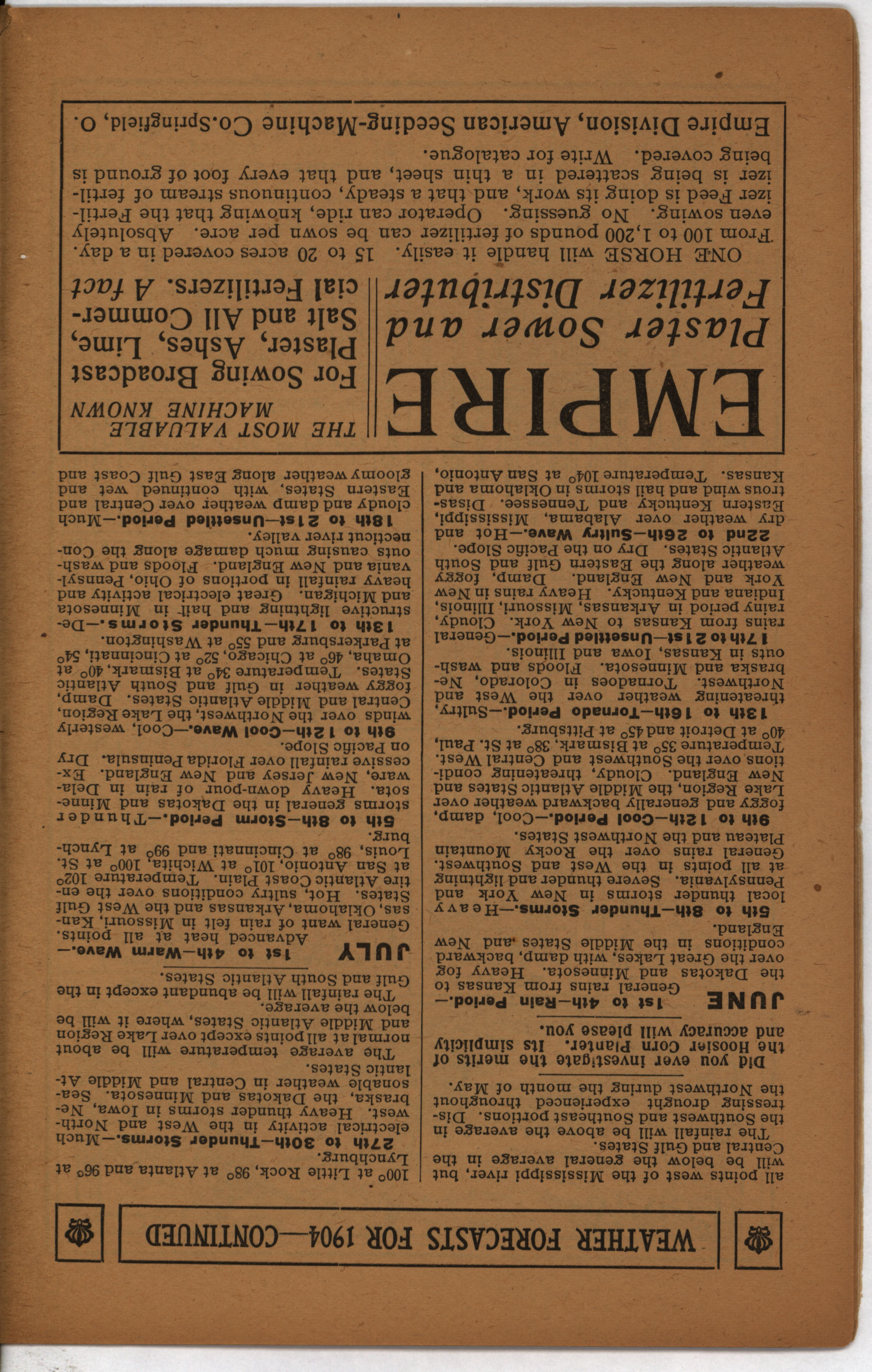 - Farmer's almanac from 1904 published by the American Seeding-Machine Company. Details seasonal information and changes for each month along with agricultural advertisements.