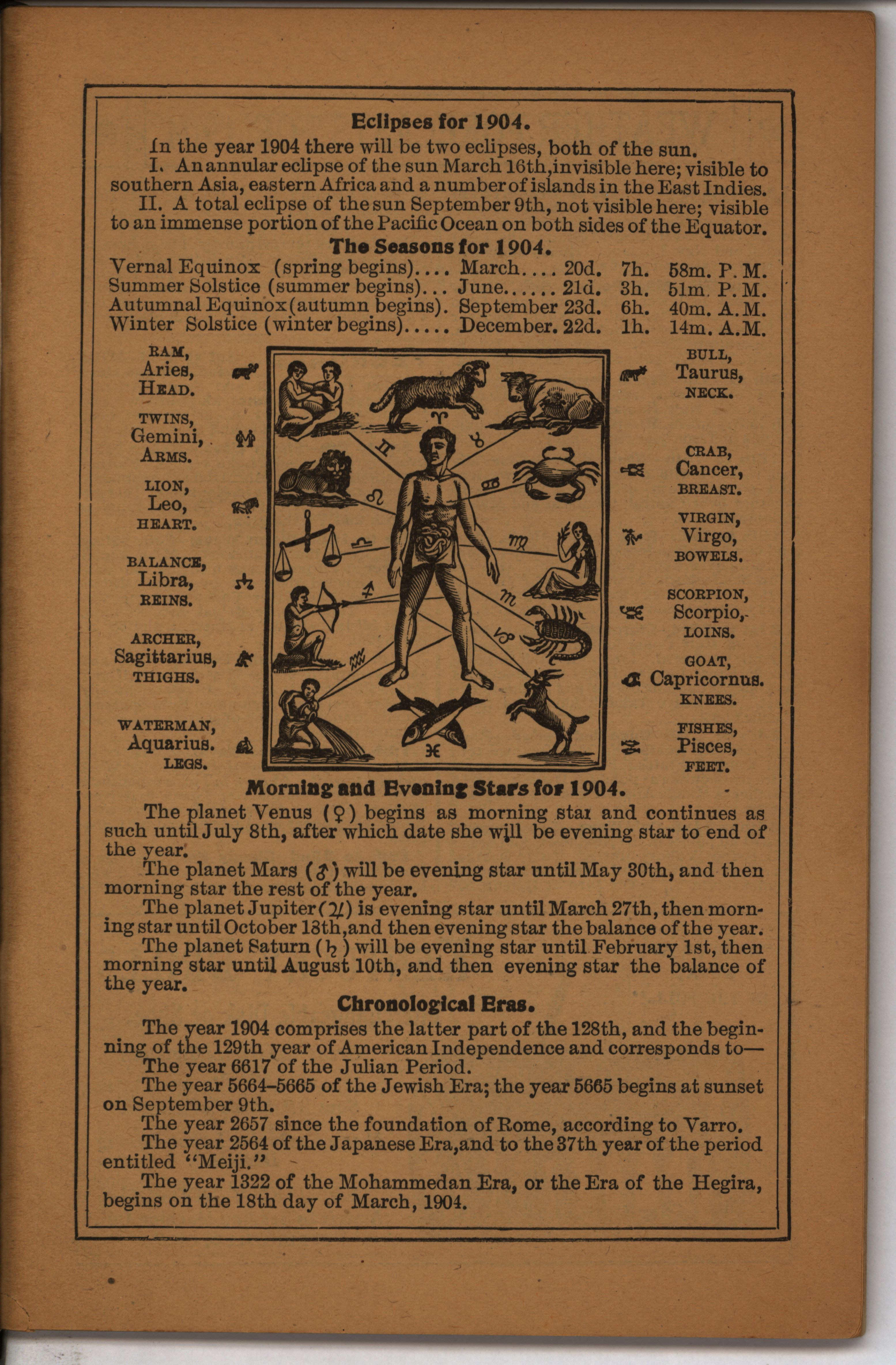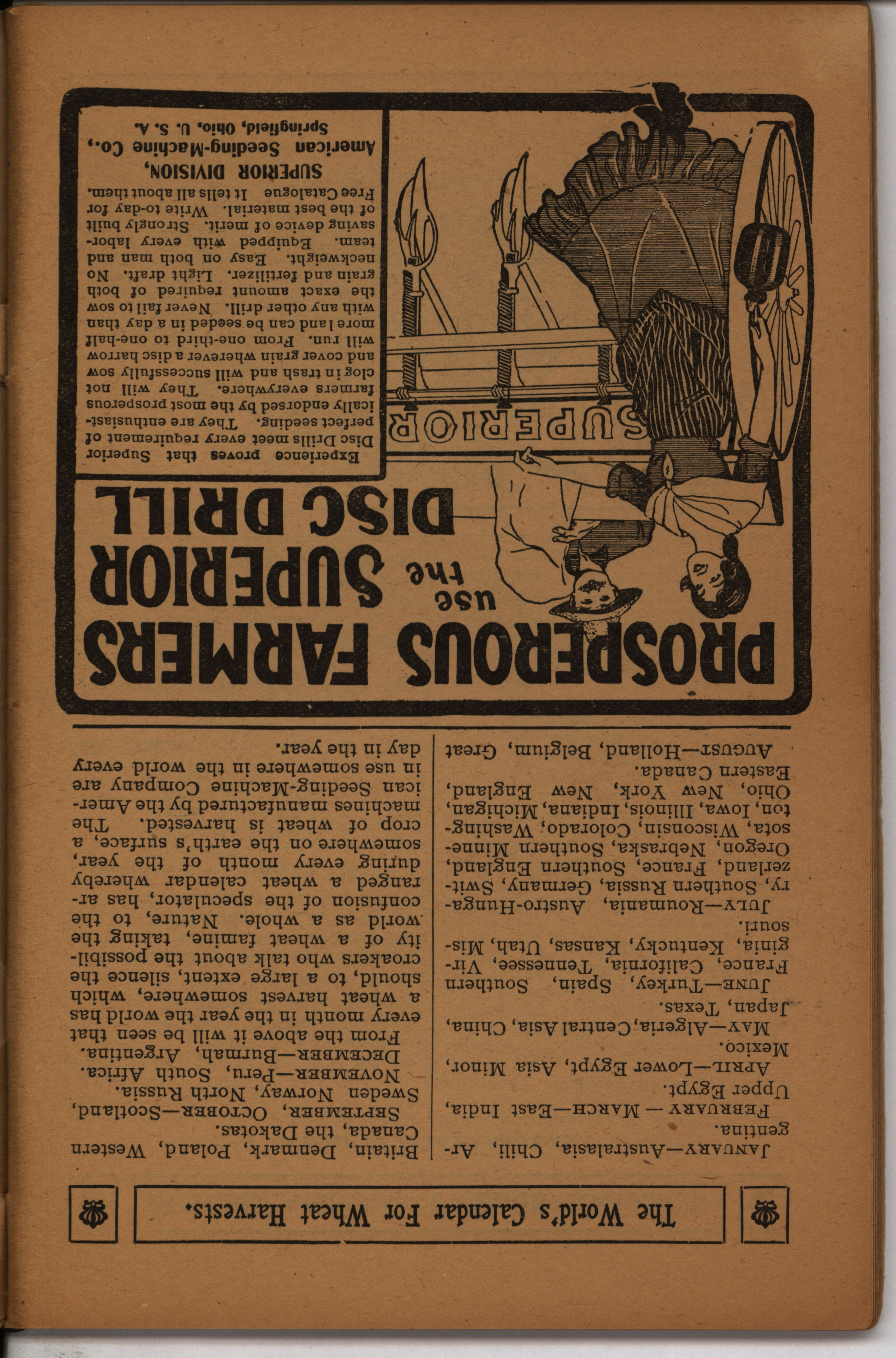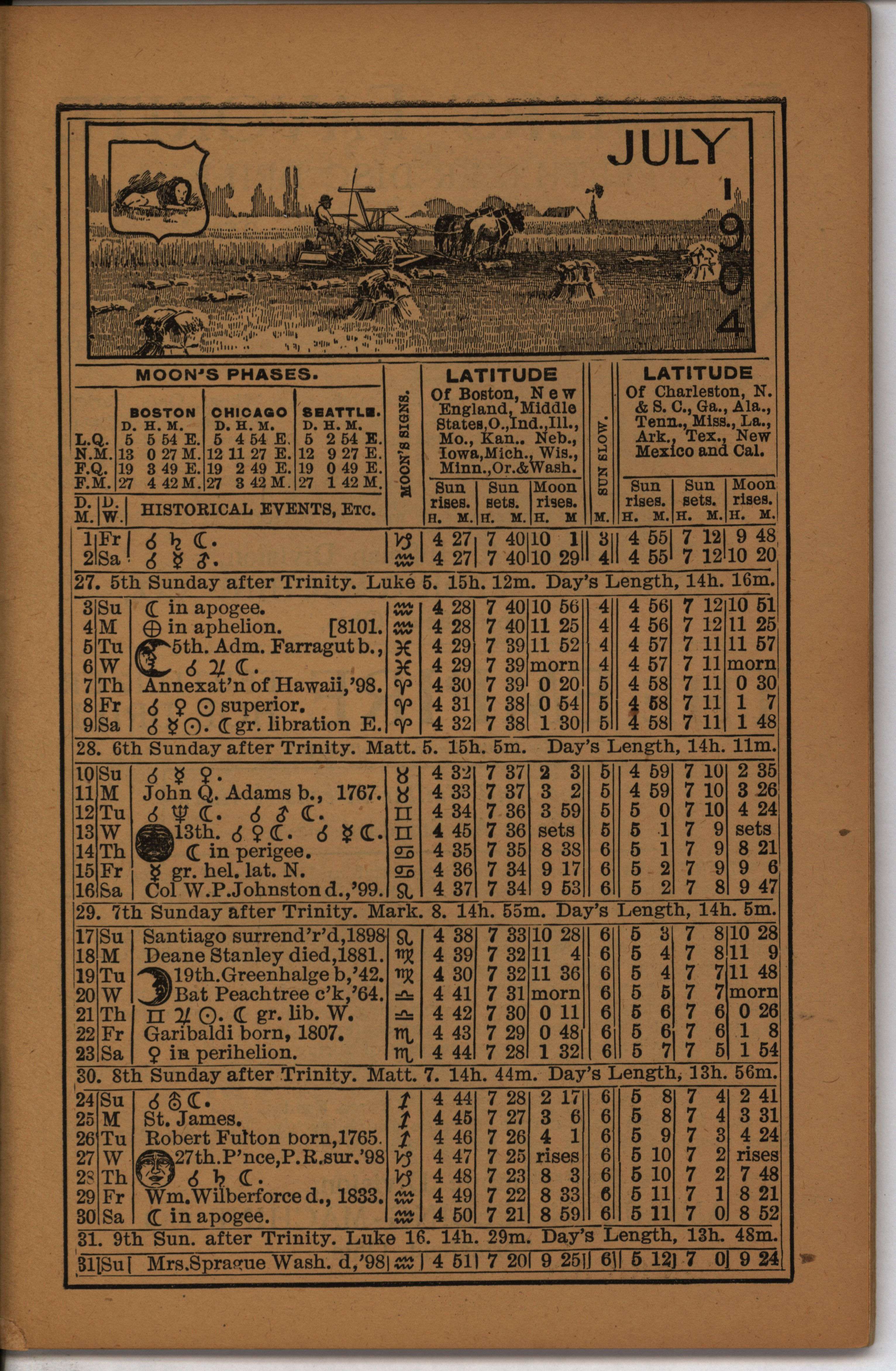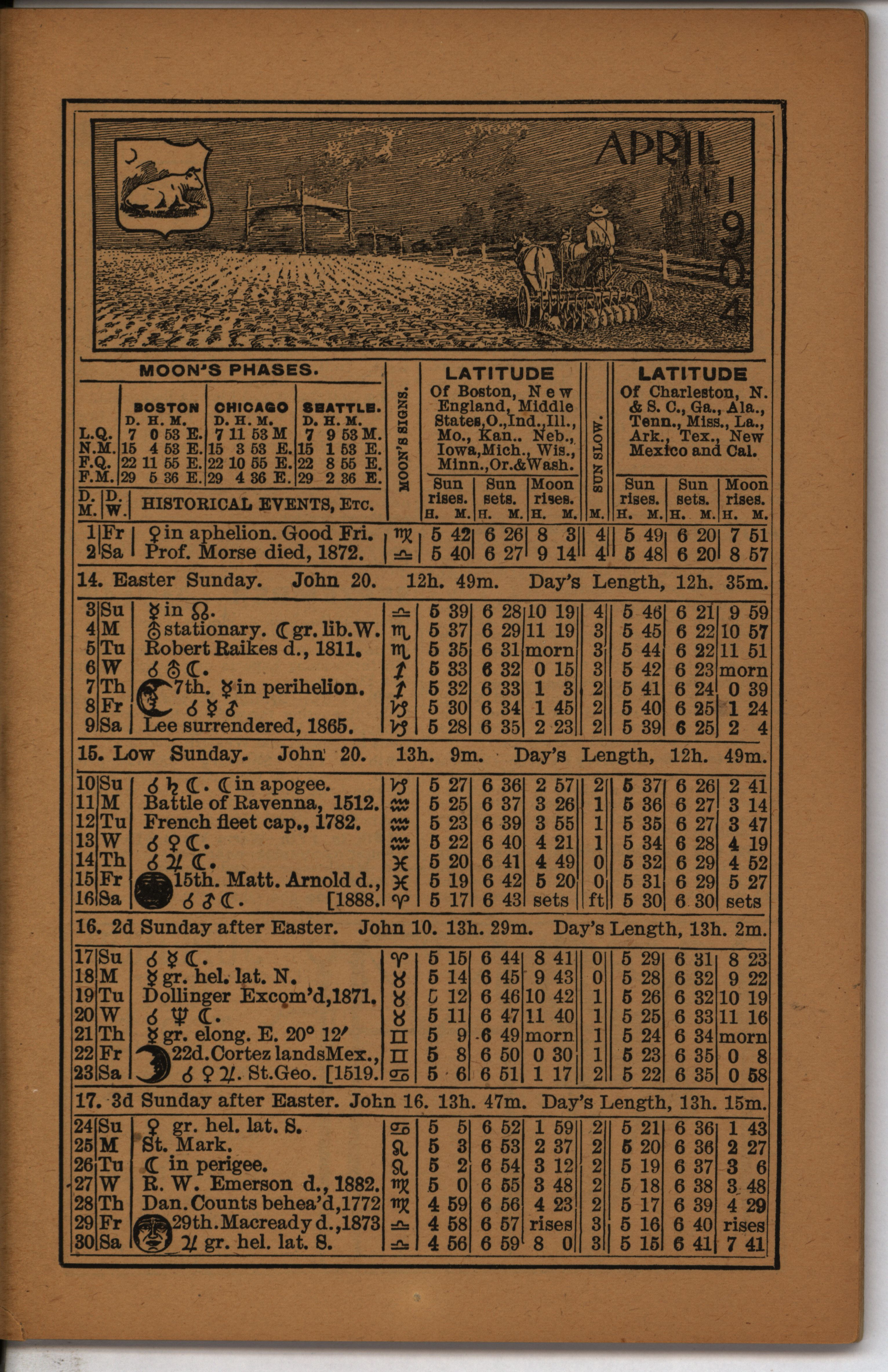 - Farmer's almanac from 1904 published by the American Seeding-Machine Company. Details seasonal information and changes for each month along with agricultural advertisements.