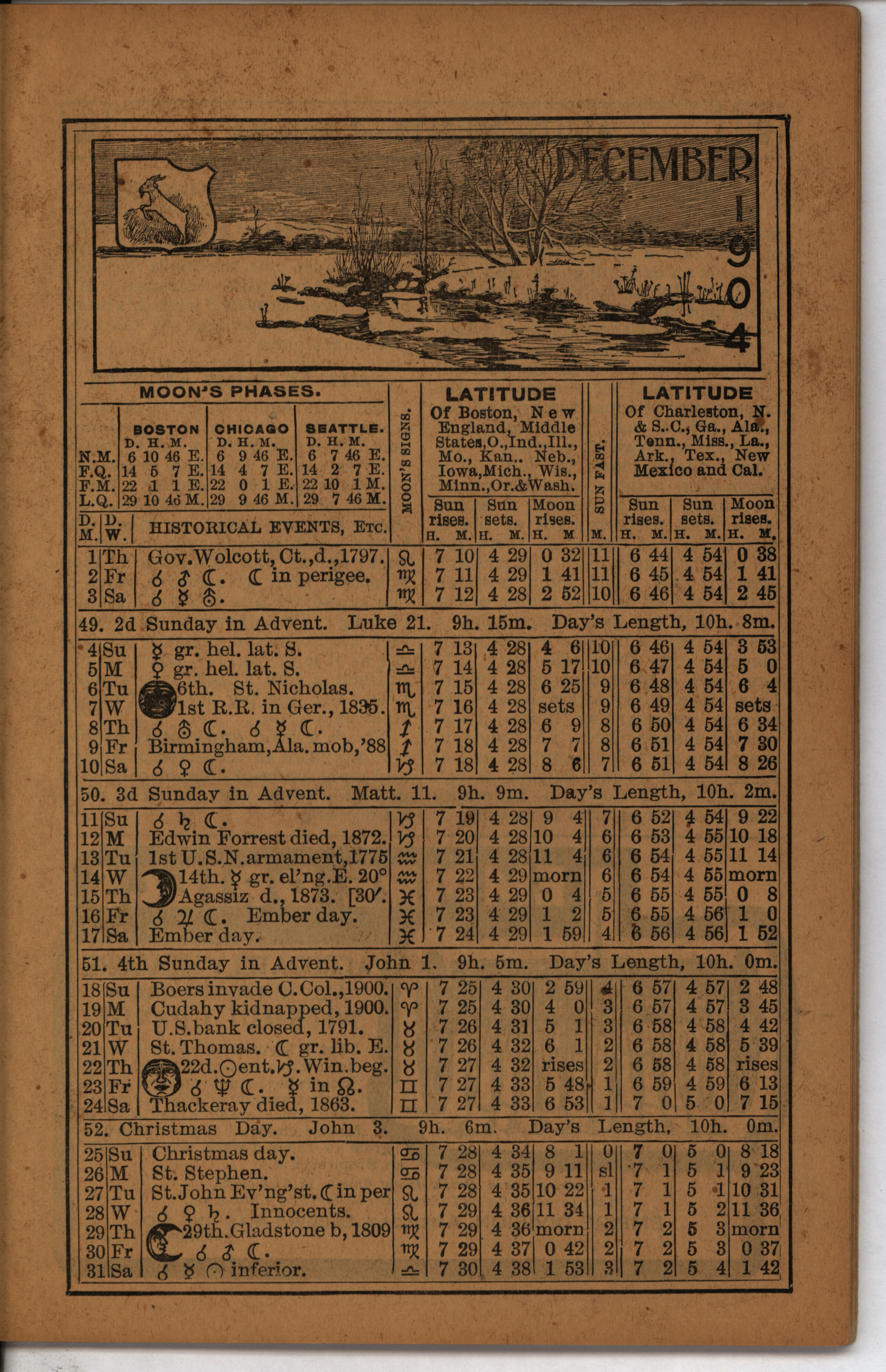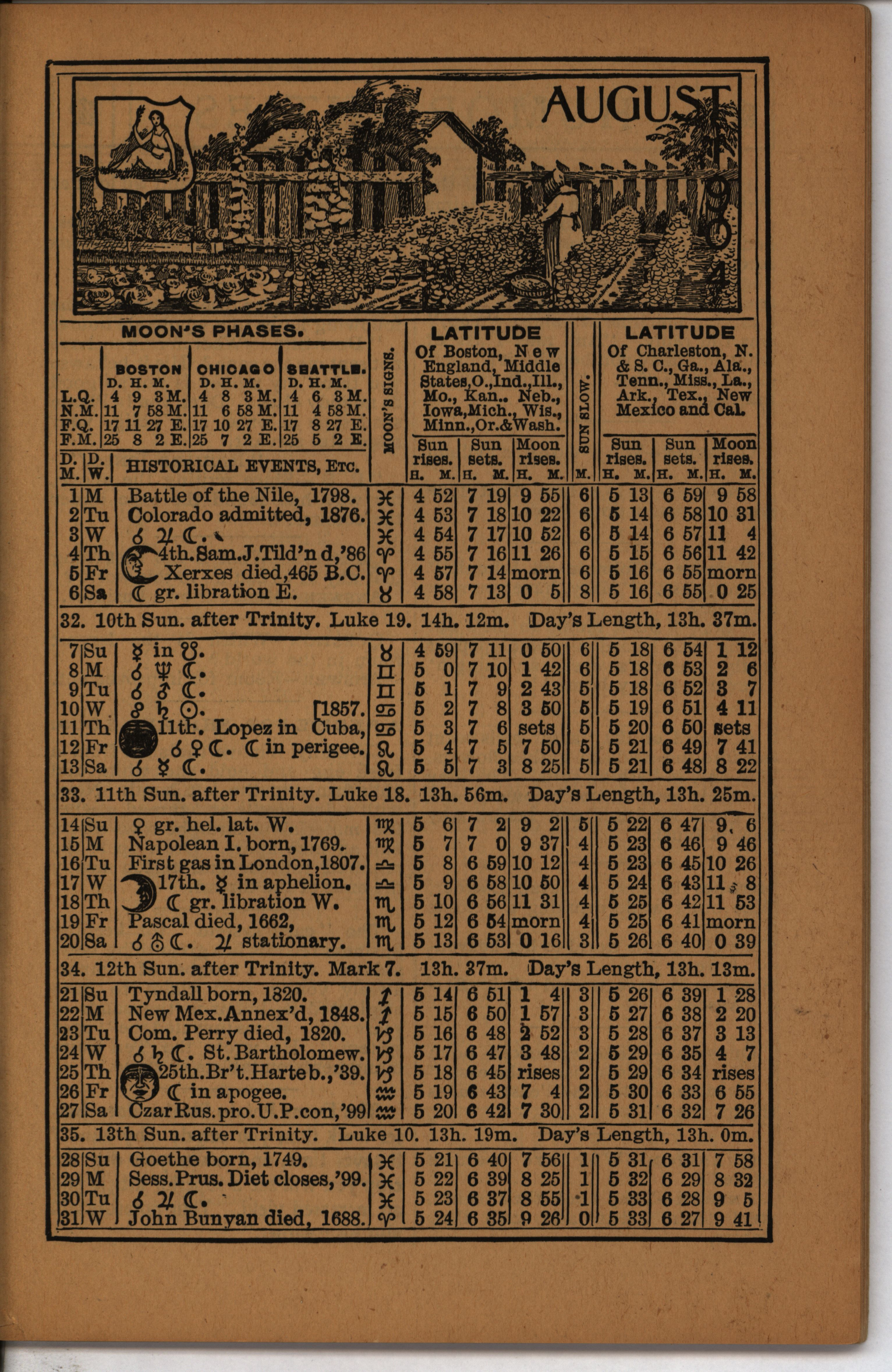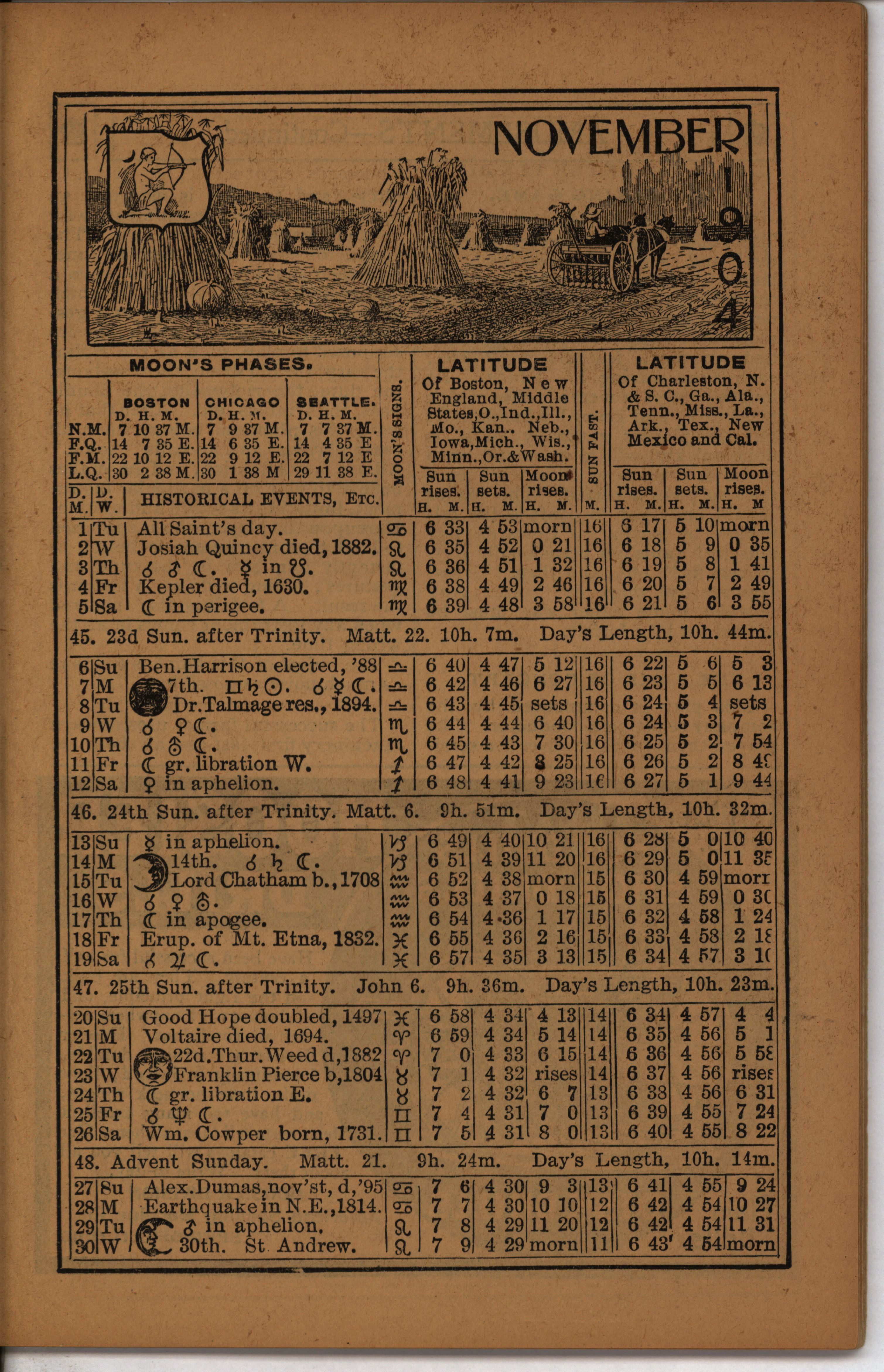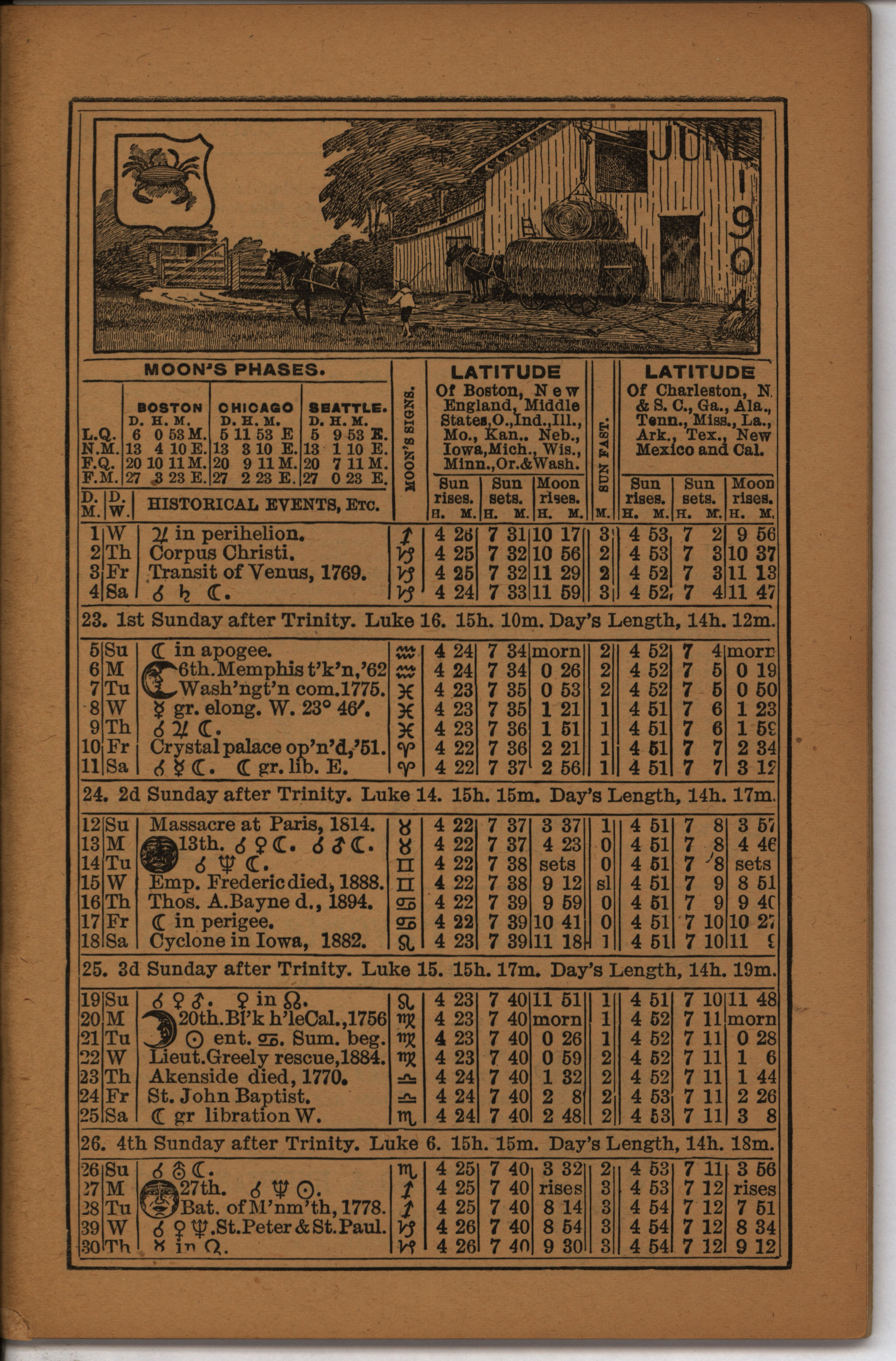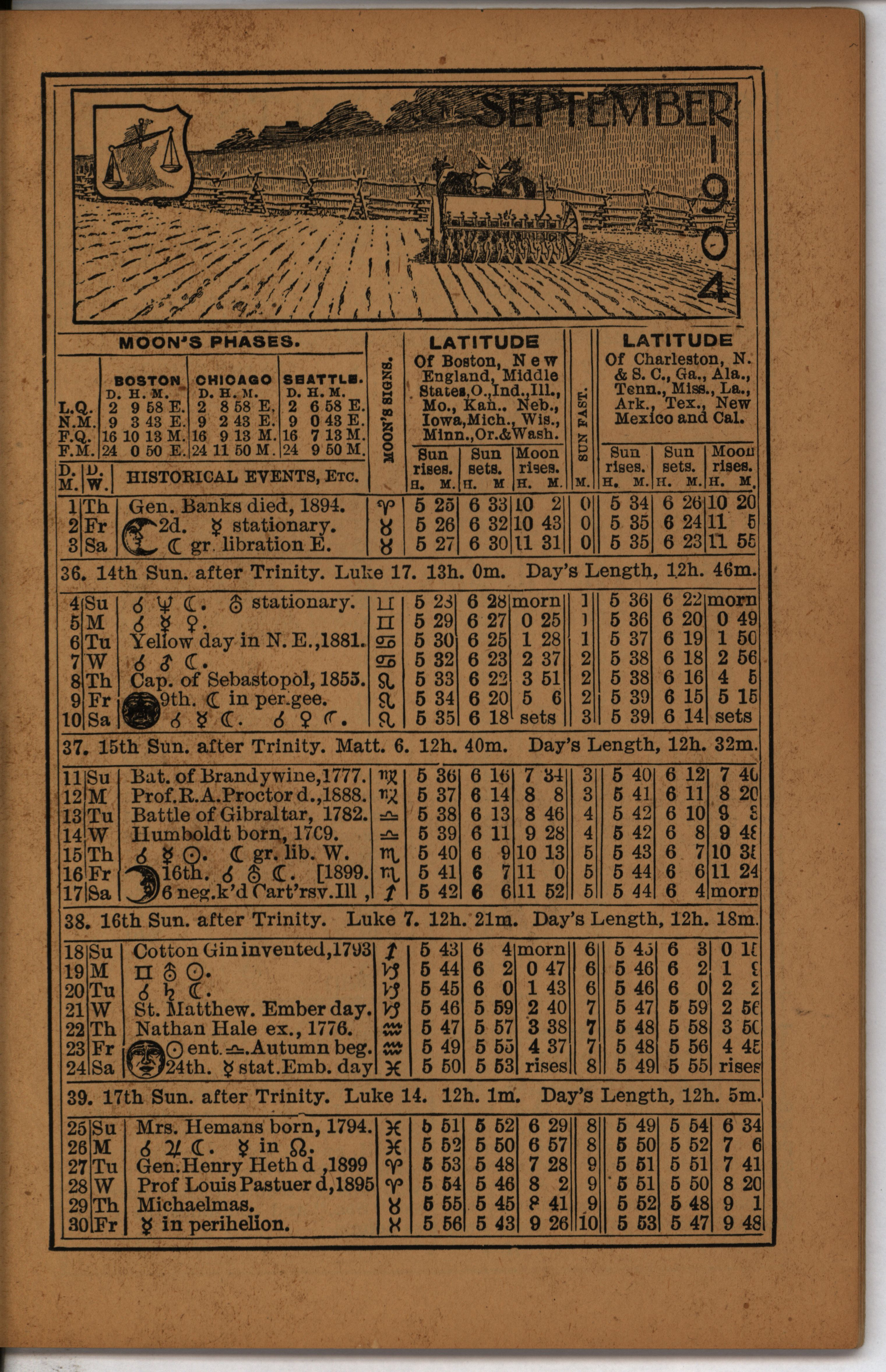 - Farmer's almanac from 1904 published by the American Seeding-Machine Company. Details seasonal information and changes for each month along with agricultural advertisements.