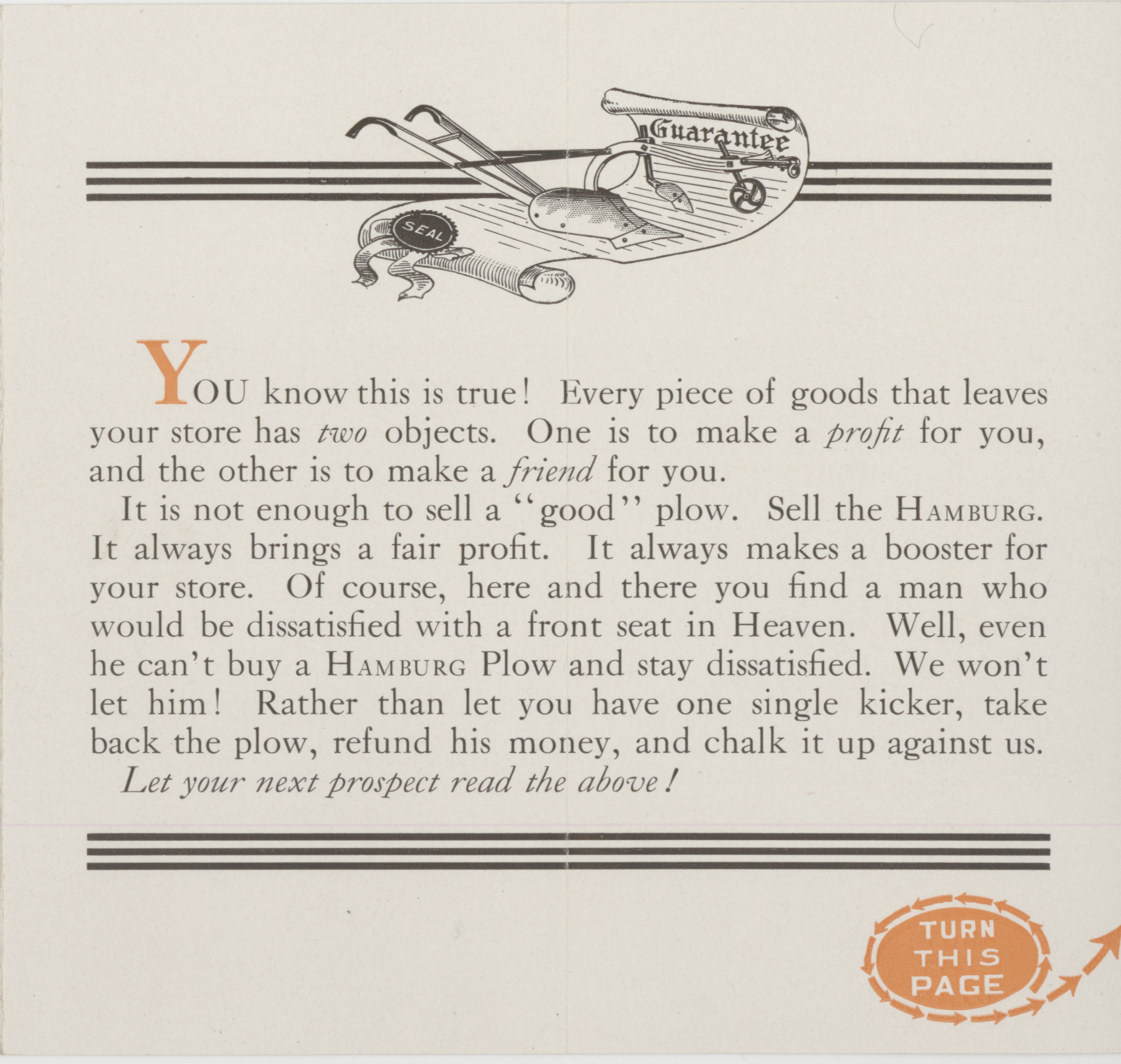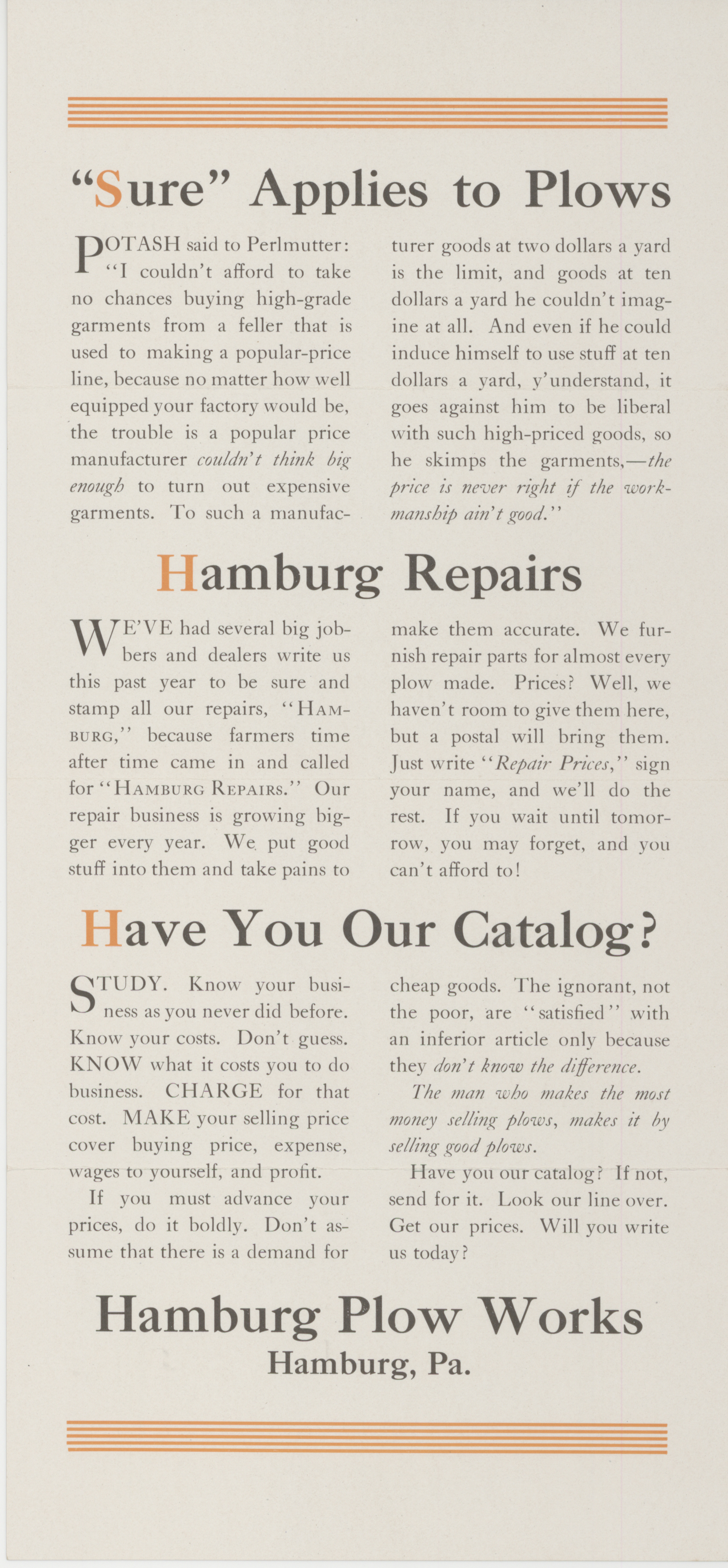 - "Hamburg Plow Works advertisement pamphlet", Agricultural Machinery Literature Collection, Iowa State University Library Digital Collections