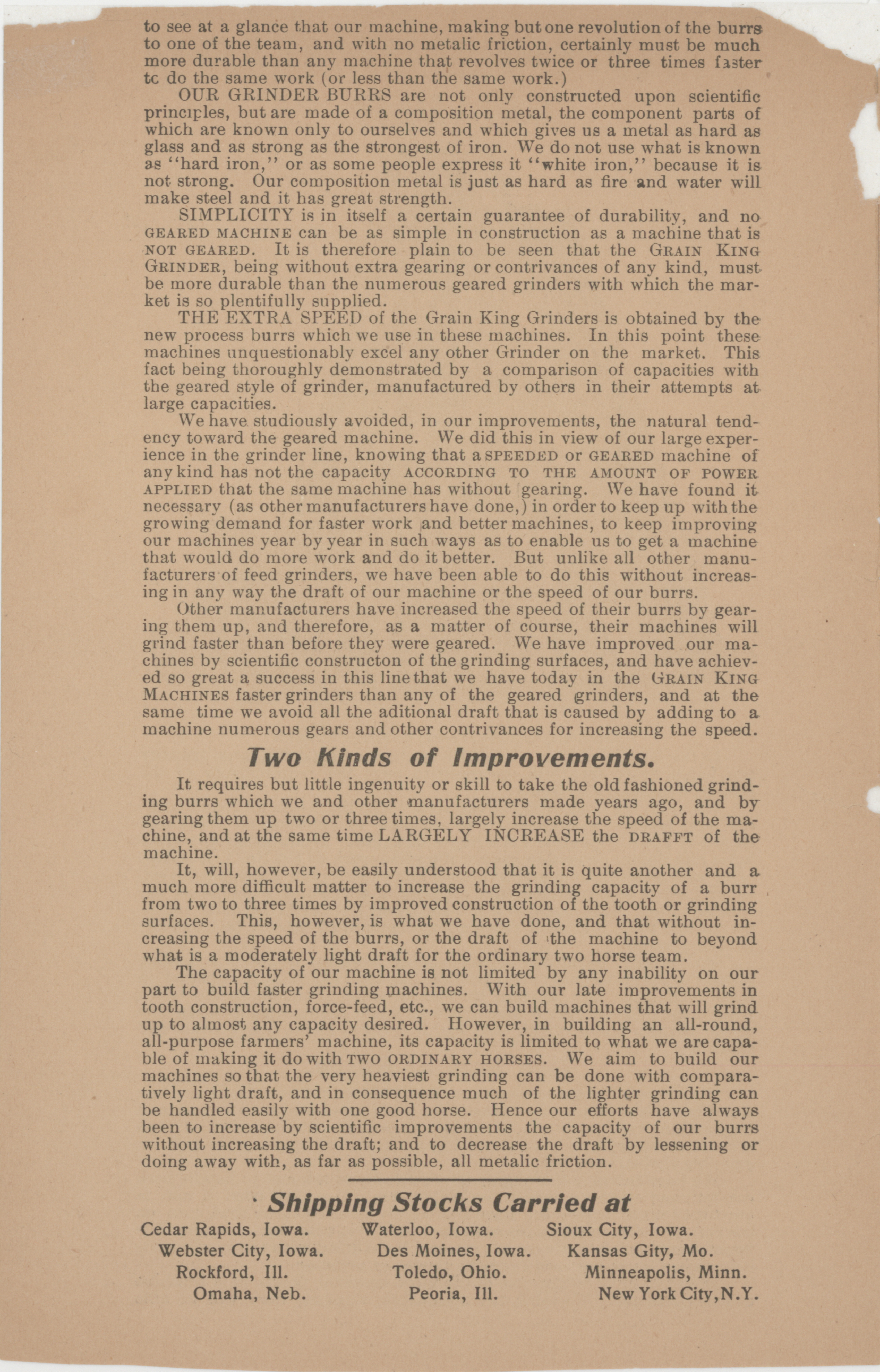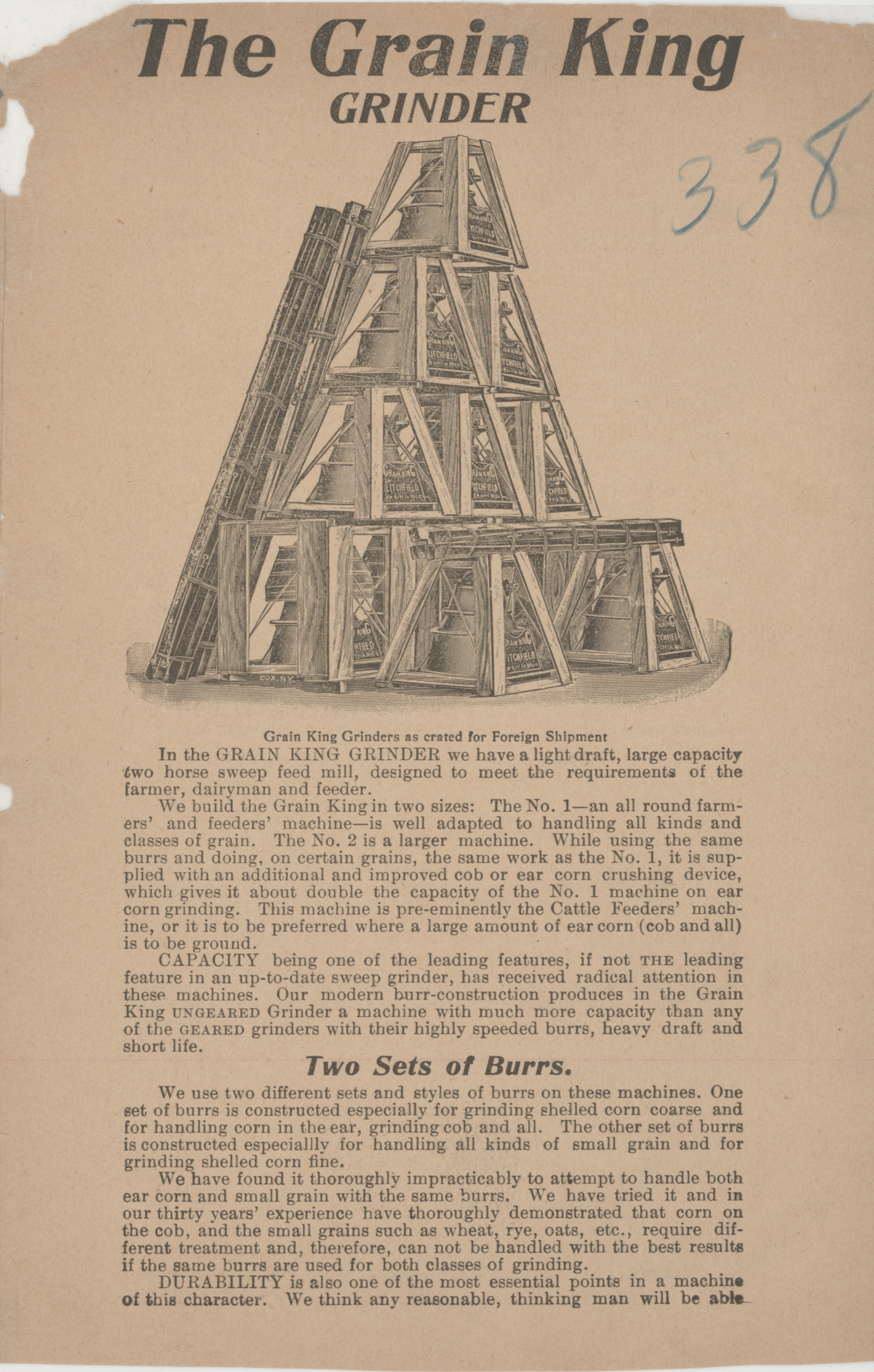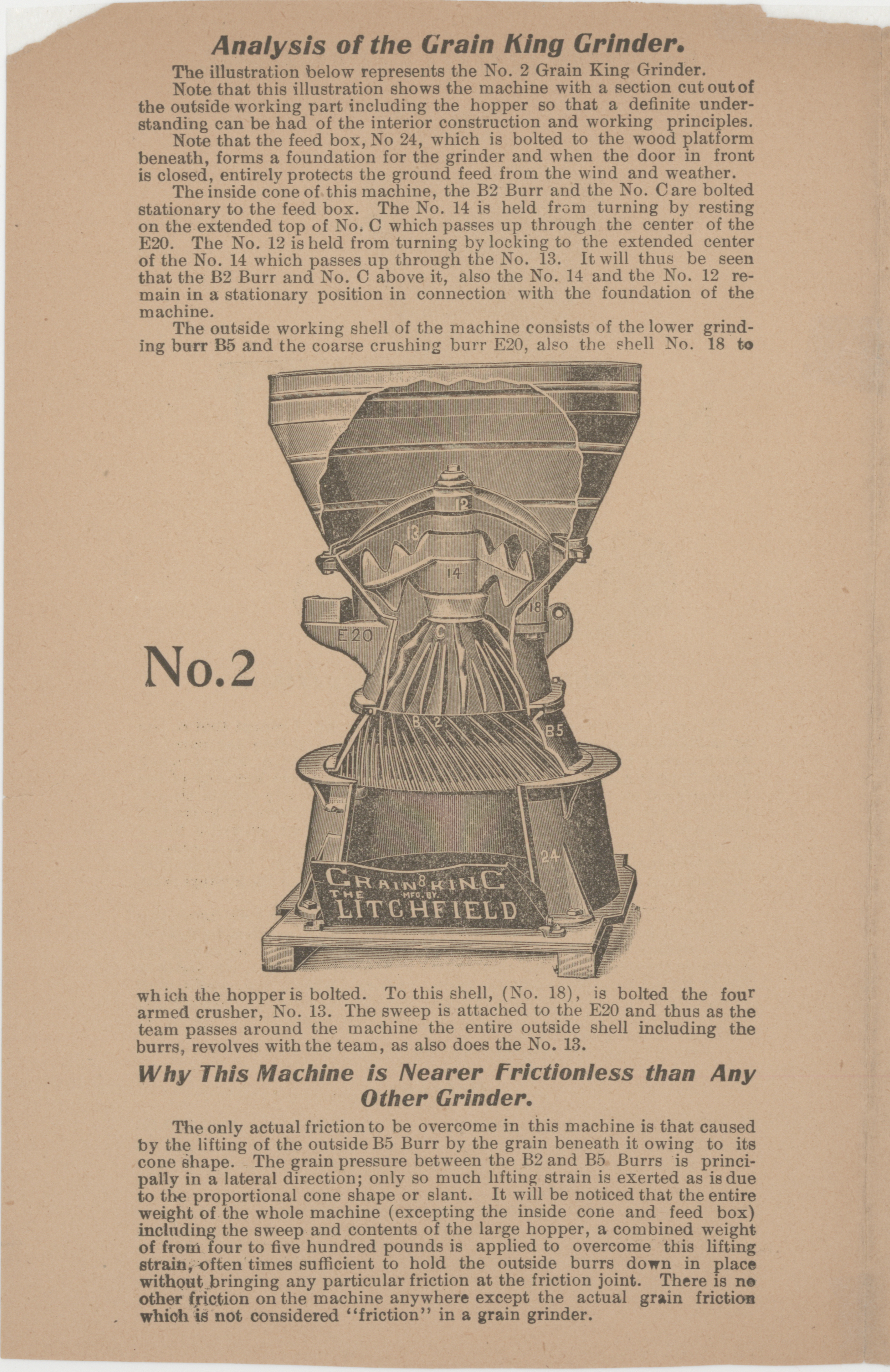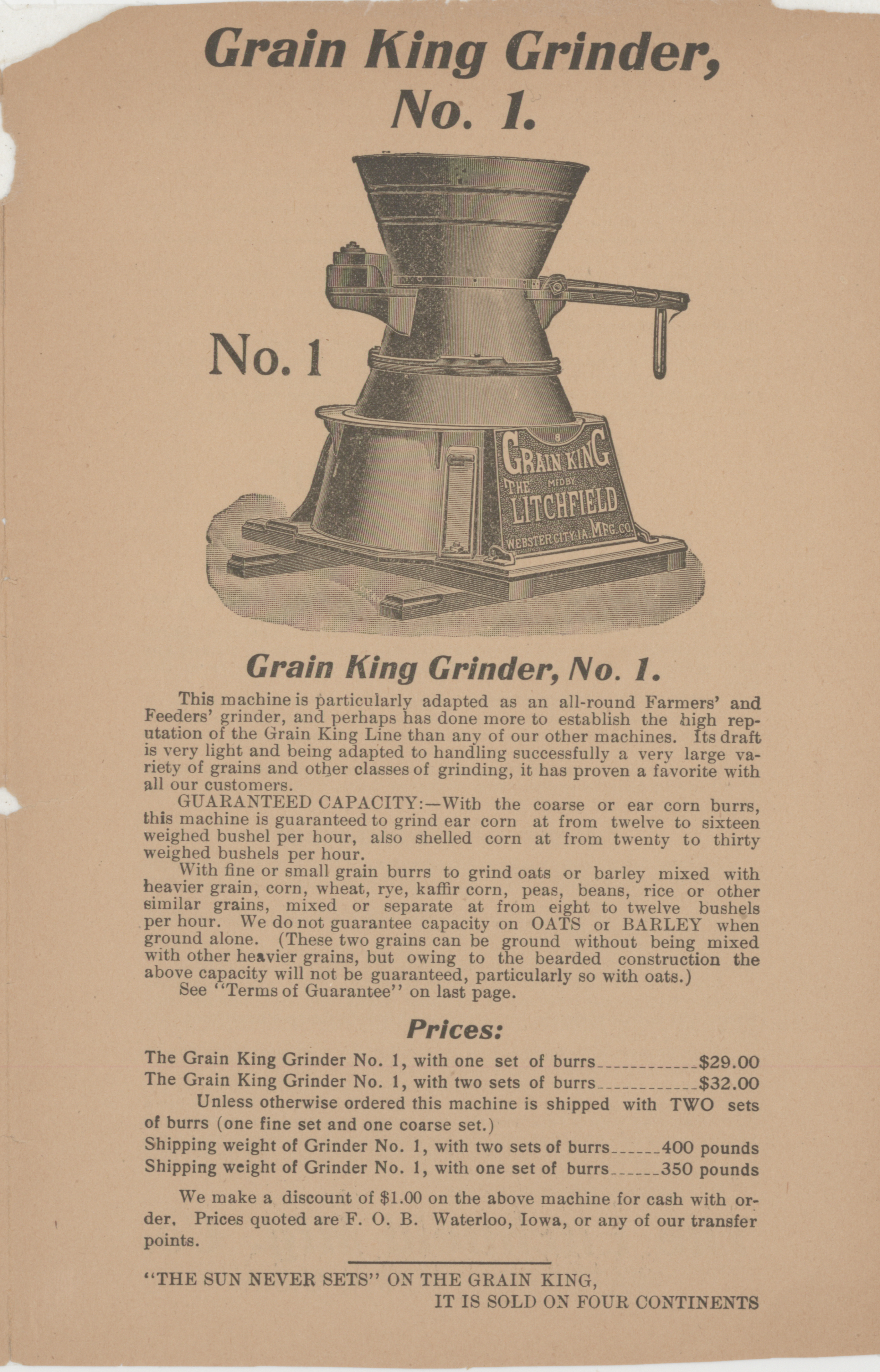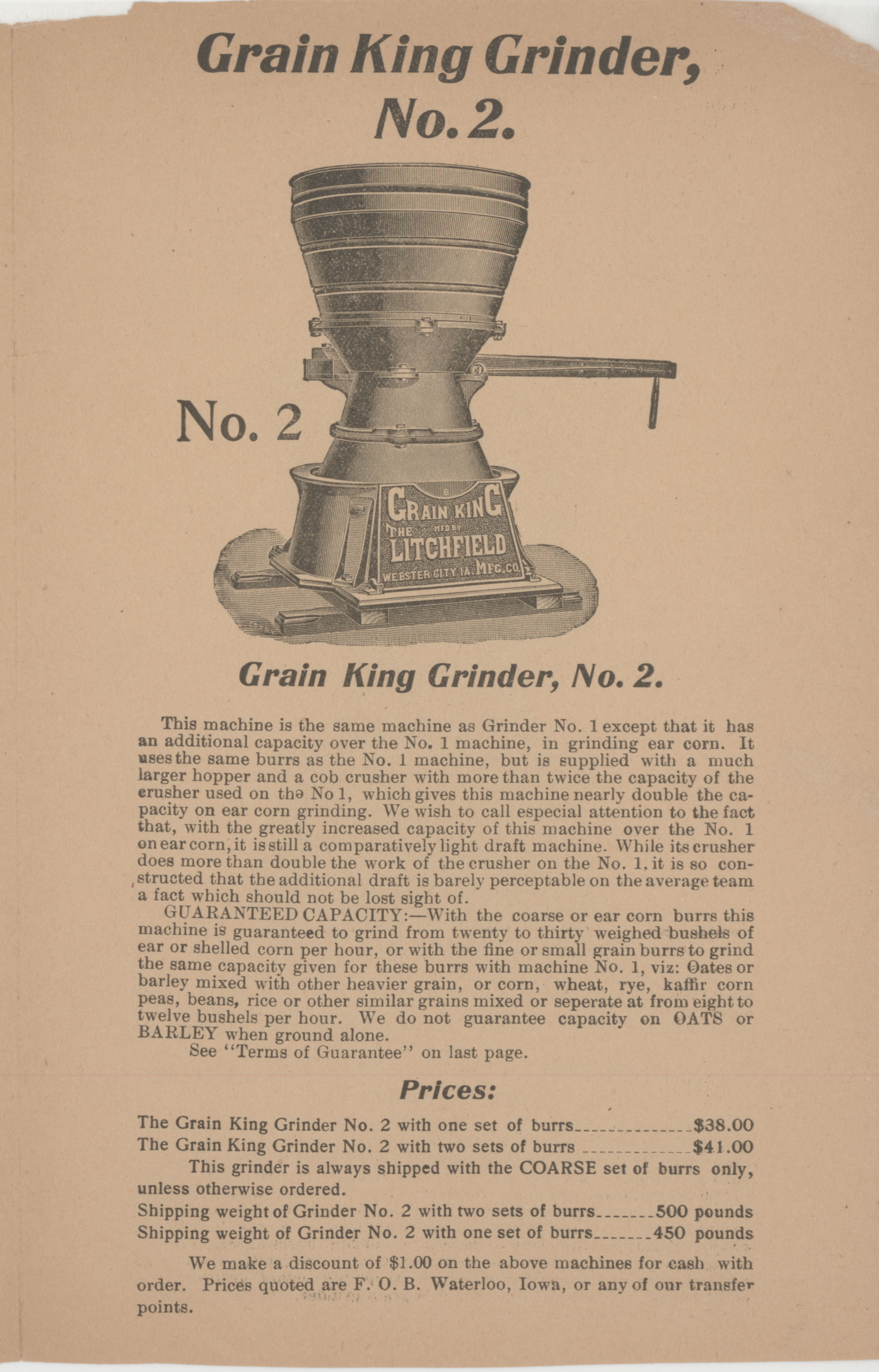 - "Litchfield Manufacturing Company Grain King Grinder catalog", Agricultural Machinery Literature Collection, Iowa State University Library Digital Collections