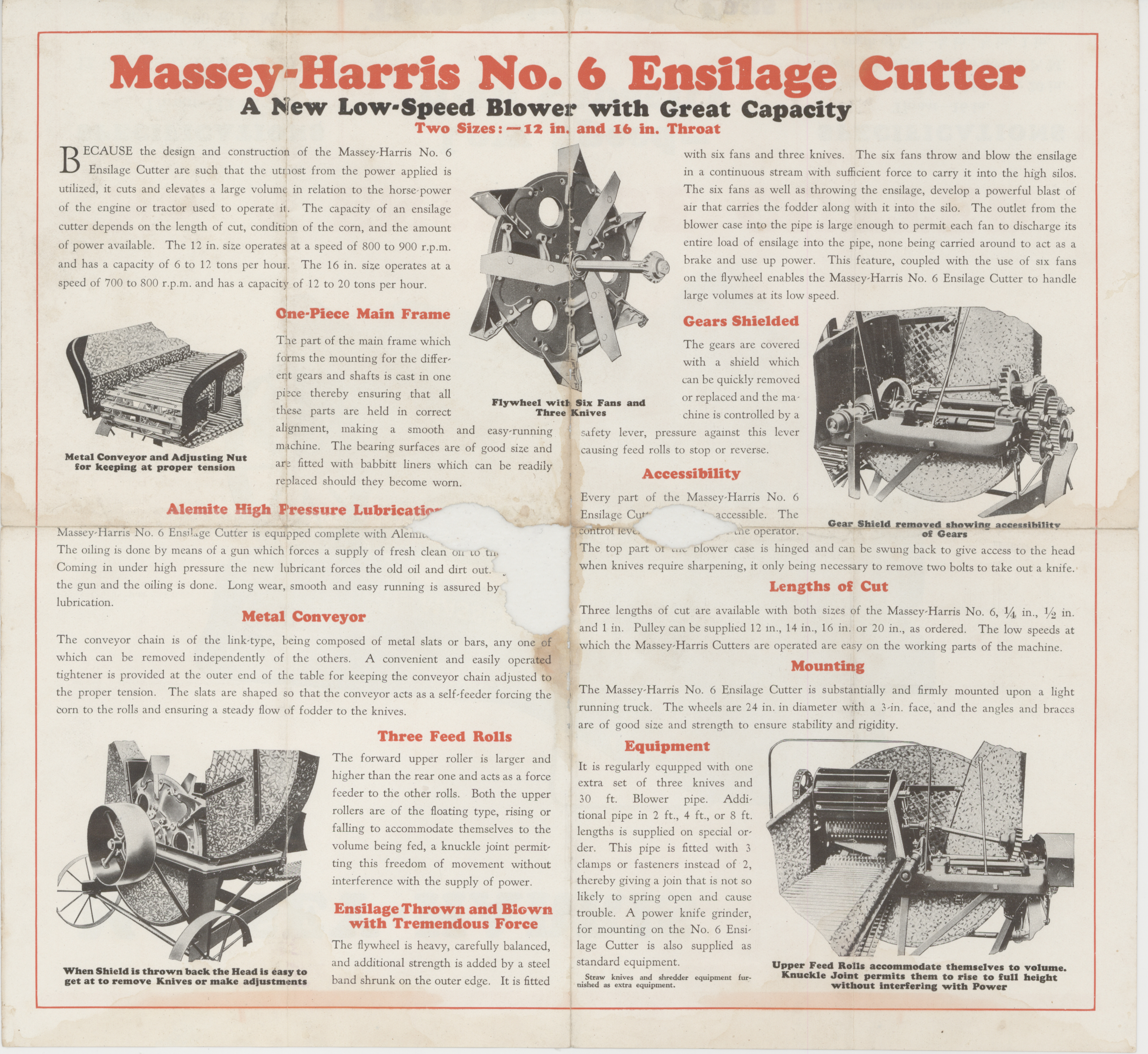 - "Massey-Harris Harvester Company No. 6 Ensilage Cutter advertisement", Agricultural Machinery Literature Collection, Iowa State University Library Digital Collections