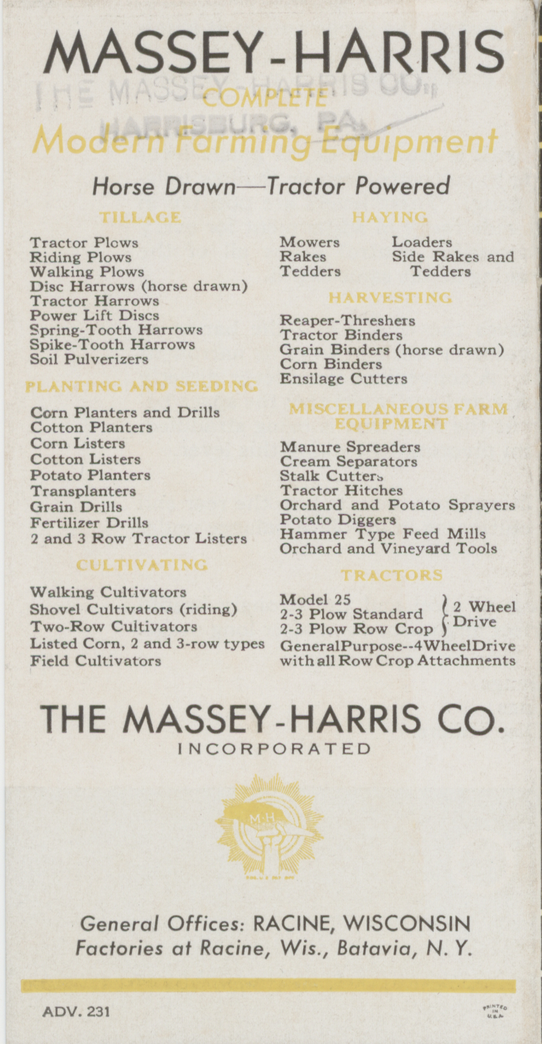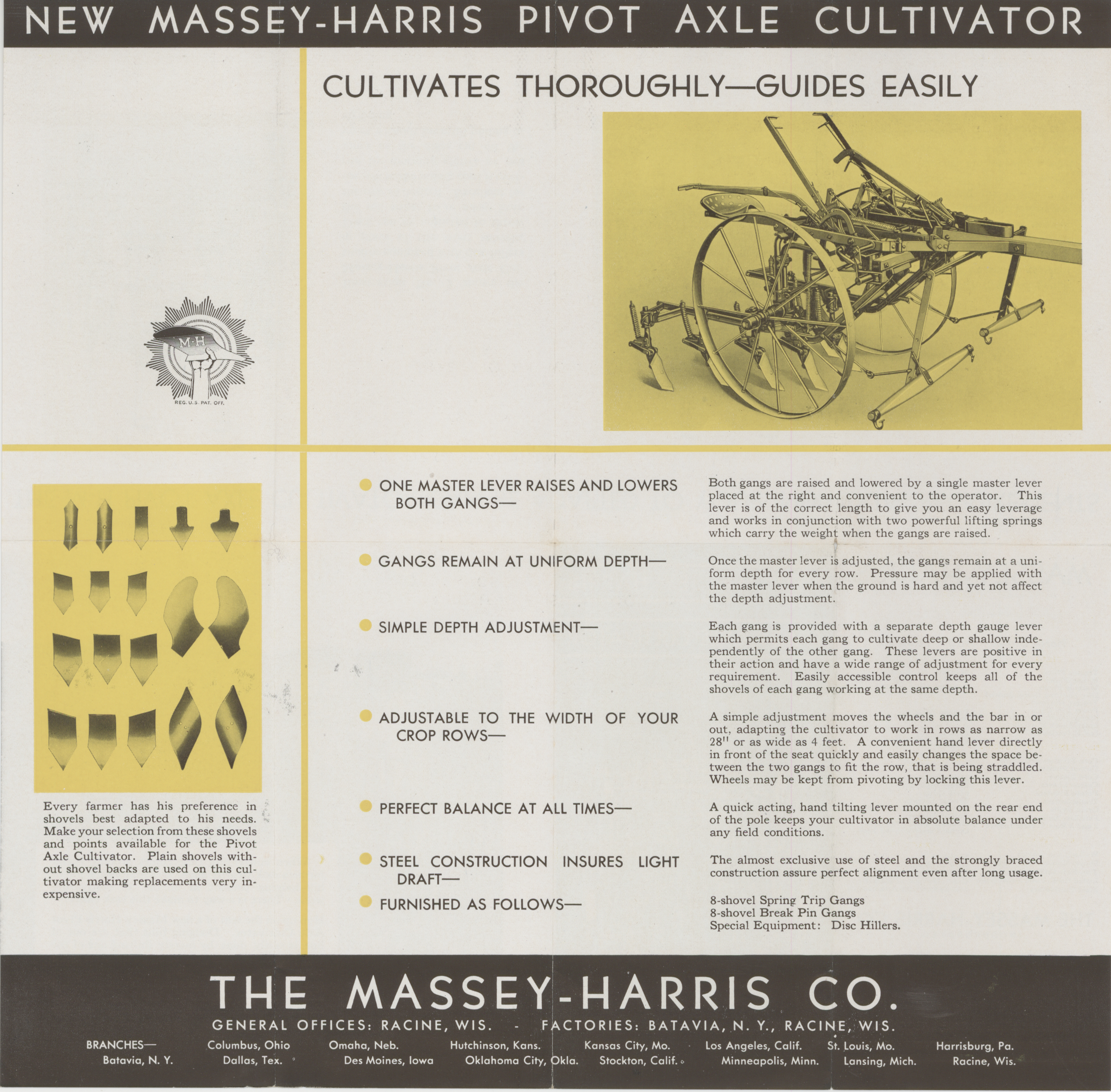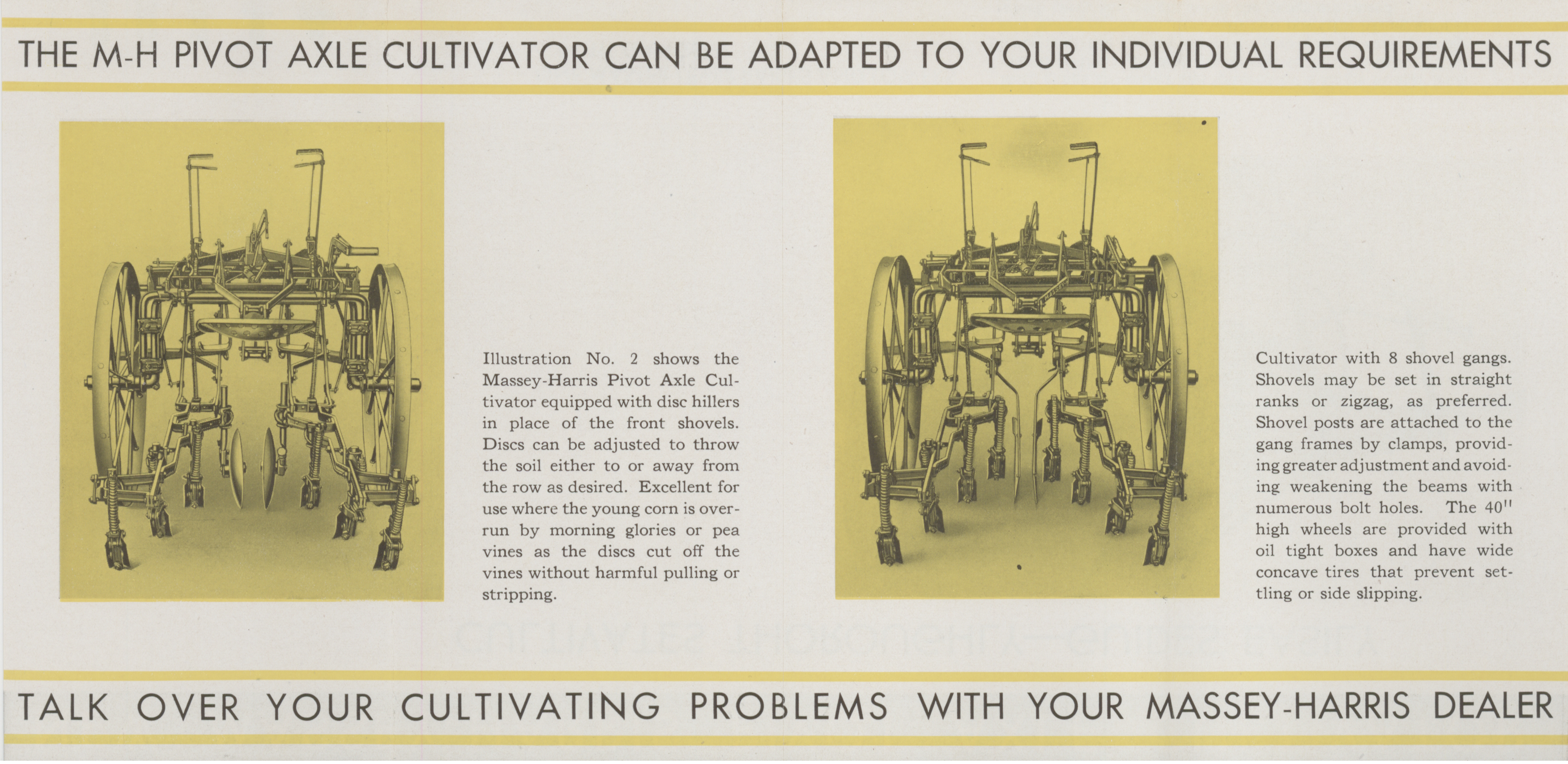 - "Massey-Harris Pivot Axle Cultivator advertisement pamphlet", Agricultural Machinery Literature Collection, Iowa State University Library Digital Collections