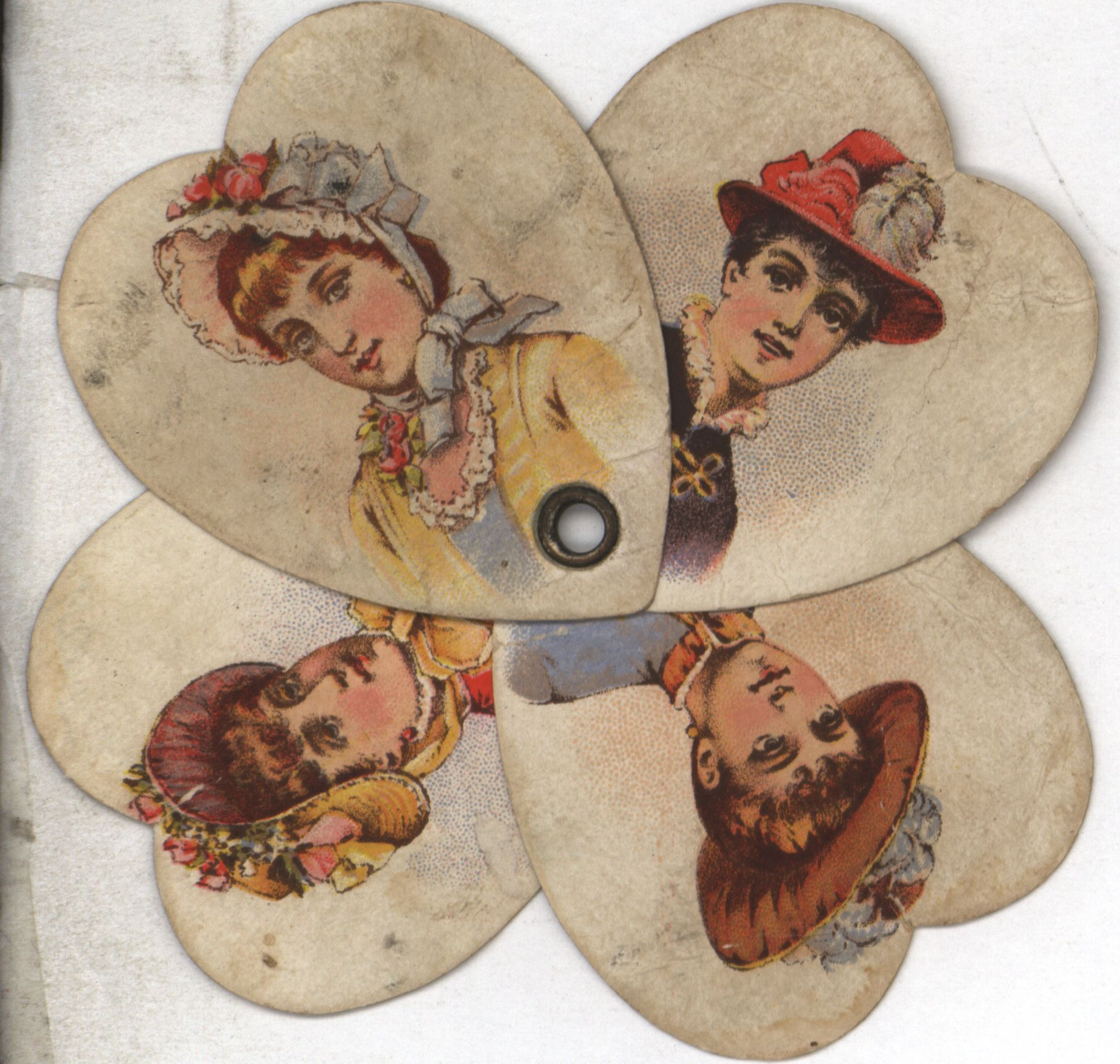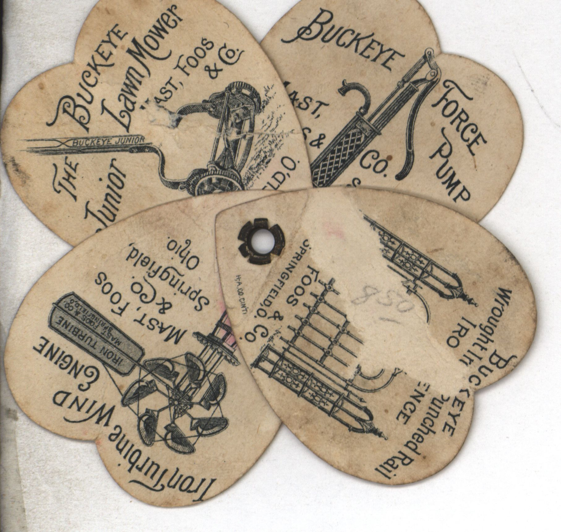 - Illustrated advertisement cards in the shape of hearts for Buckeye Agricultural Works.