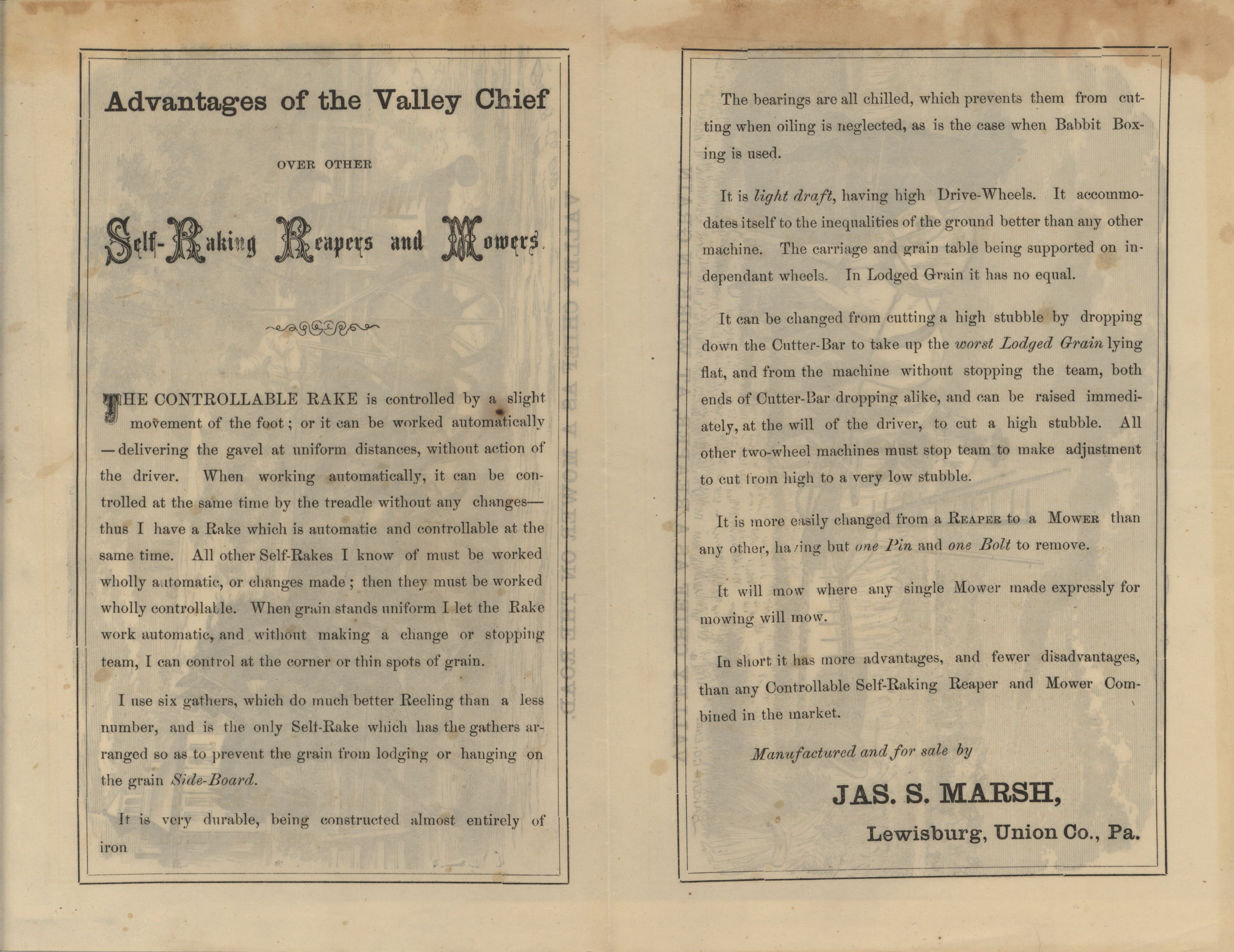 - "Jas. S. Marsh Valley Chief Reapers and Mowers advertisement pamphlet", Agricultural Machinery Literature Collection, Iowa State University Library Digital Collections