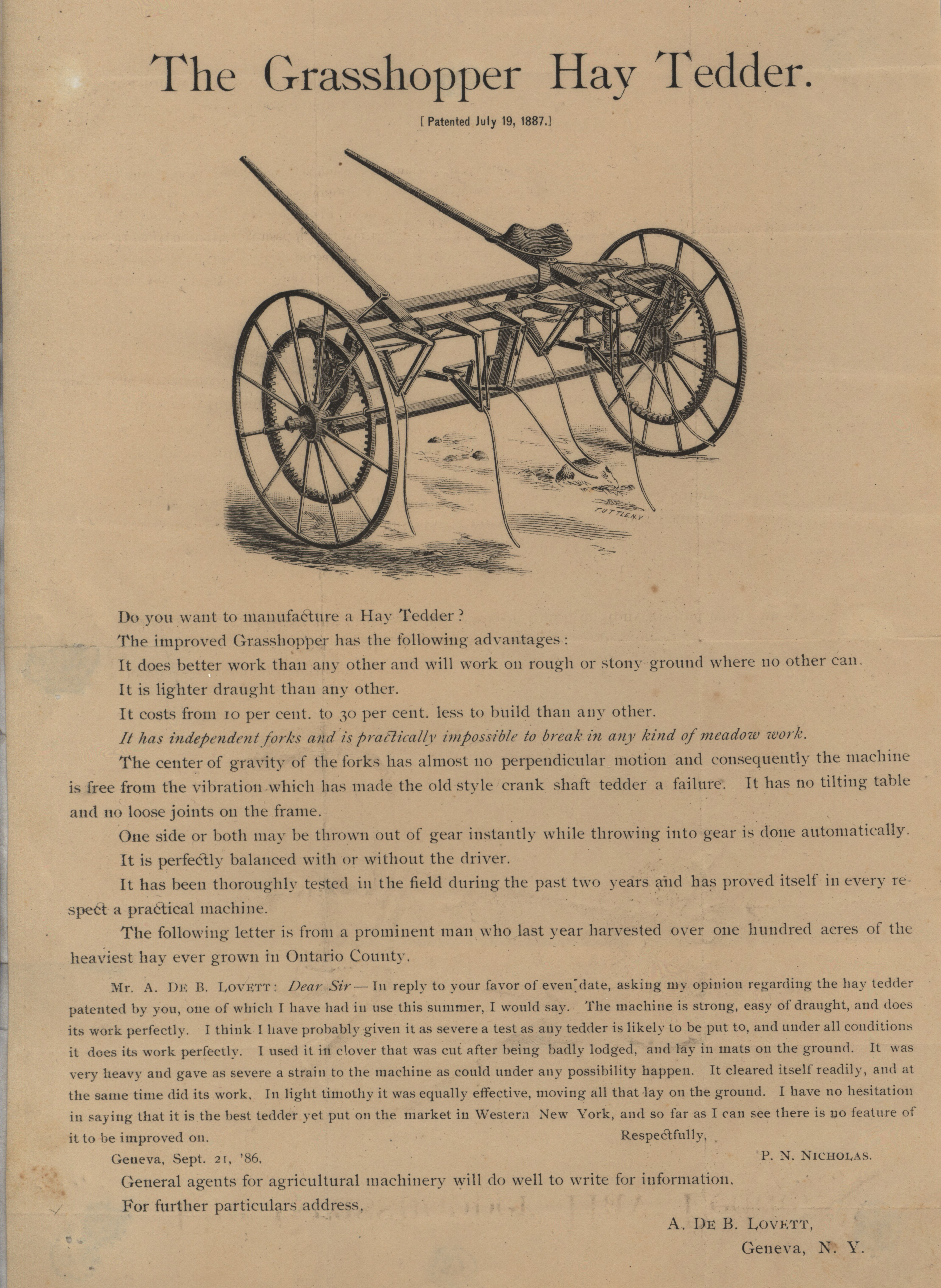 - "Grasshopper Hay Tedder advertisement", Agricultural Machinery Literature Collection, Iowa State University Library Digital Collections