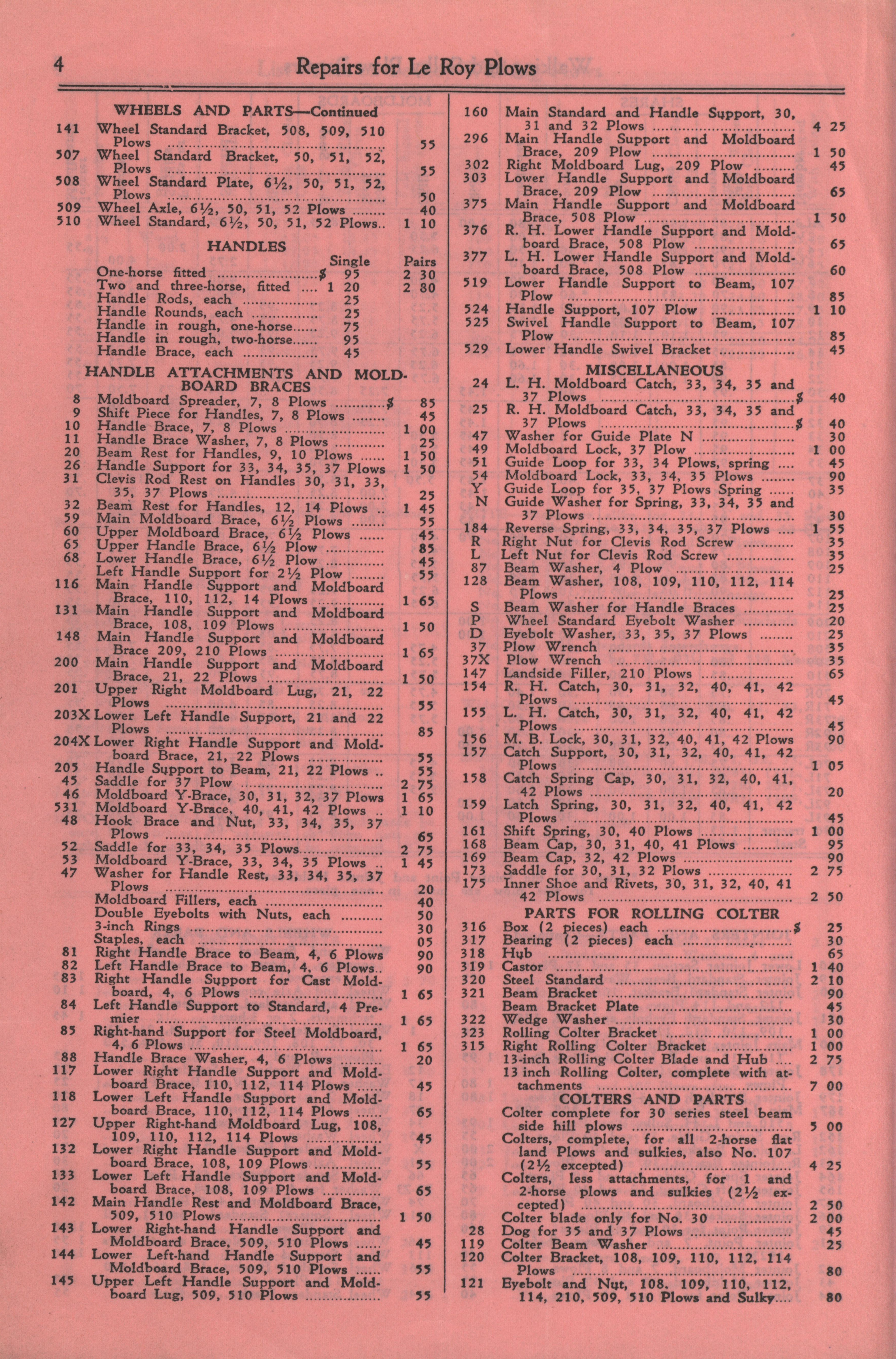 - Illustrated price list for the plows and repairs offered by Le Roy Plow Company in 1939.