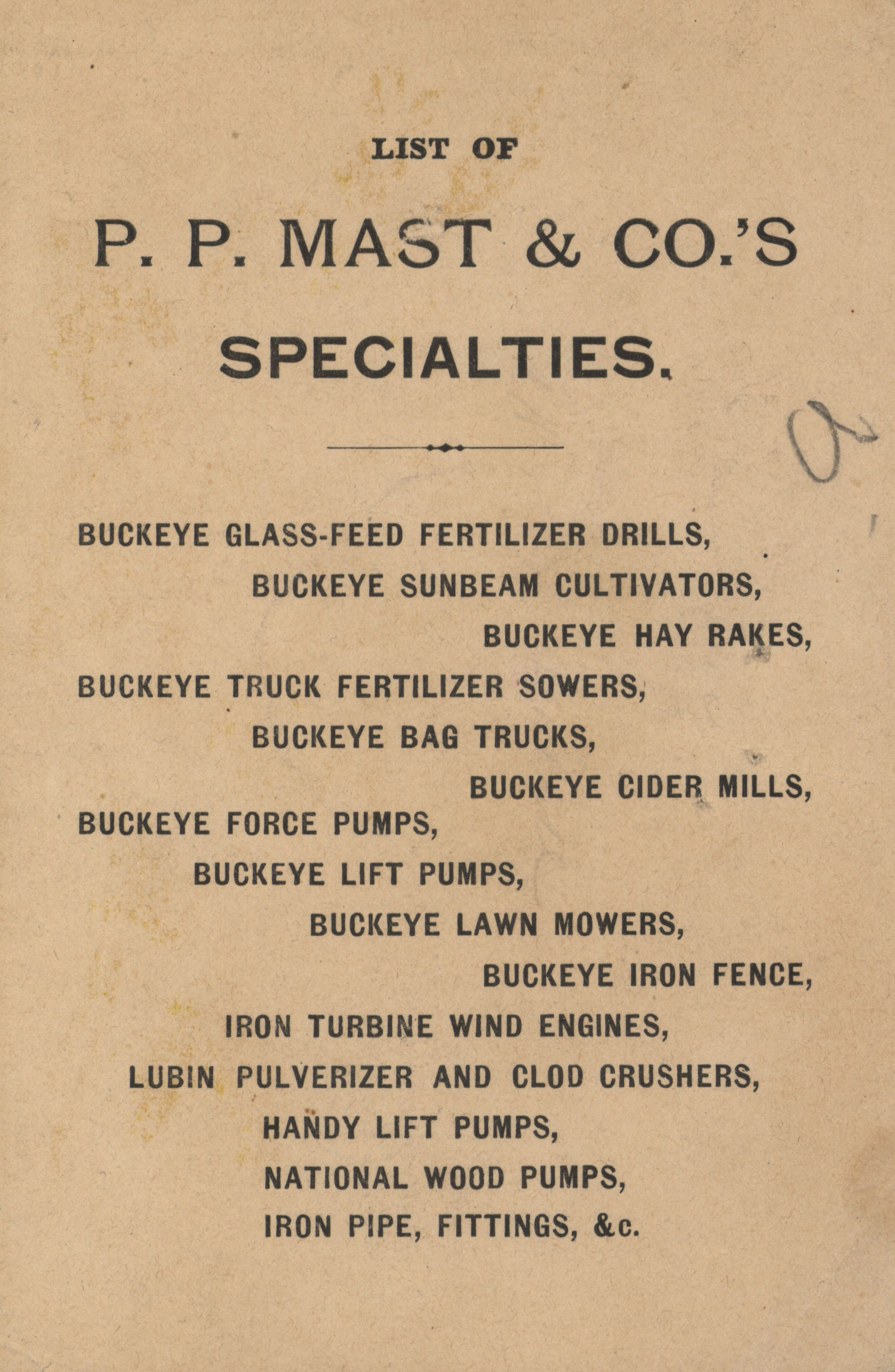 - "P. P. Mast and Company illustrated advertisement card", Agricultural Machinery Literature Collection, Iowa State University Library Digital Collections