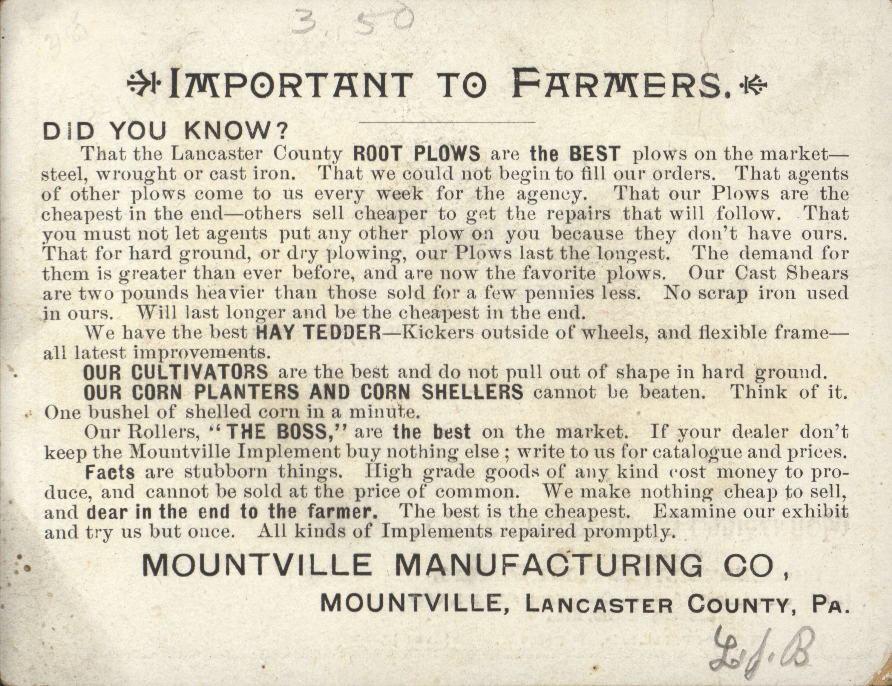 - "Mountville Manufacturing Company advertisement card", Agricultural Machinery Literature Collection, Iowa State University Library Digital Collections