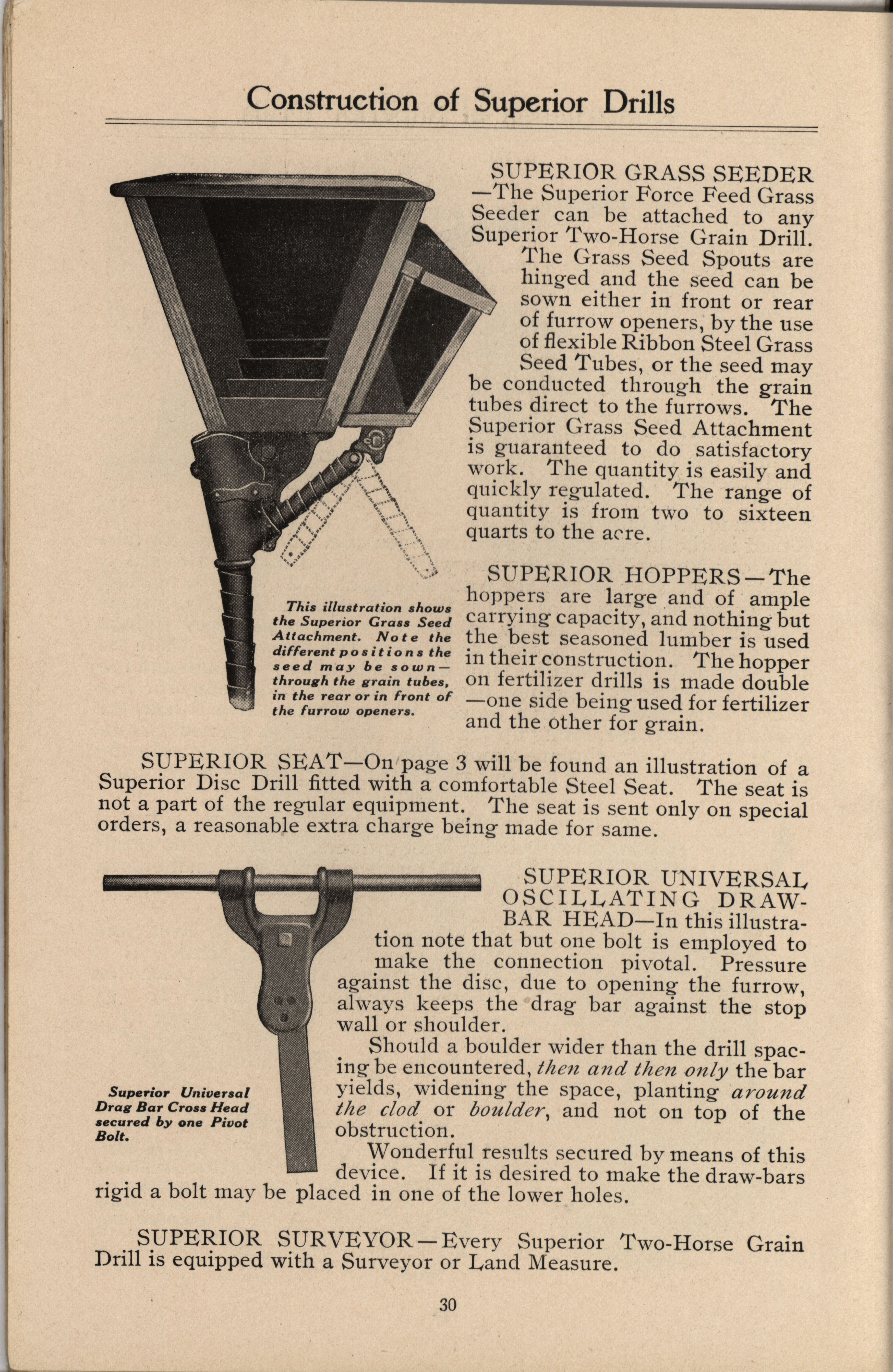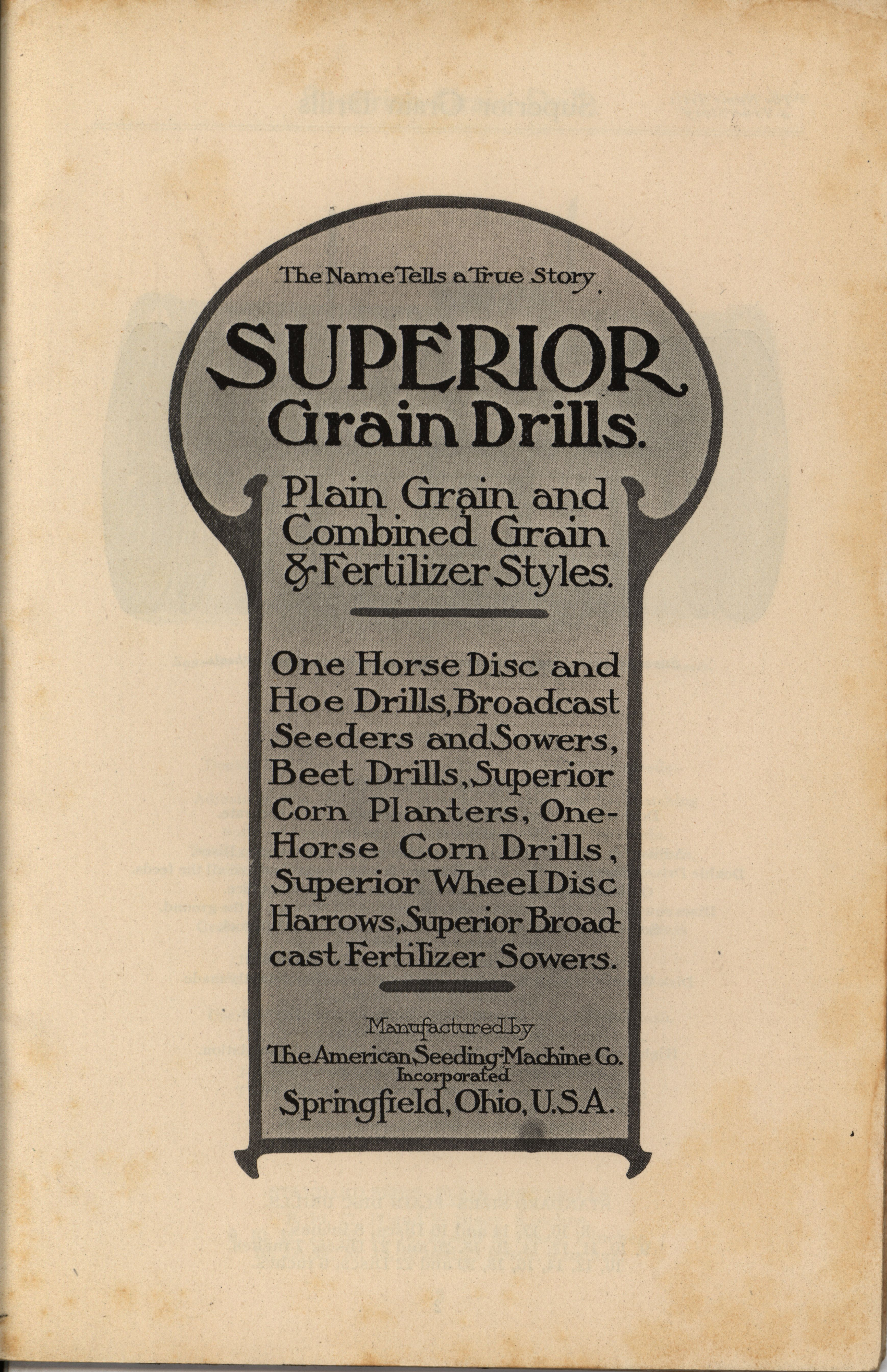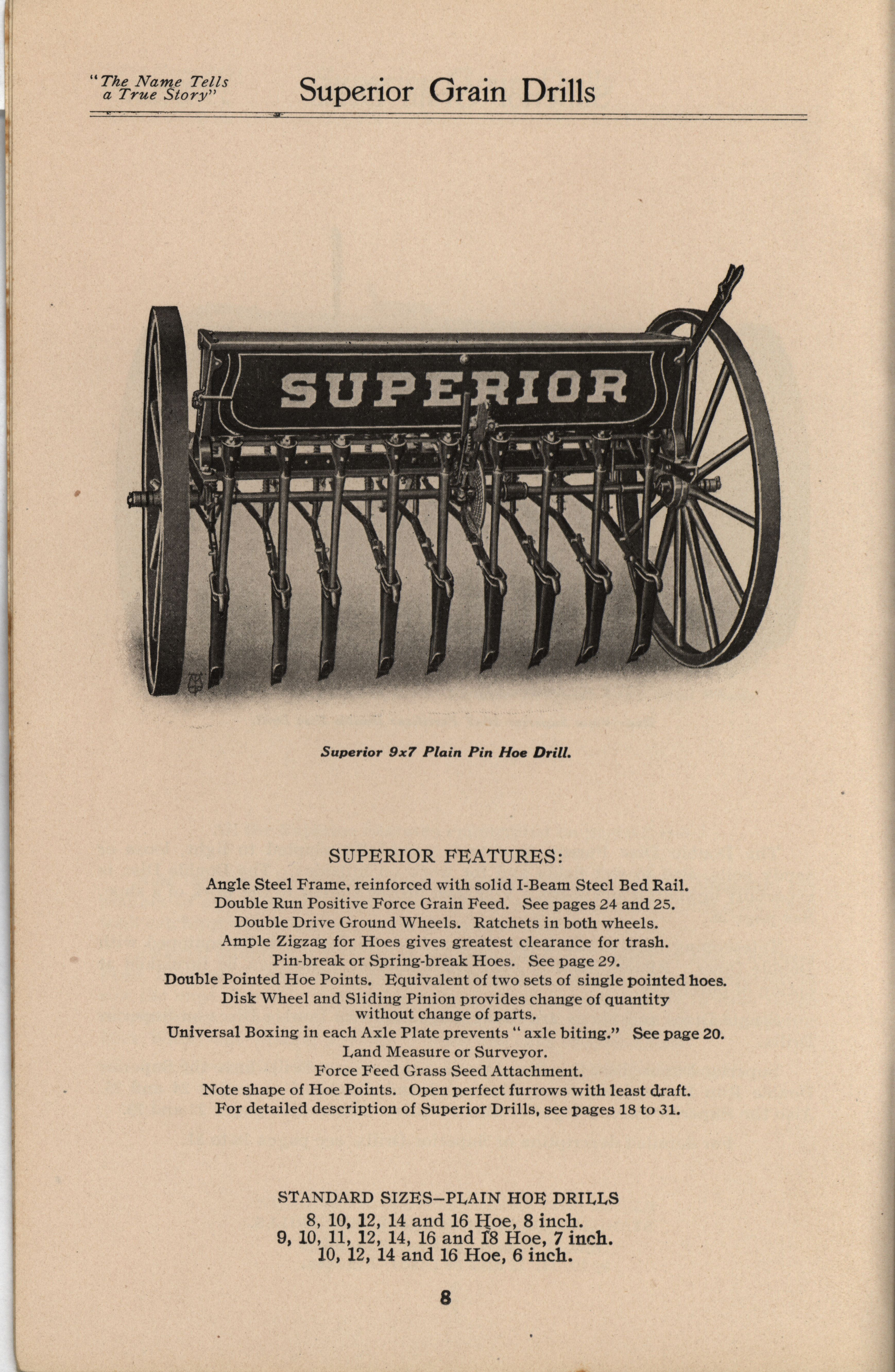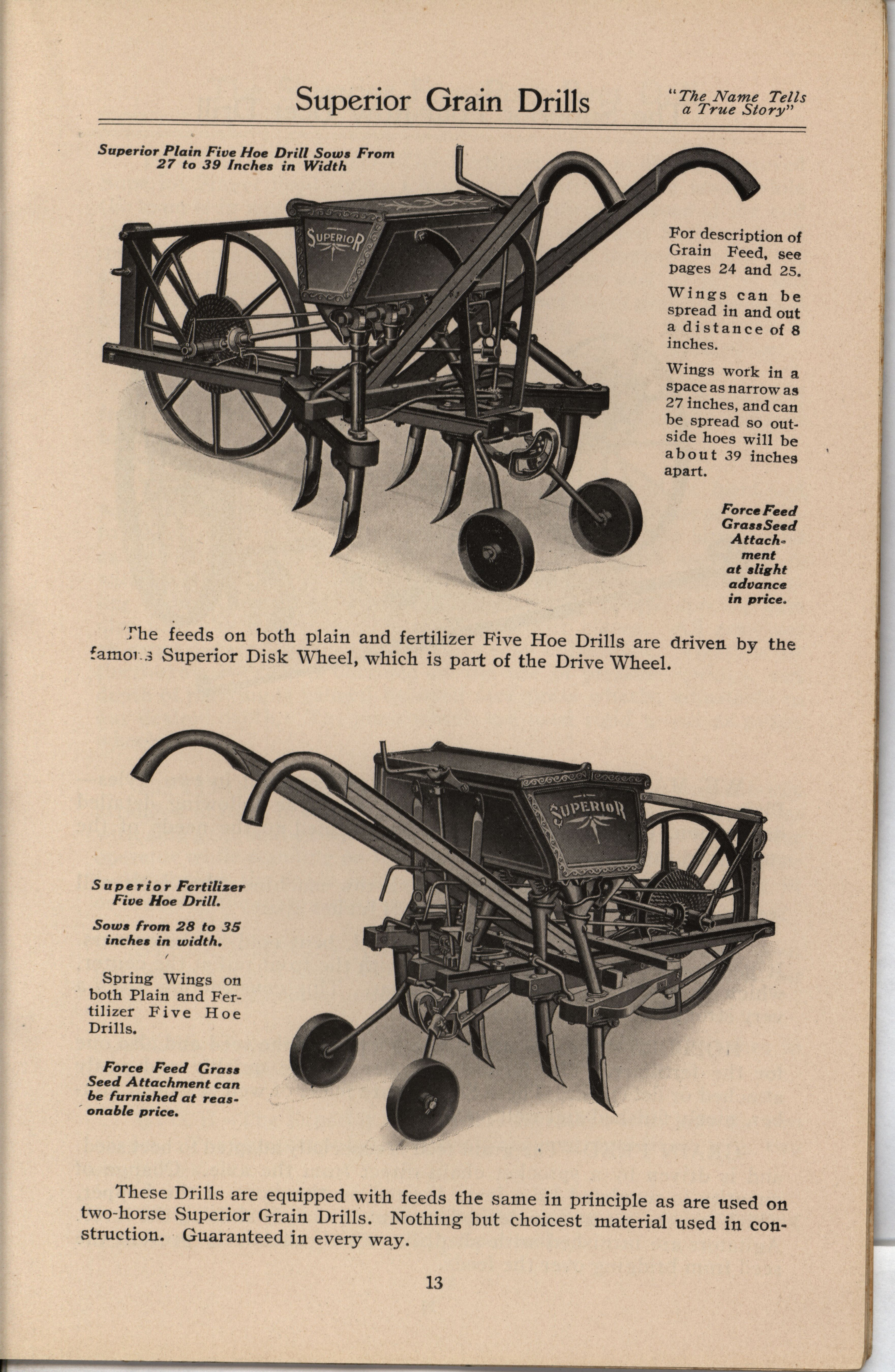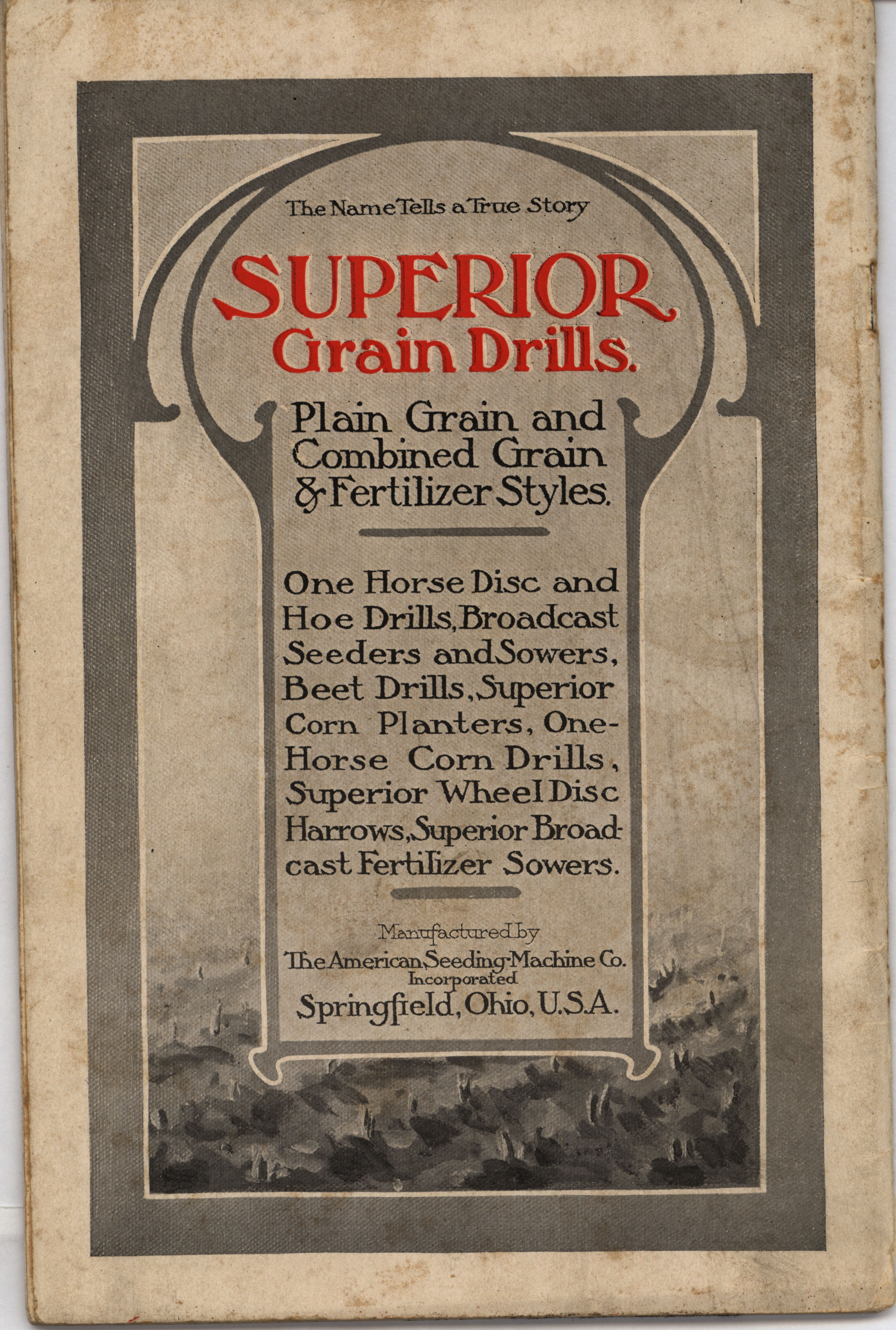 - Catalog by the American Seeding Machine Company describing the Superior Grain Drills product line including illustrations.