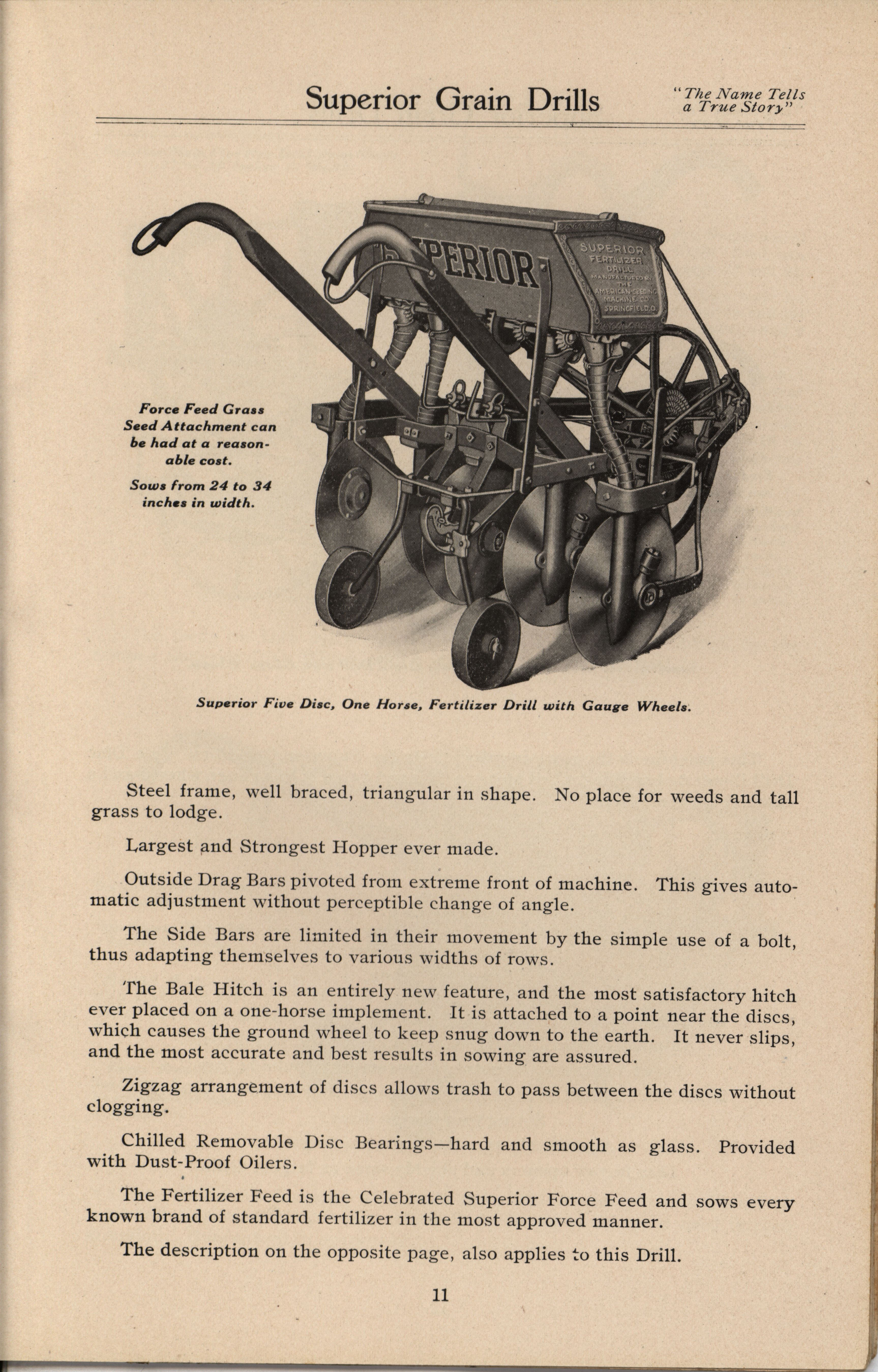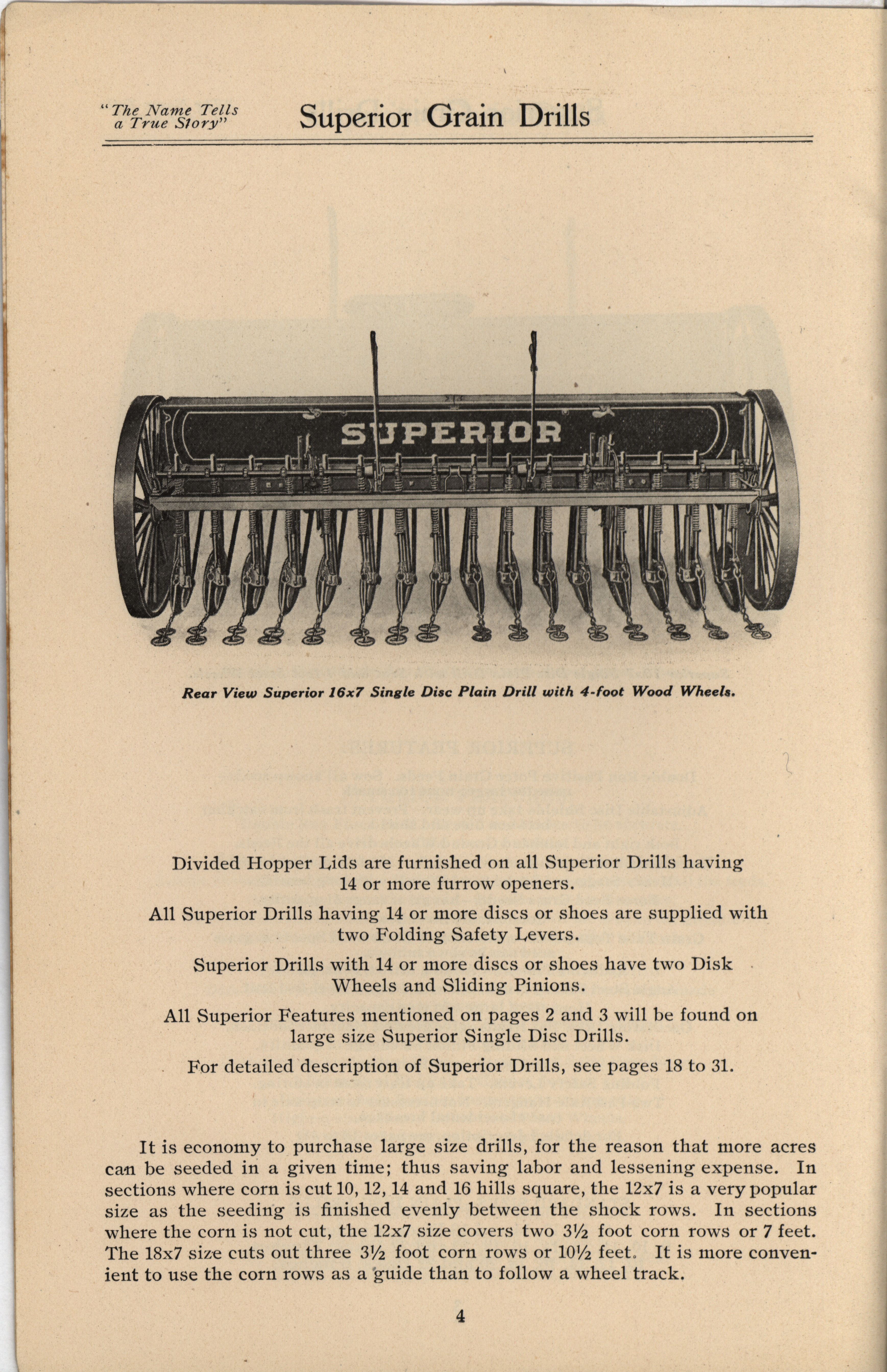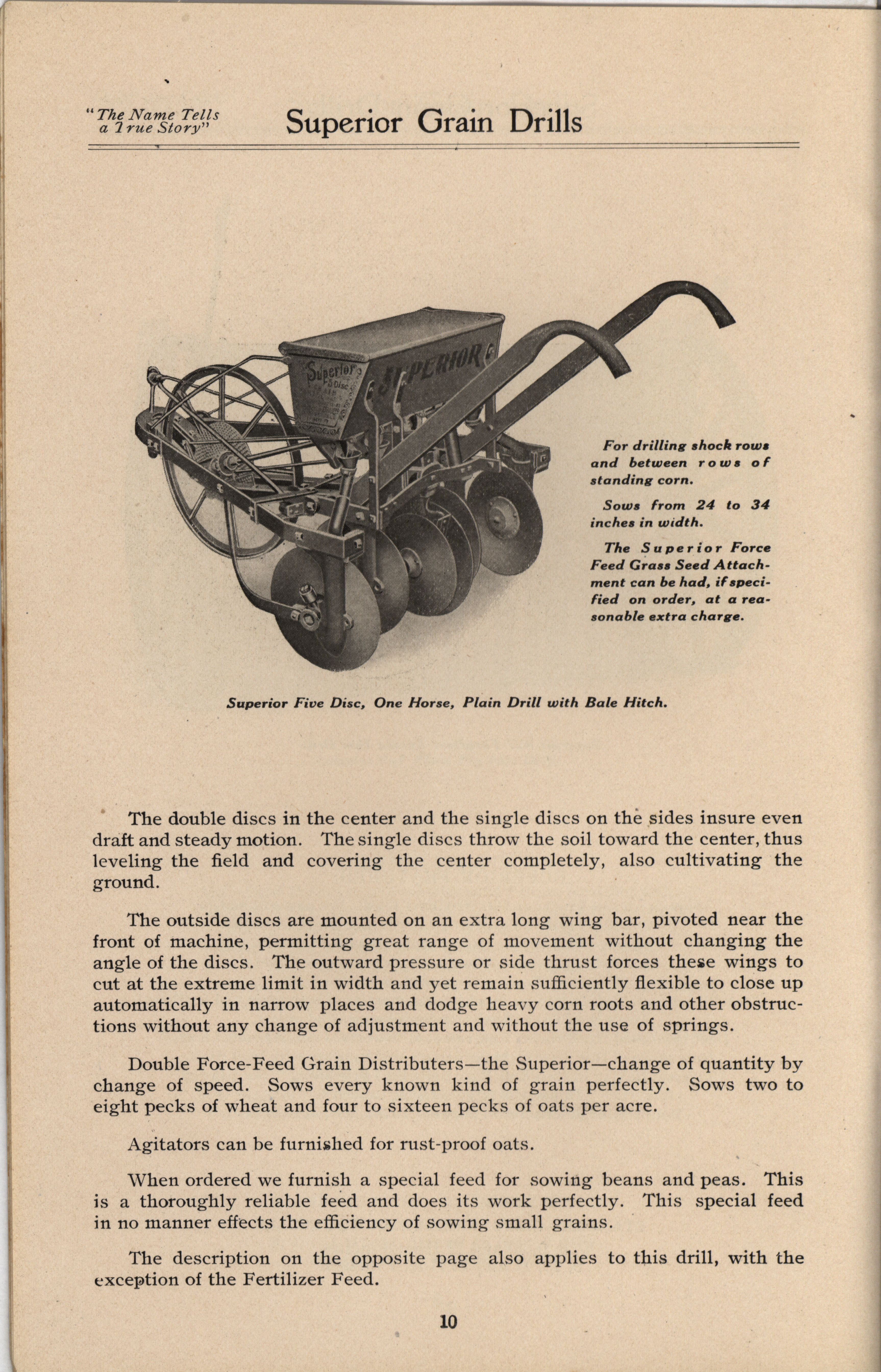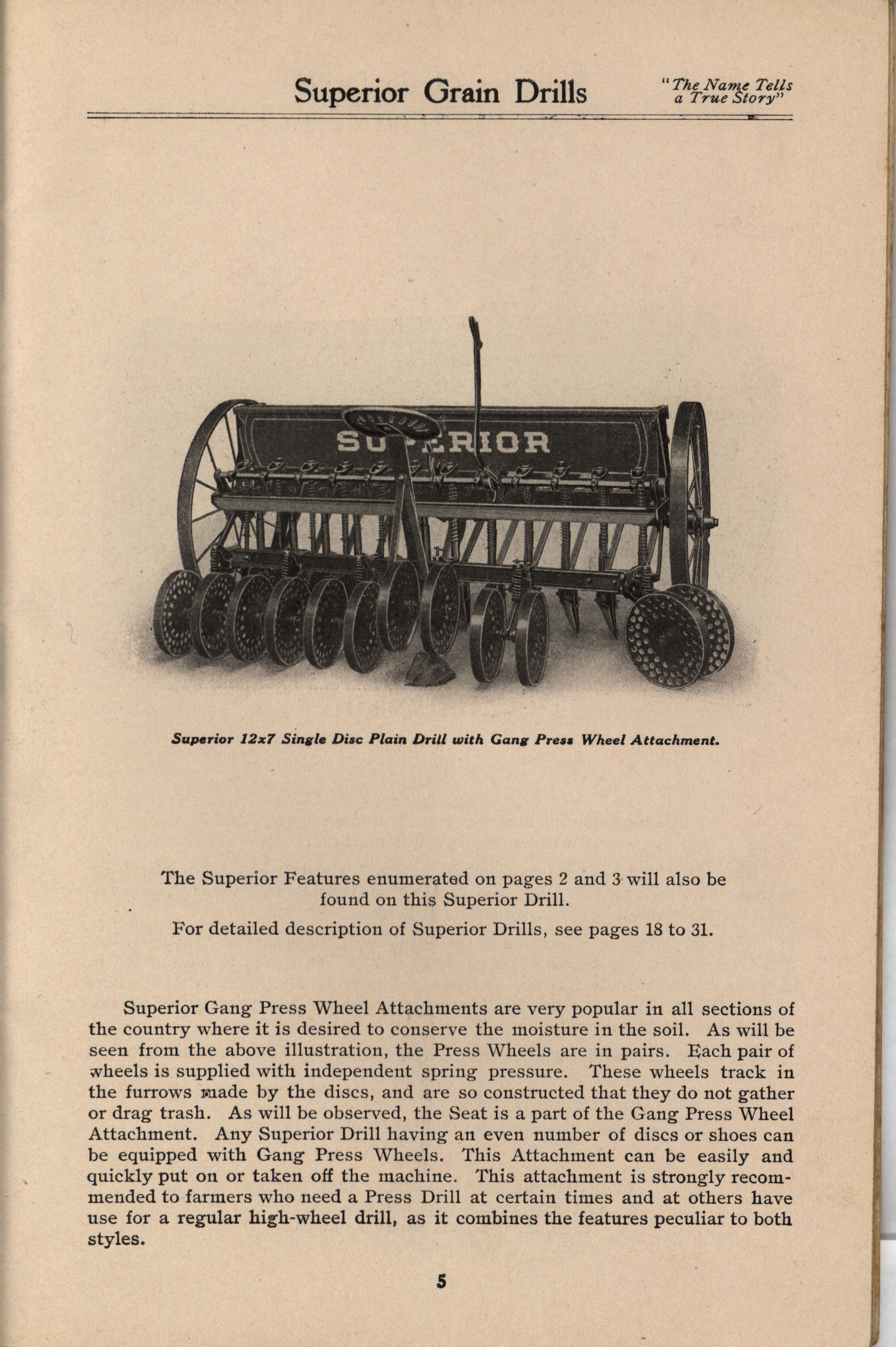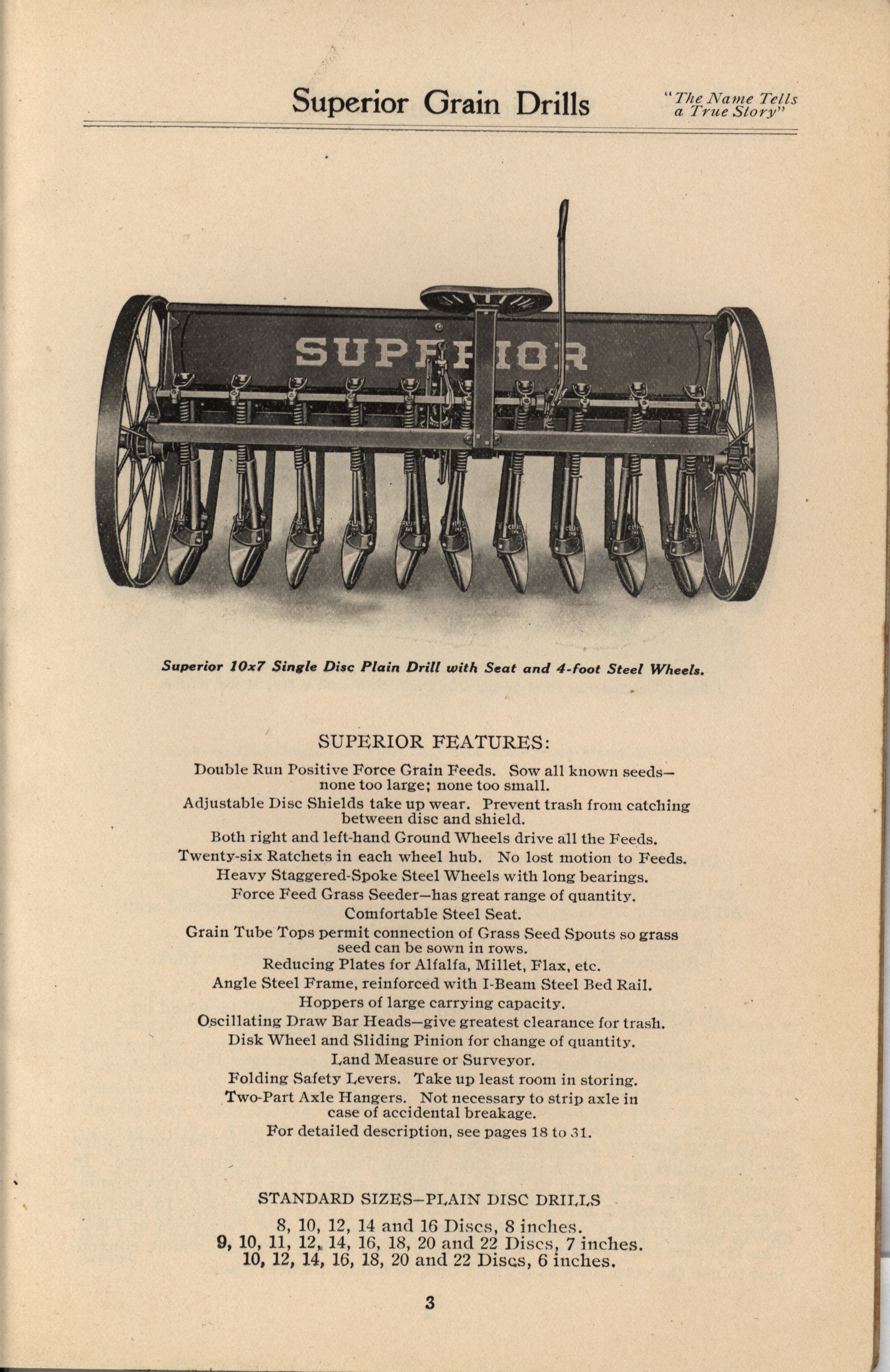 - Catalog by the American Seeding Machine Company describing the Superior Grain Drills product line including illustrations.