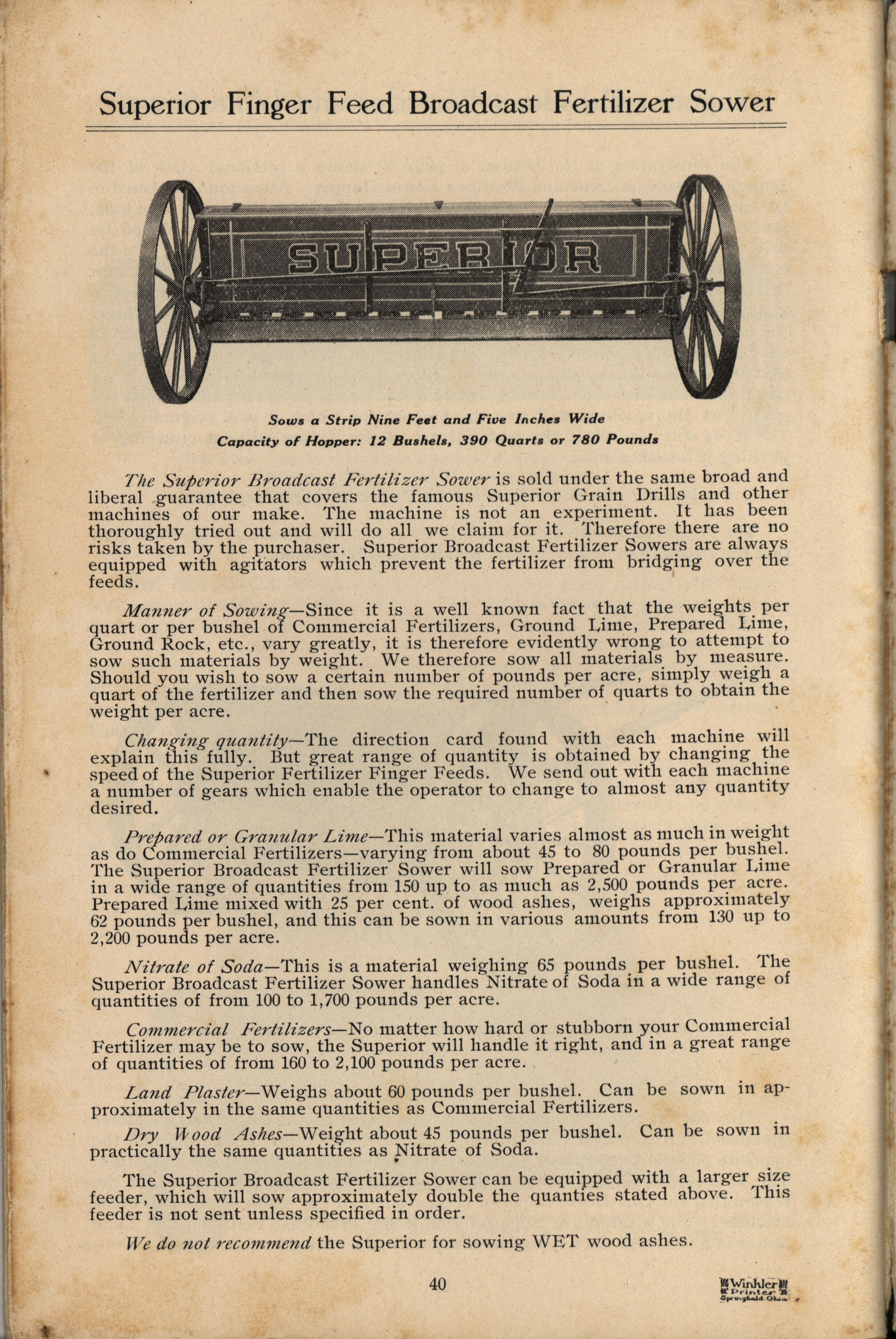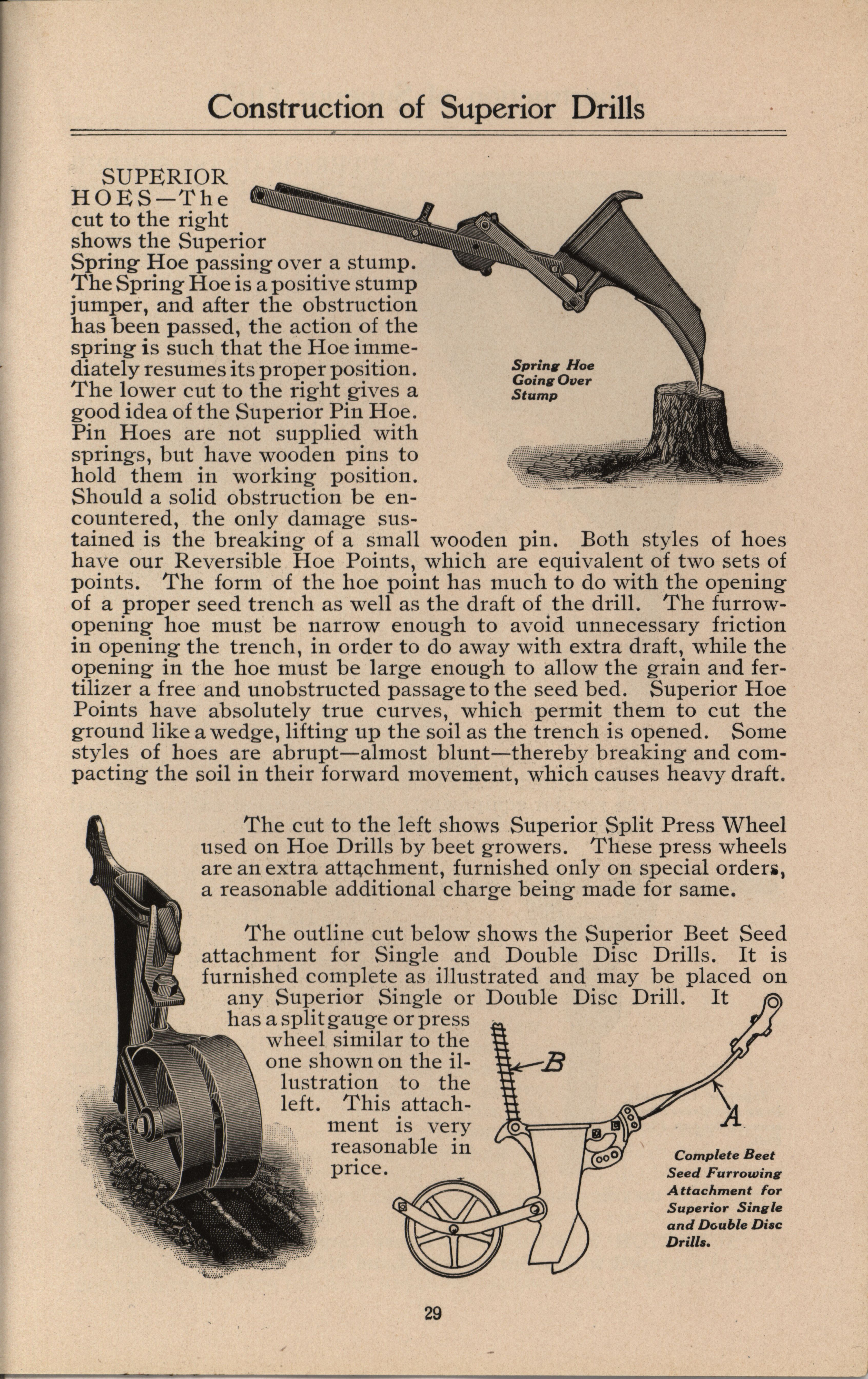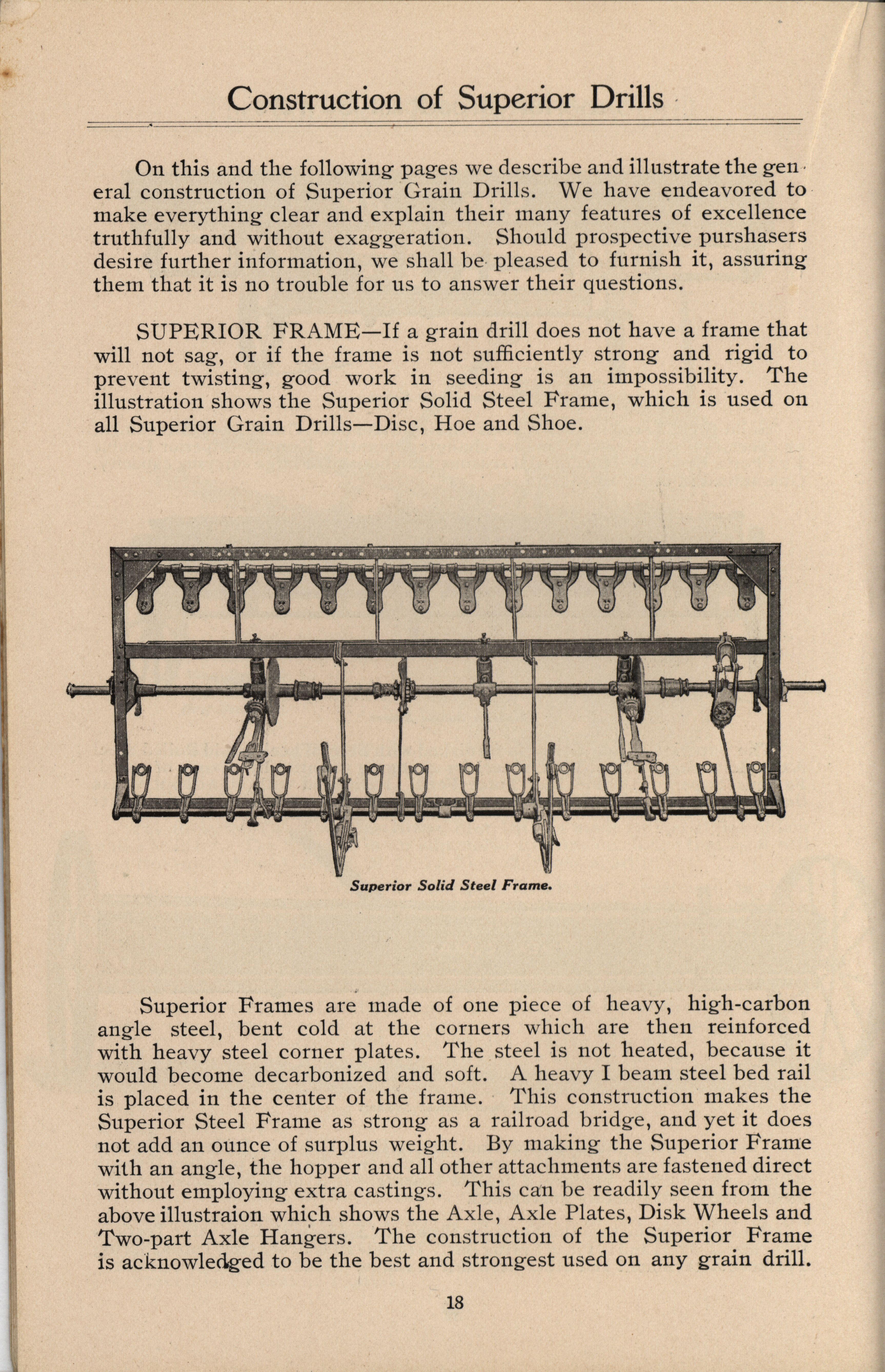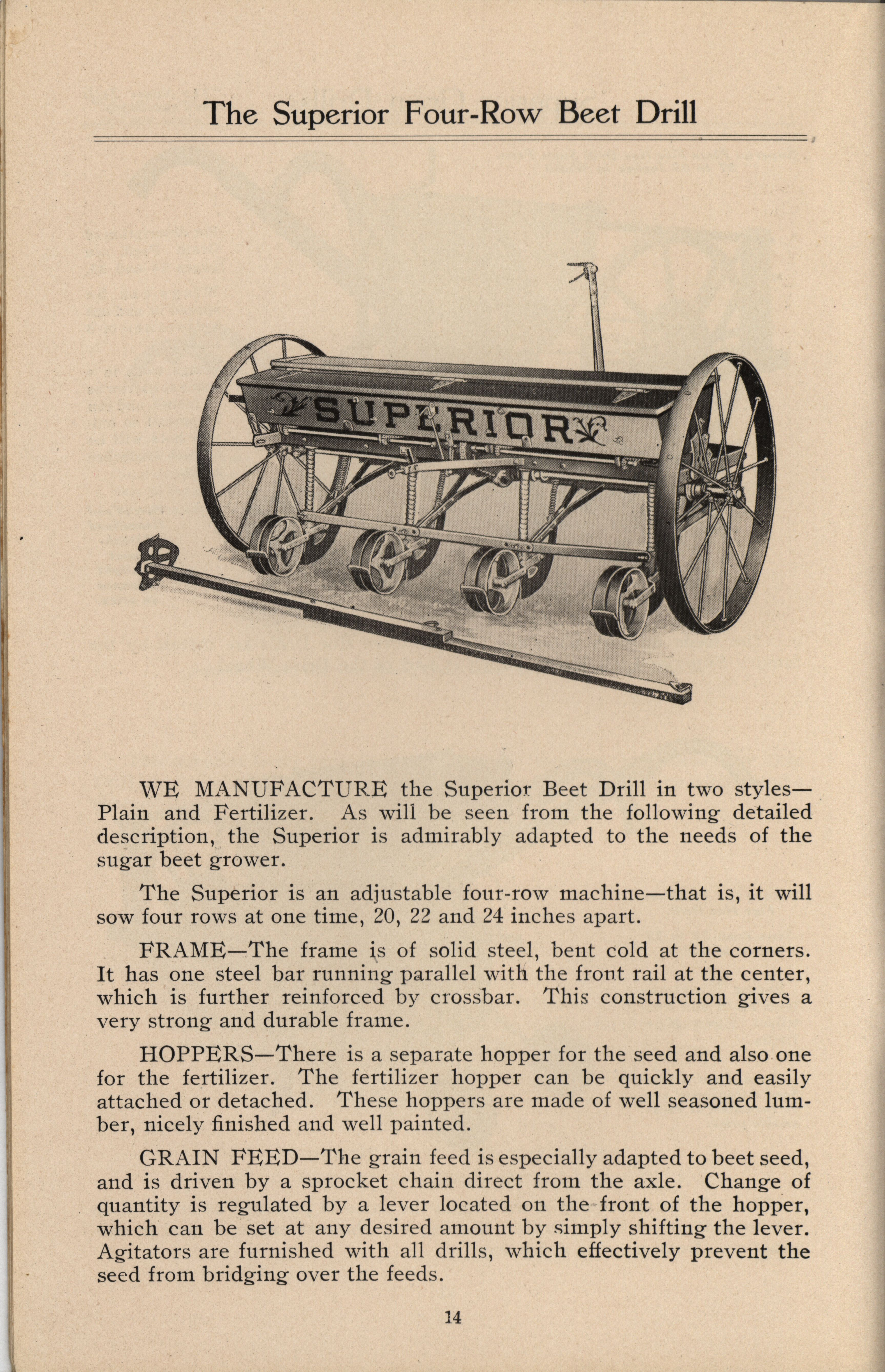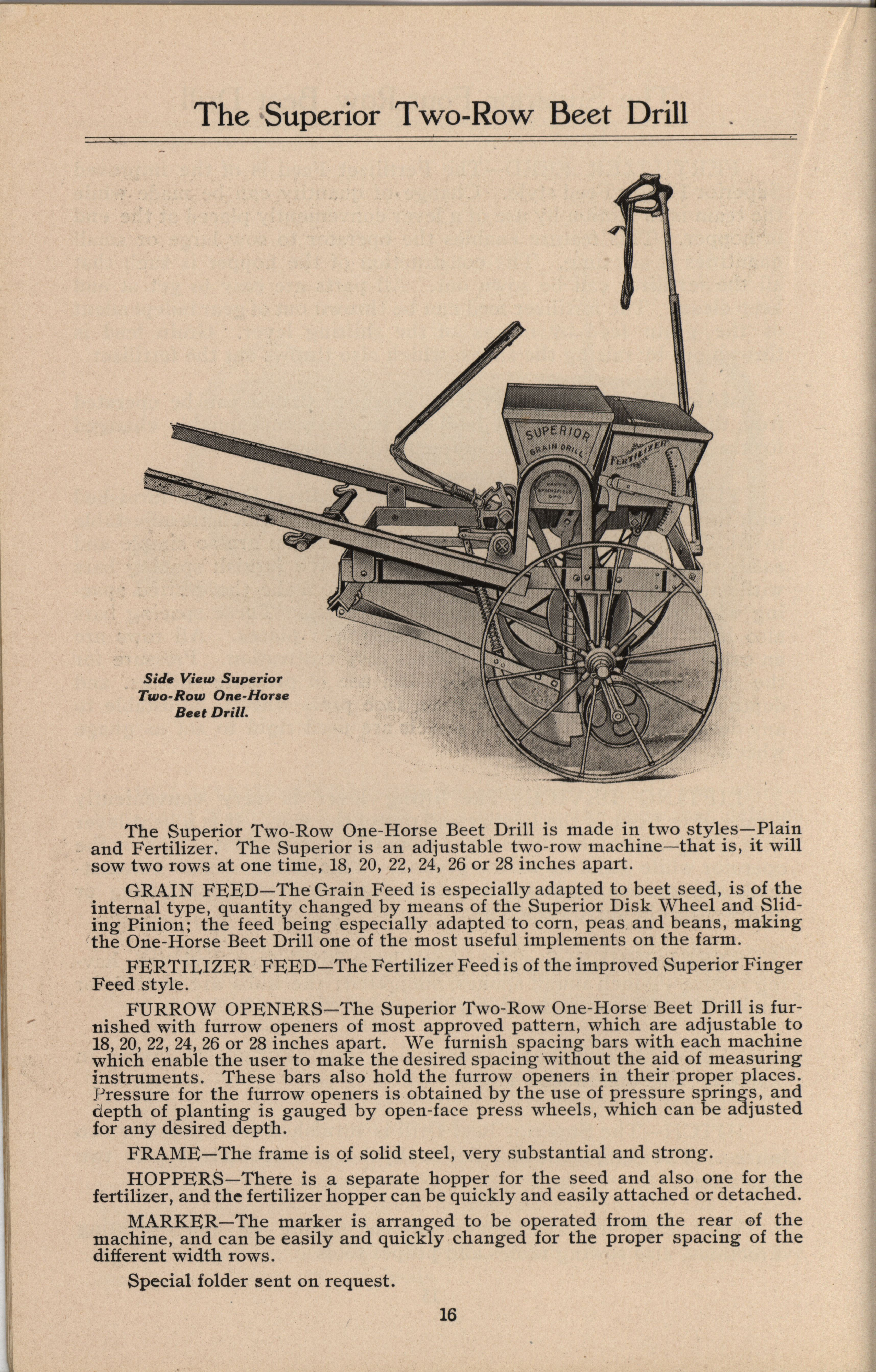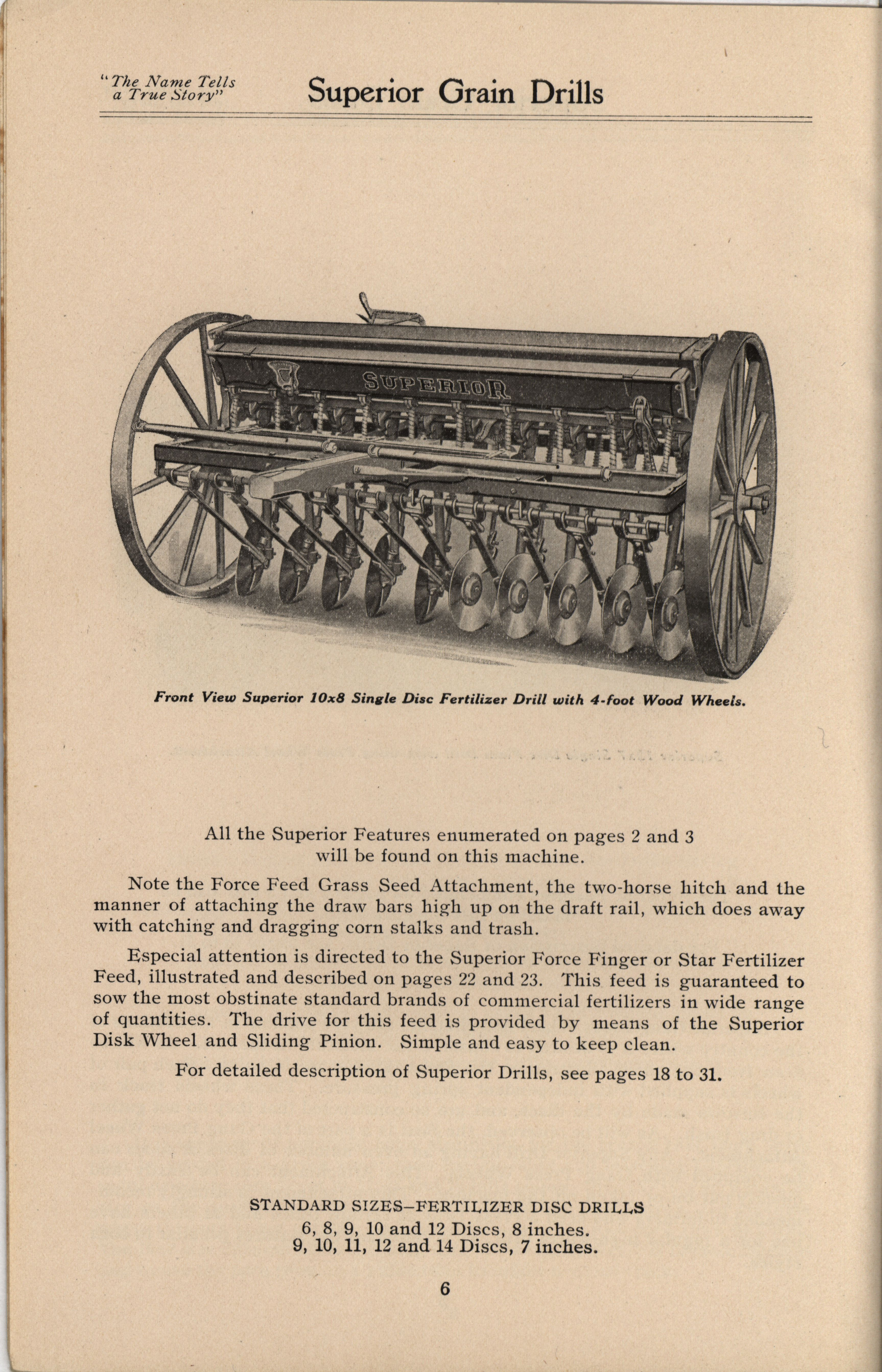 - Catalog by the American Seeding Machine Company describing the Superior Grain Drills product line including illustrations.