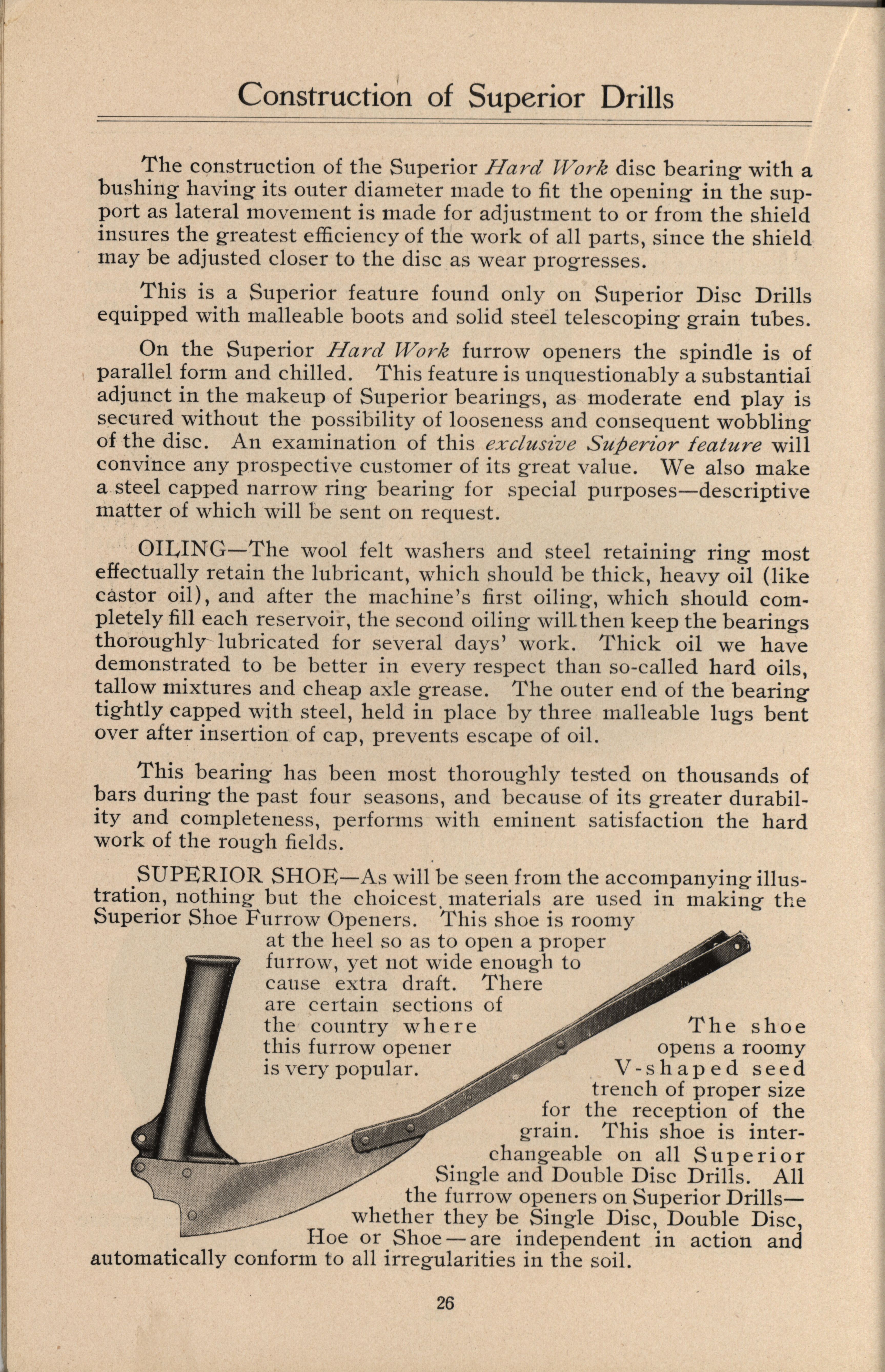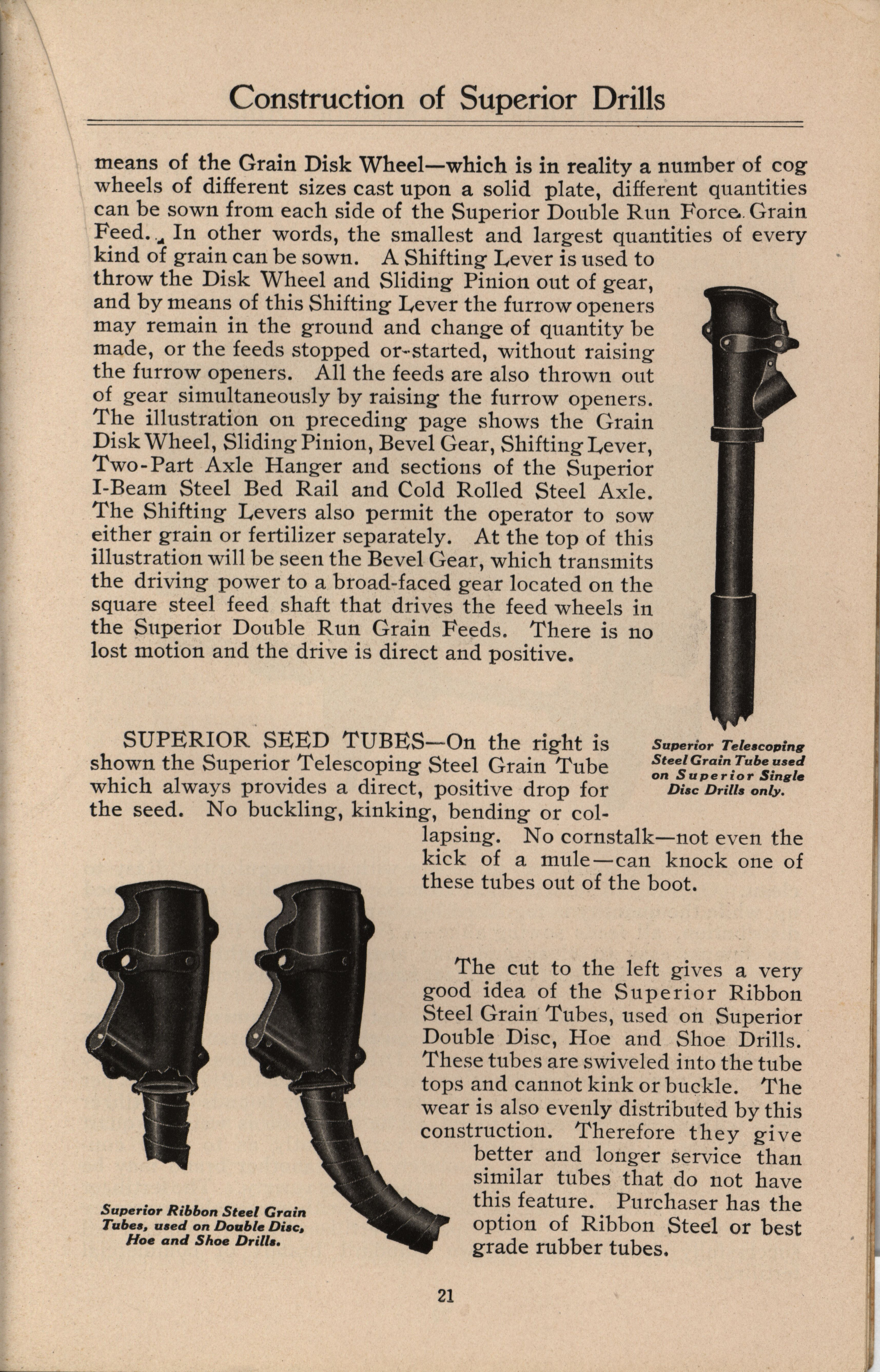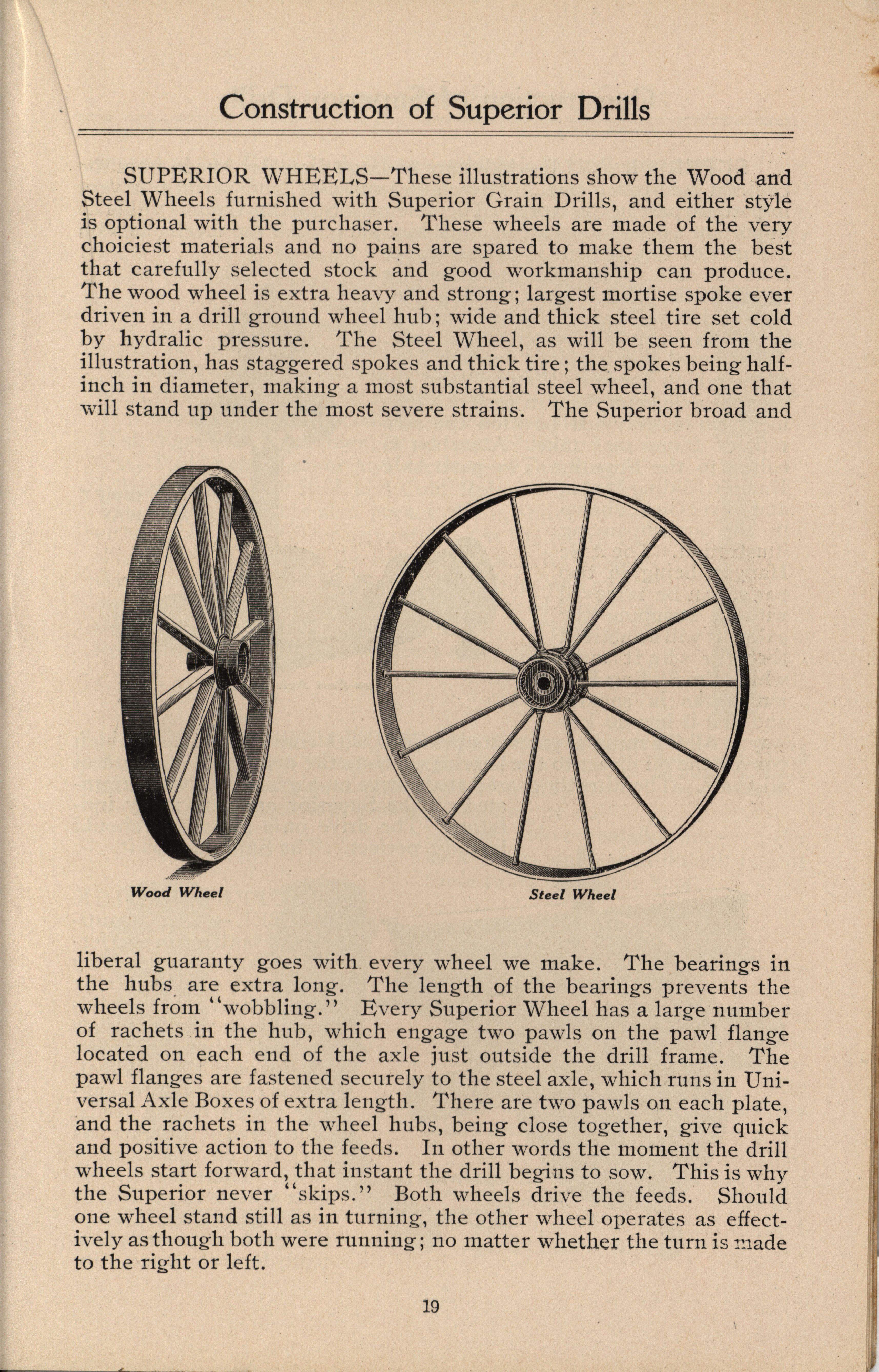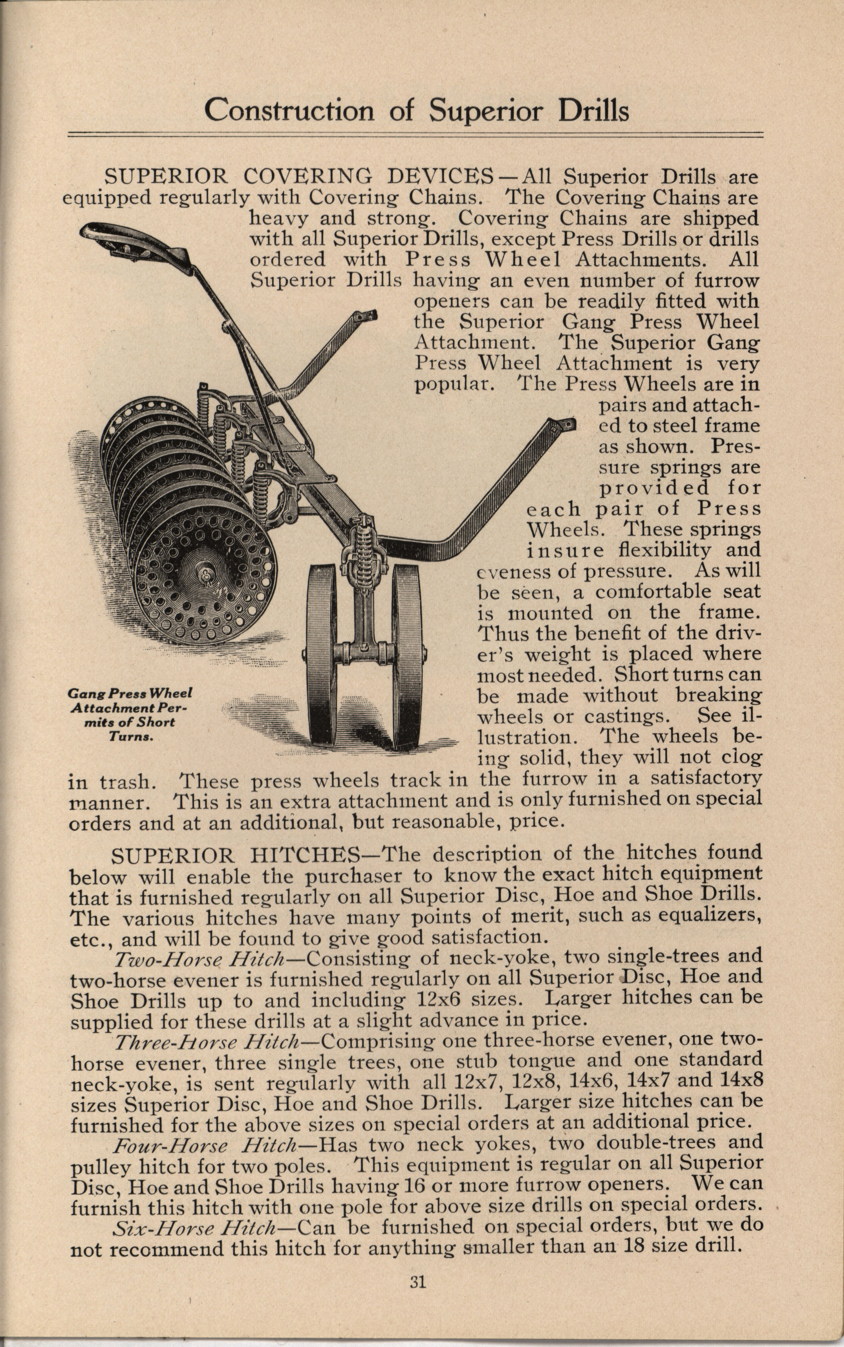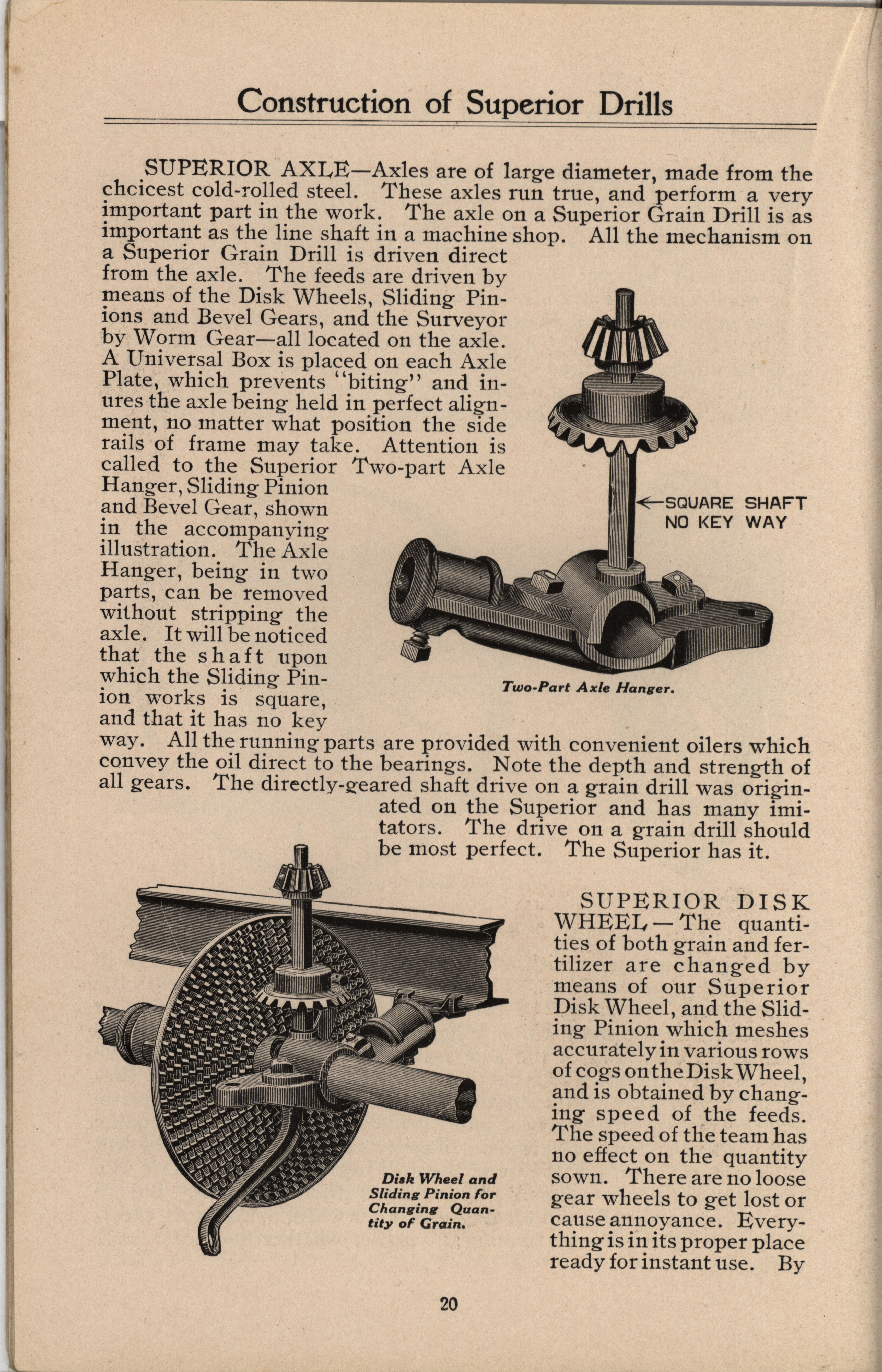 - Catalog by the American Seeding Machine Company describing the Superior Grain Drills product line including illustrations.
